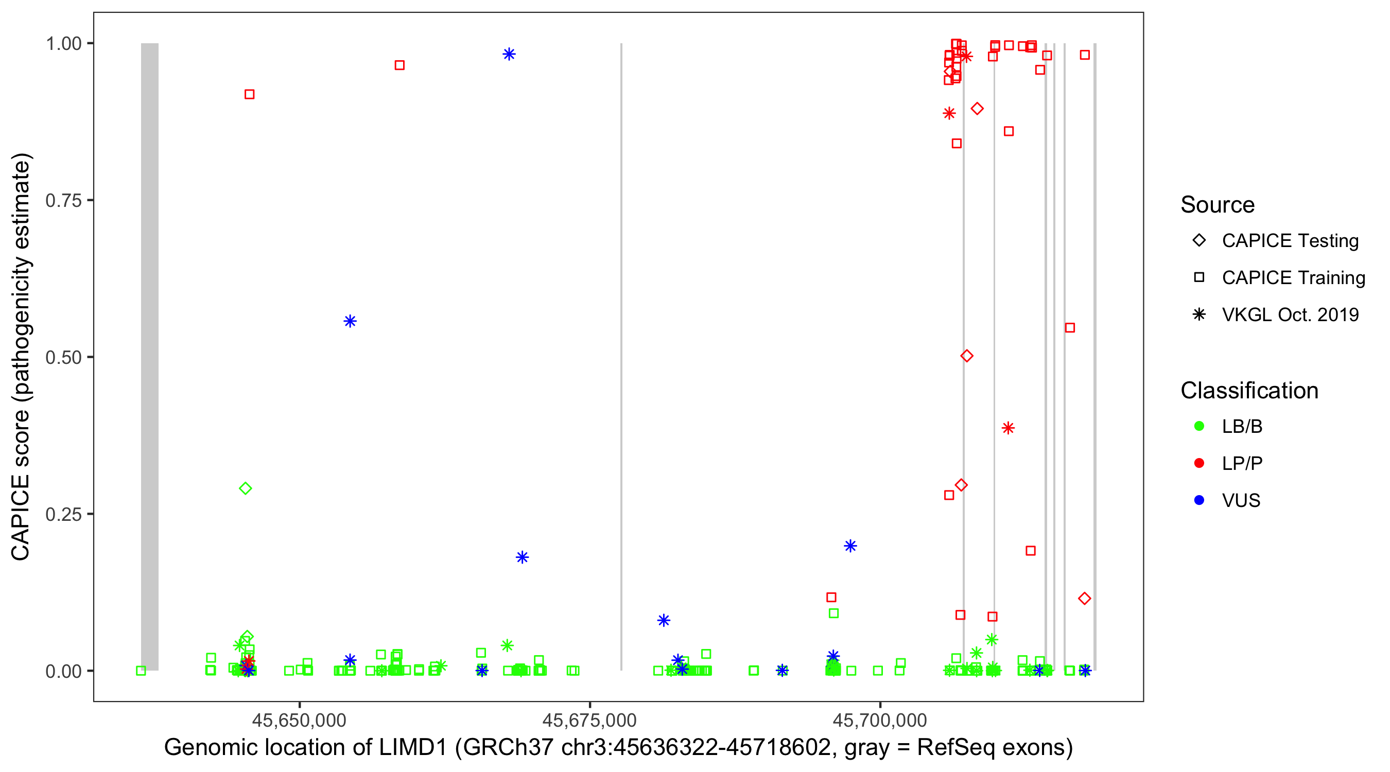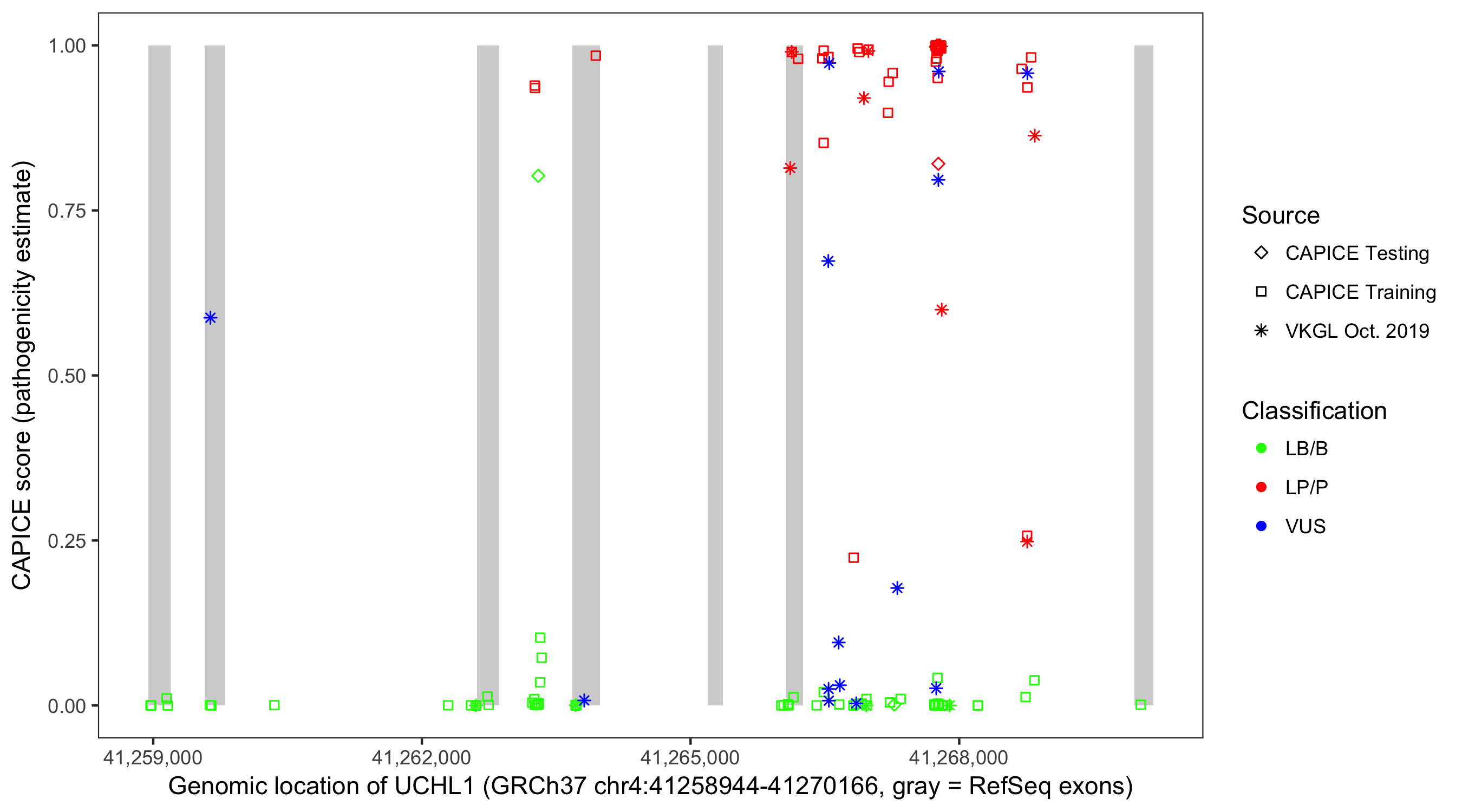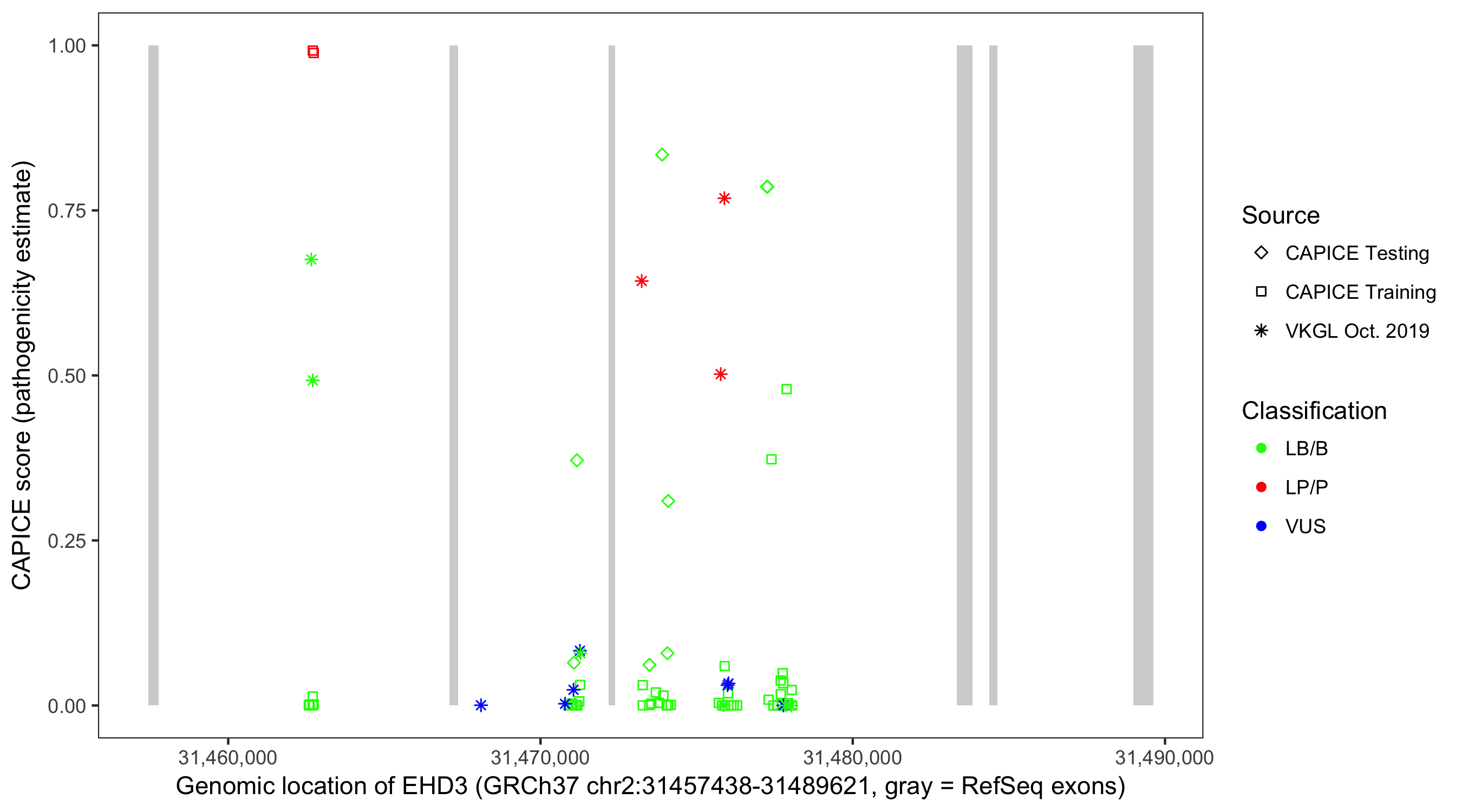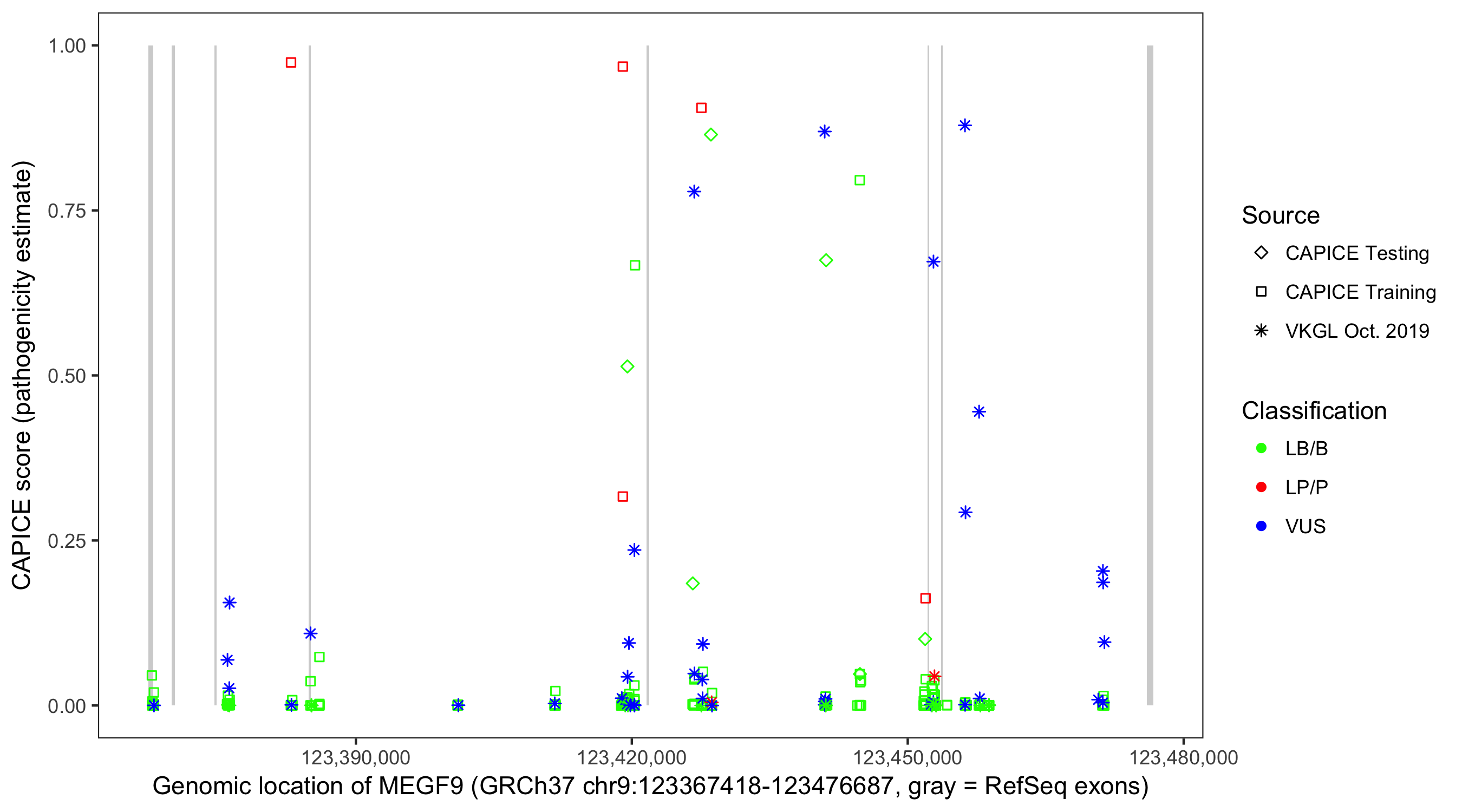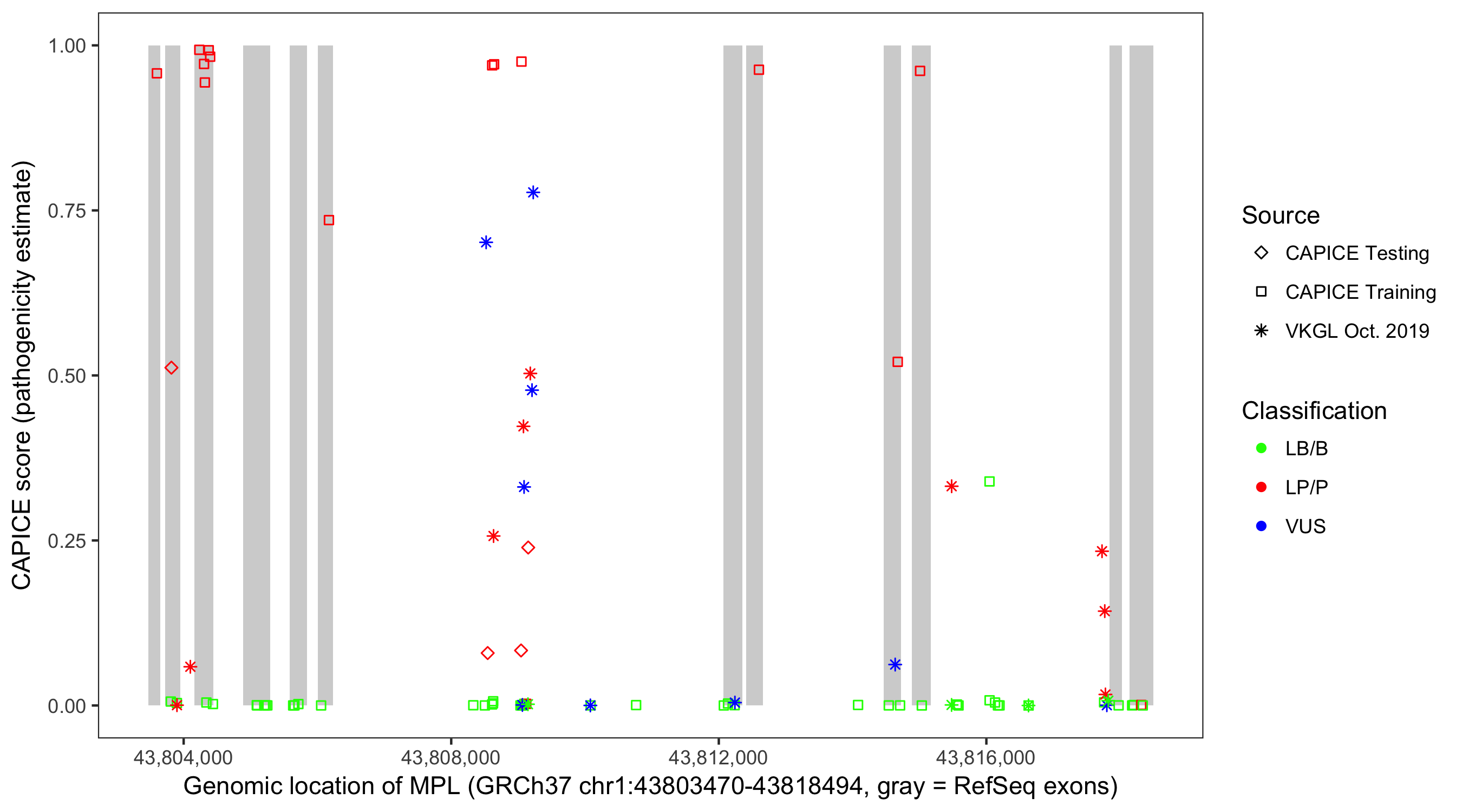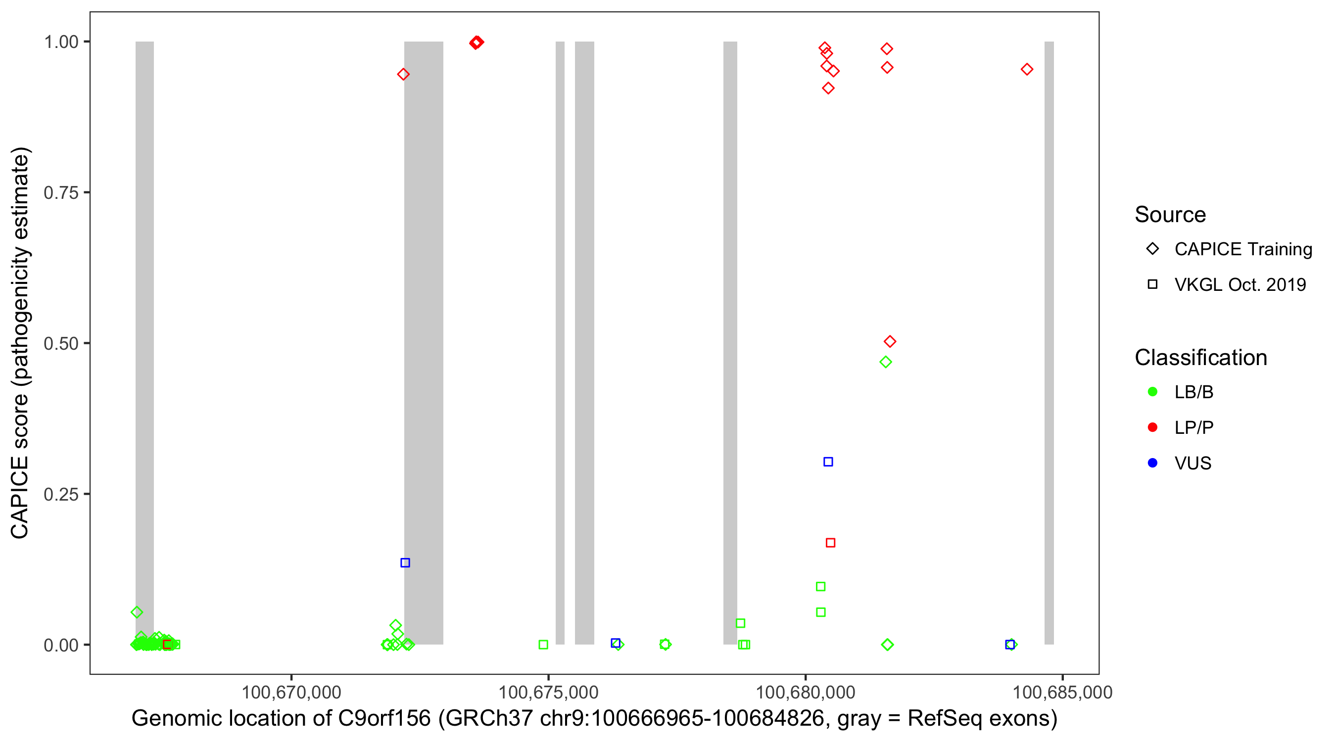 Shown are CAPICE train/test variants plus VKGL Oct 2019.