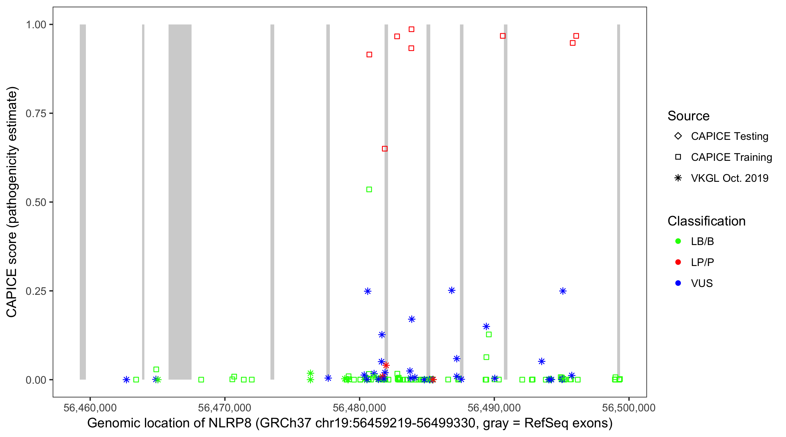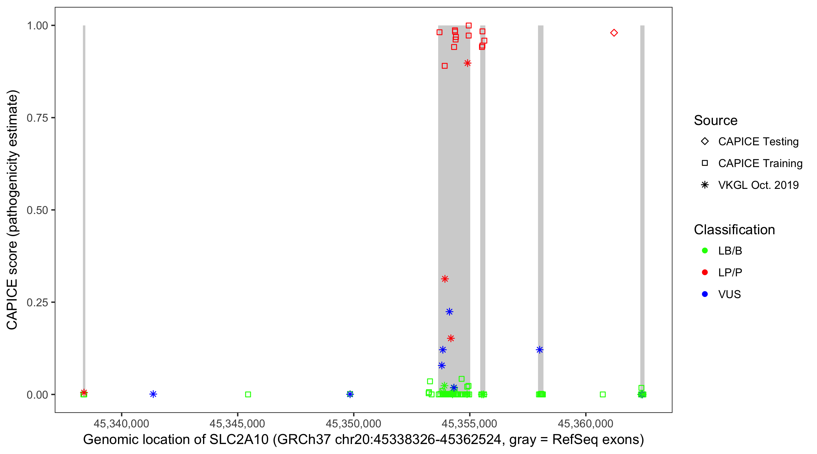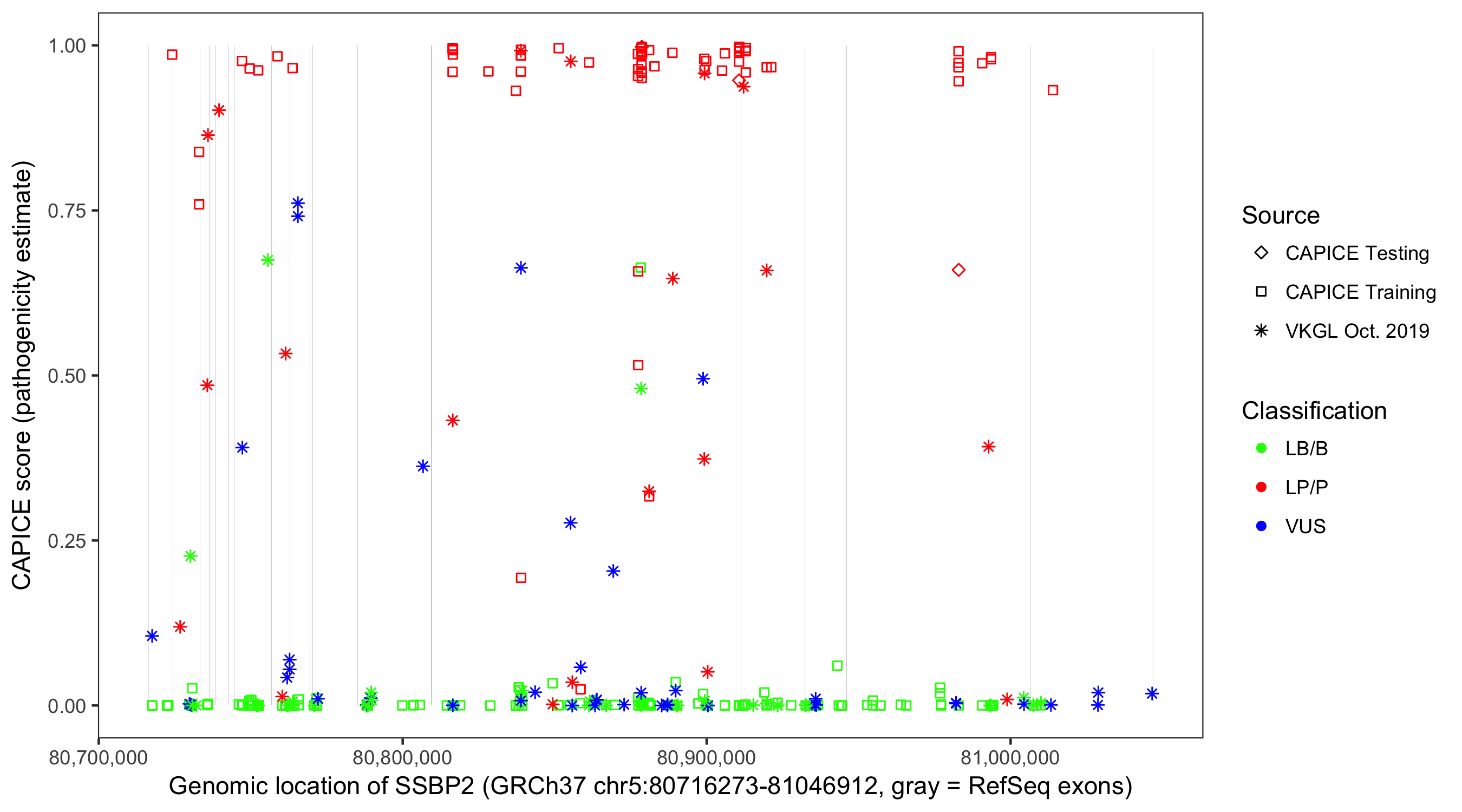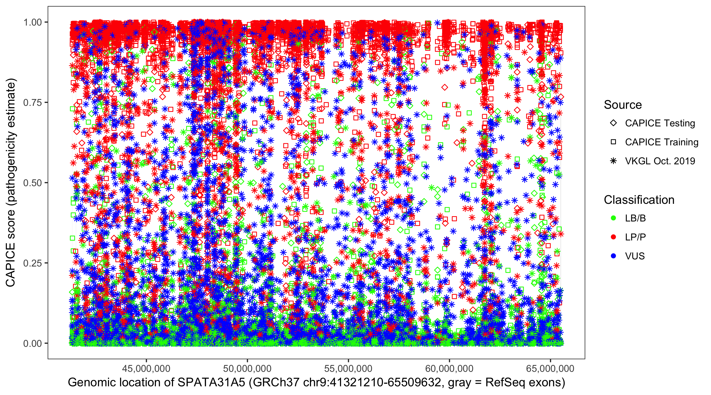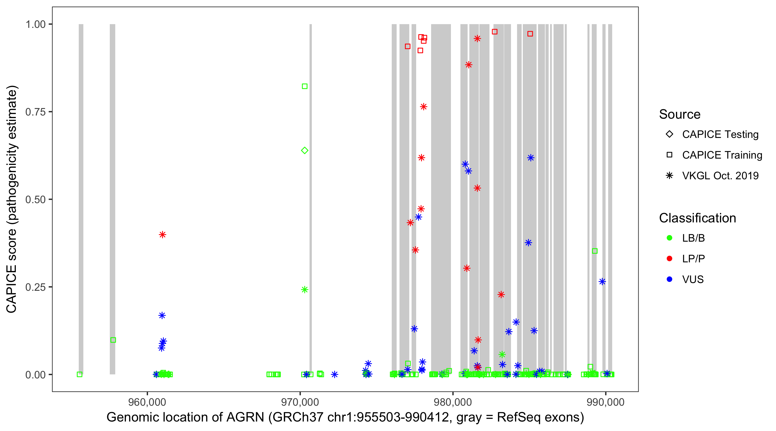 Shown are CAPICE train/test variants plus VKGL Oct 2019.