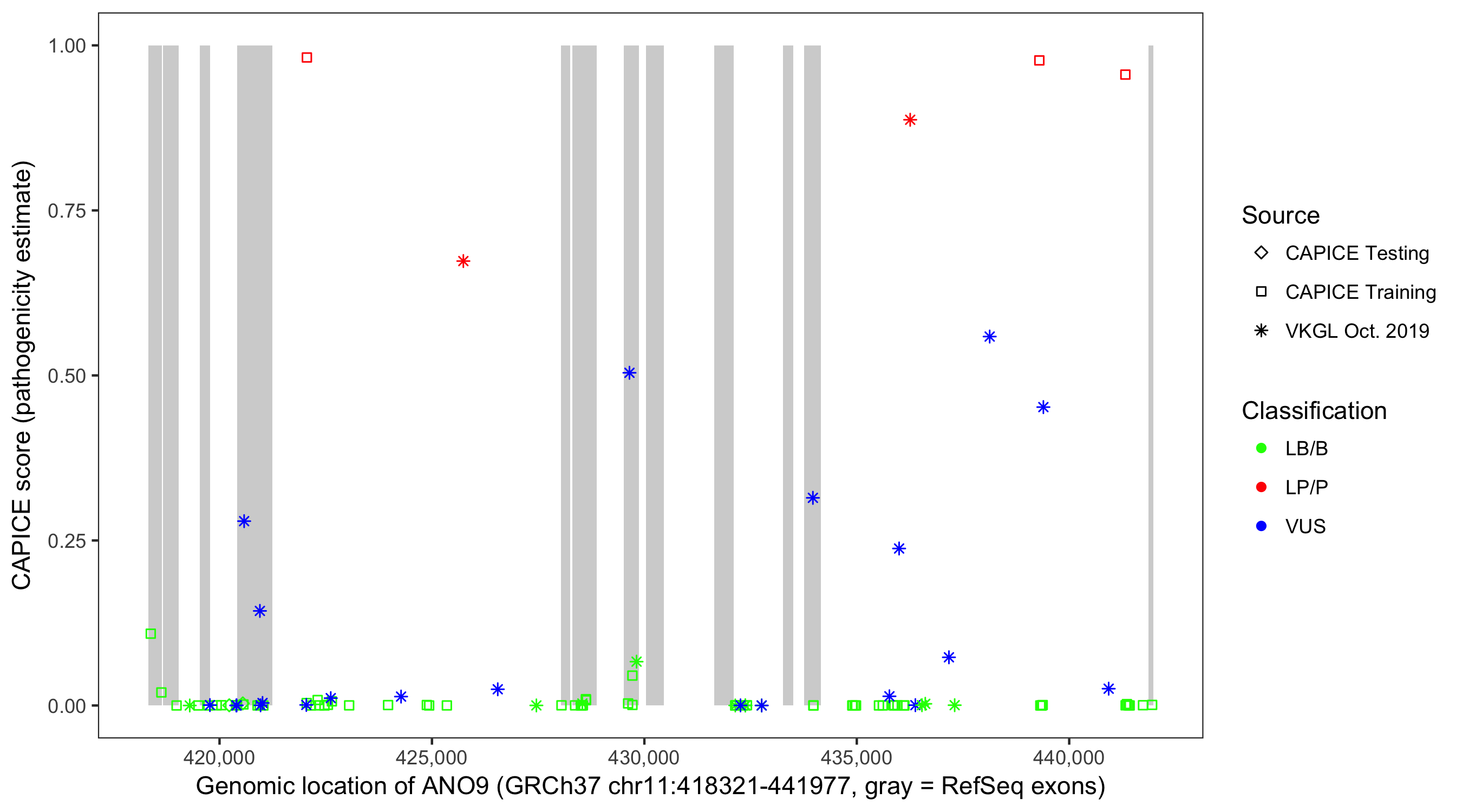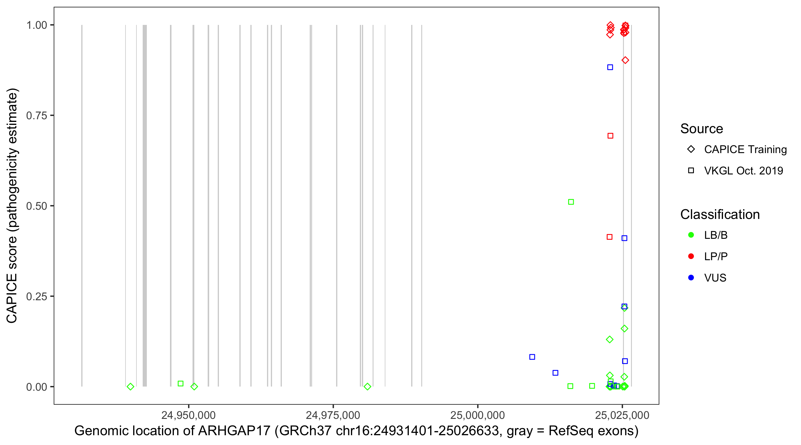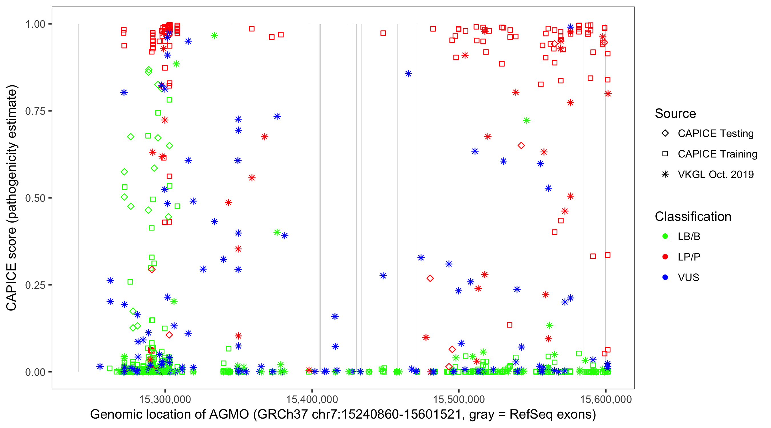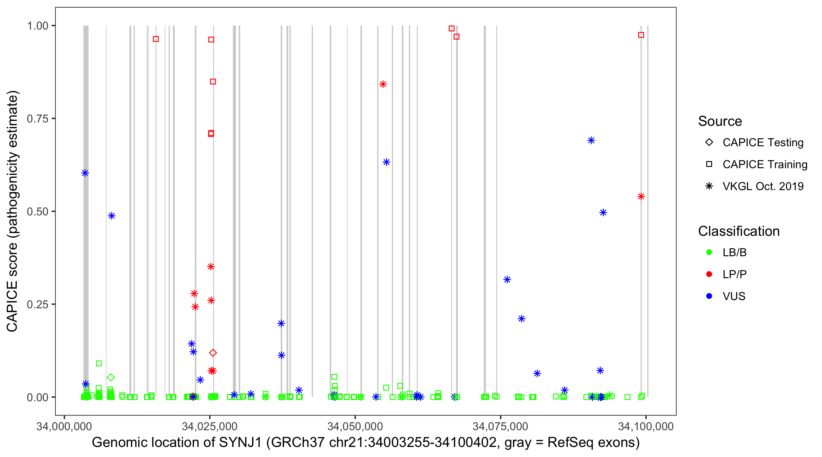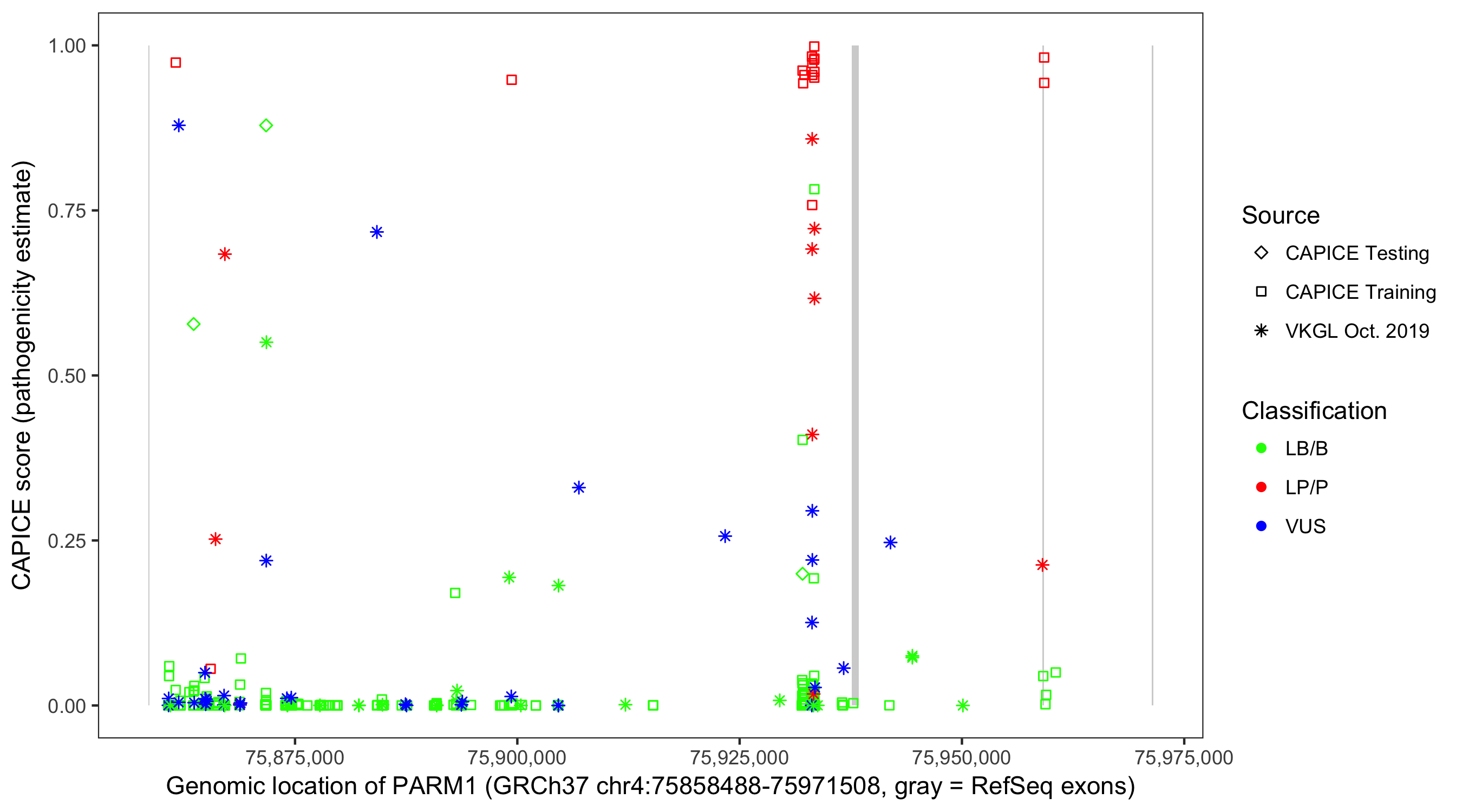 Shown are CAPICE train/test variants plus VKGL Oct 2019.