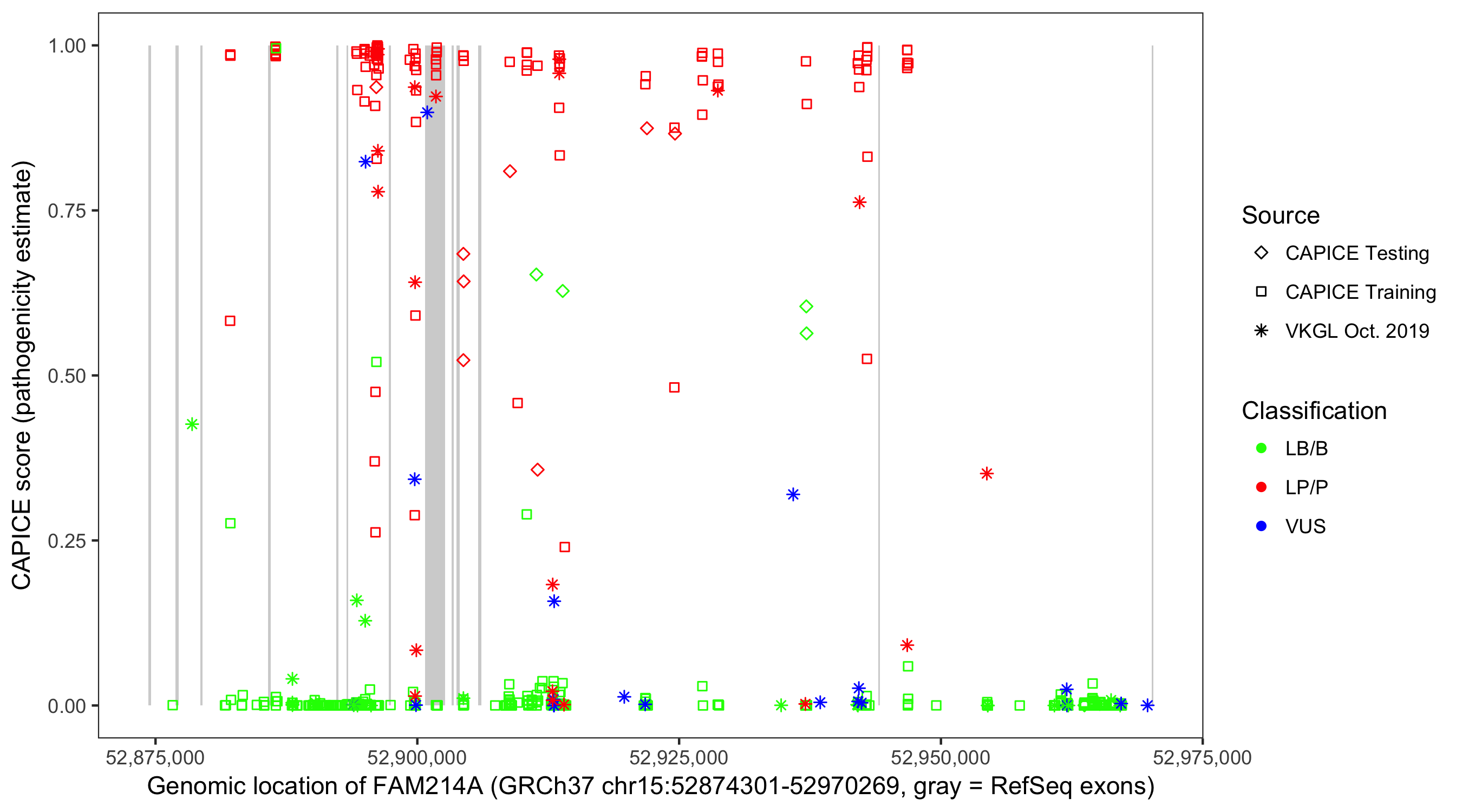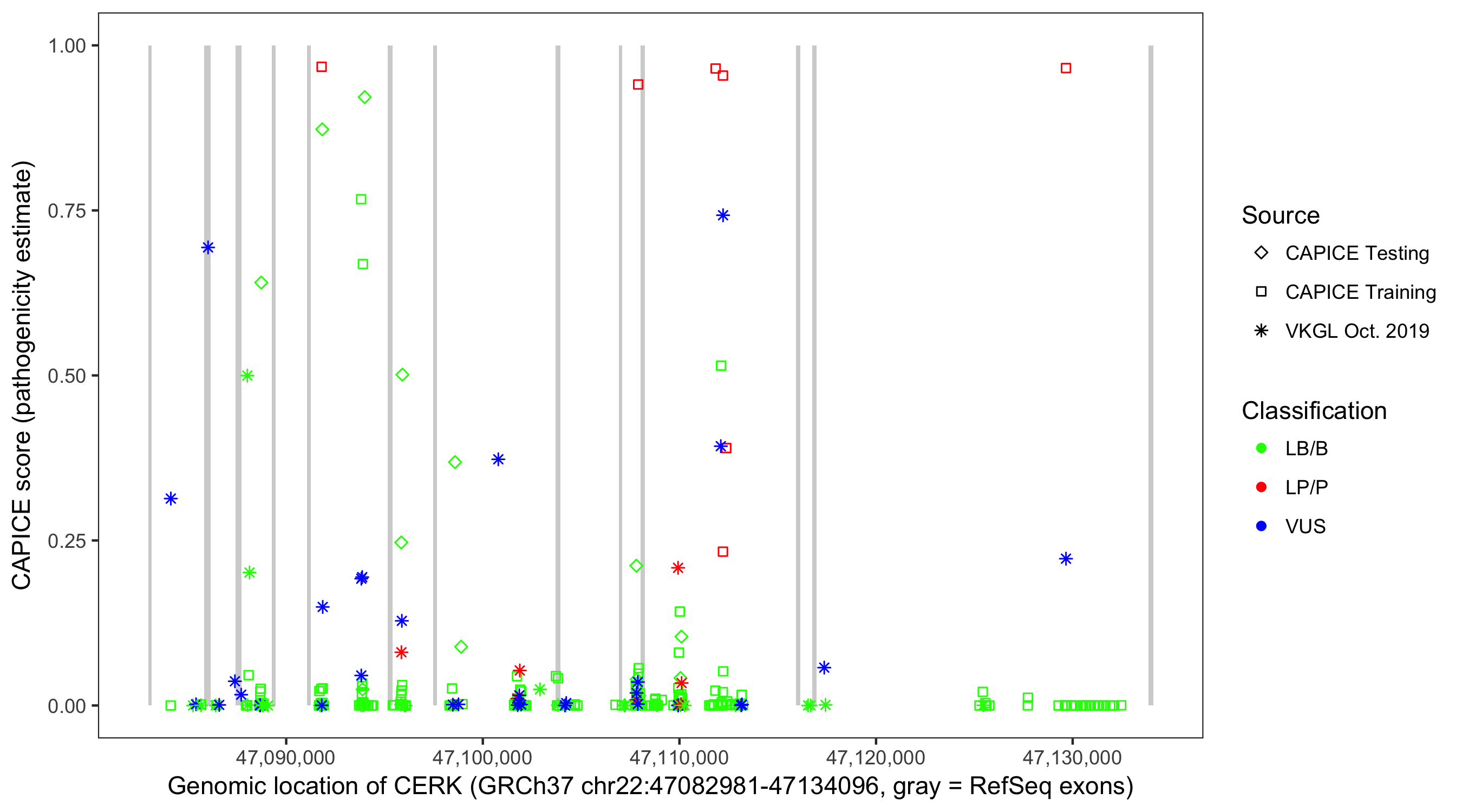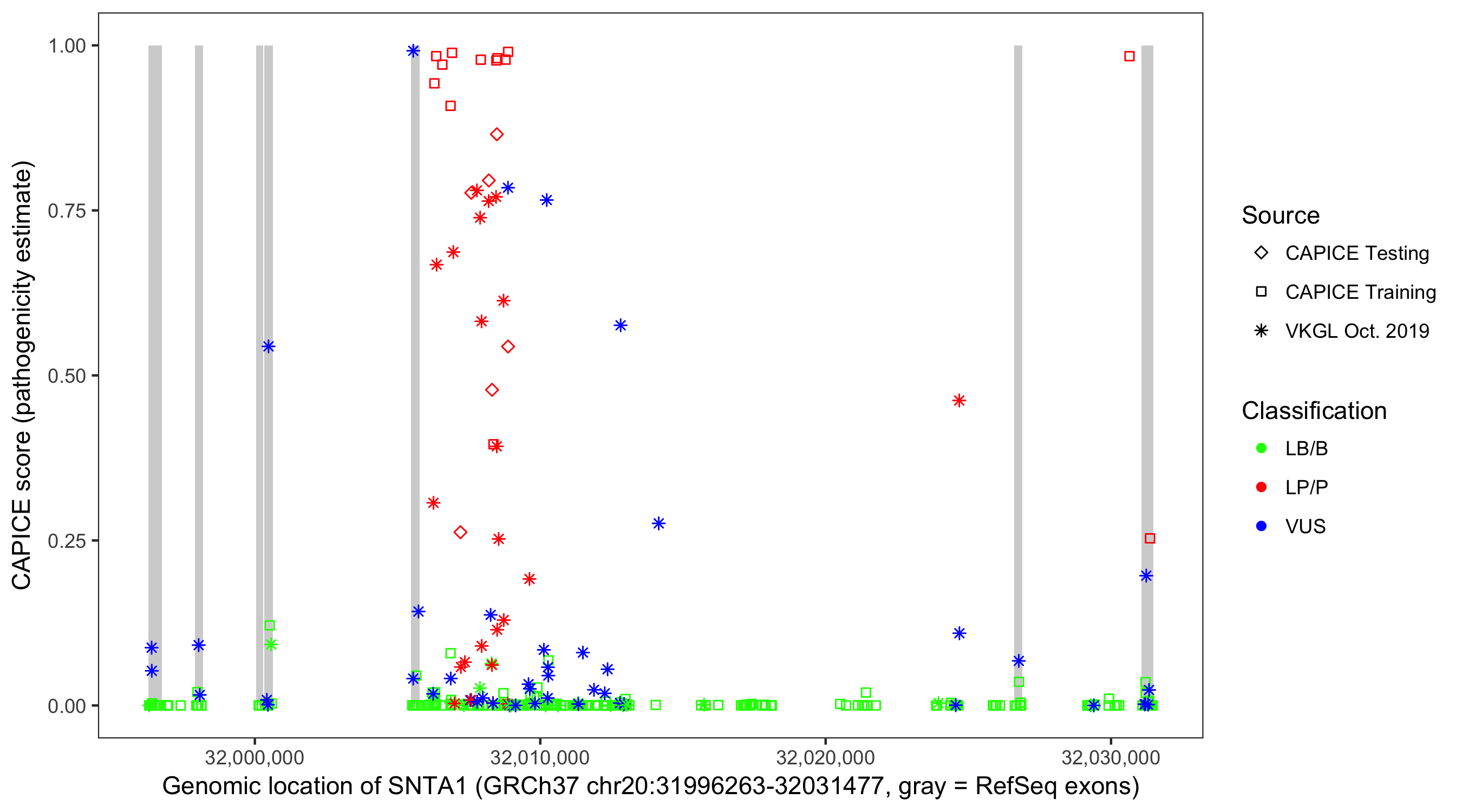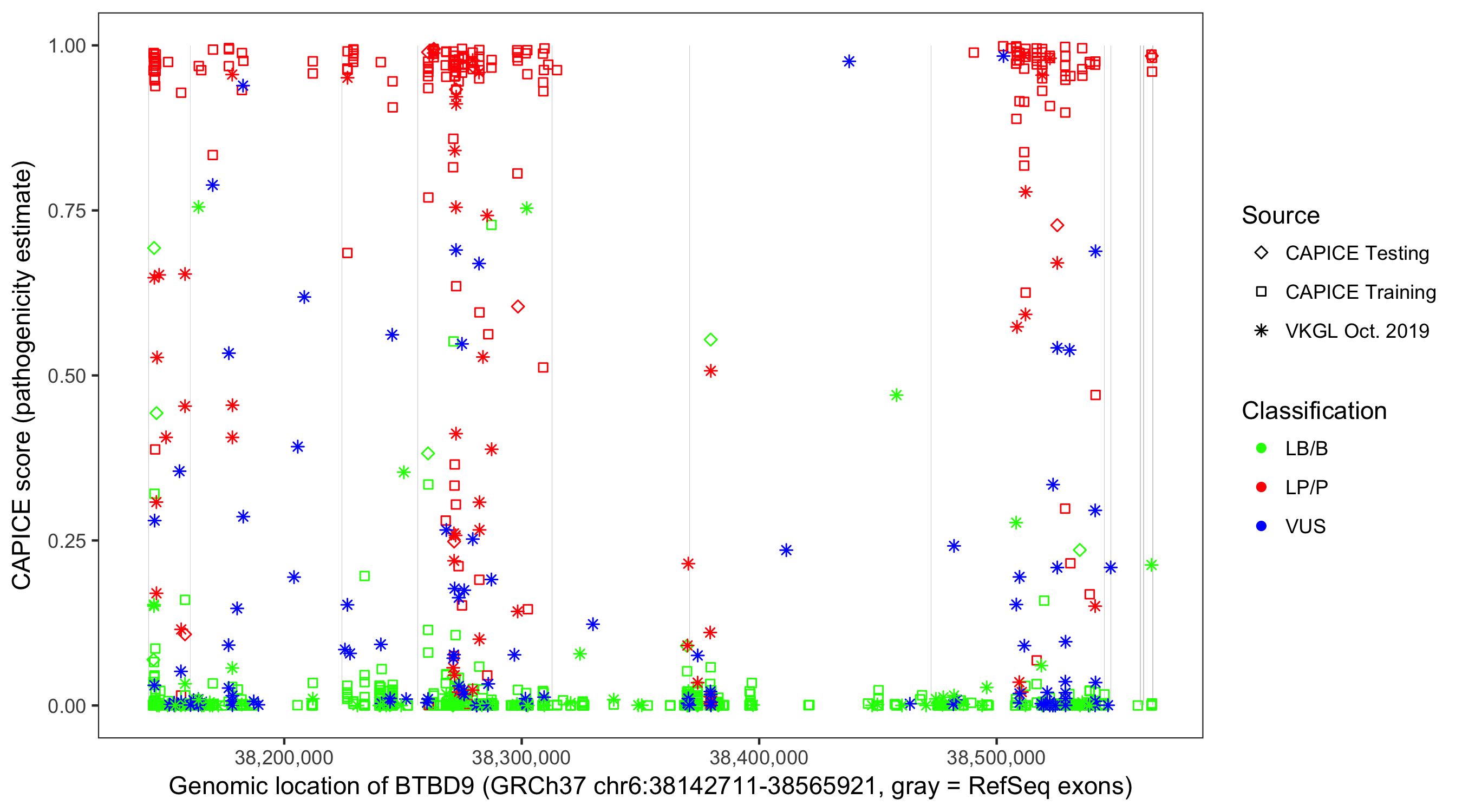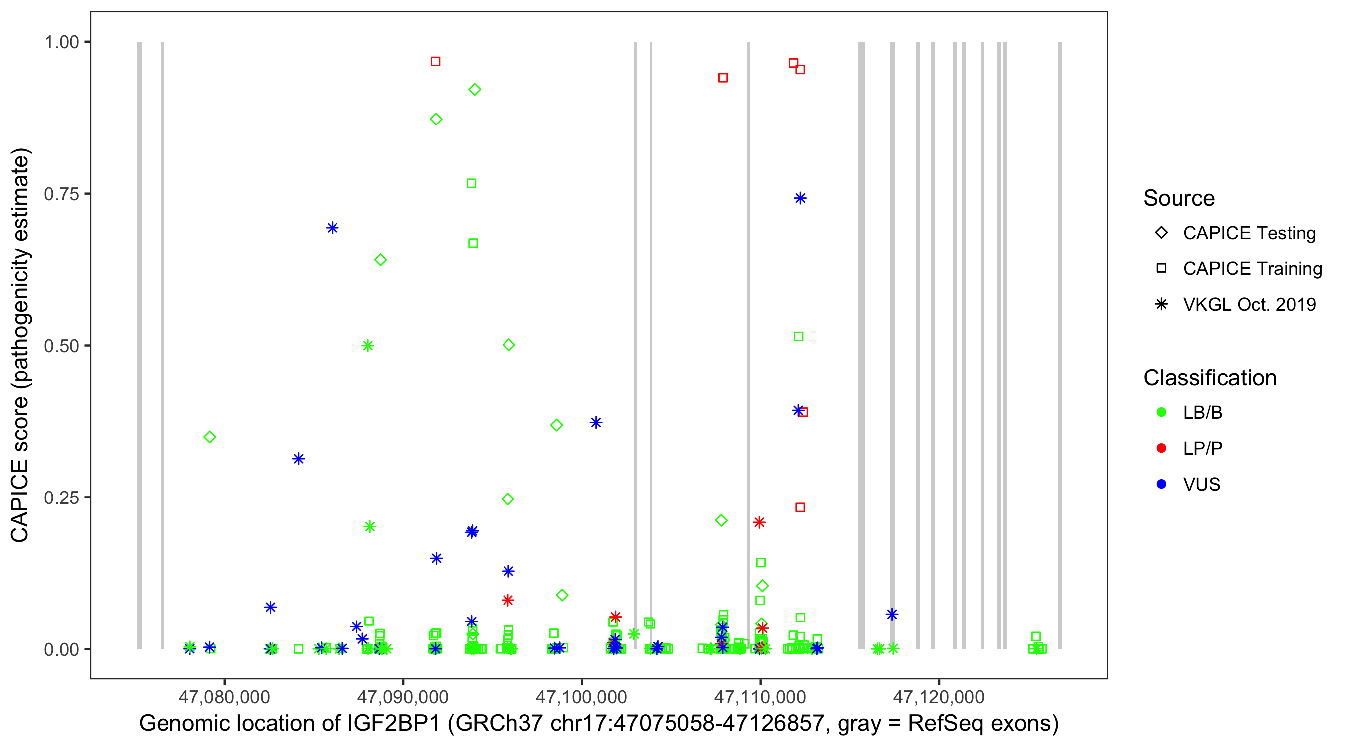 Shown are CAPICE train/test variants plus VKGL Oct 2019.