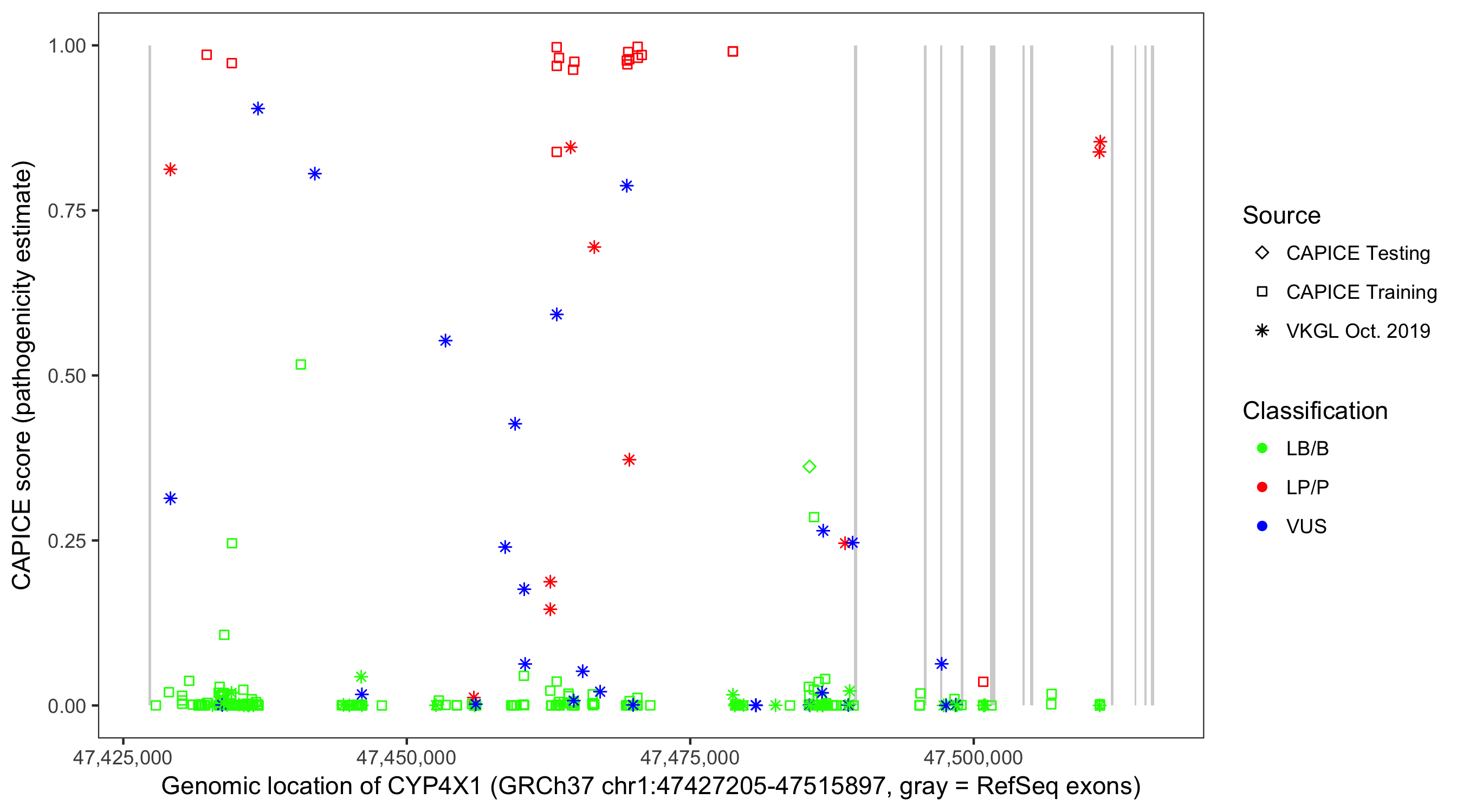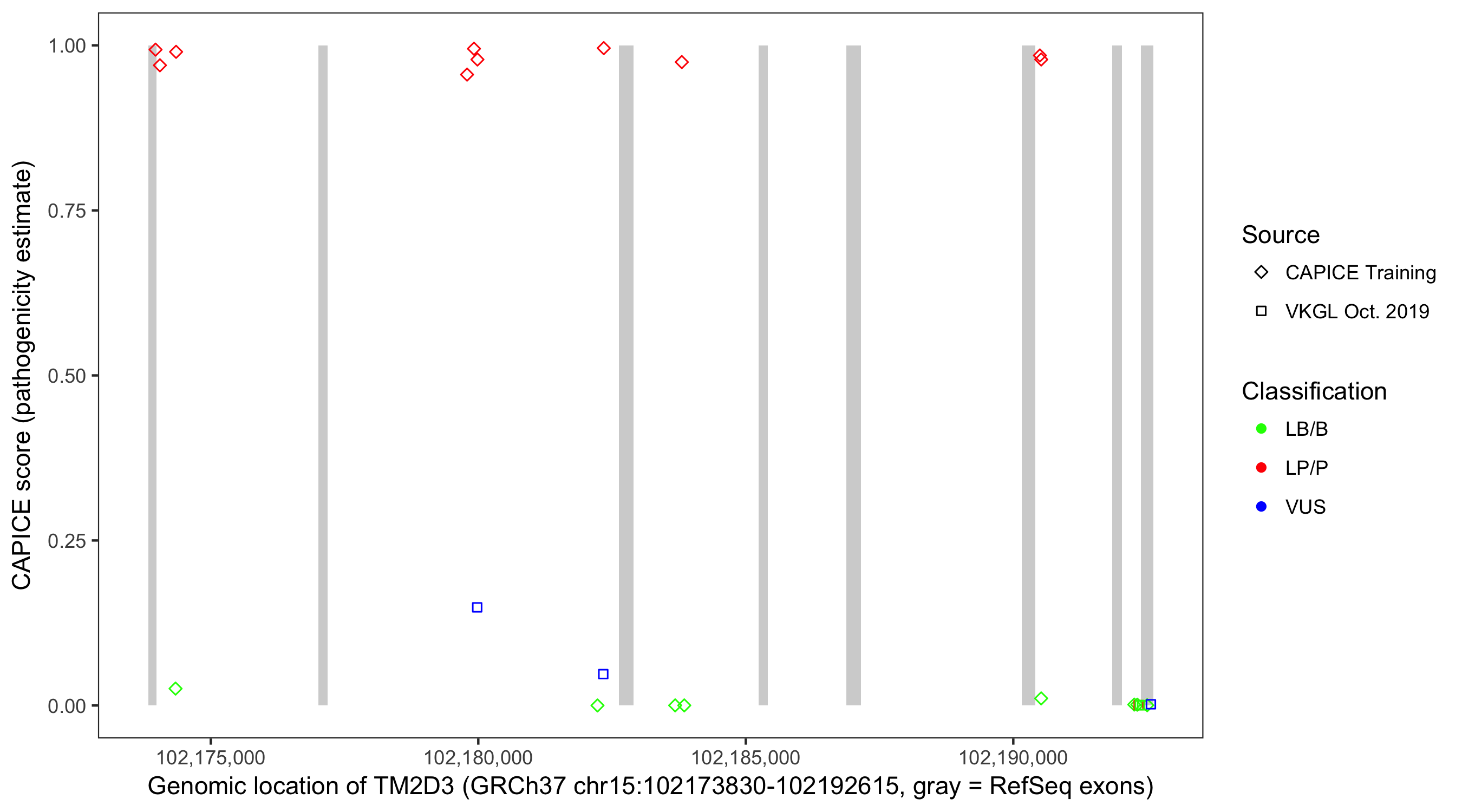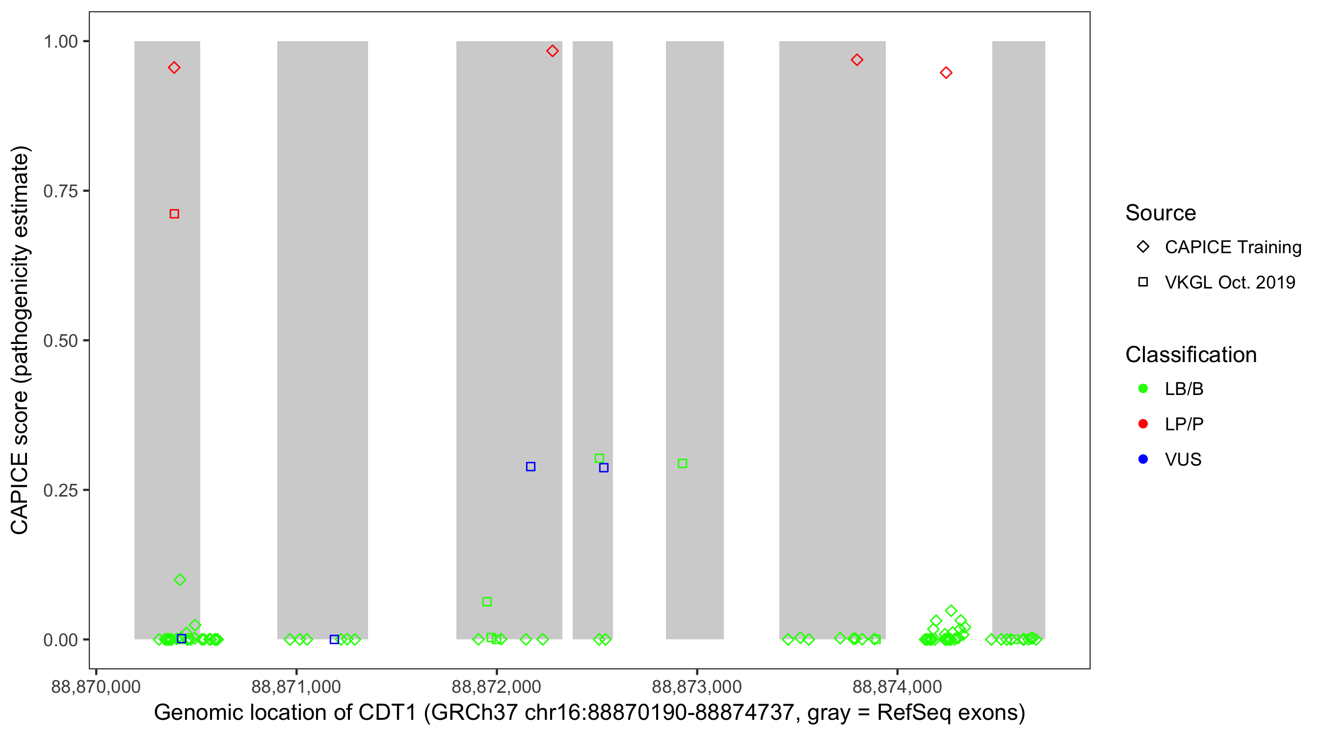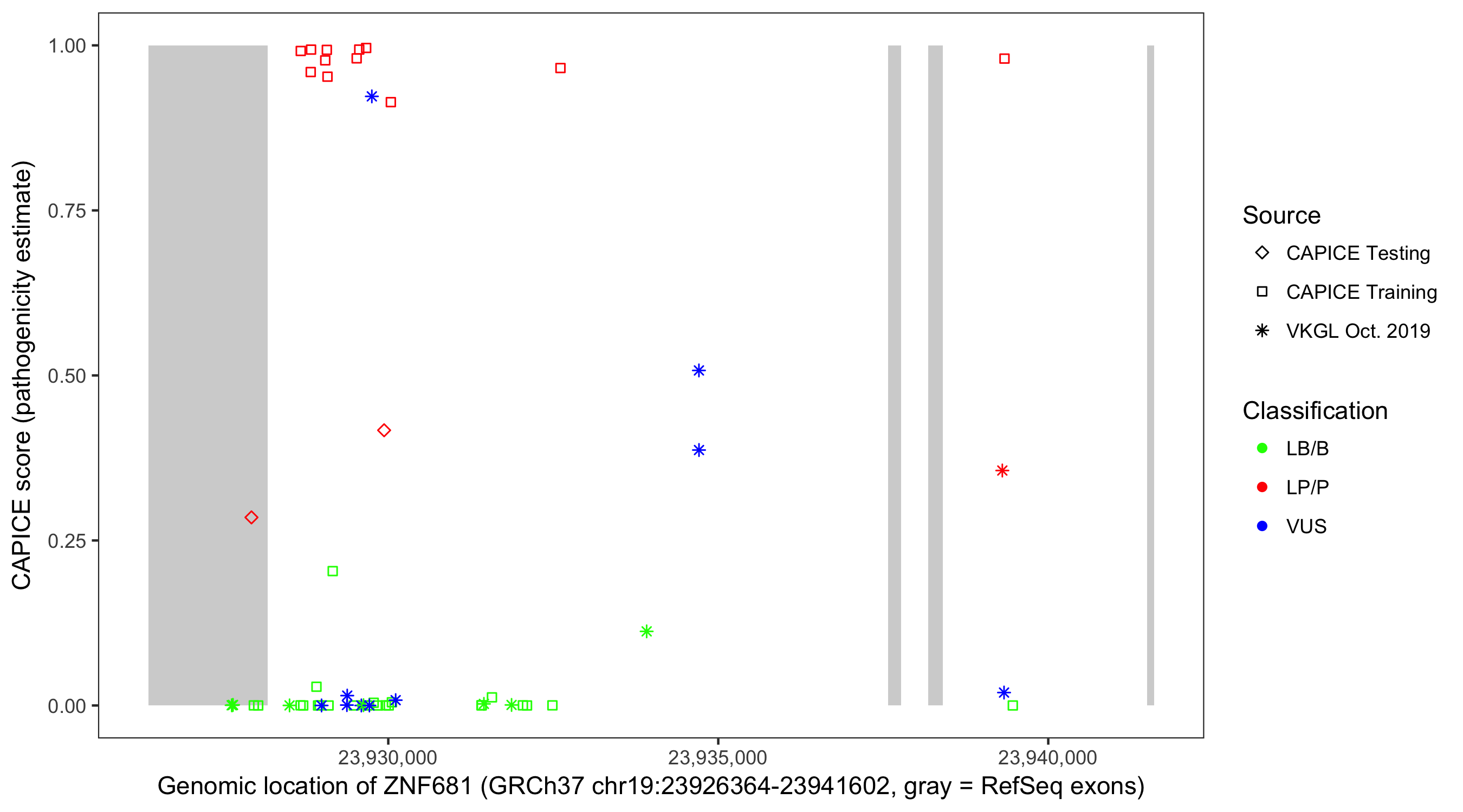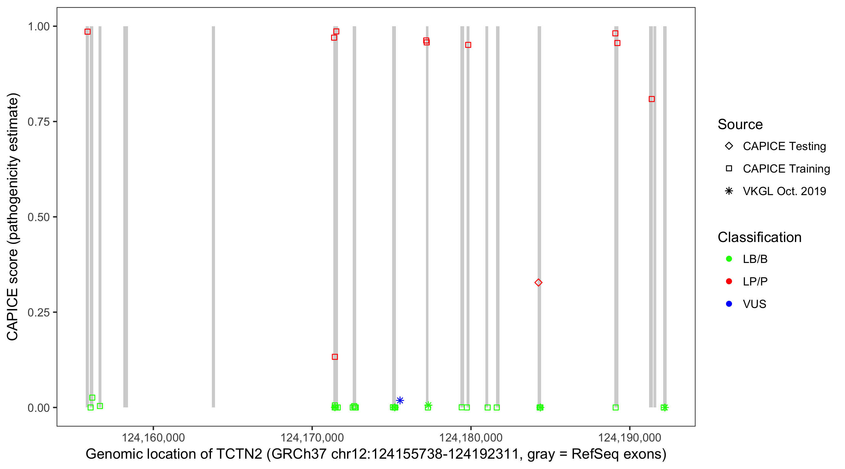 Shown are CAPICE train/test variants plus VKGL Oct 2019.