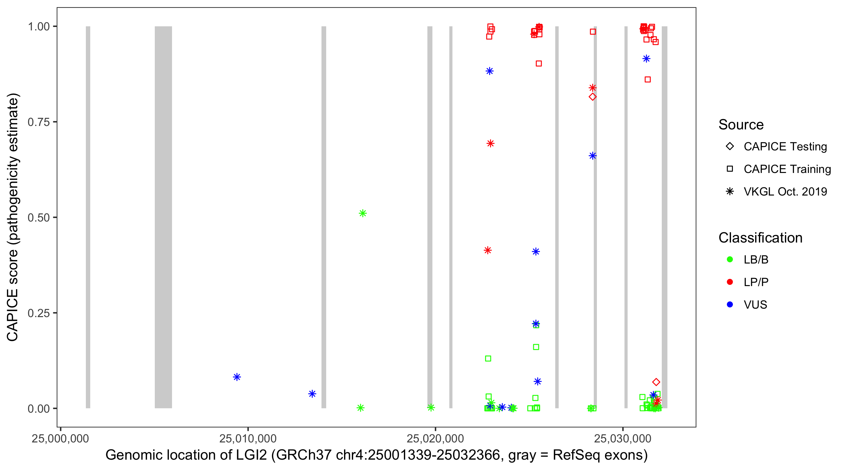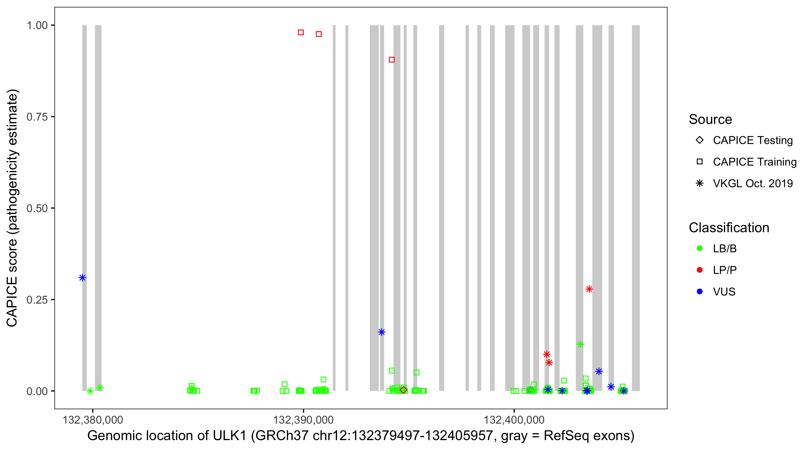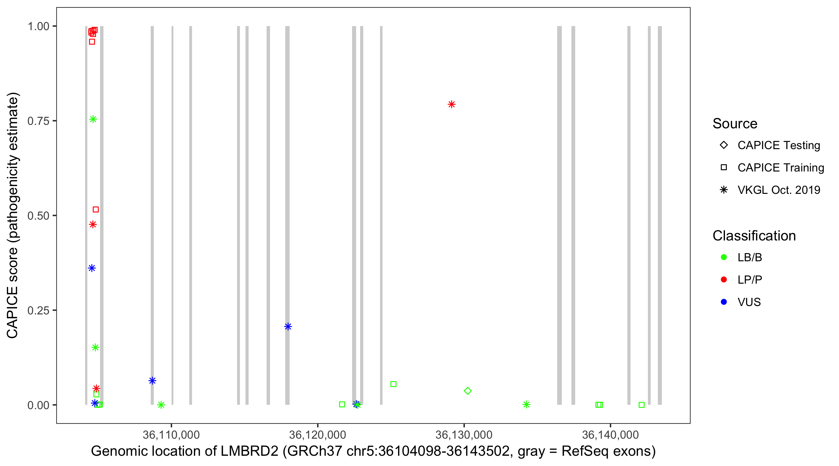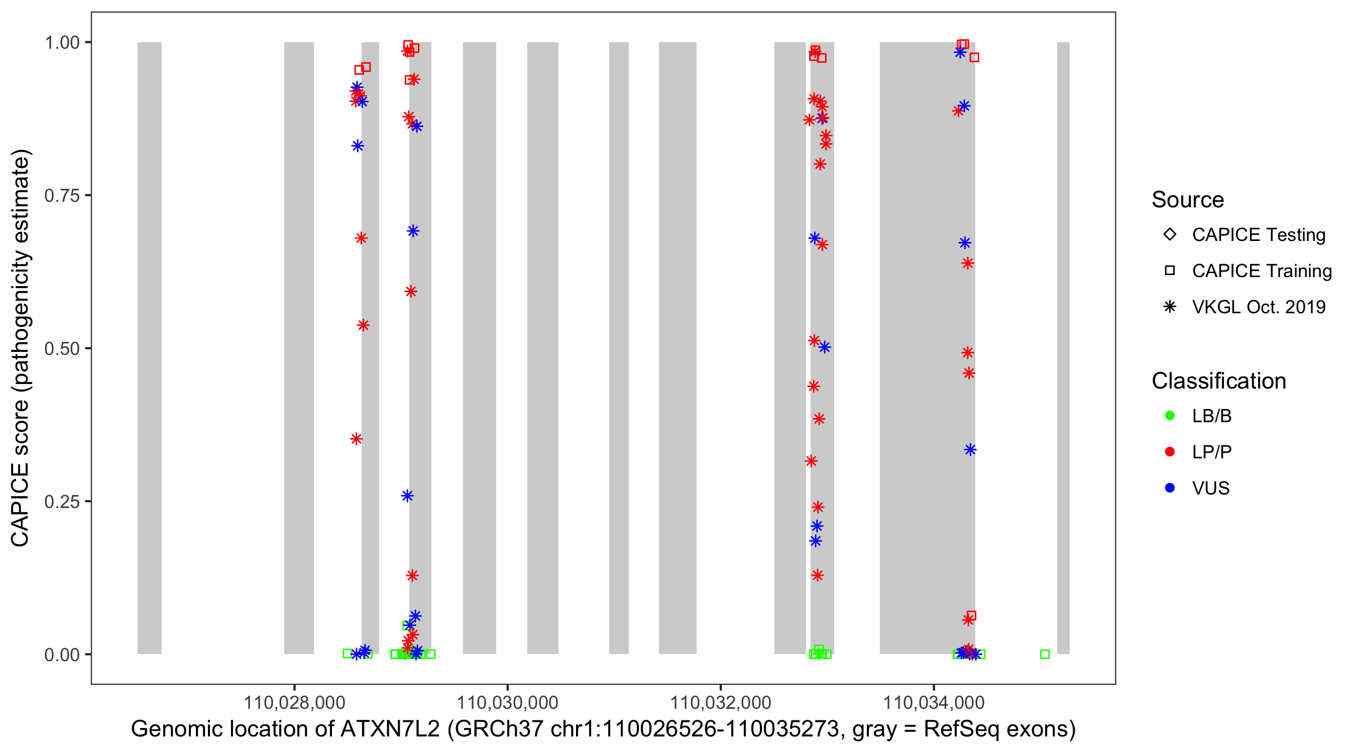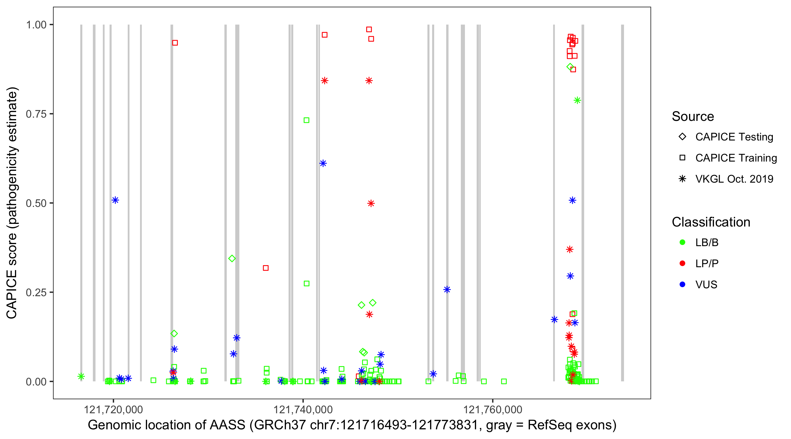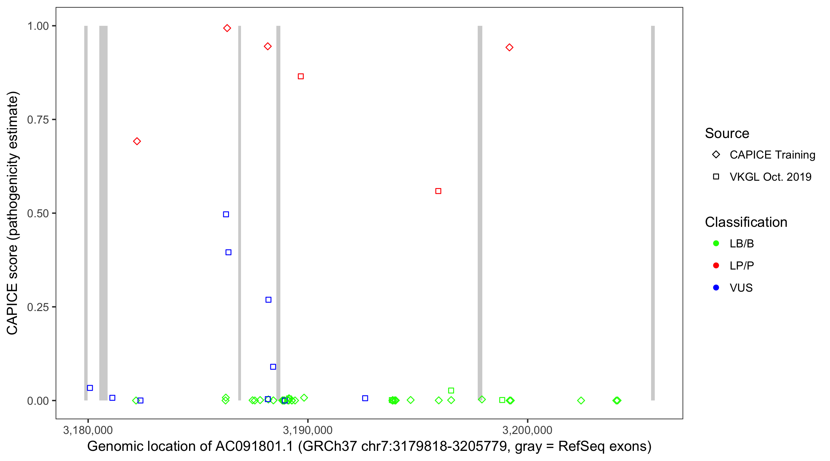 Shown are CAPICE train/test variants plus VKGL Oct 2019.