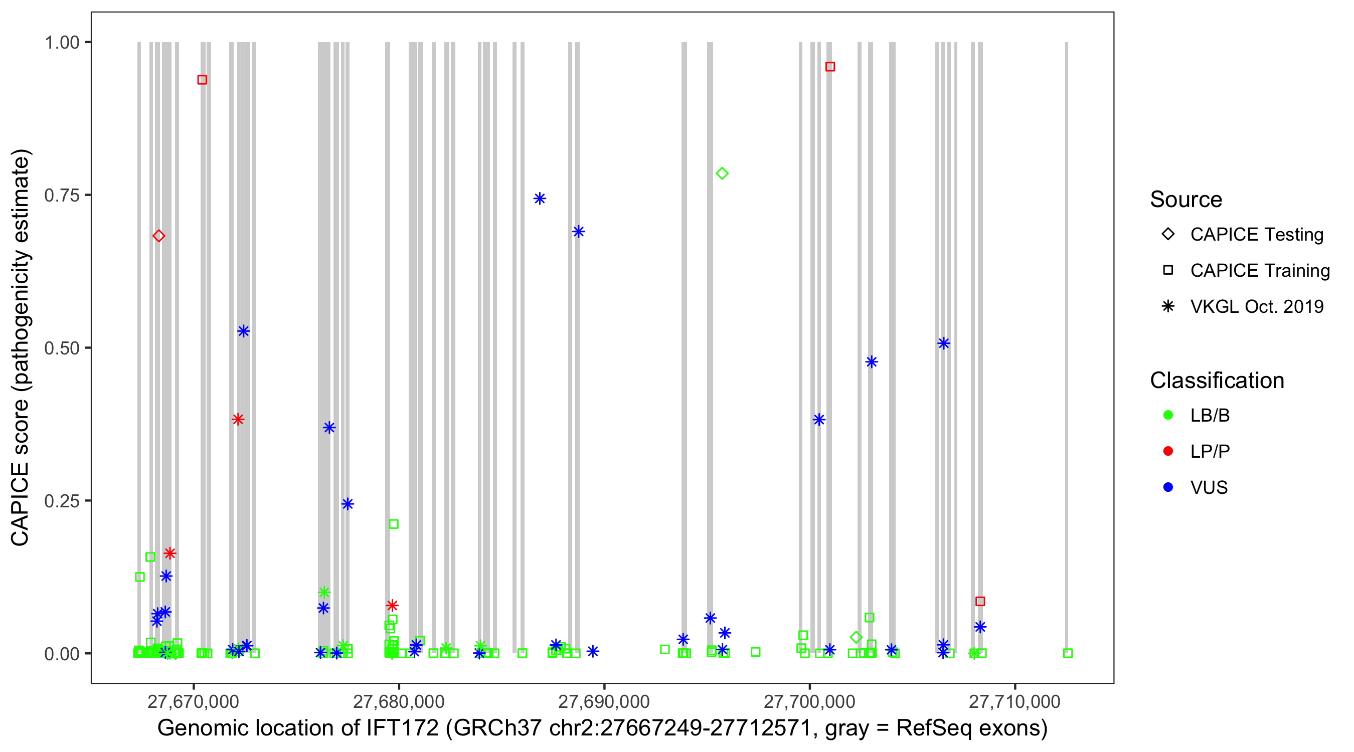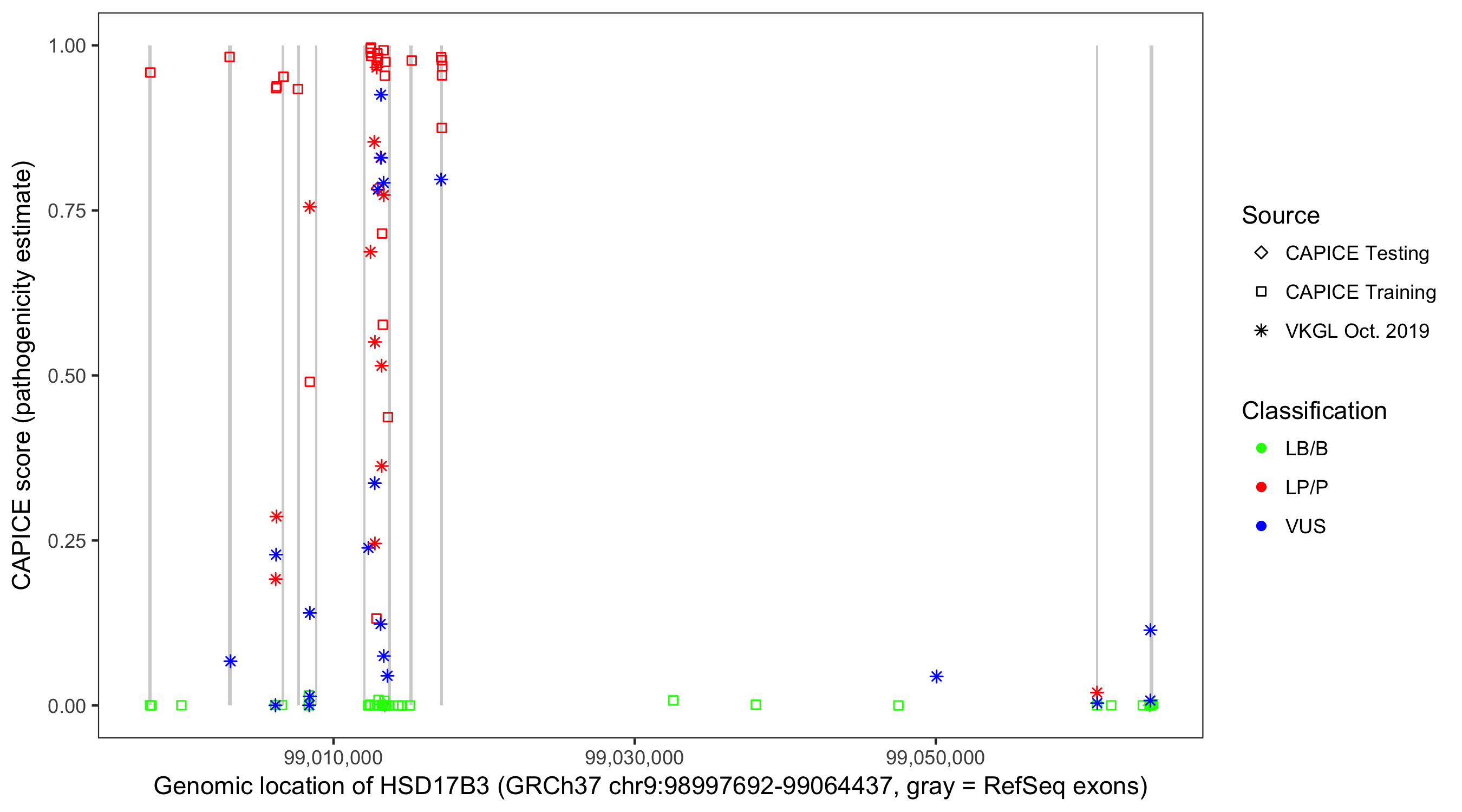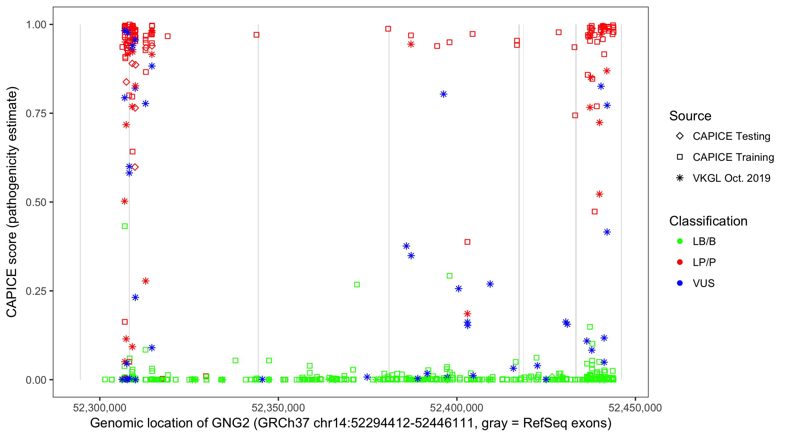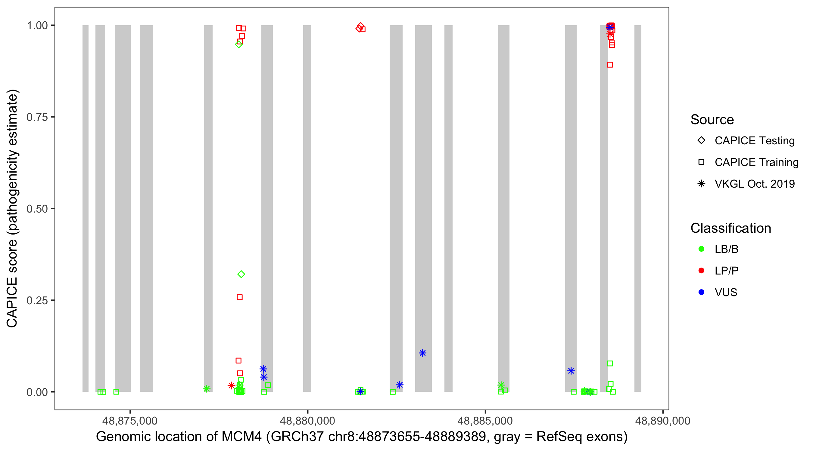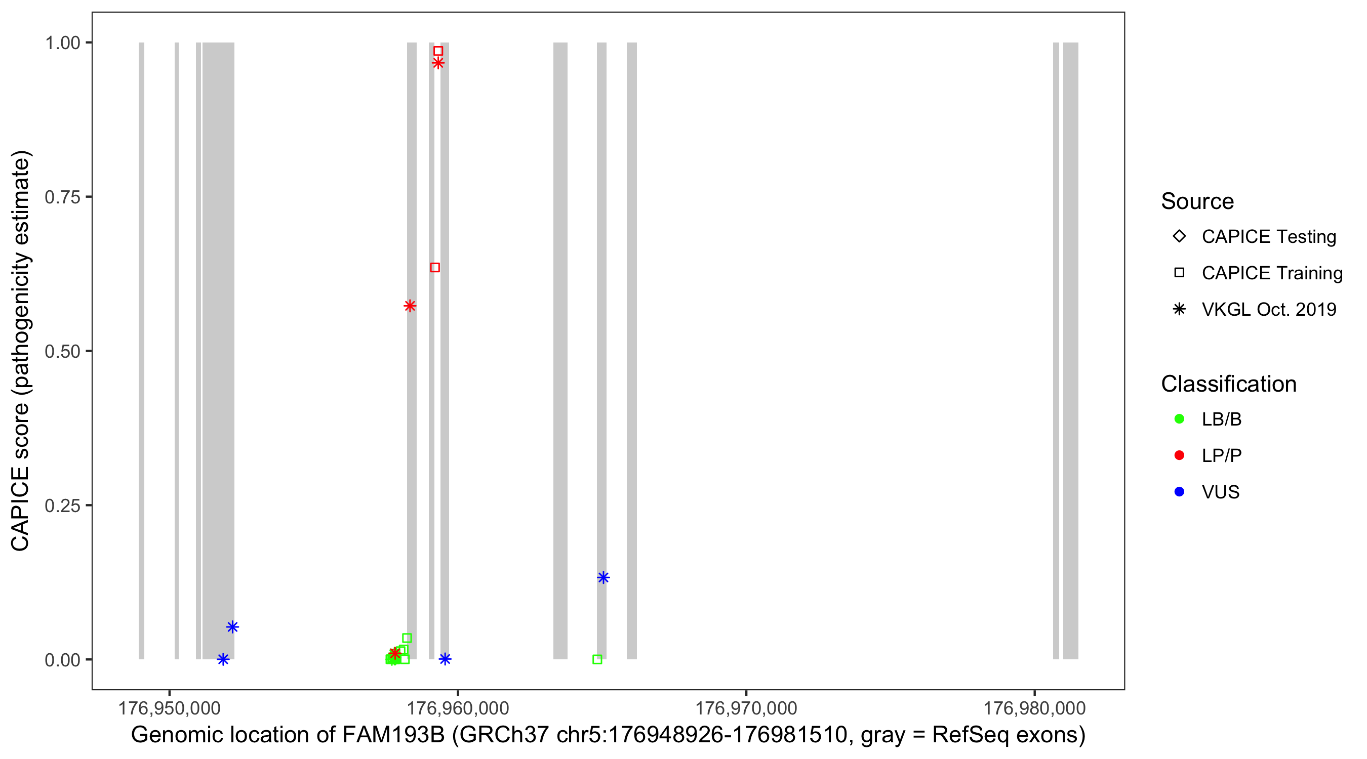 Shown are CAPICE train/test variants plus VKGL Oct 2019.