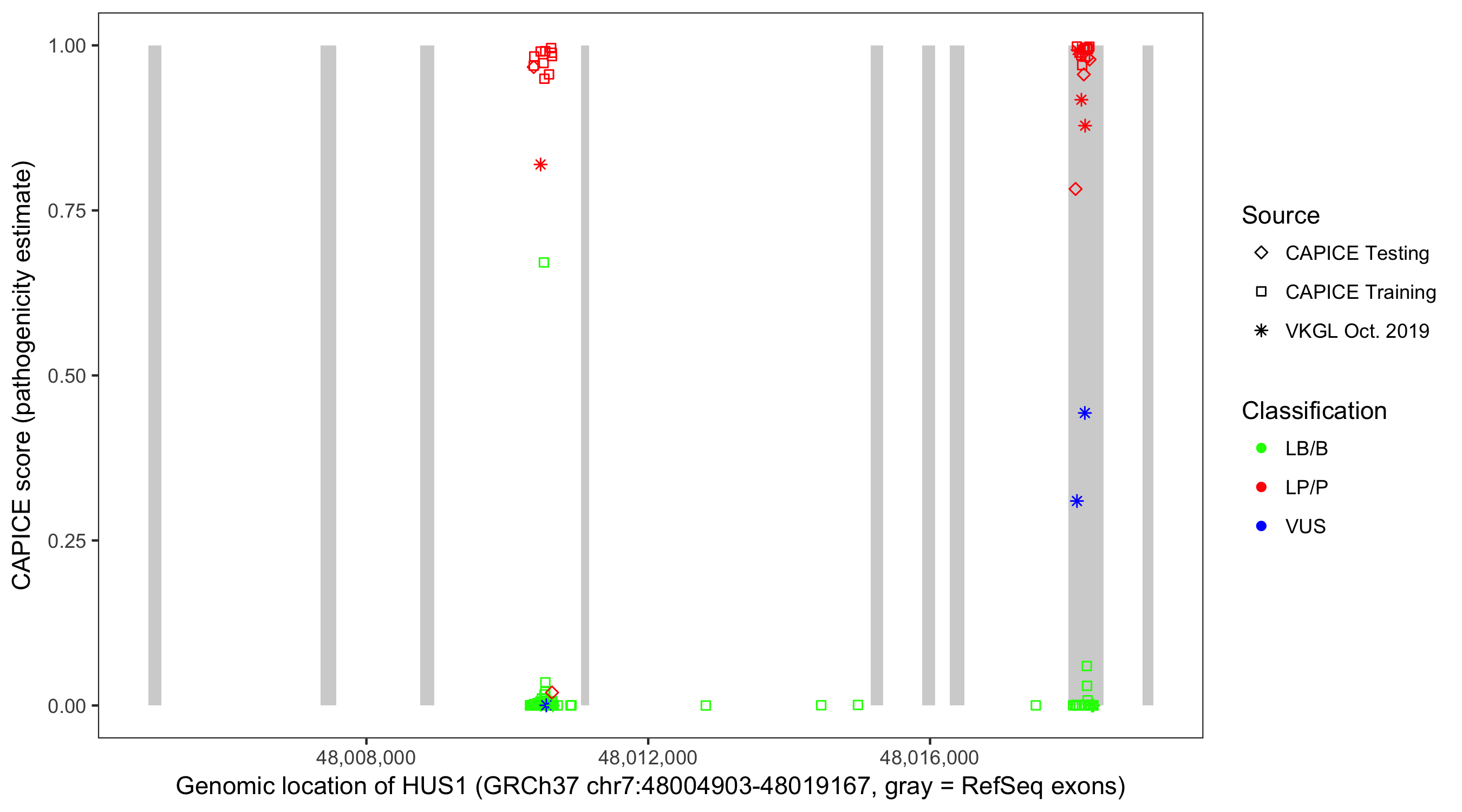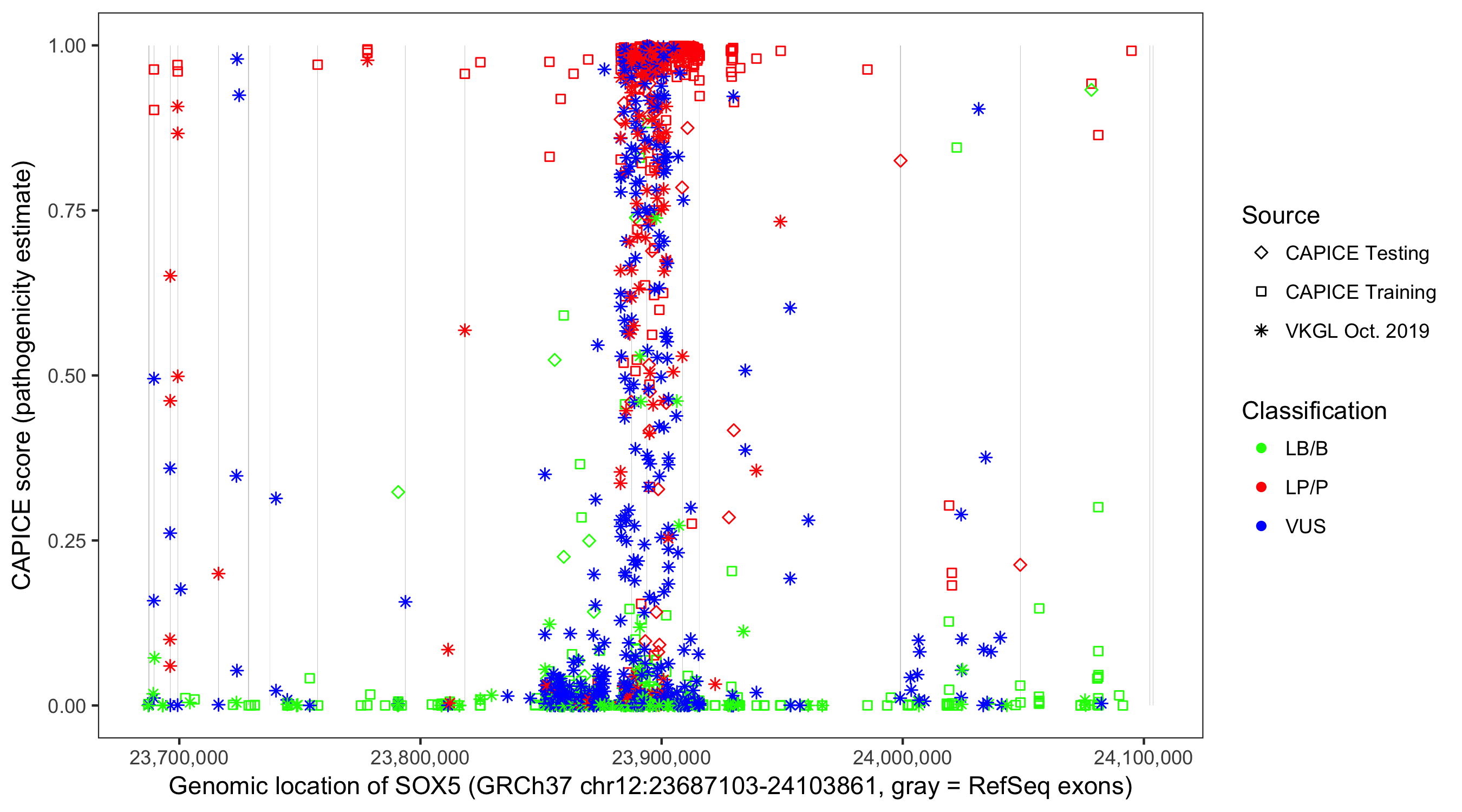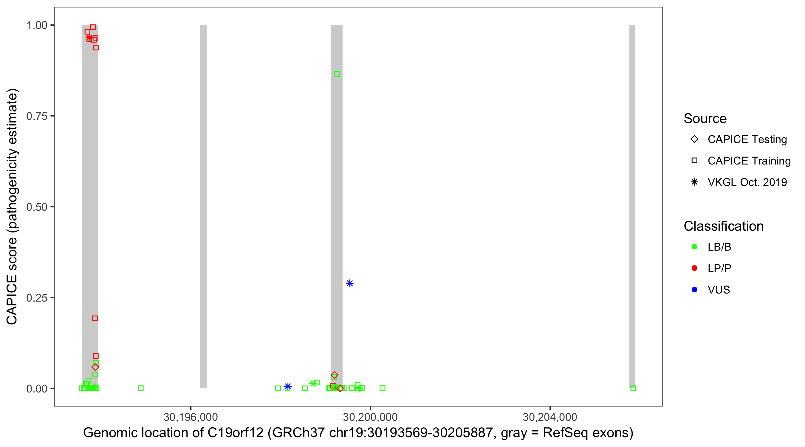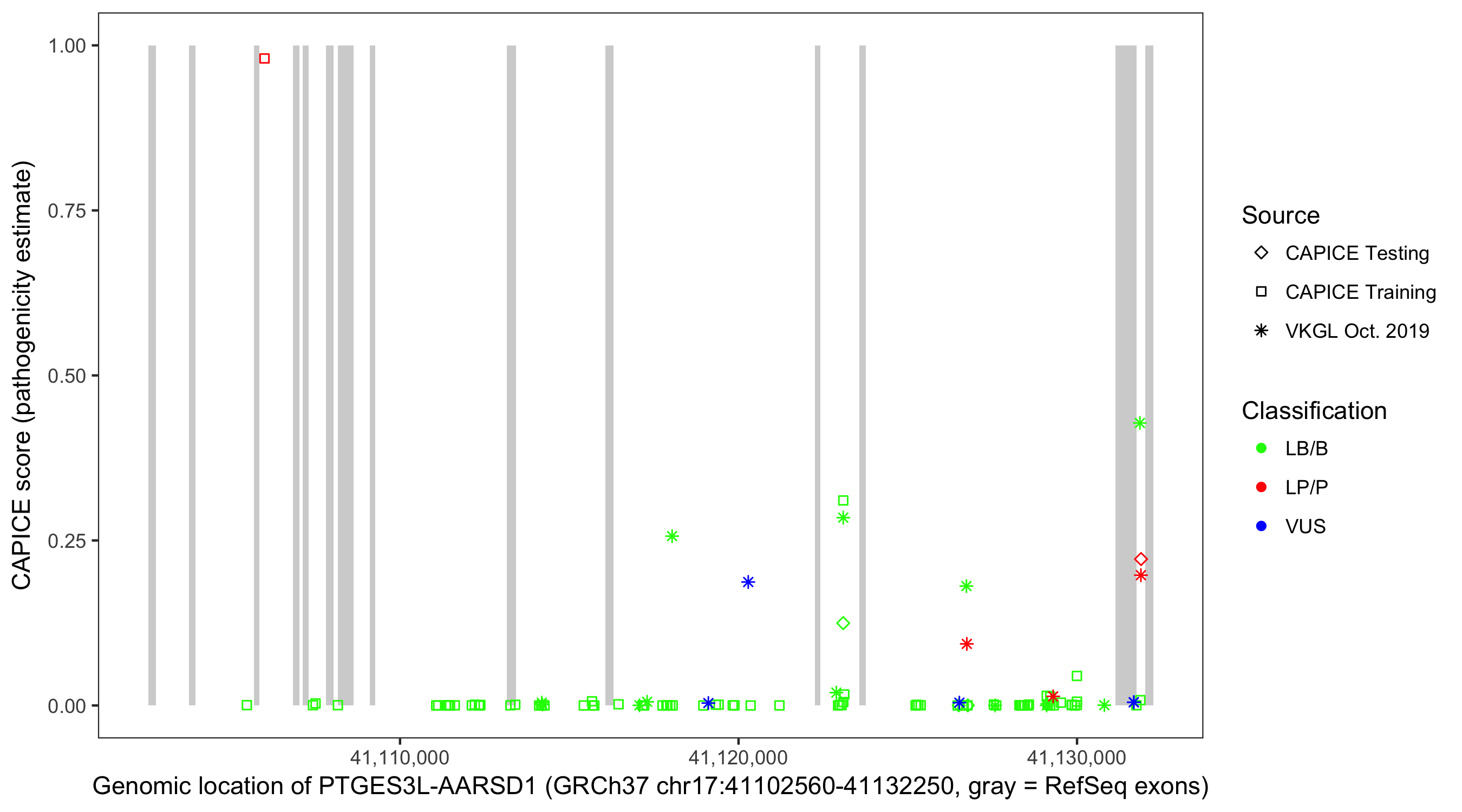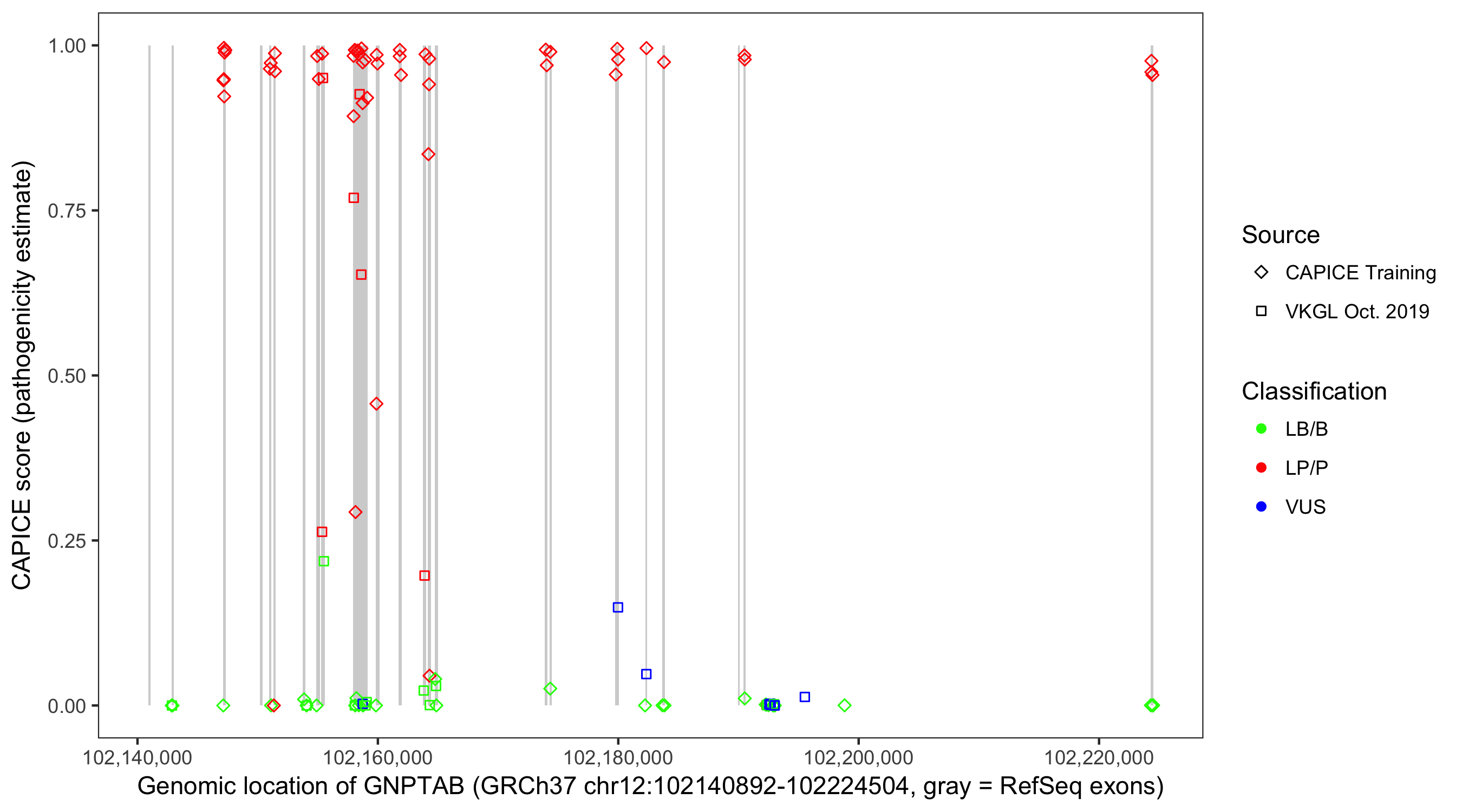 Shown are CAPICE train/test variants plus VKGL Oct 2019.