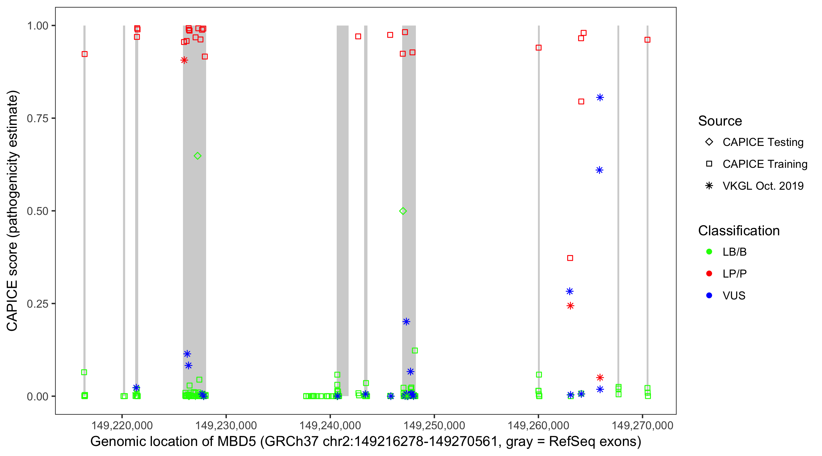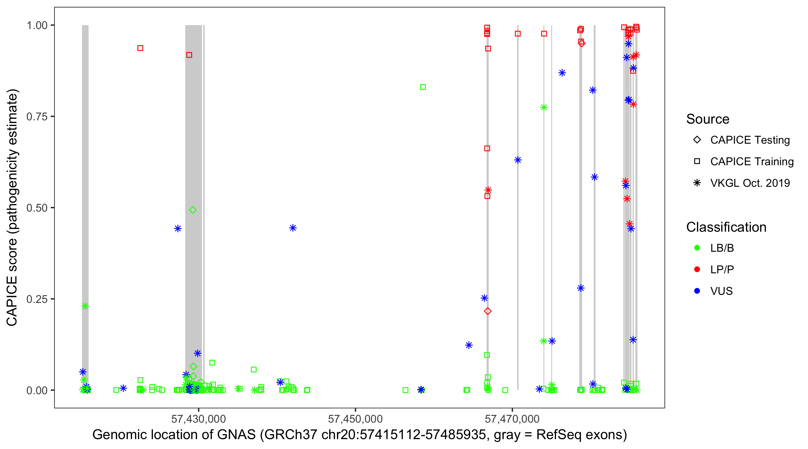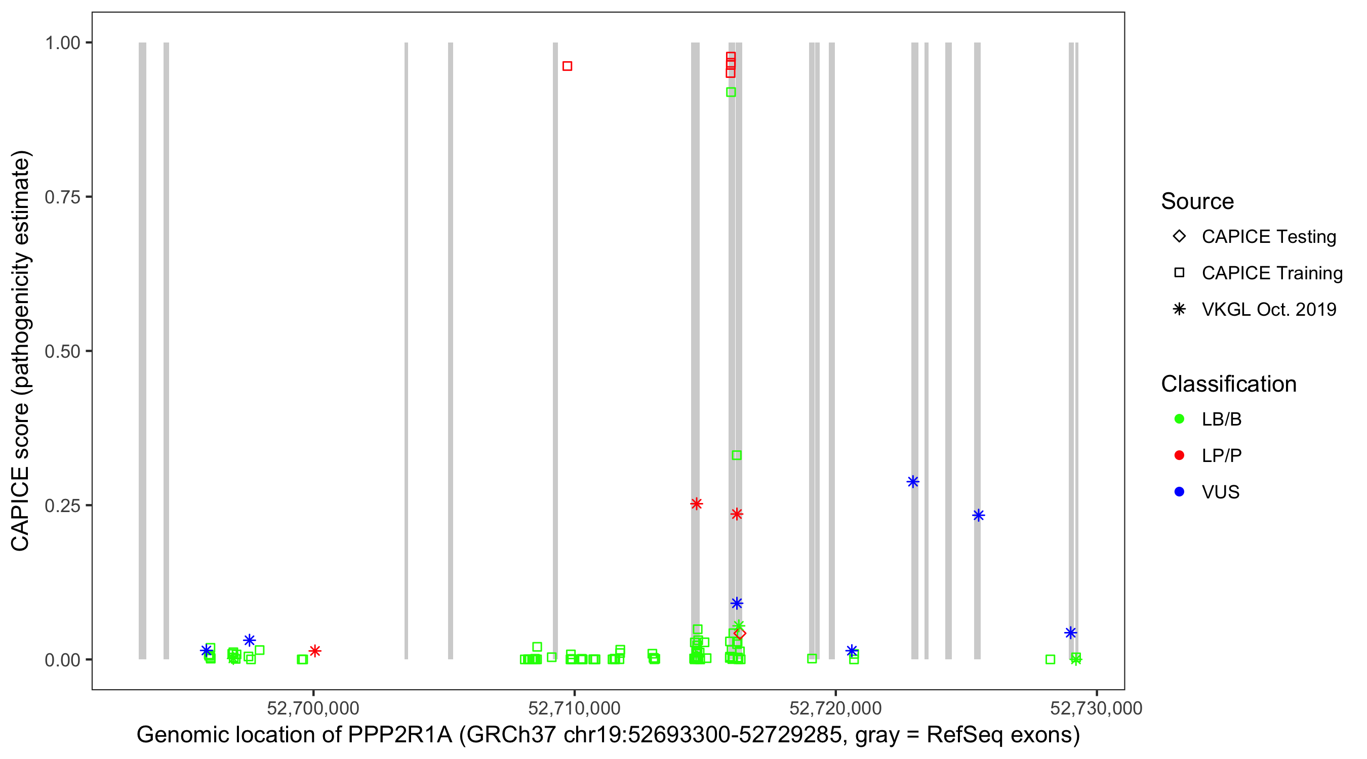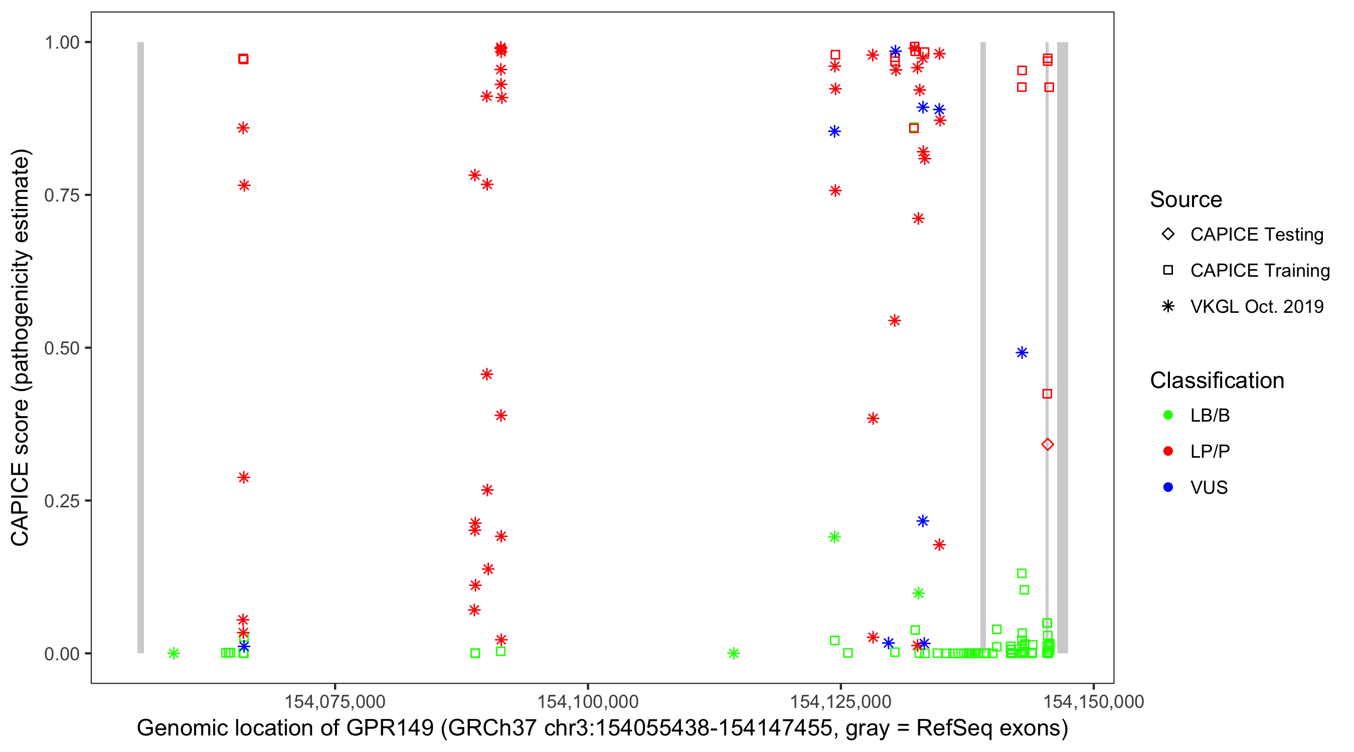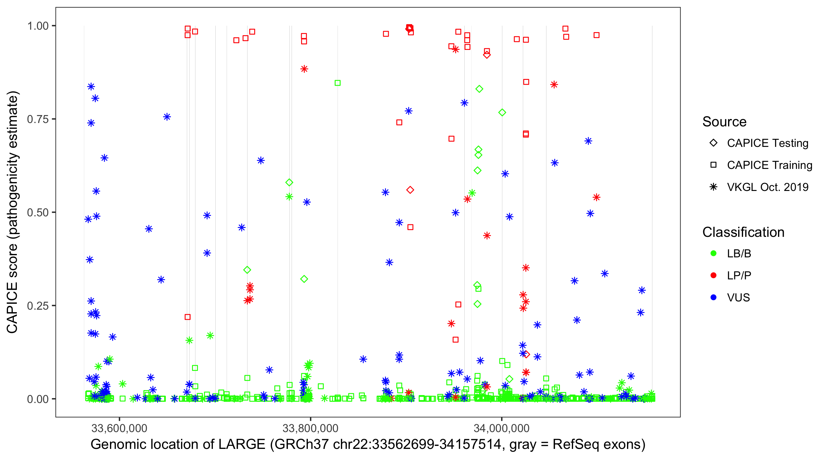 Shown are CAPICE train/test variants plus VKGL Oct 2019.