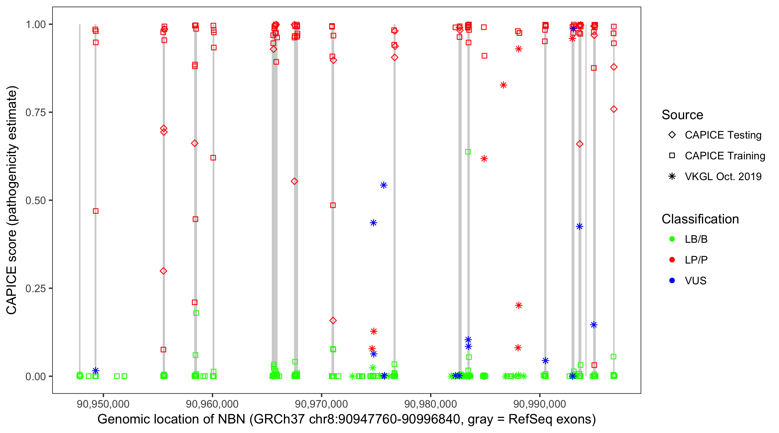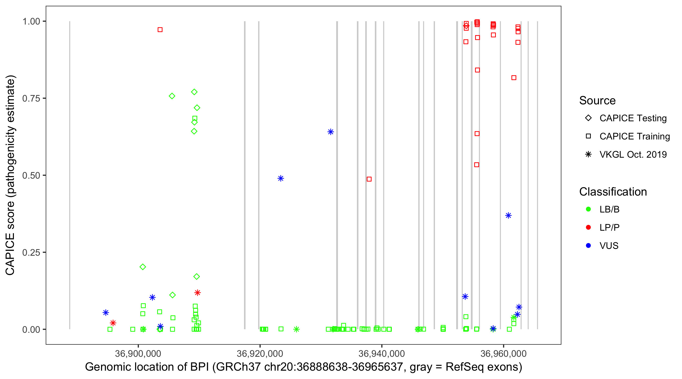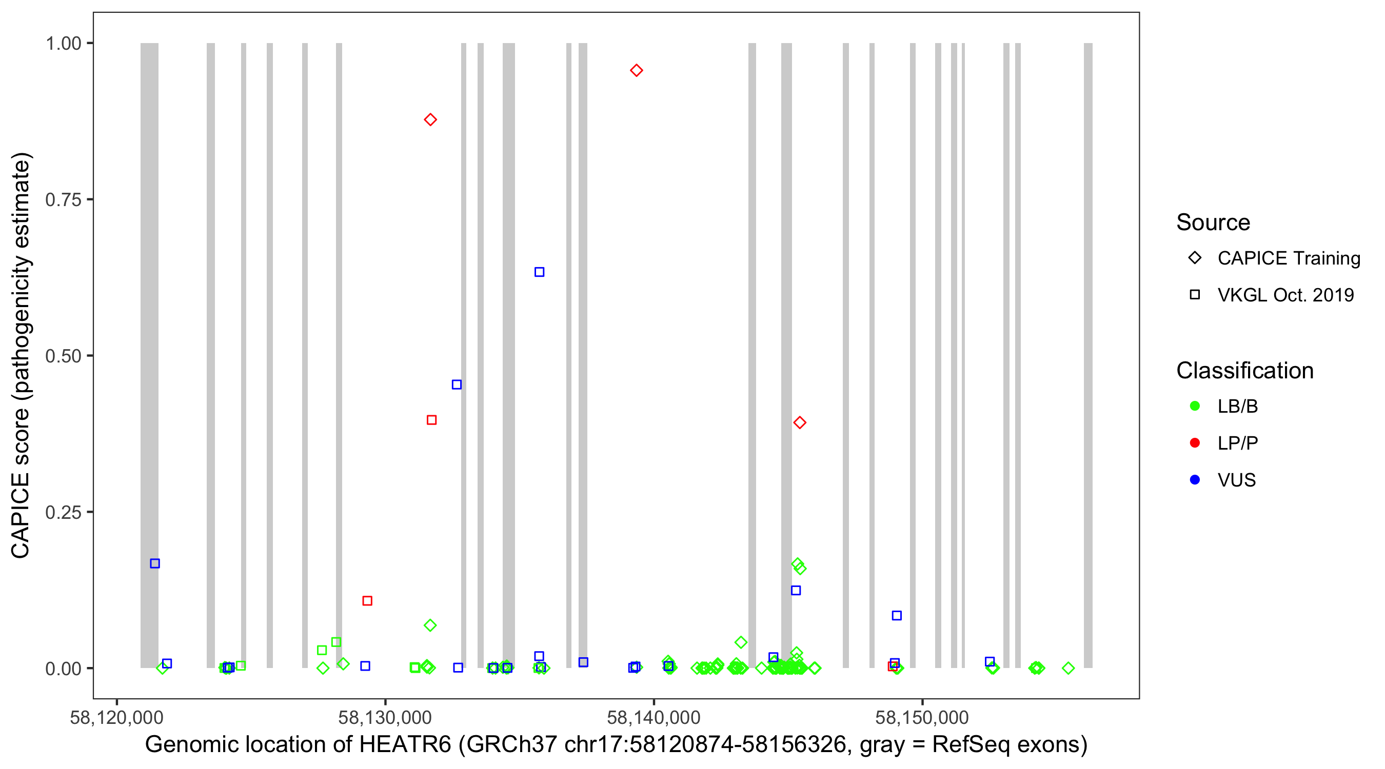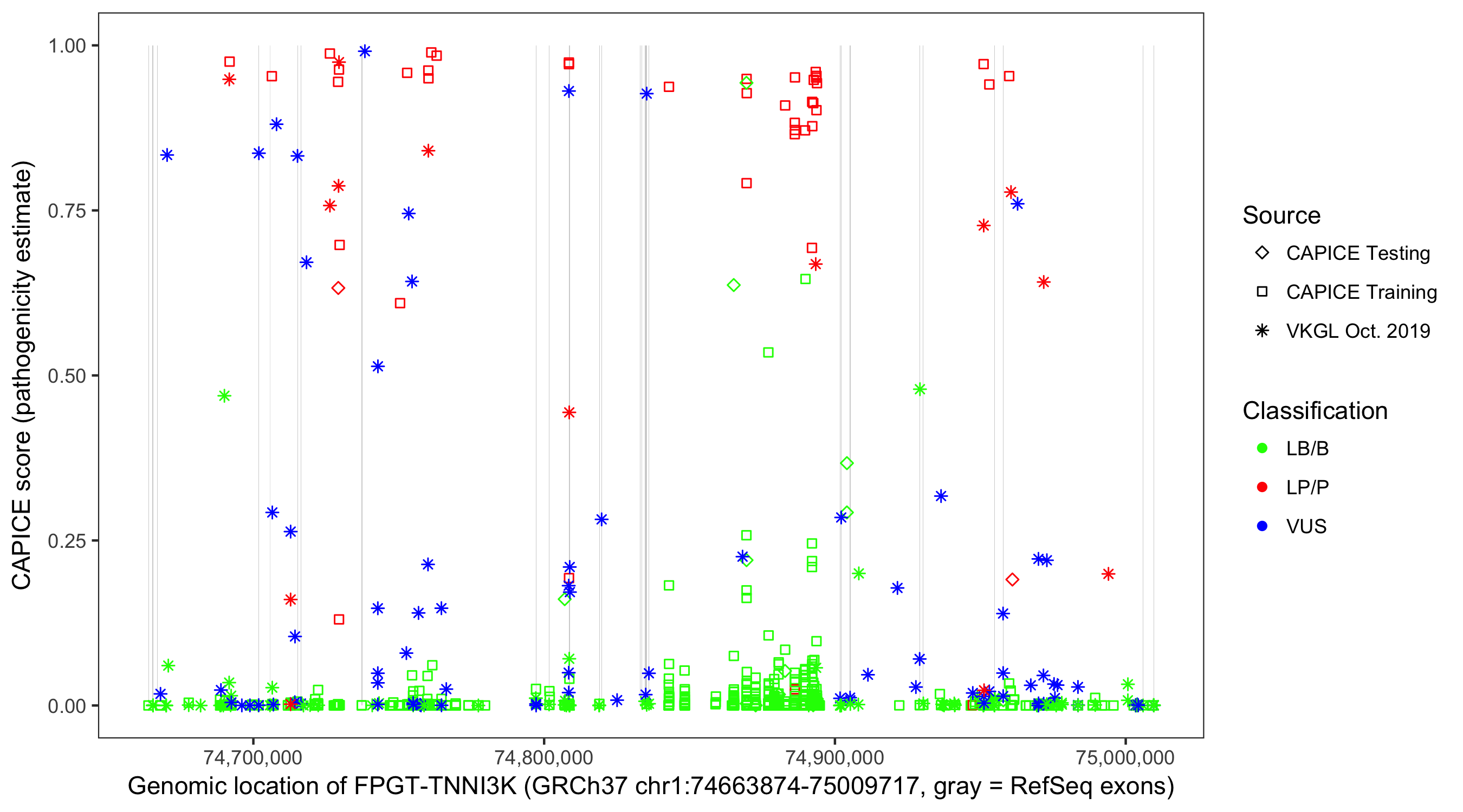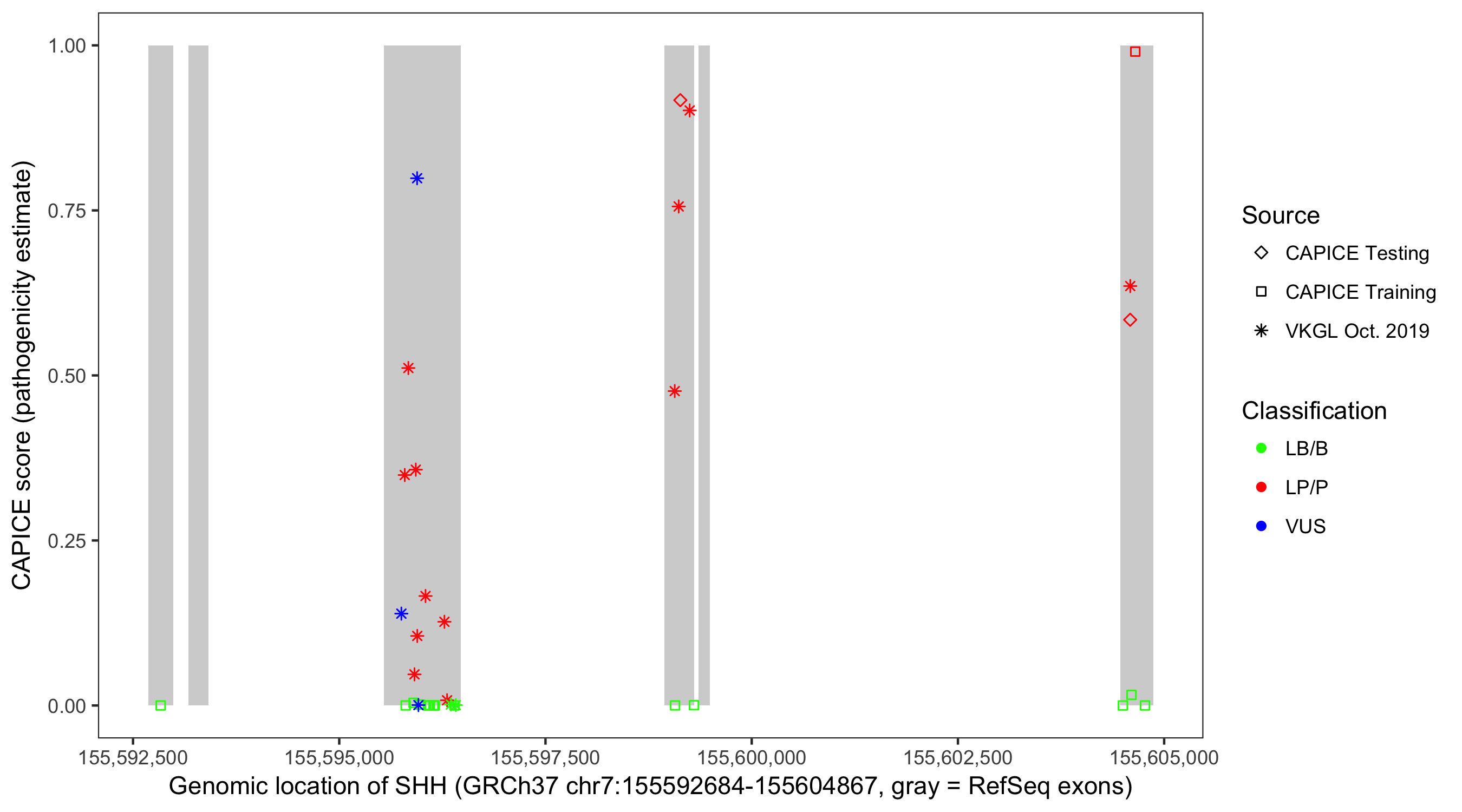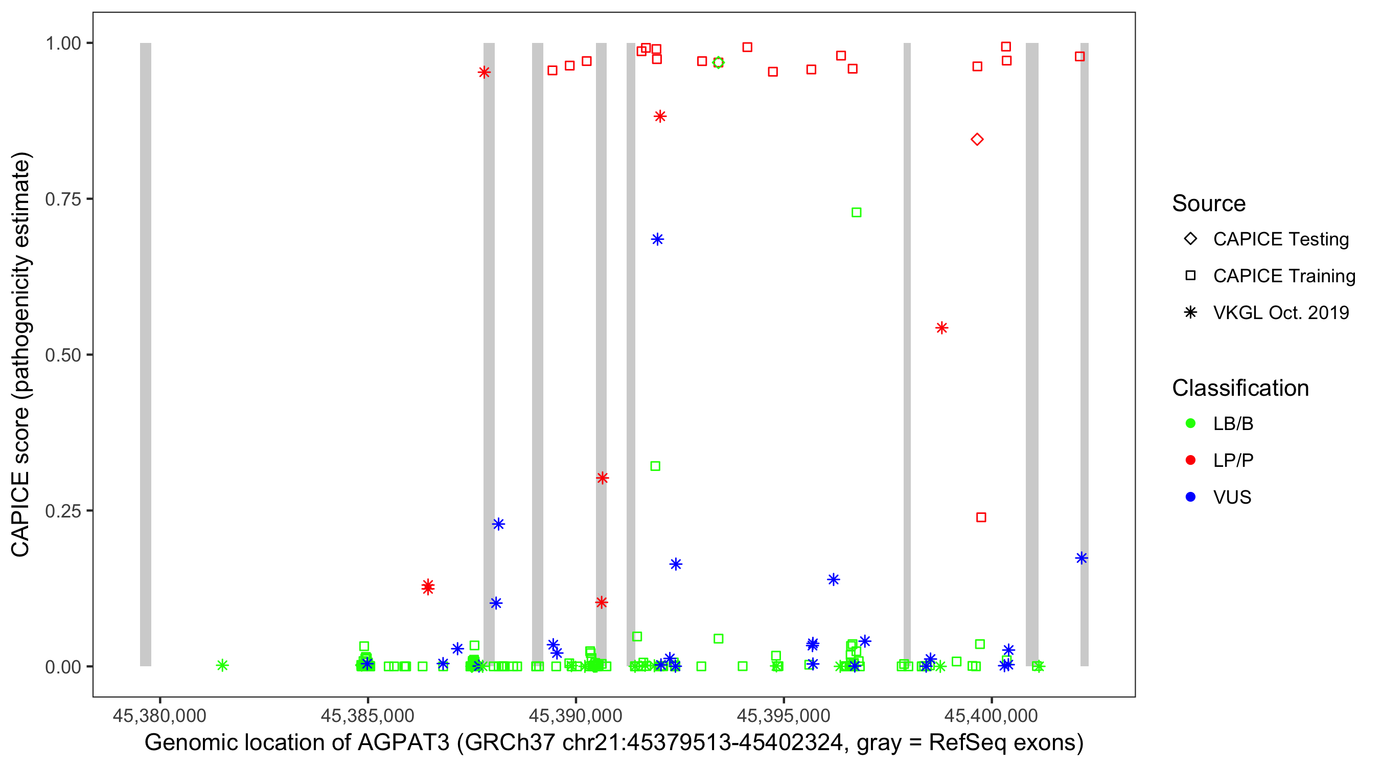 Shown are CAPICE train/test variants plus VKGL Oct 2019.