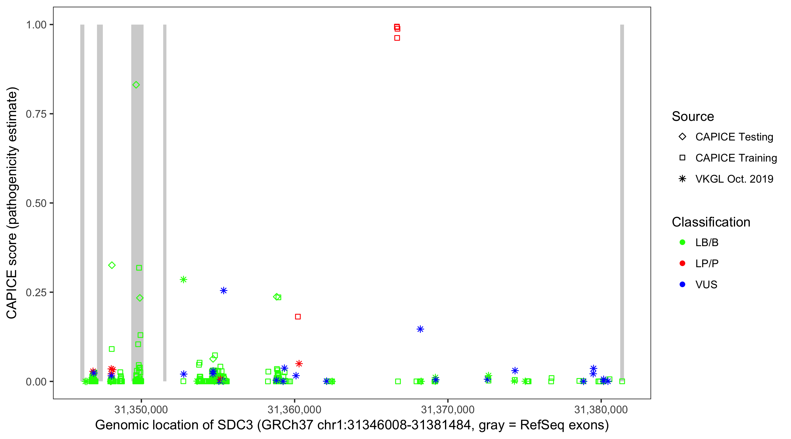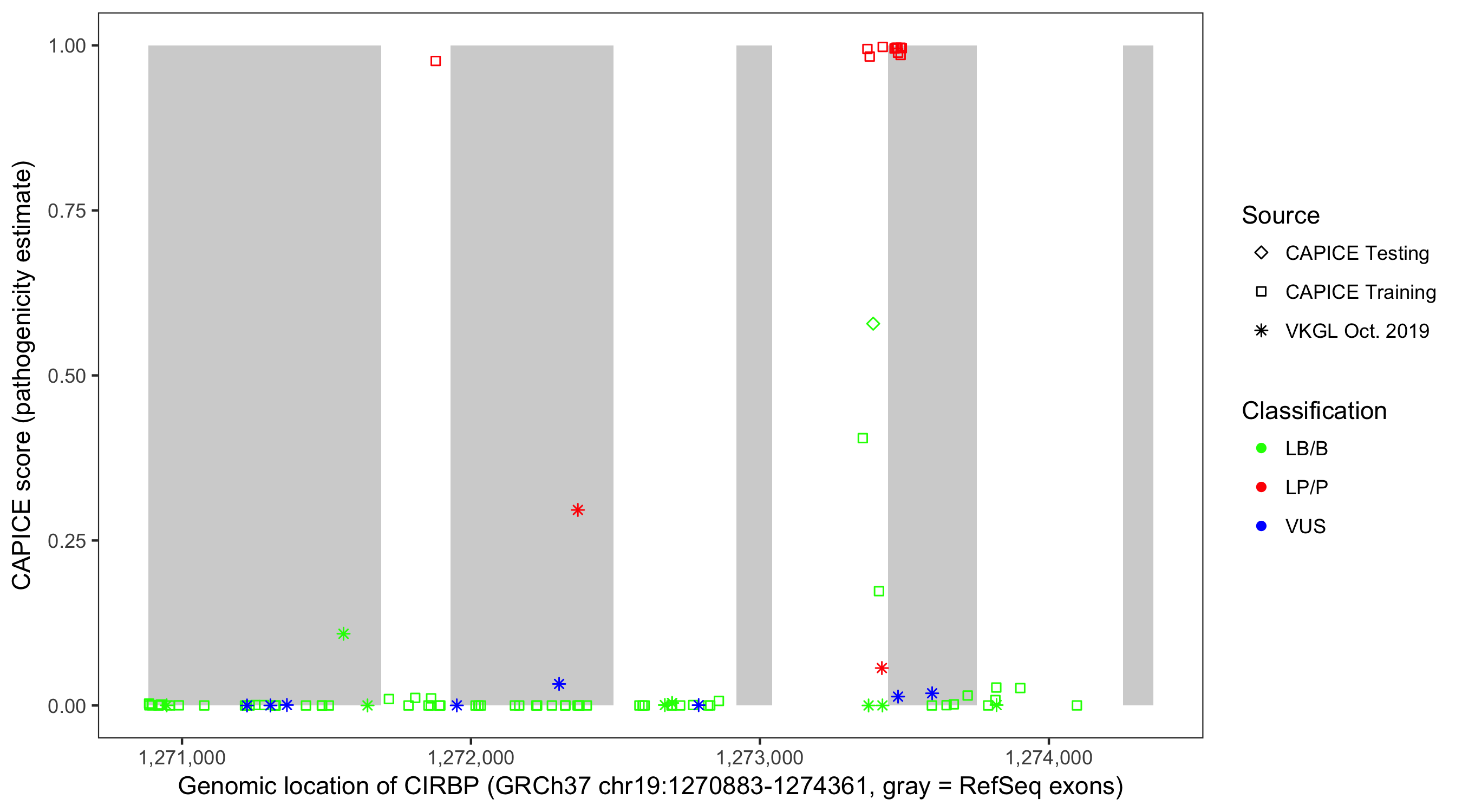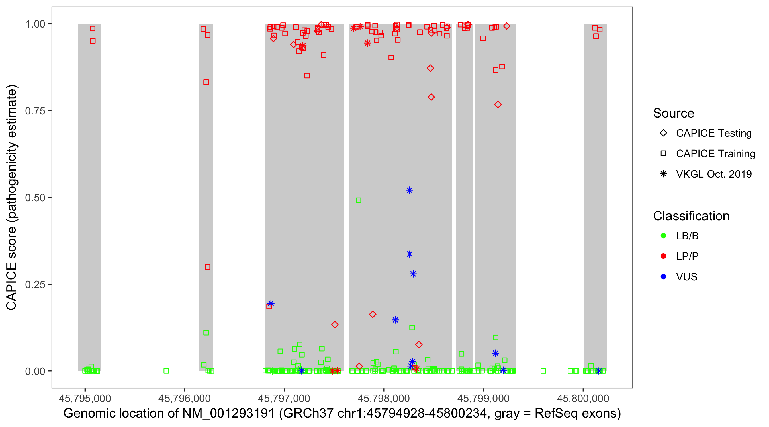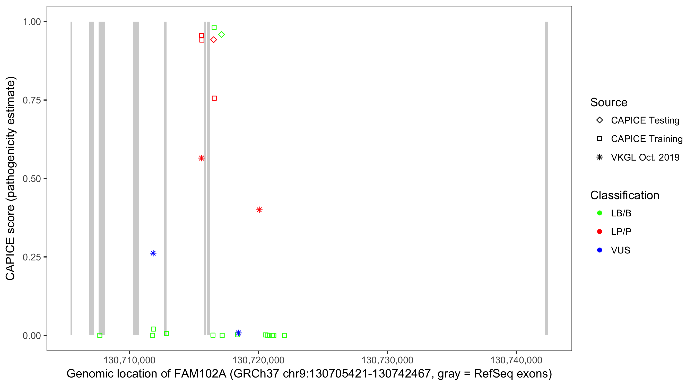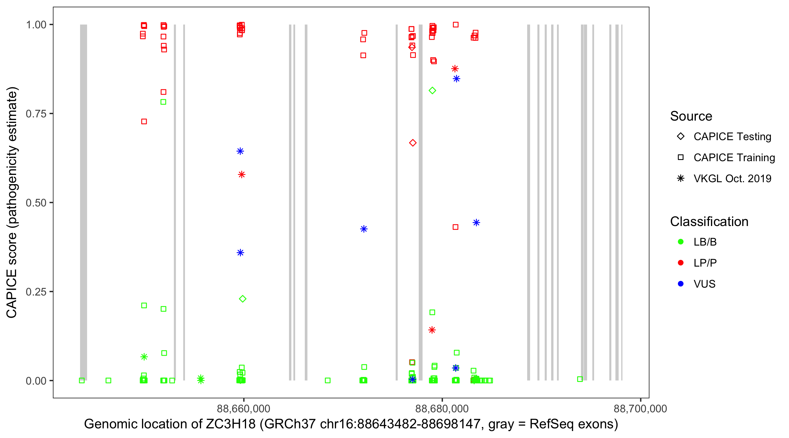 Shown are CAPICE train/test variants plus VKGL Oct 2019.