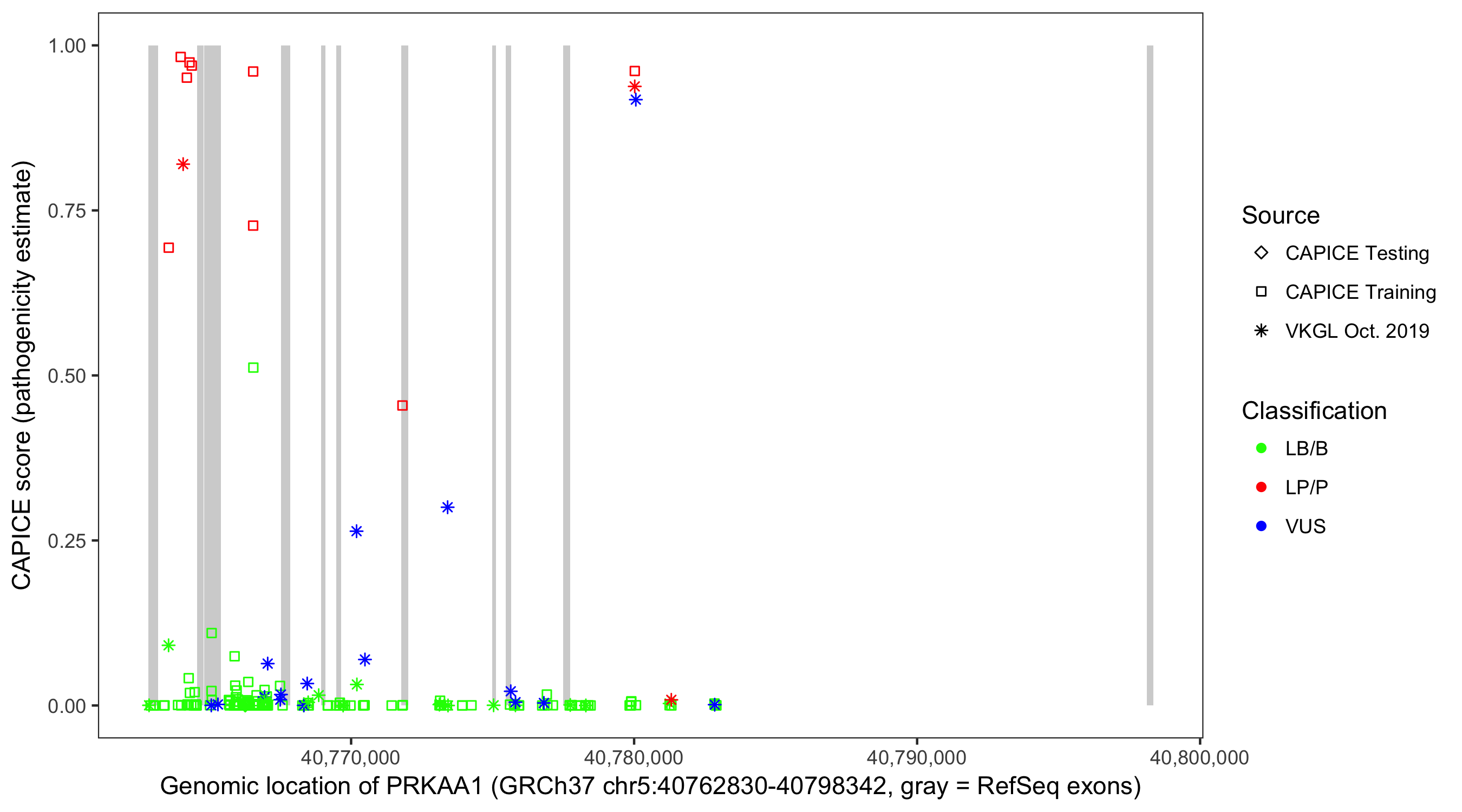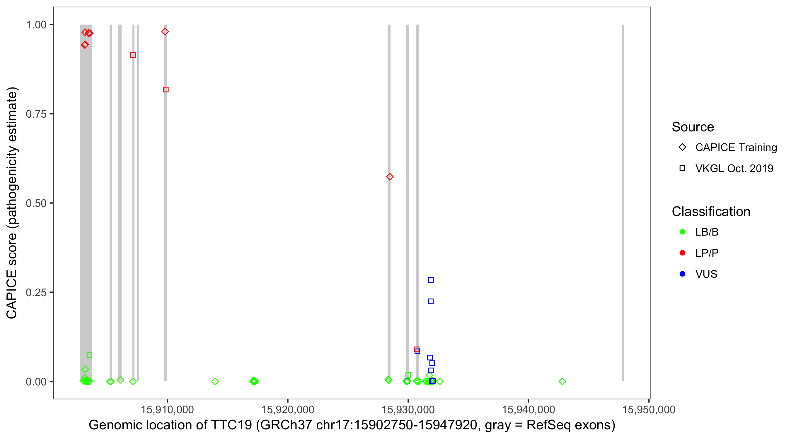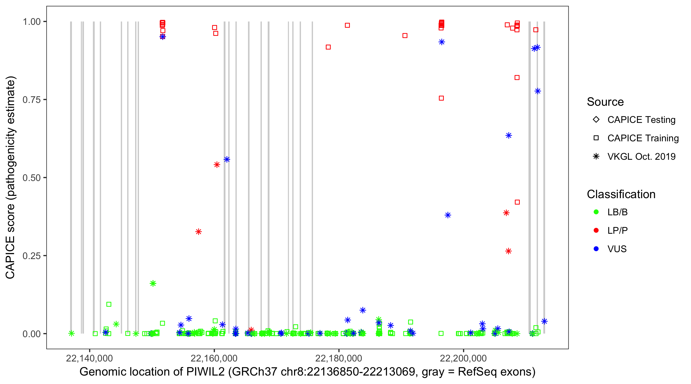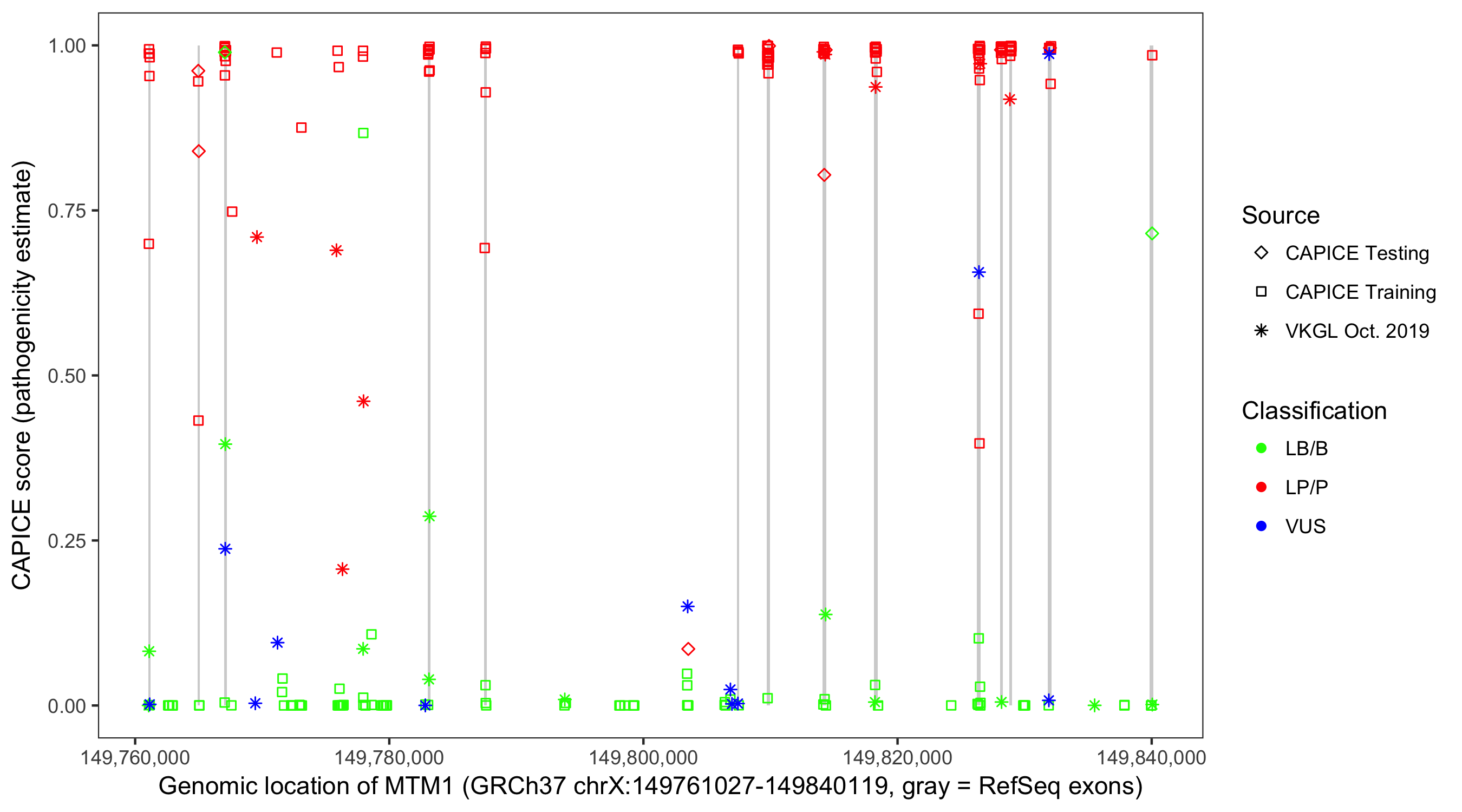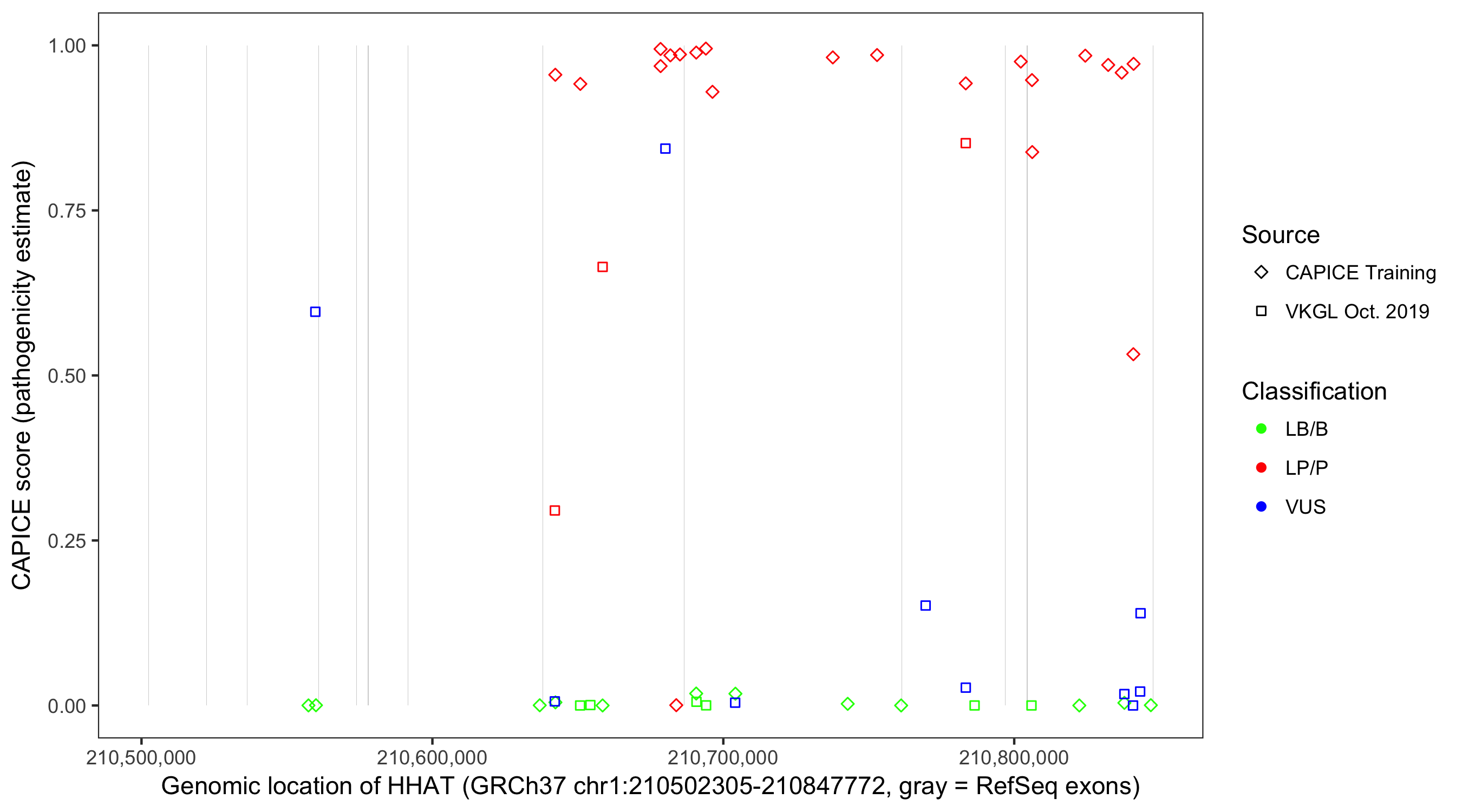 Shown are CAPICE train/test variants plus VKGL Oct 2019.