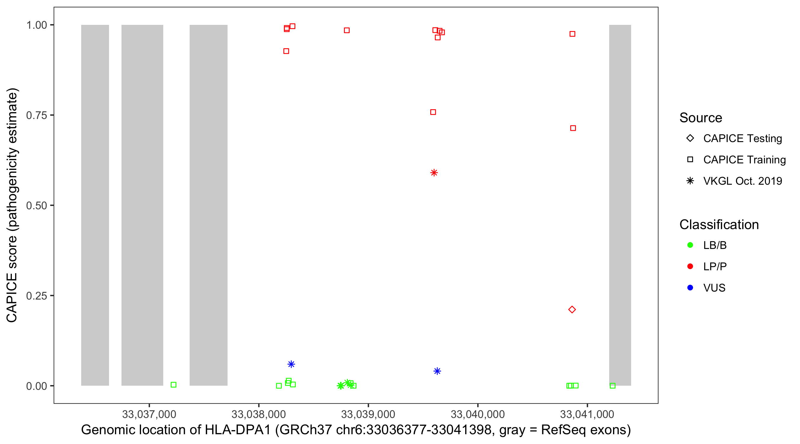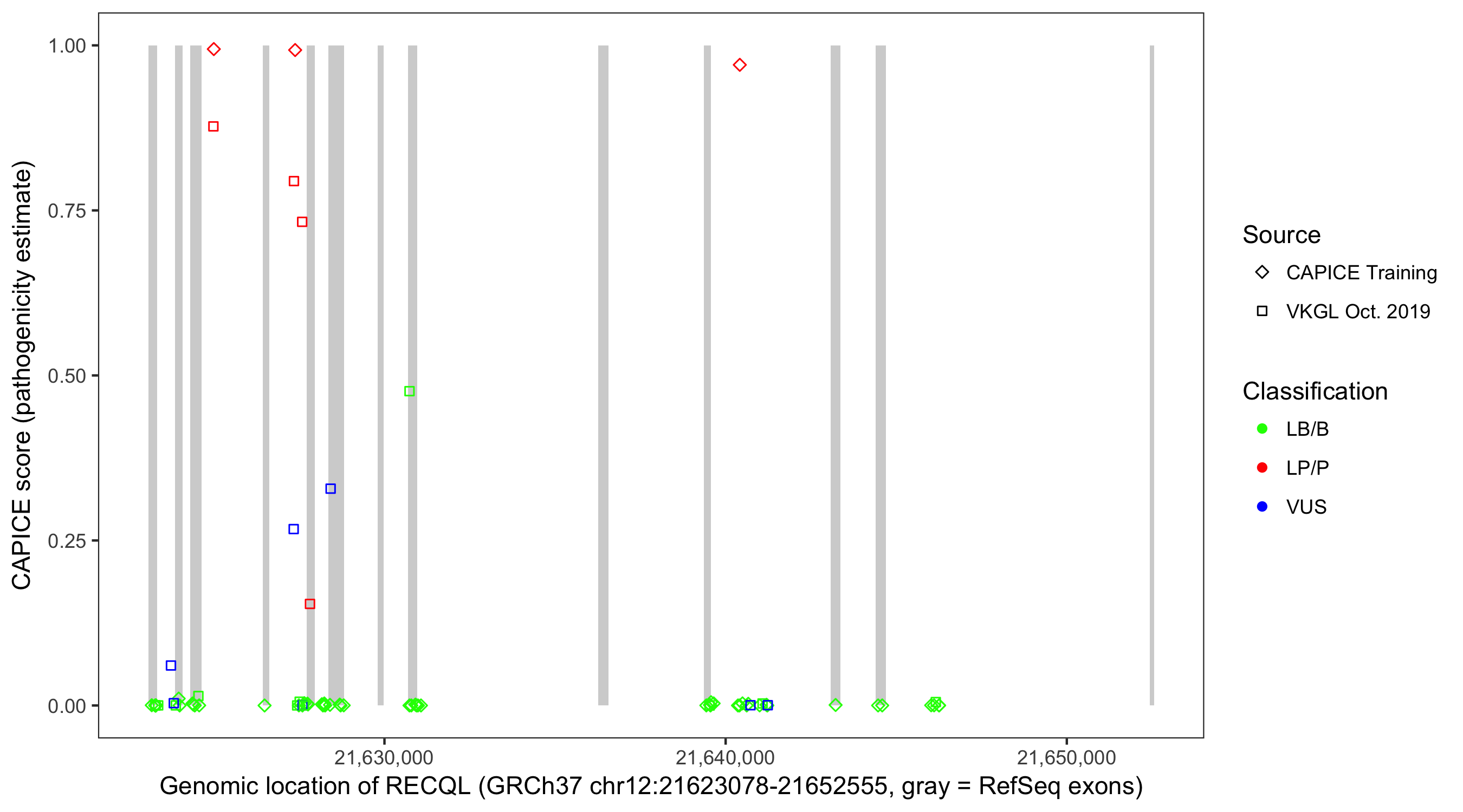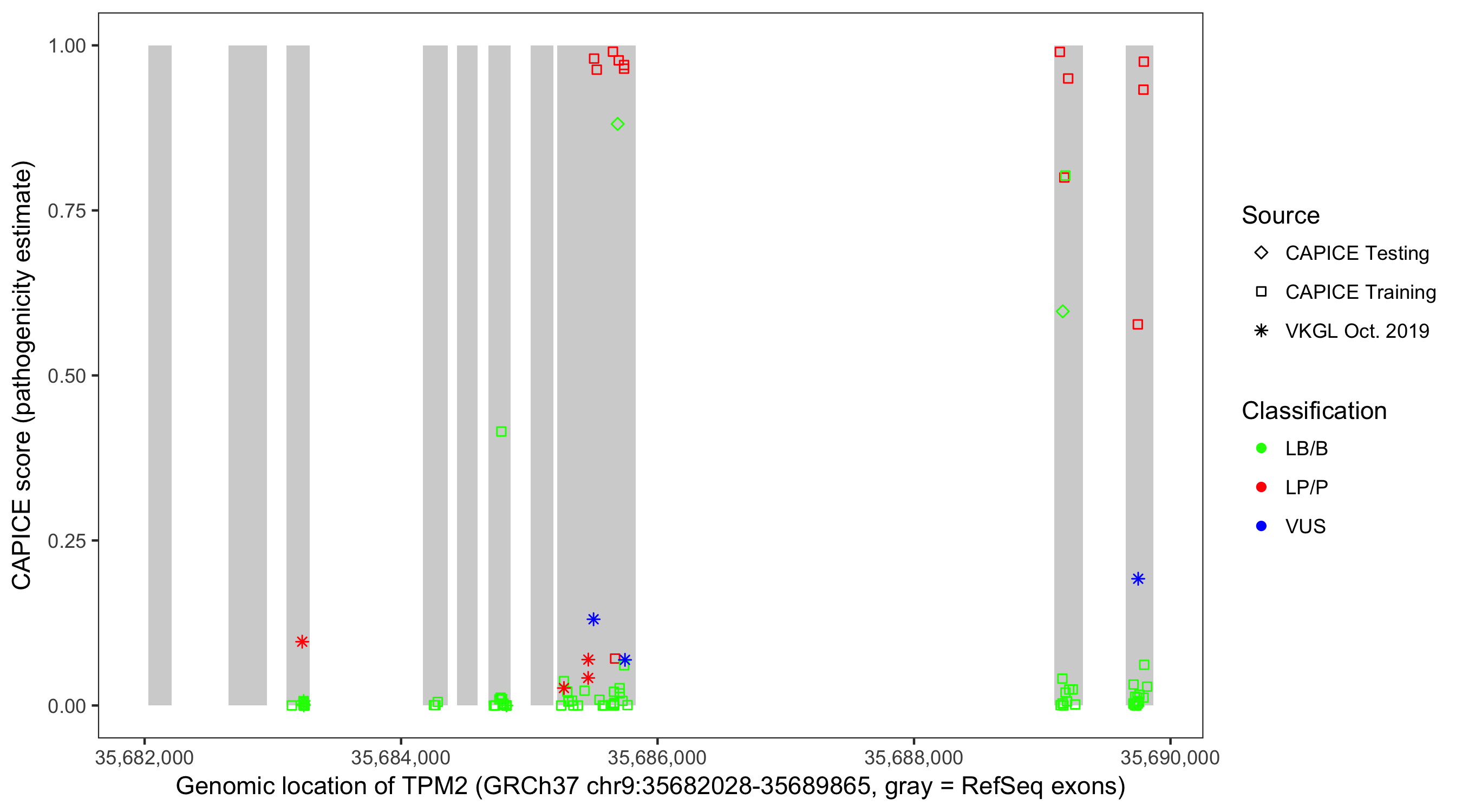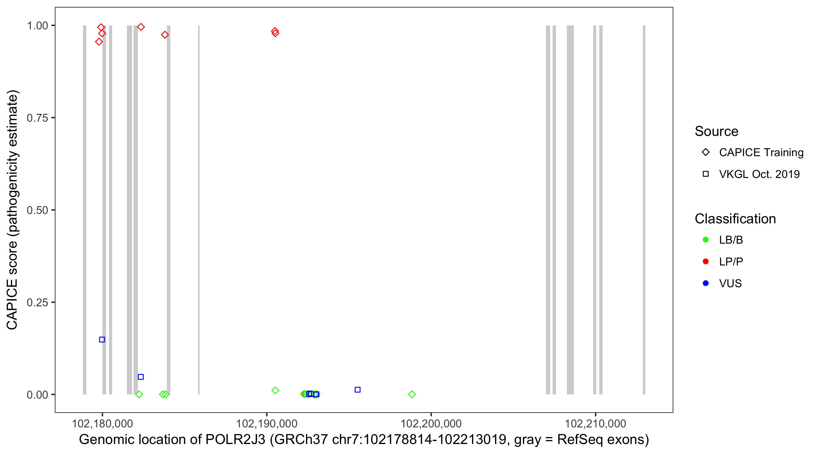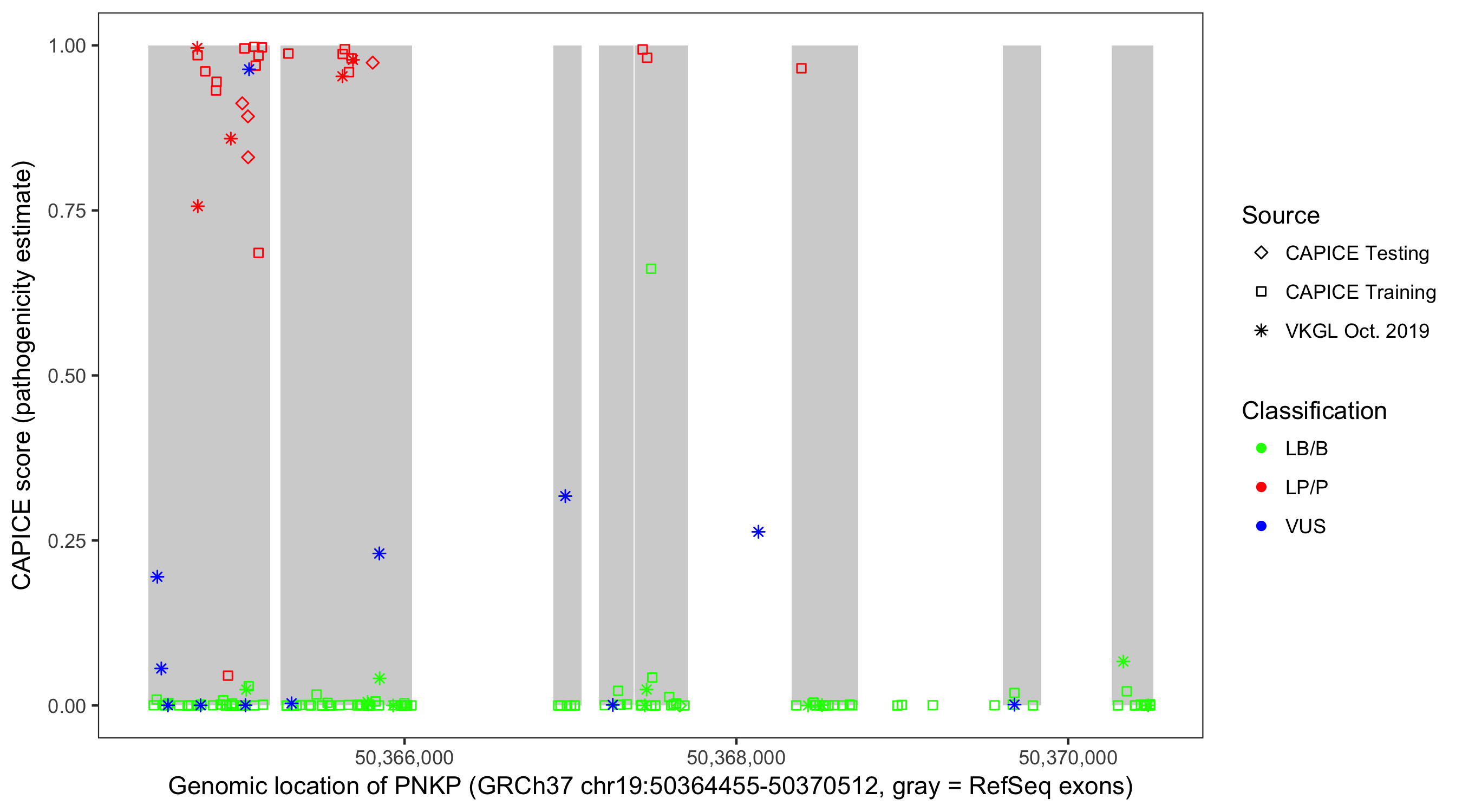Shown are CAPICE train/test variants plus VKGL Oct 2019.