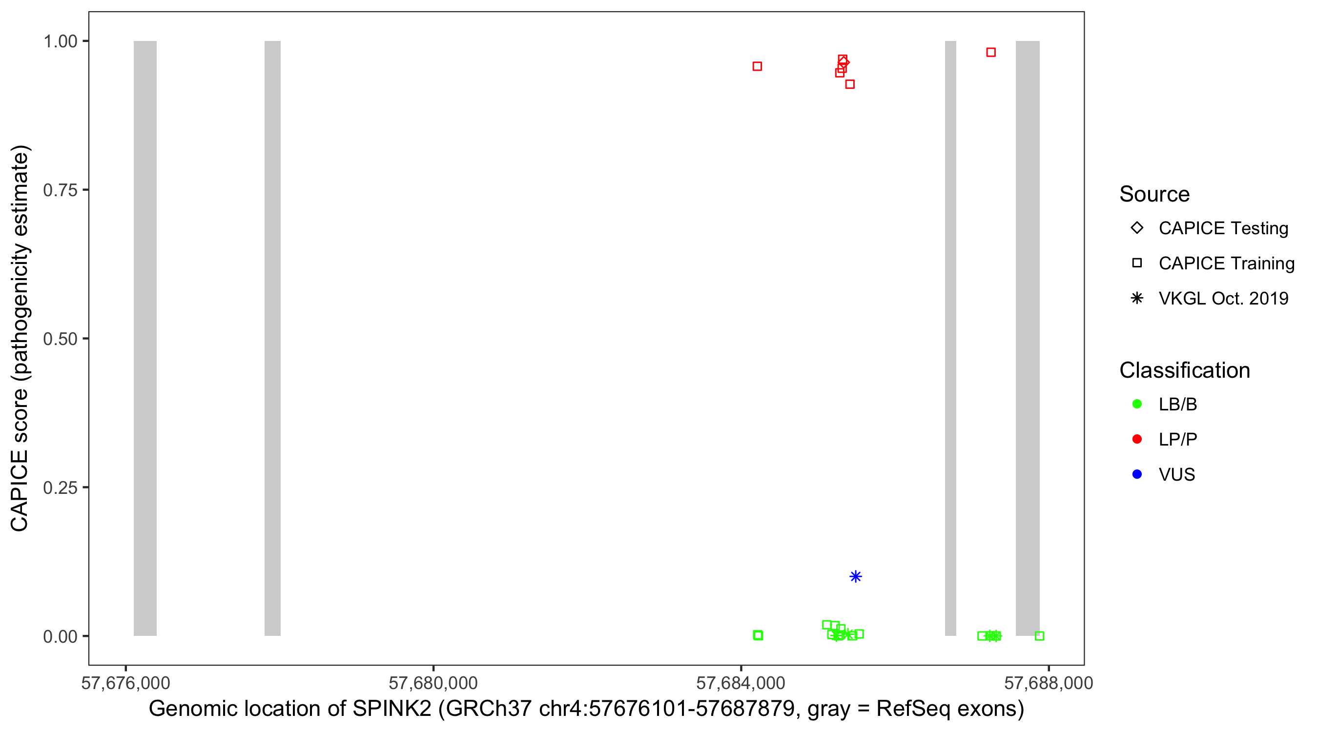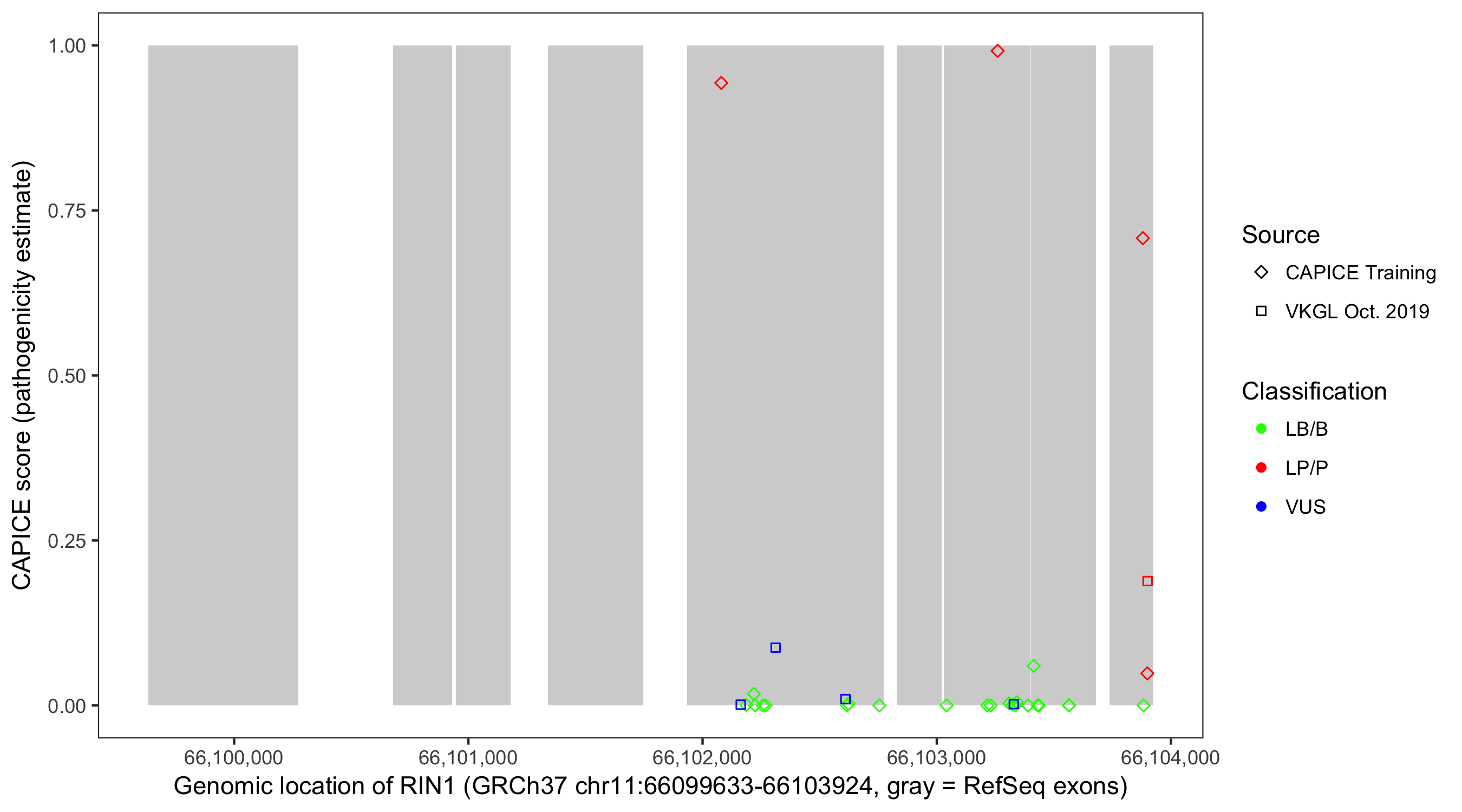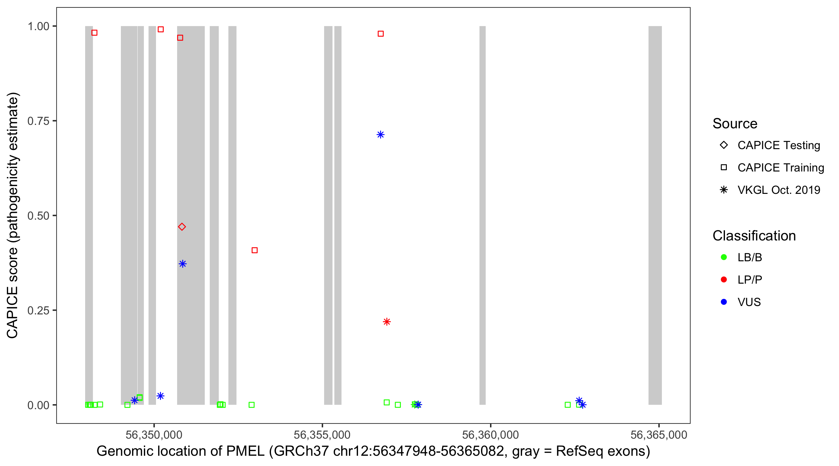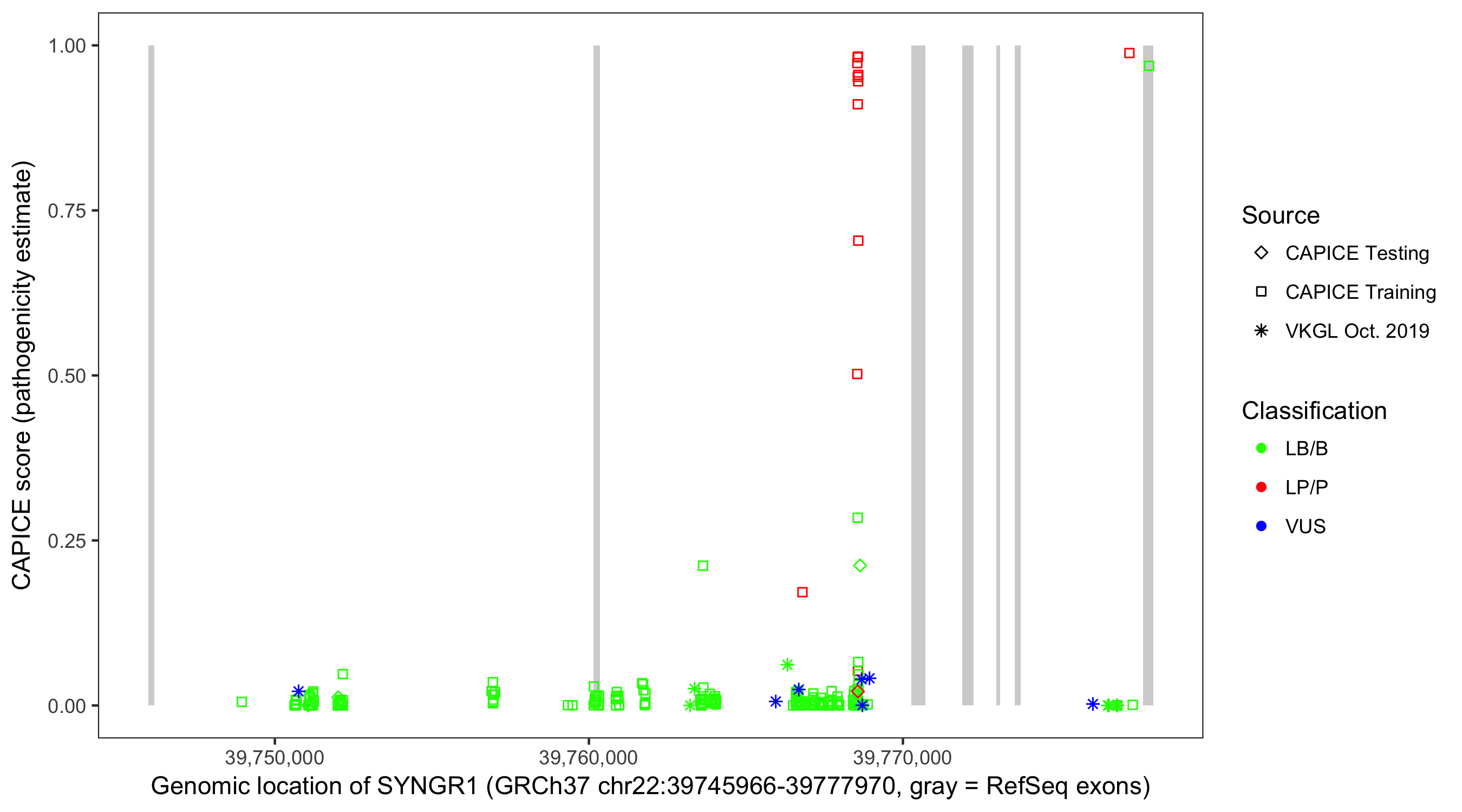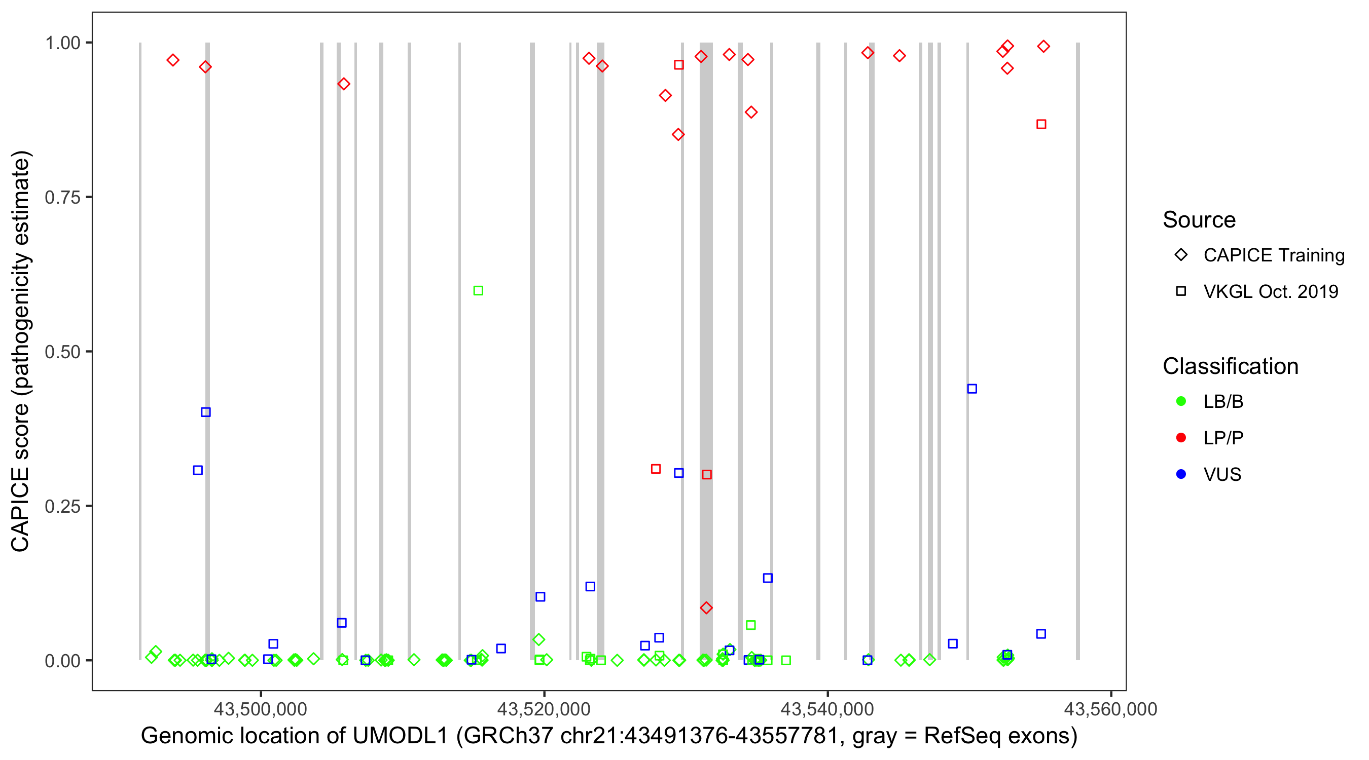 Shown are CAPICE train/test variants plus VKGL Oct 2019.