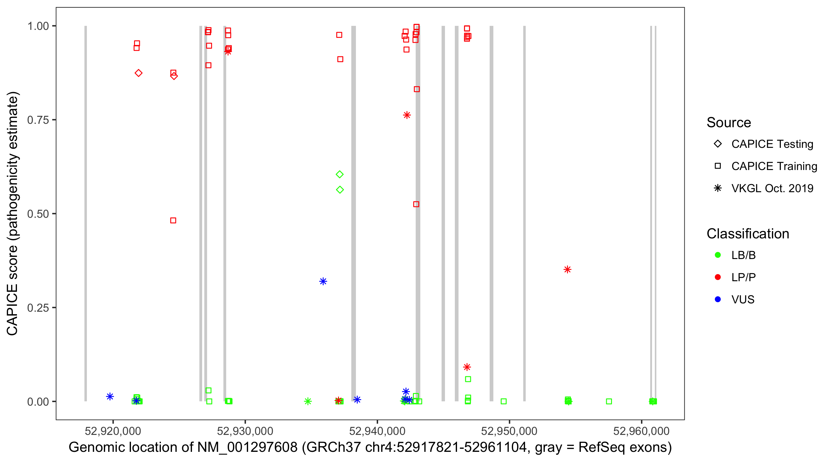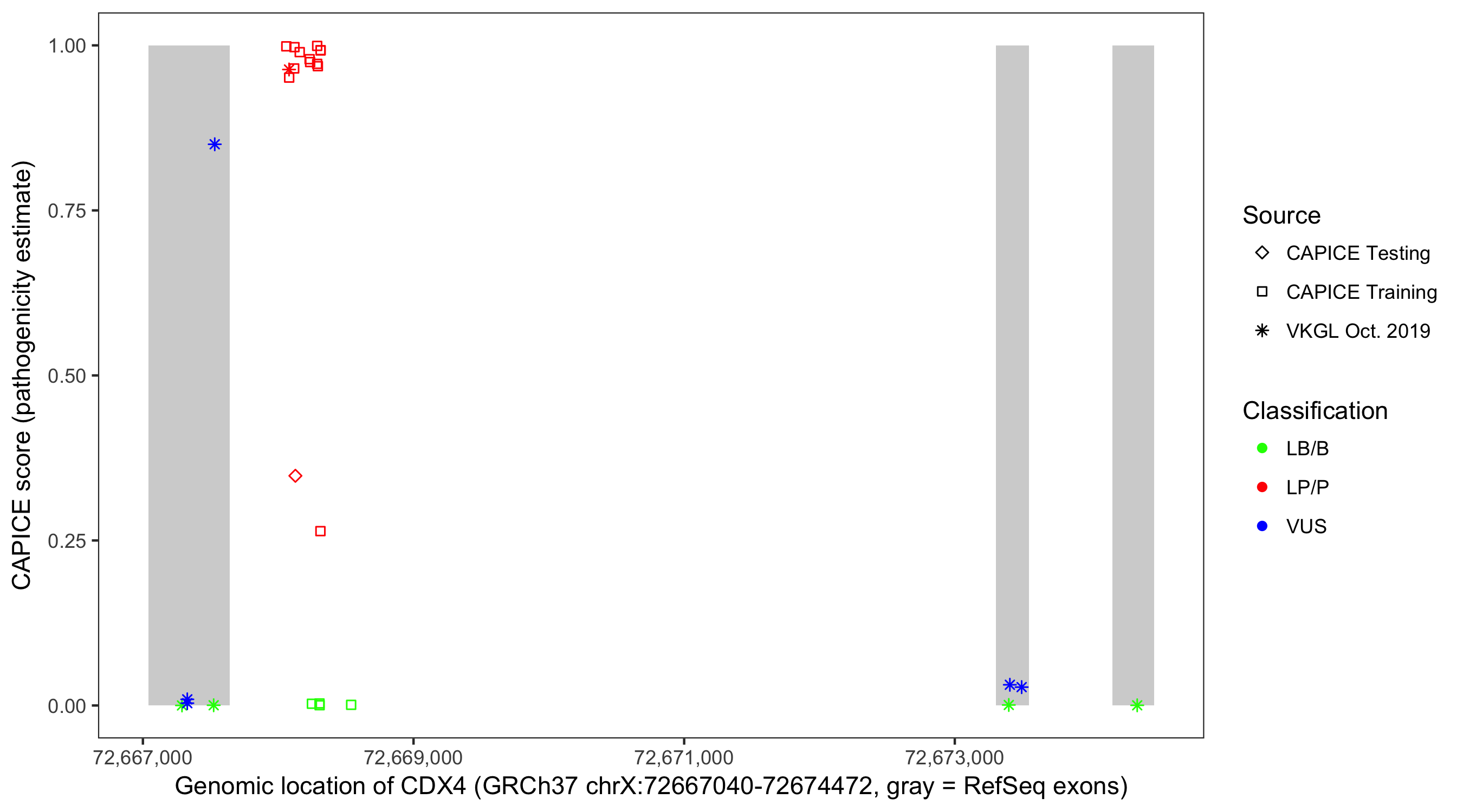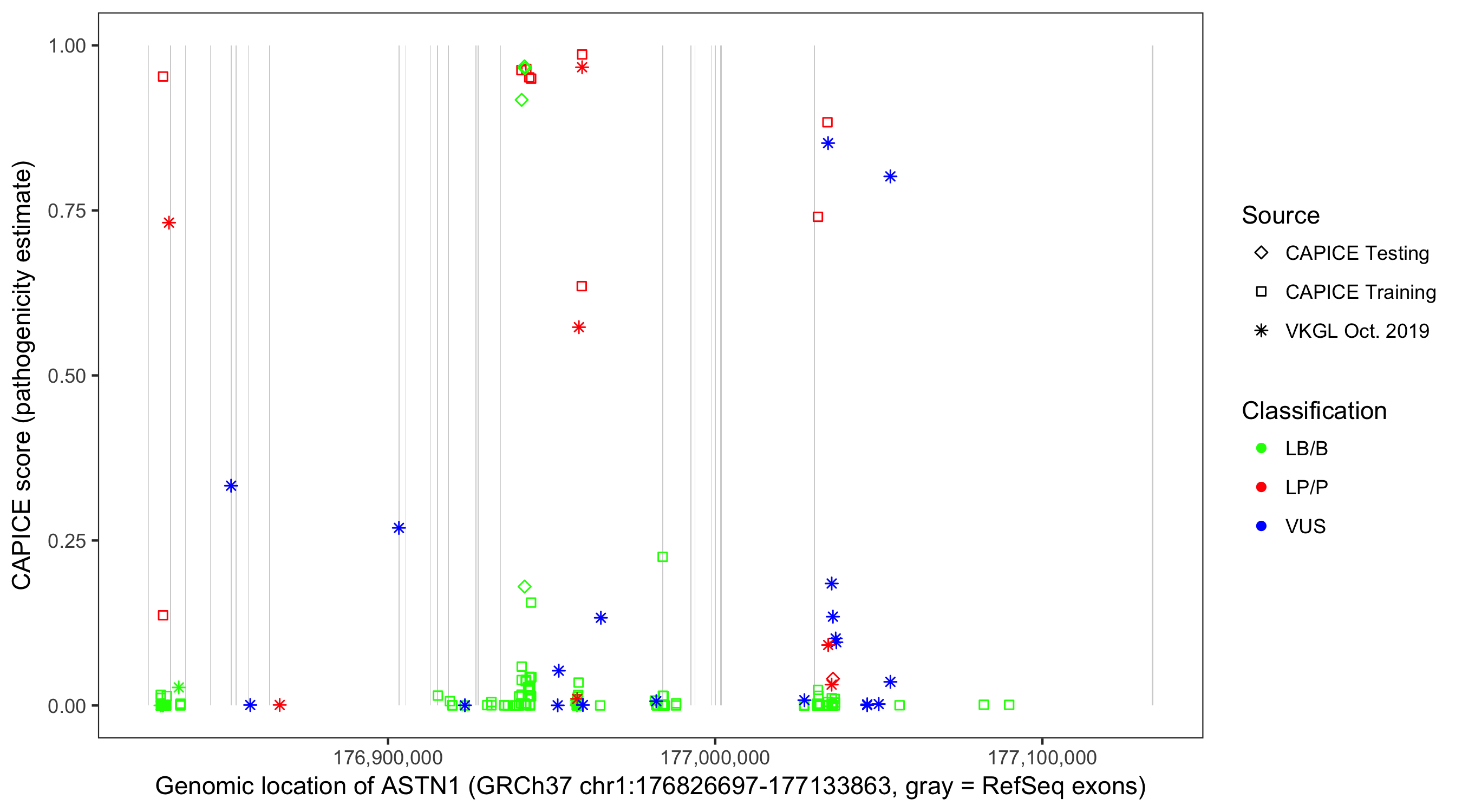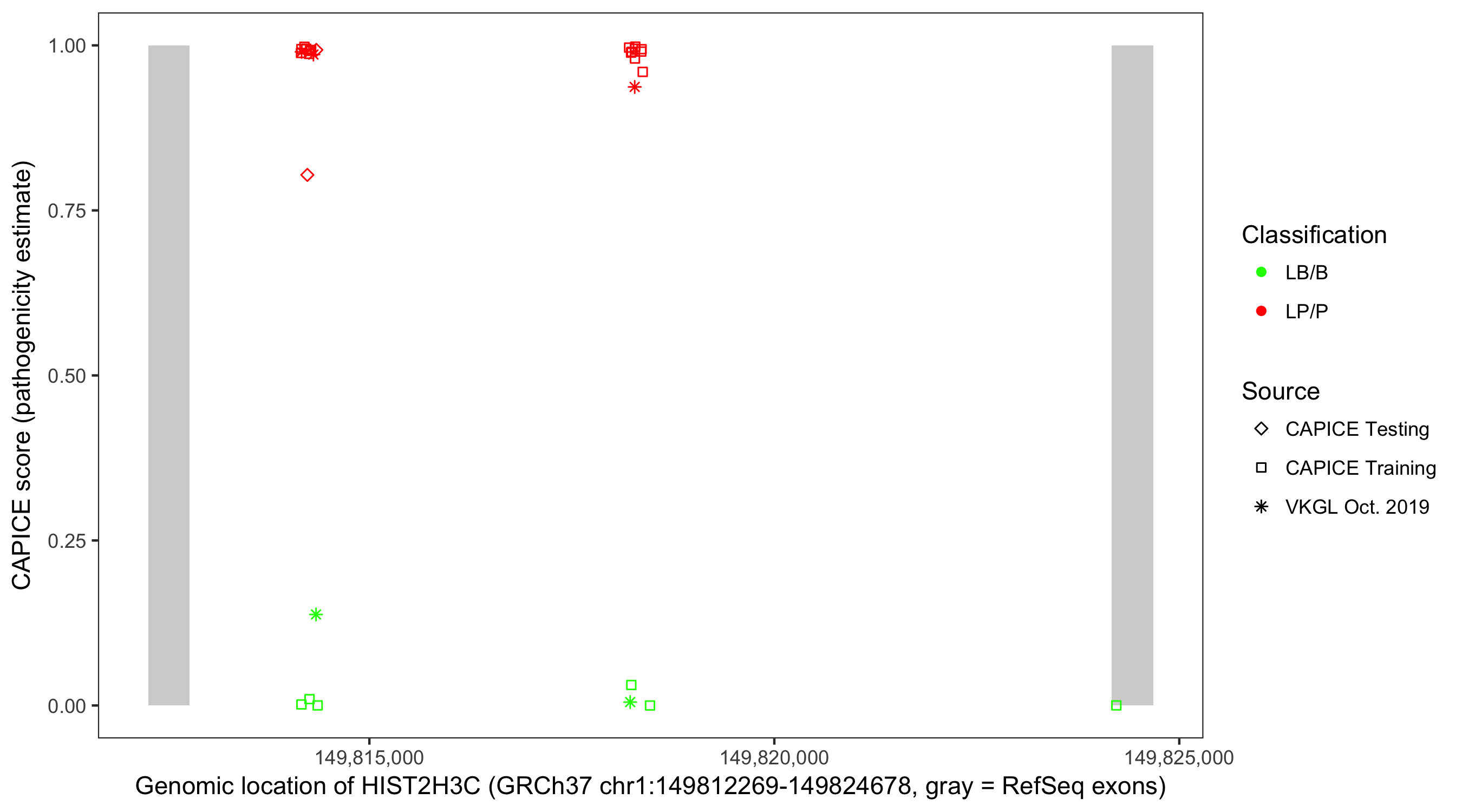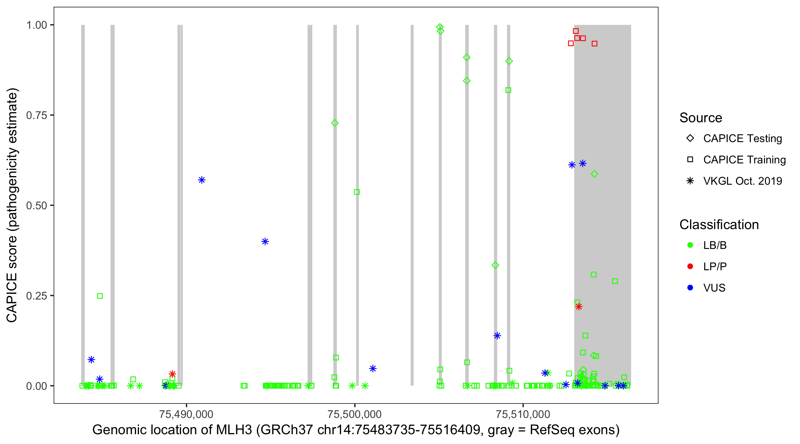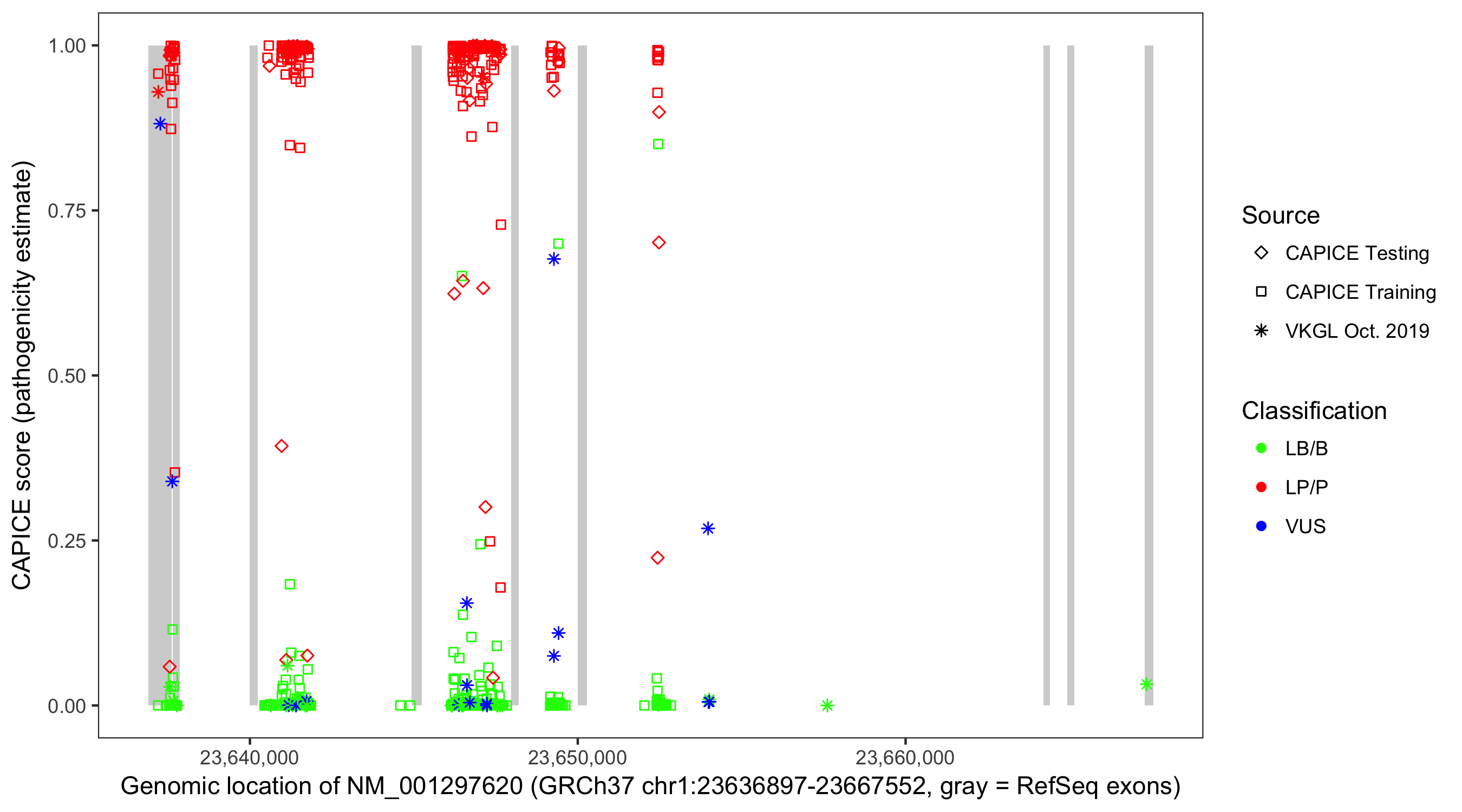Shown are CAPICE train/test variants plus VKGL Oct 2019.