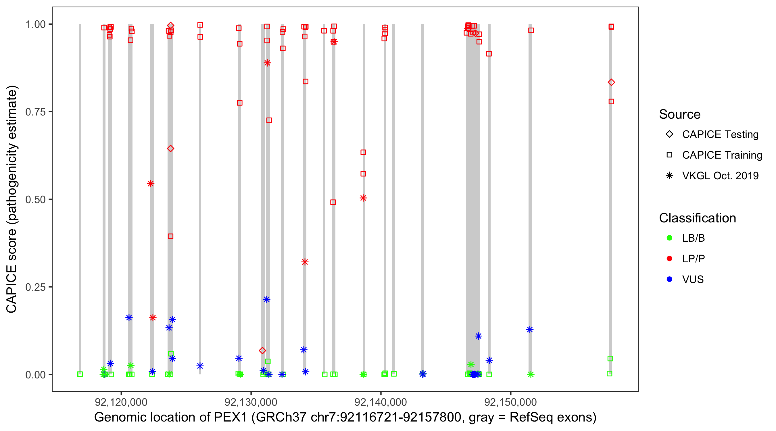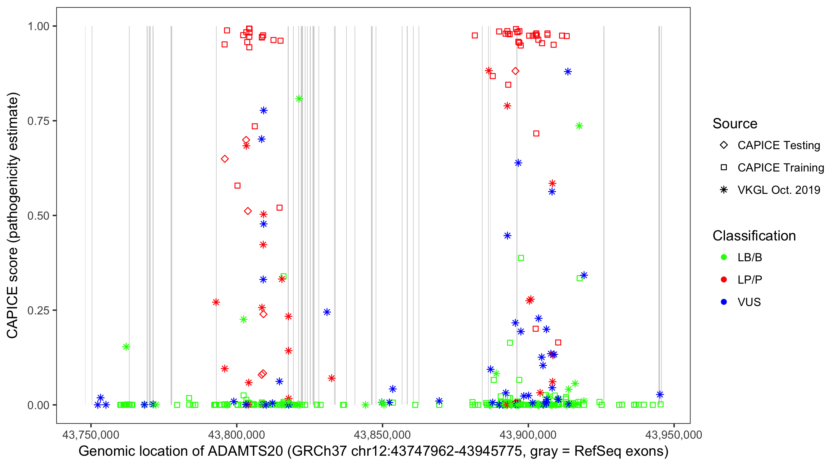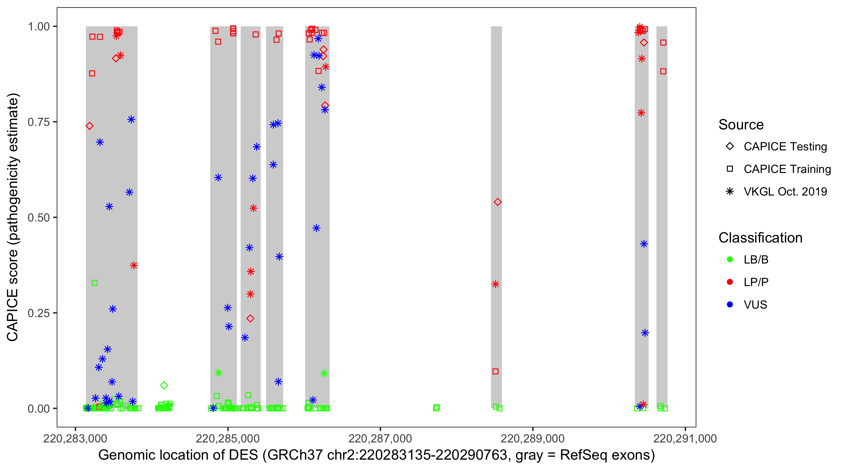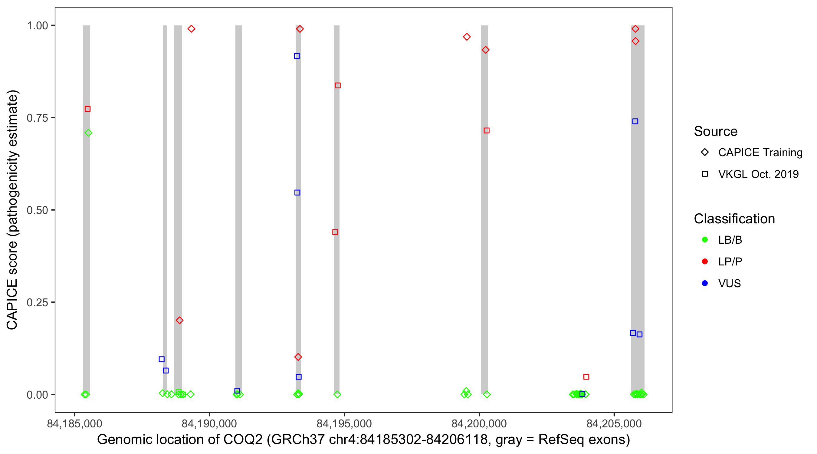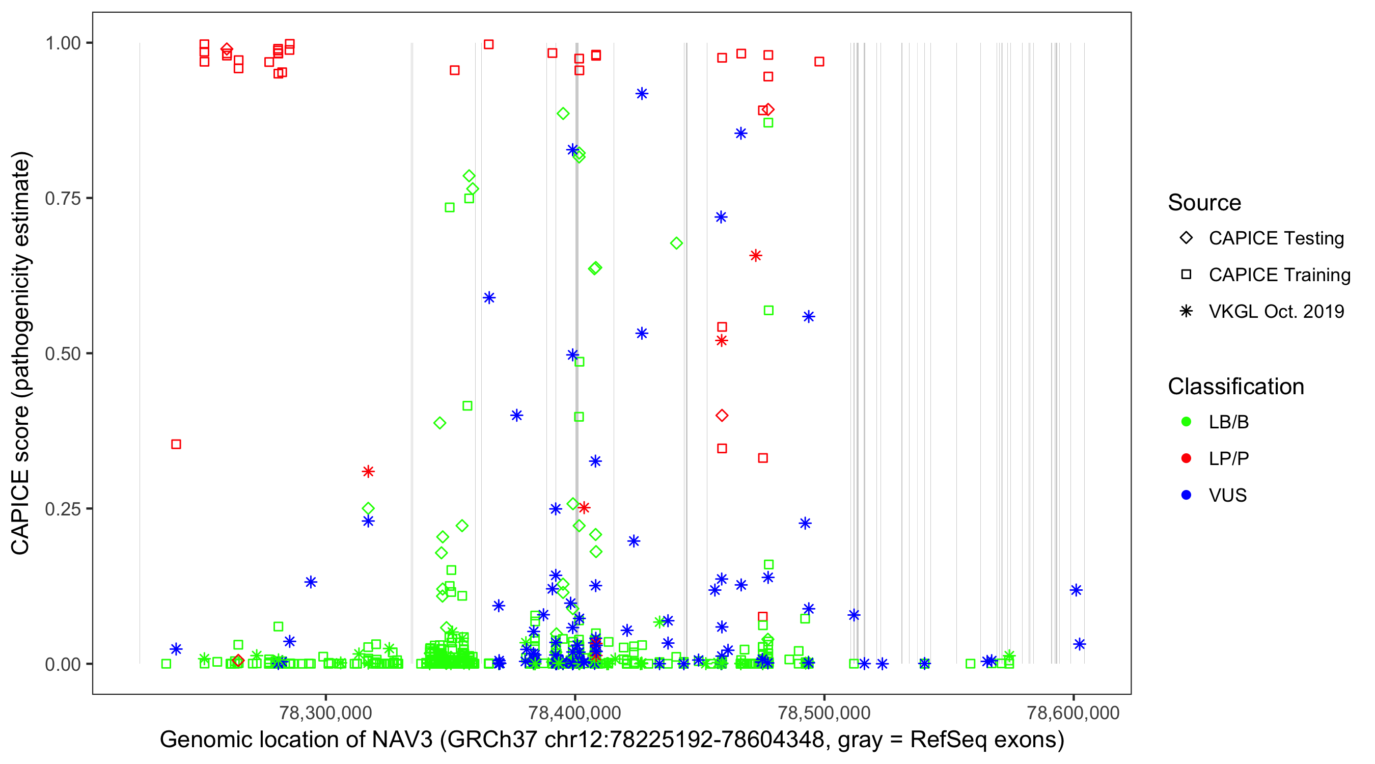 Shown are CAPICE train/test variants plus VKGL Oct 2019.