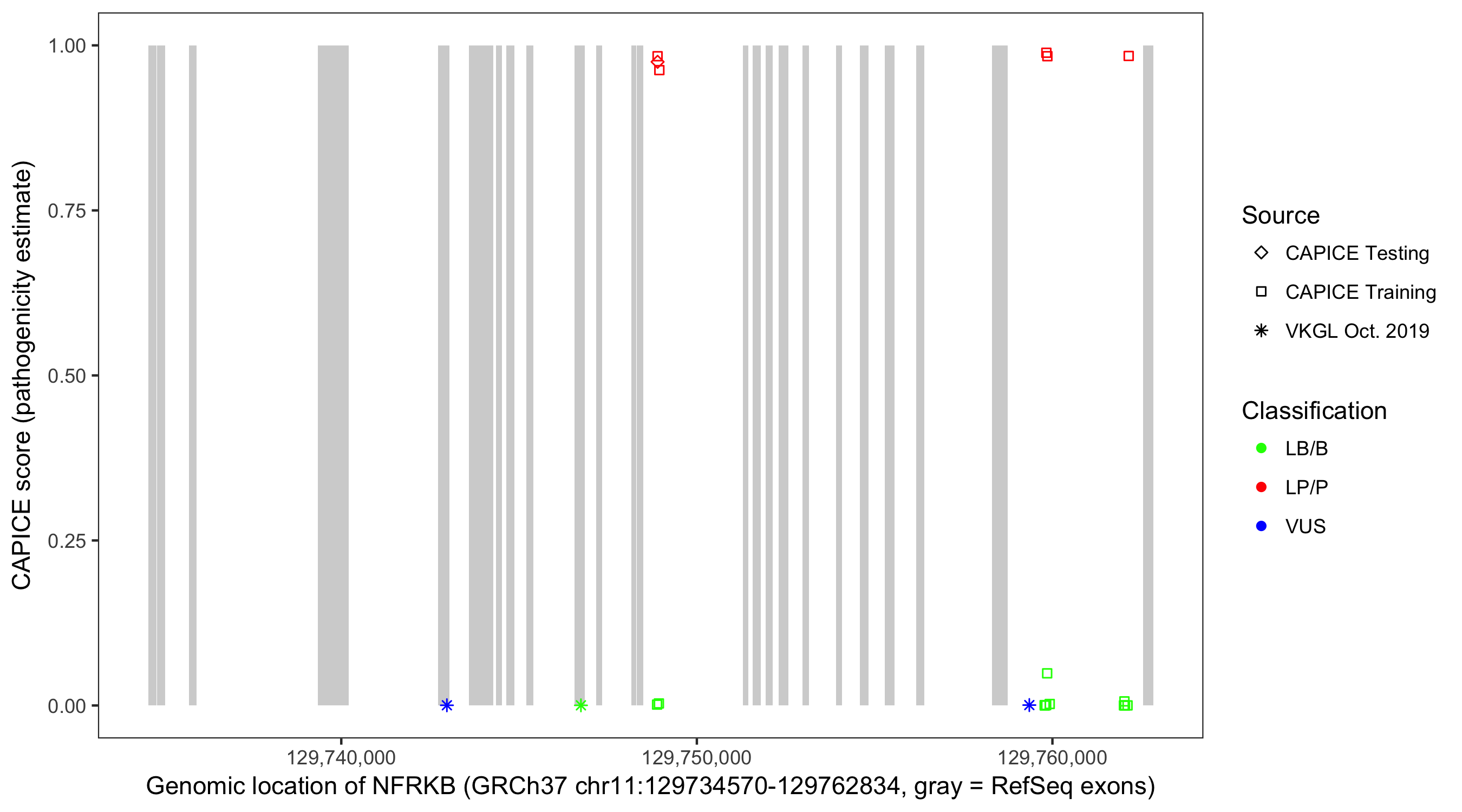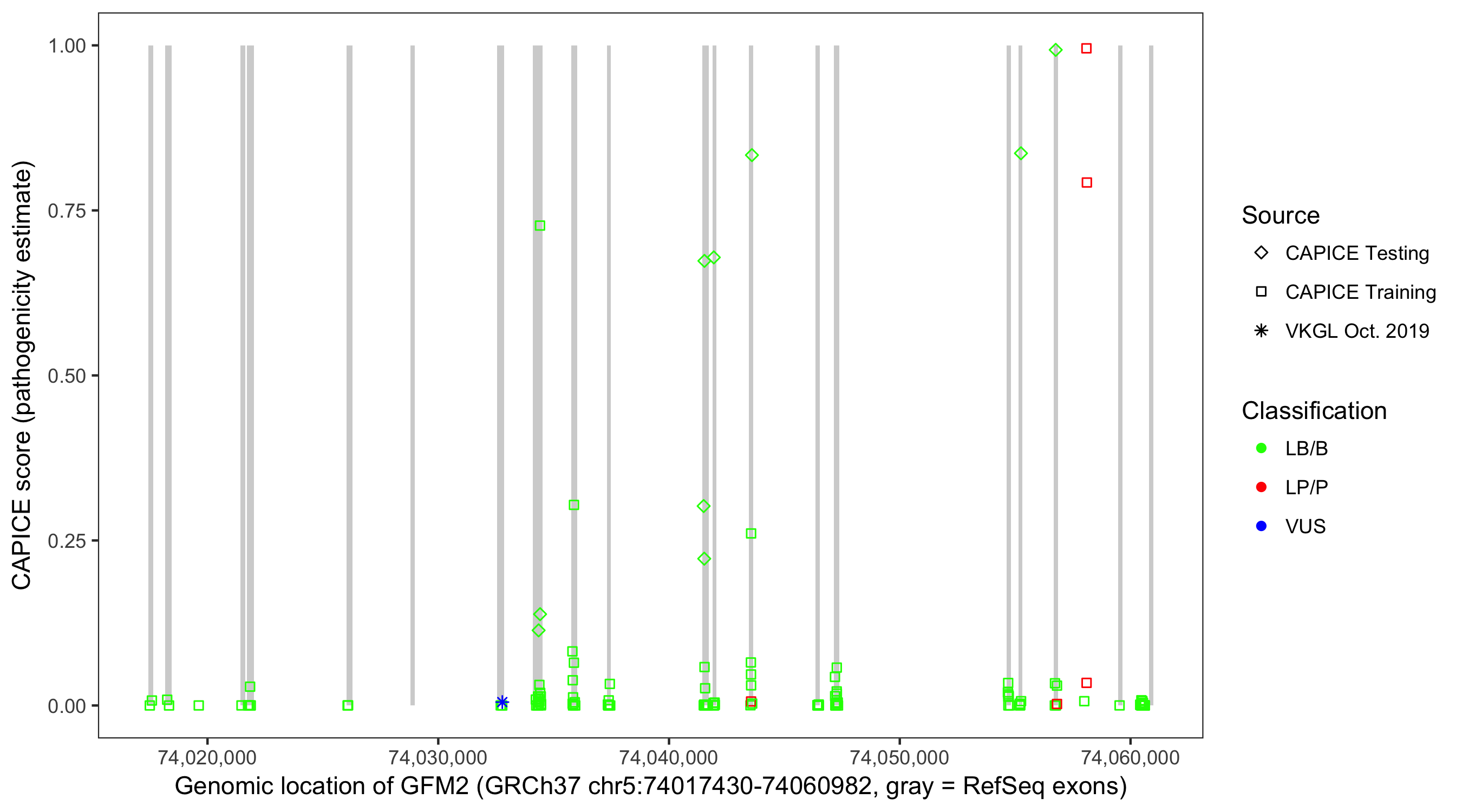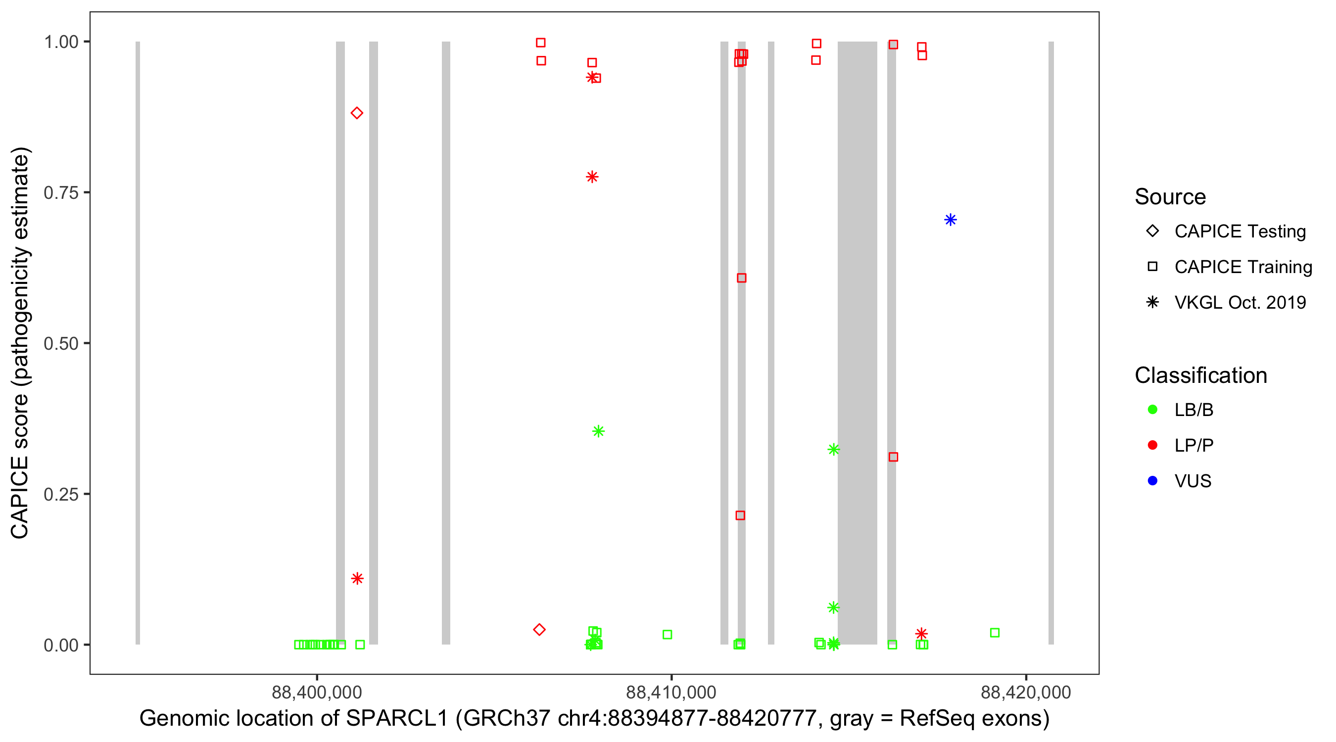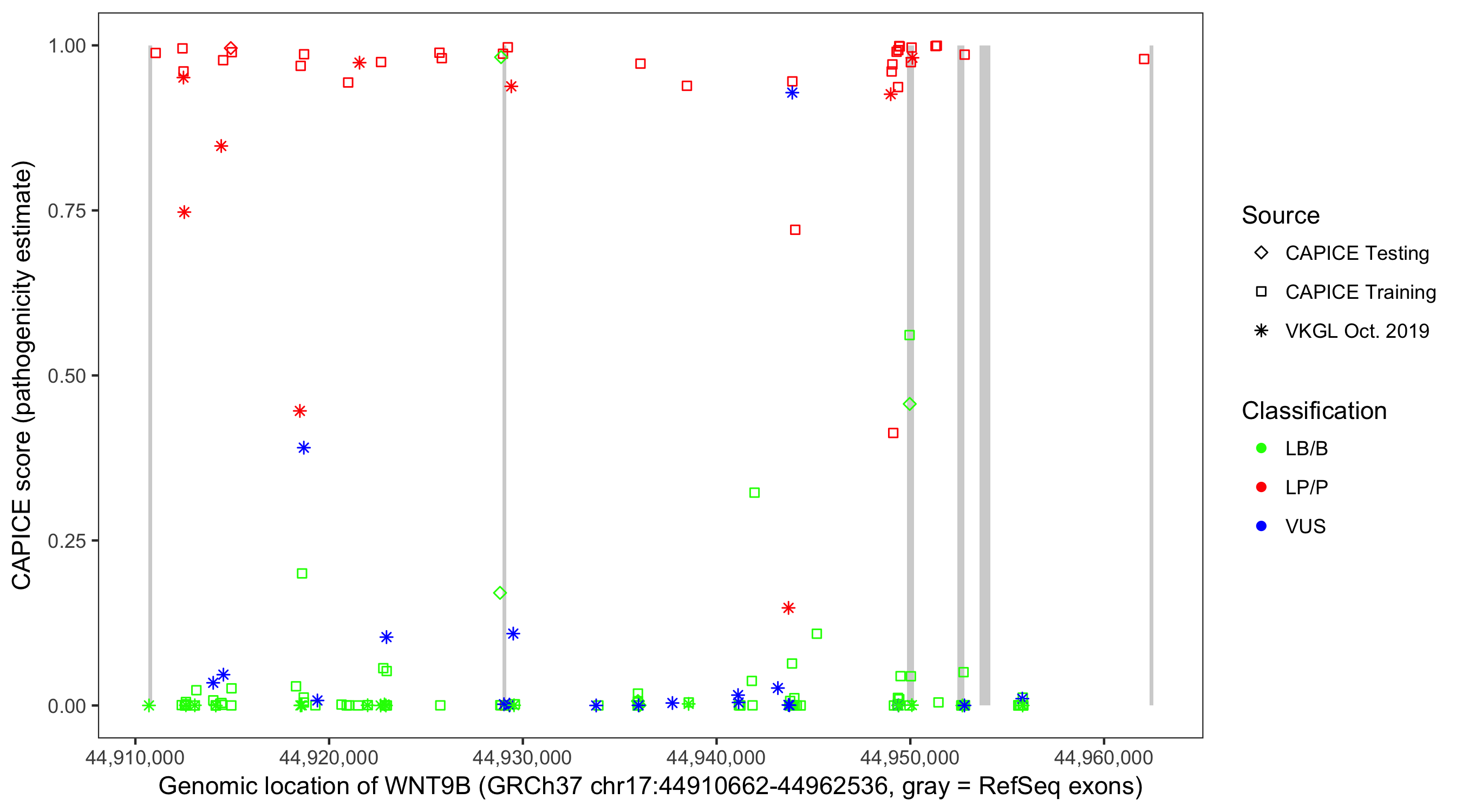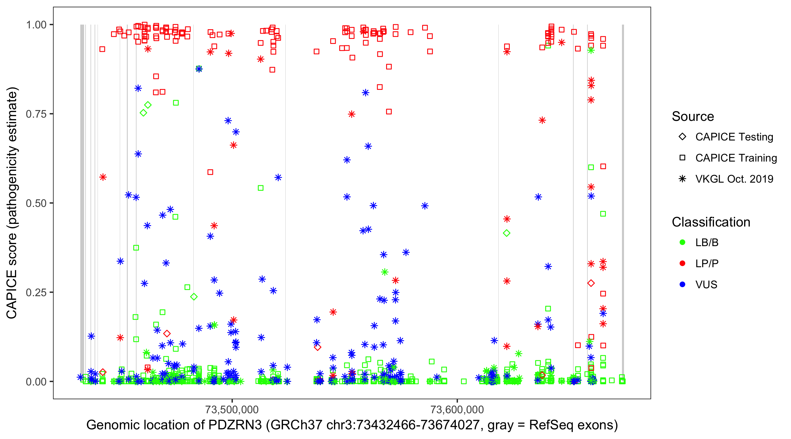 Shown are CAPICE train/test variants plus VKGL Oct 2019.