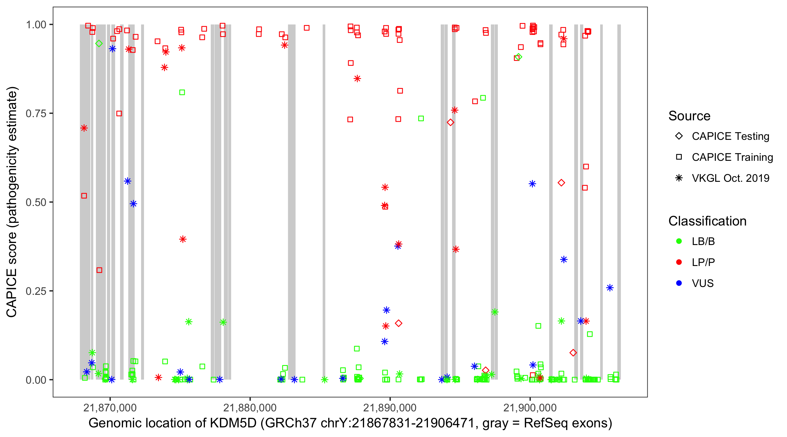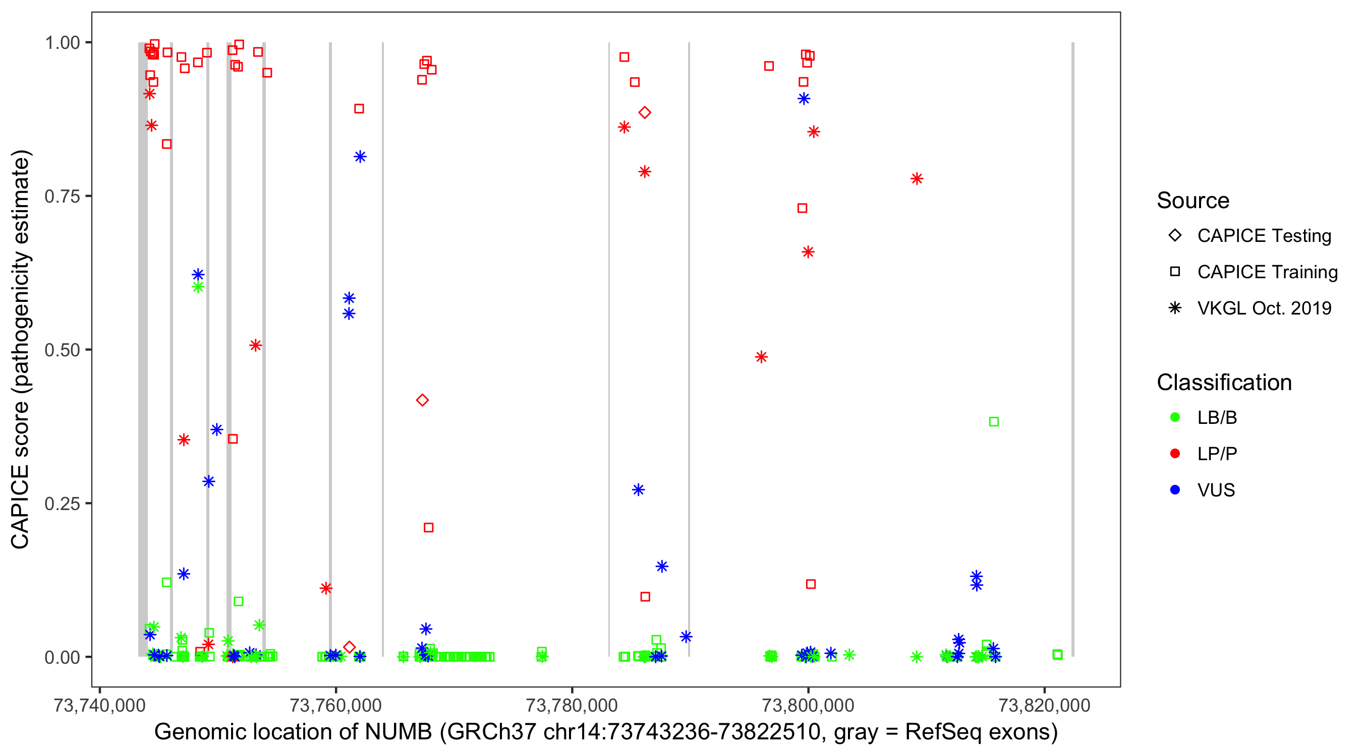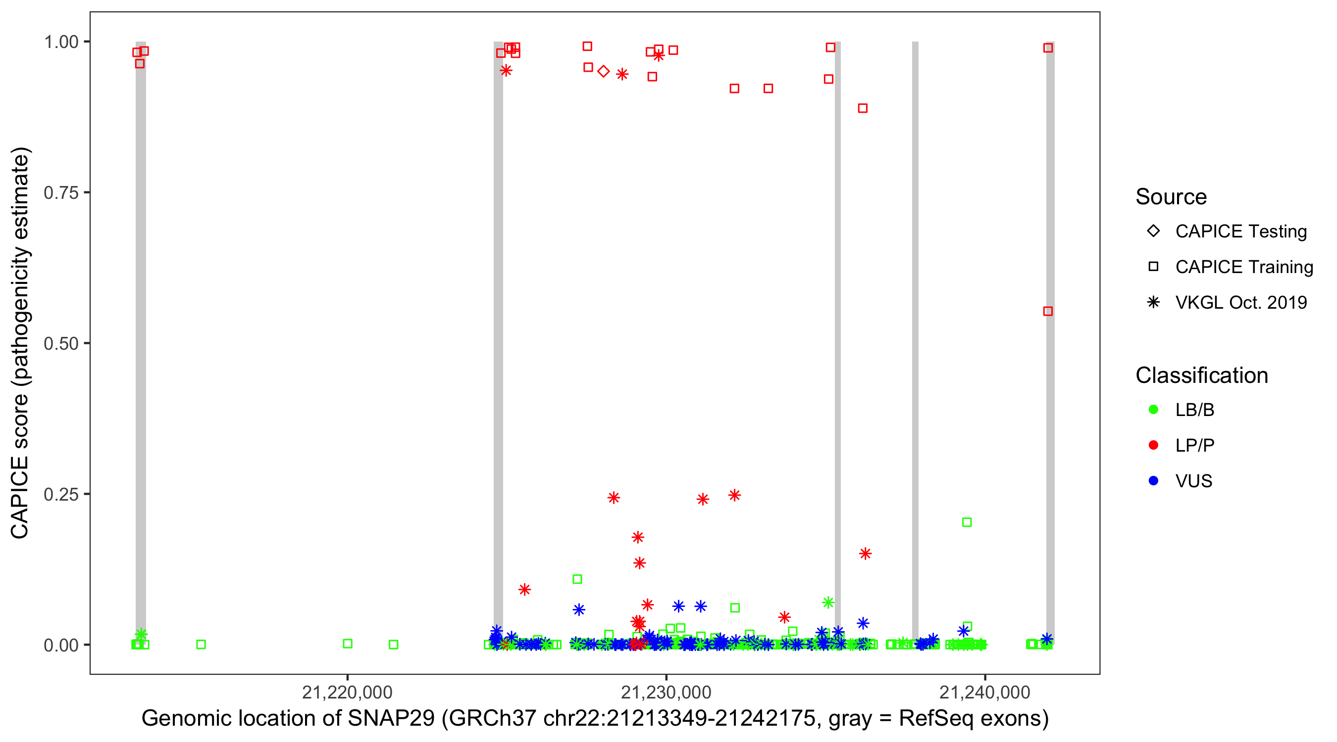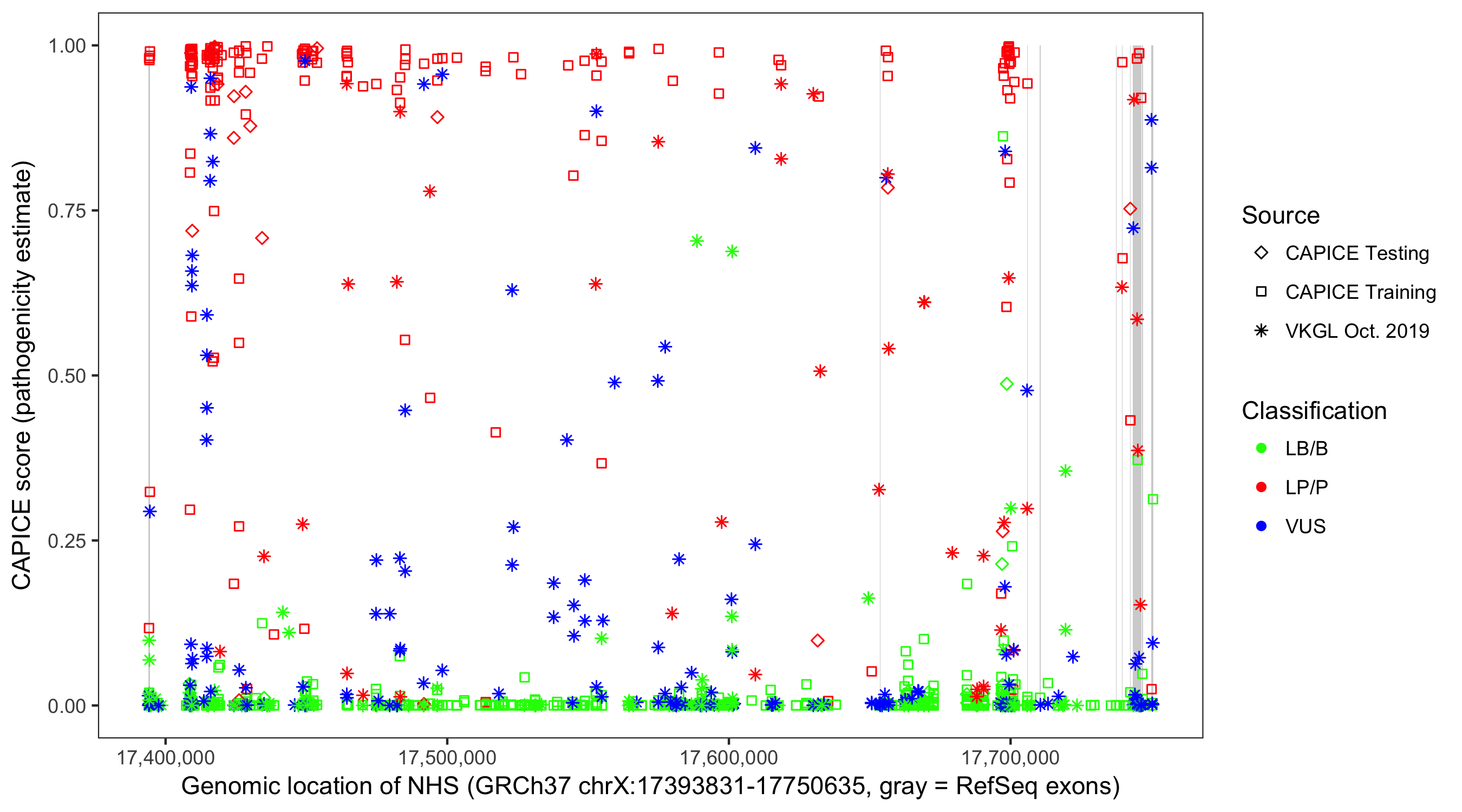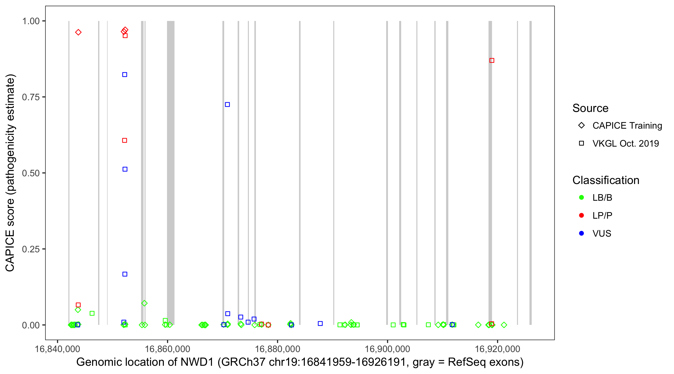 Shown are CAPICE train/test variants plus VKGL Oct 2019.