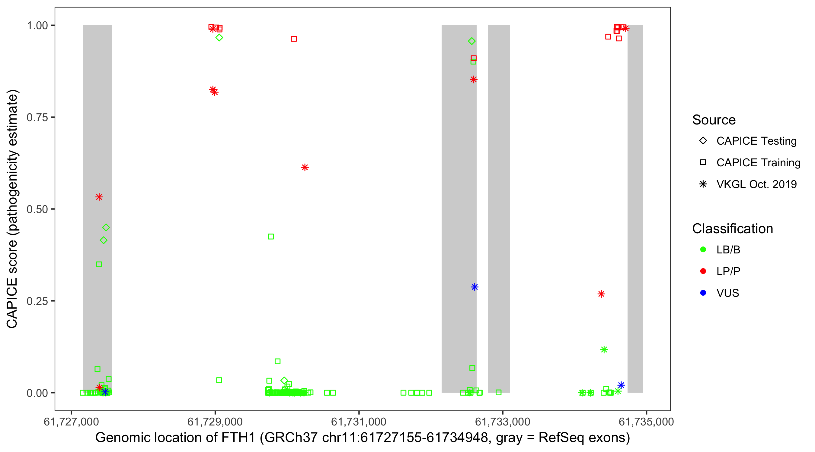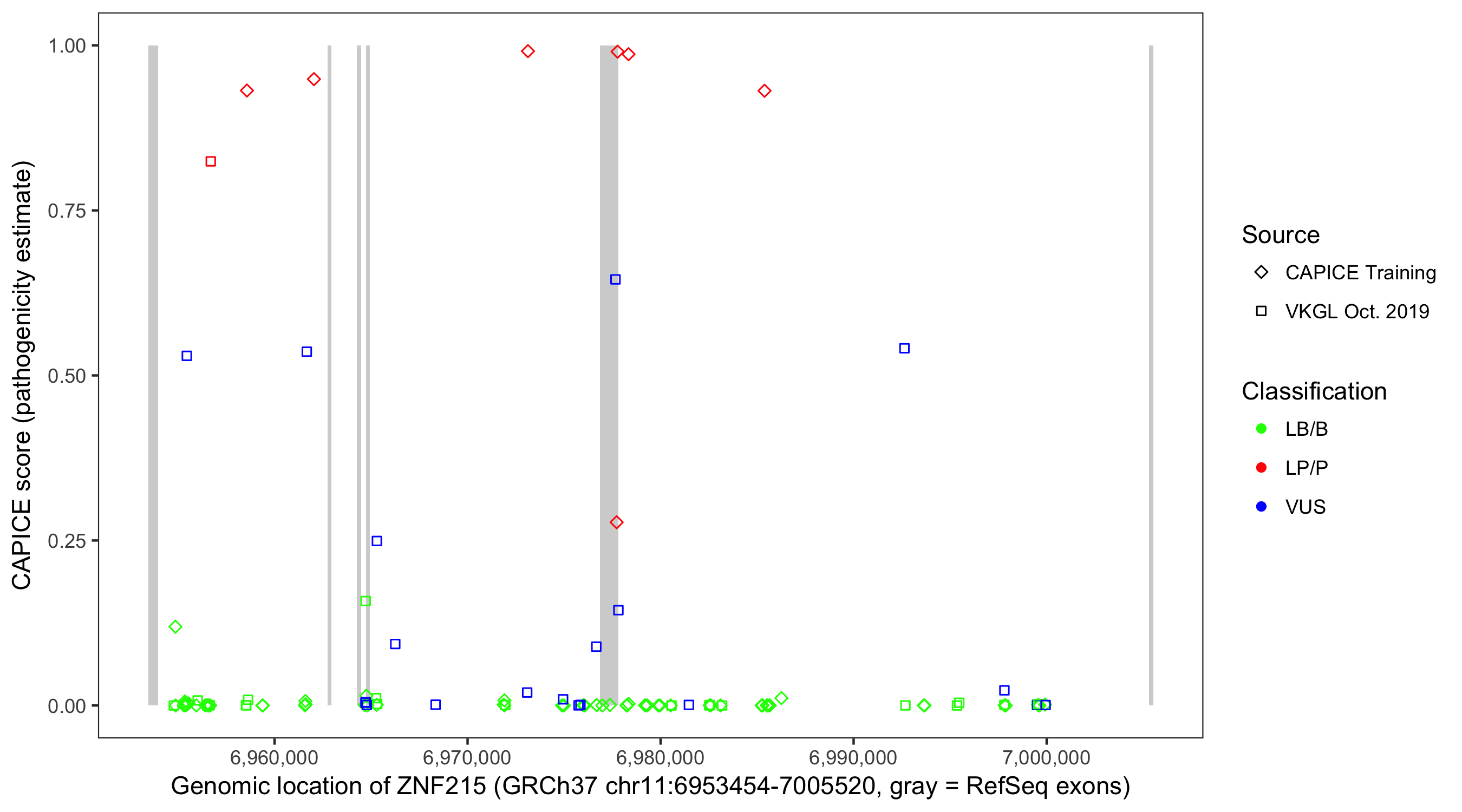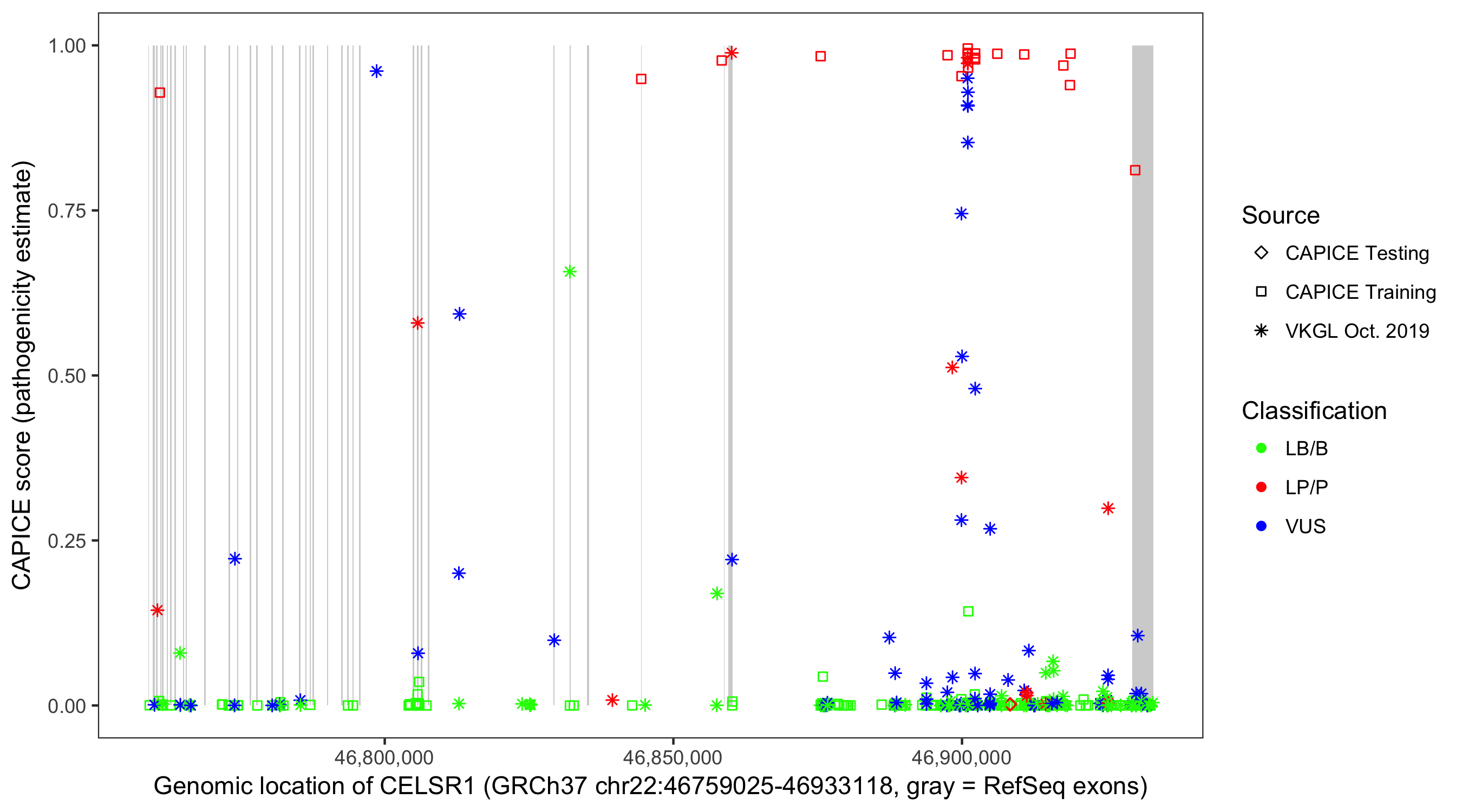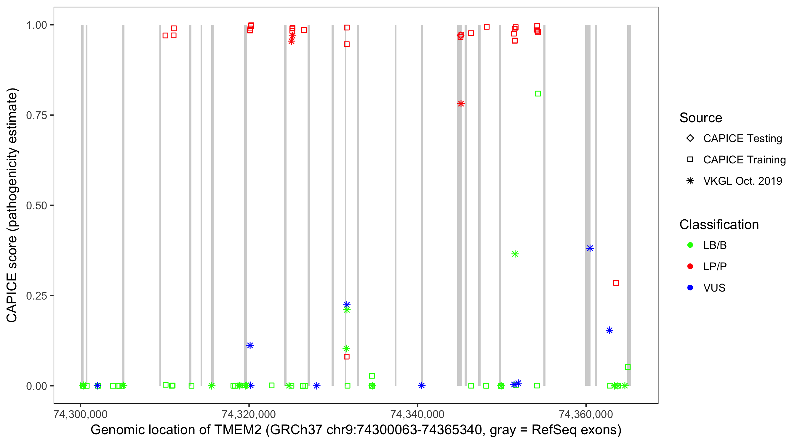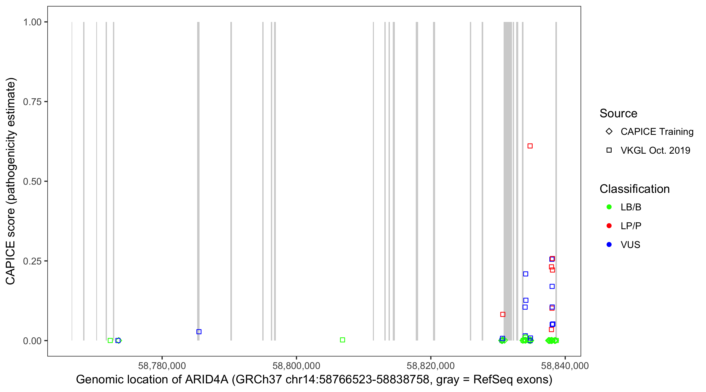 Shown are CAPICE train/test variants plus VKGL Oct 2019.