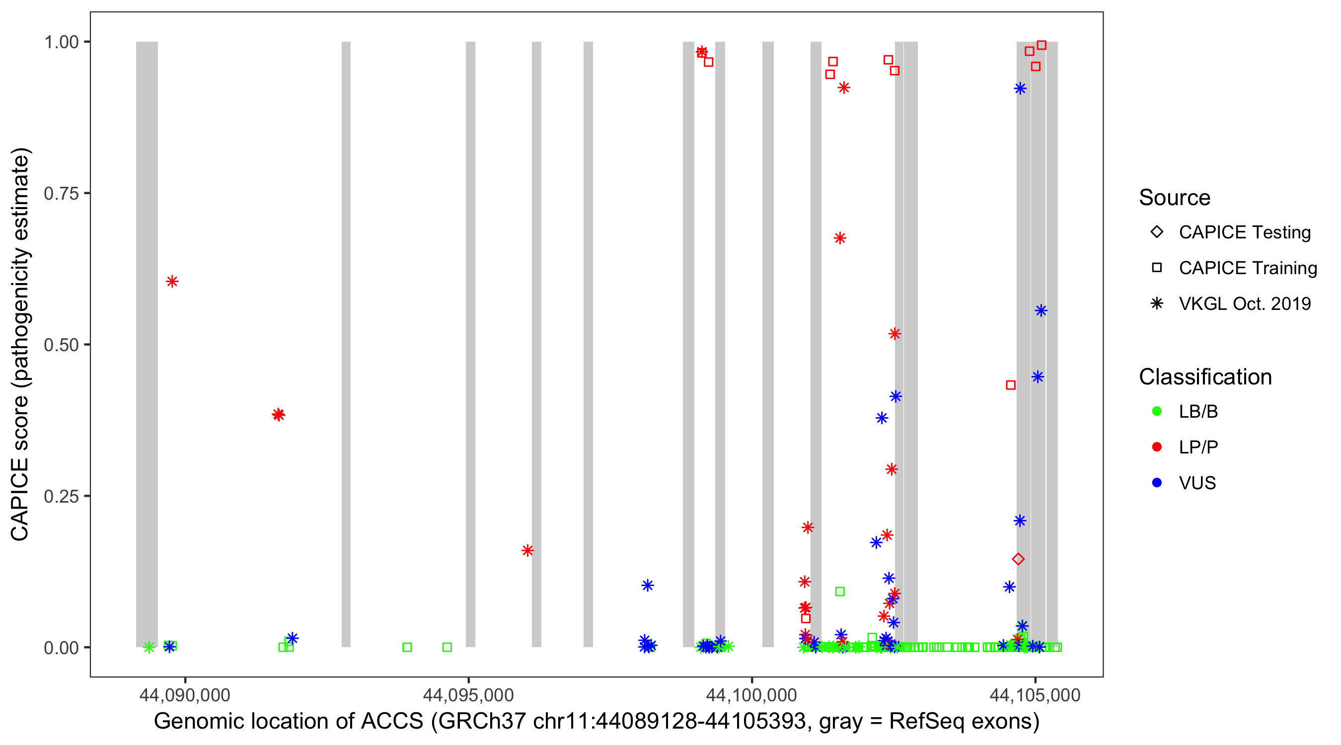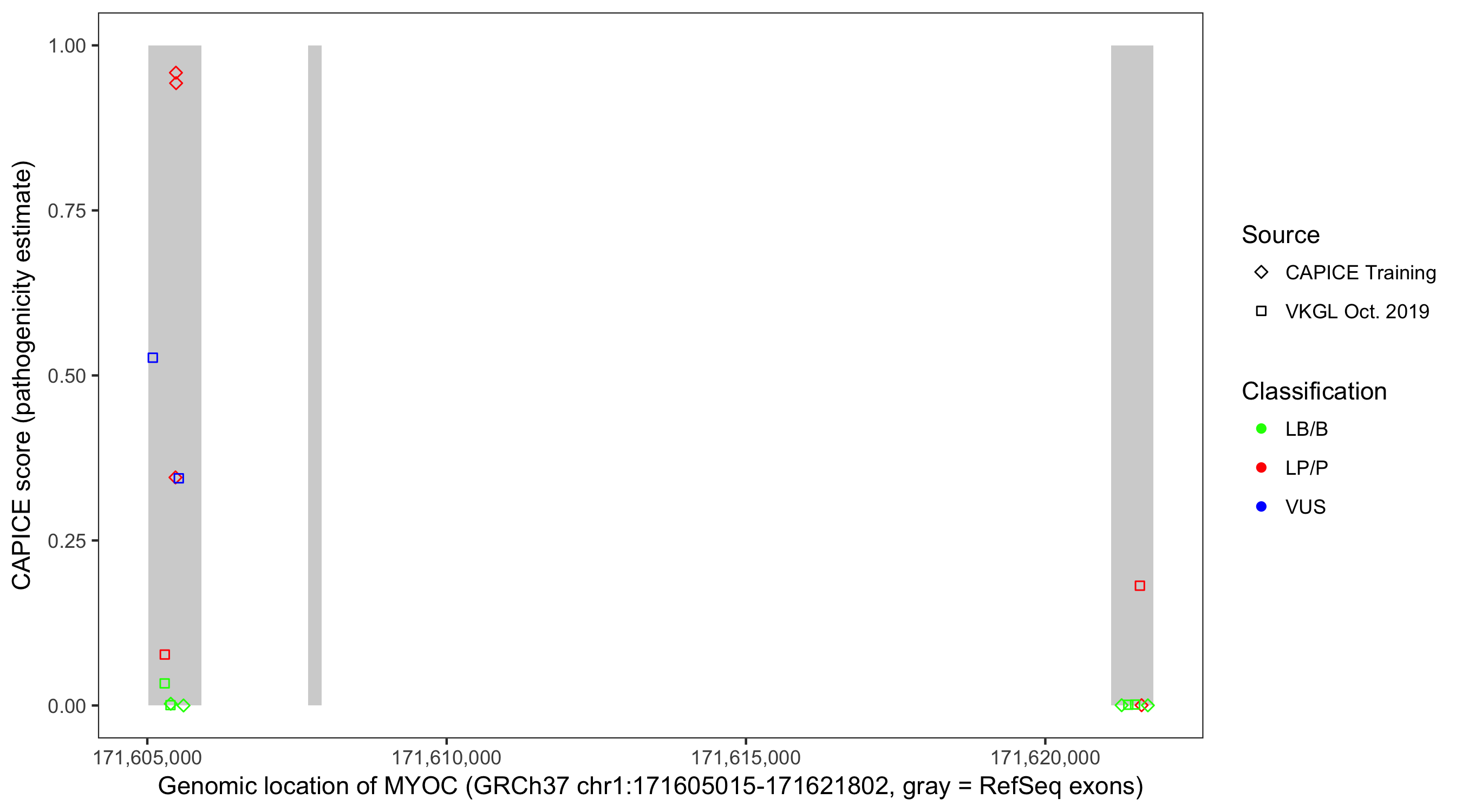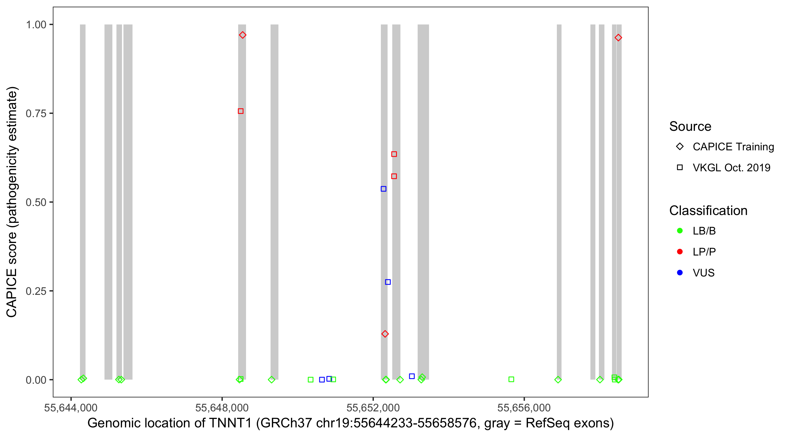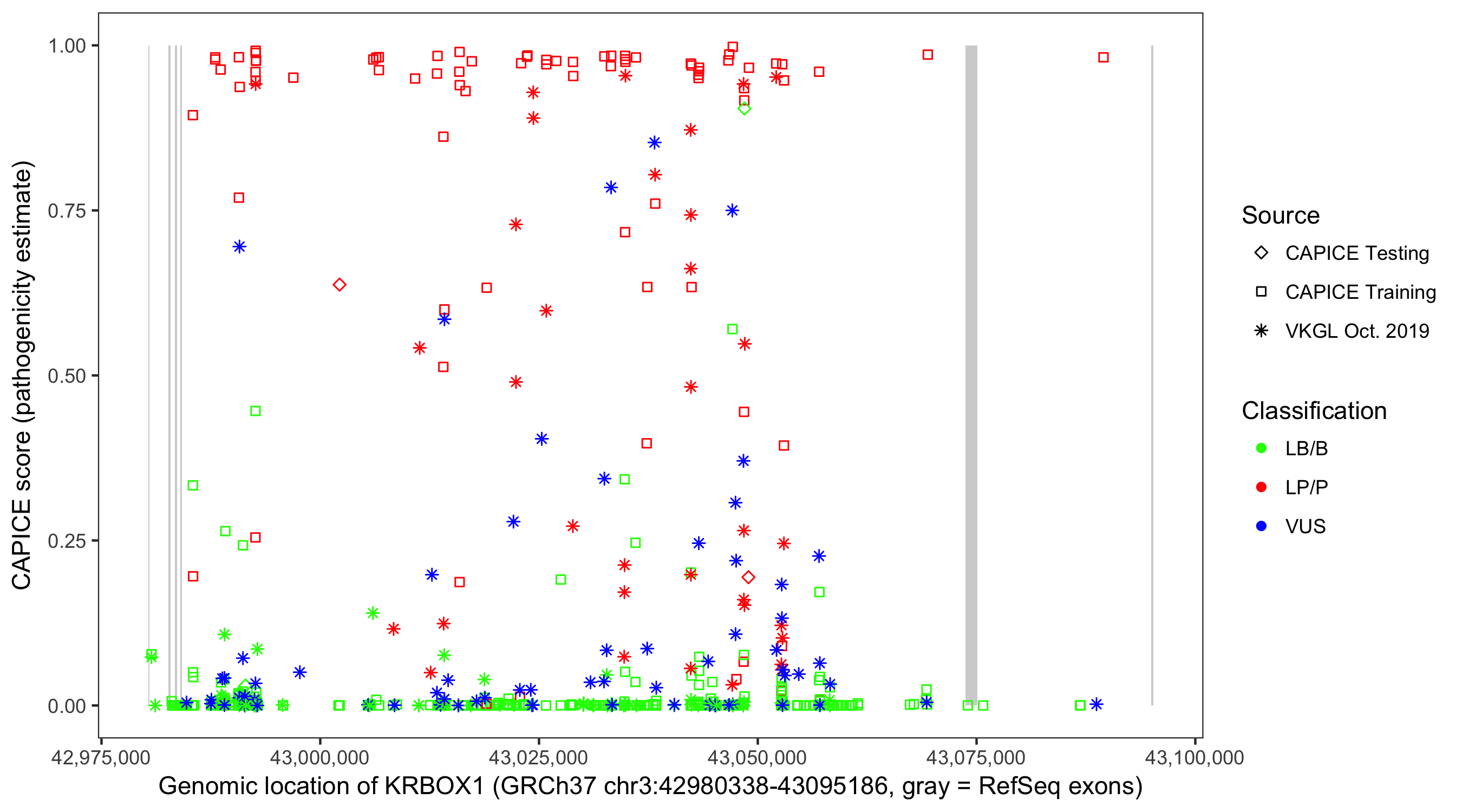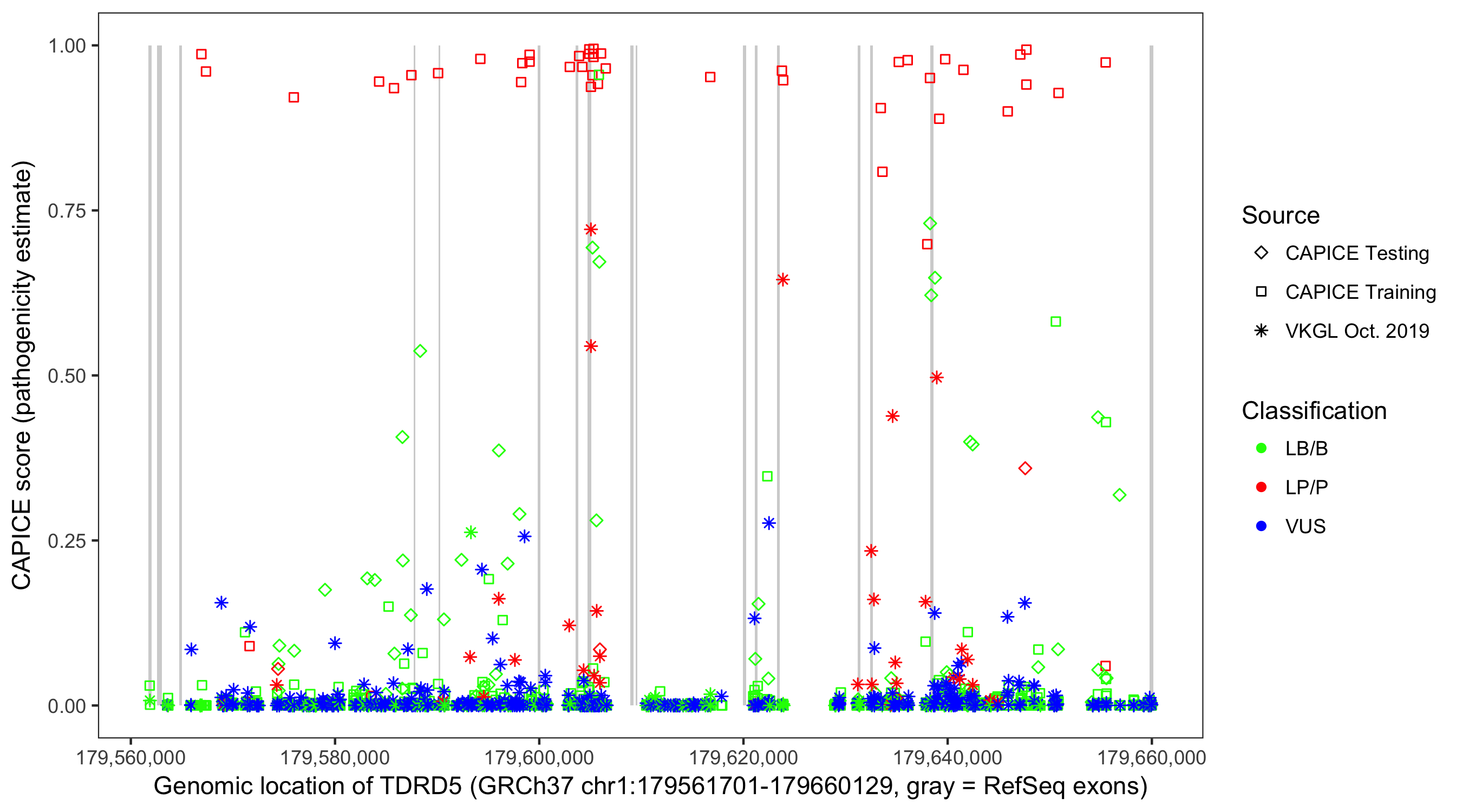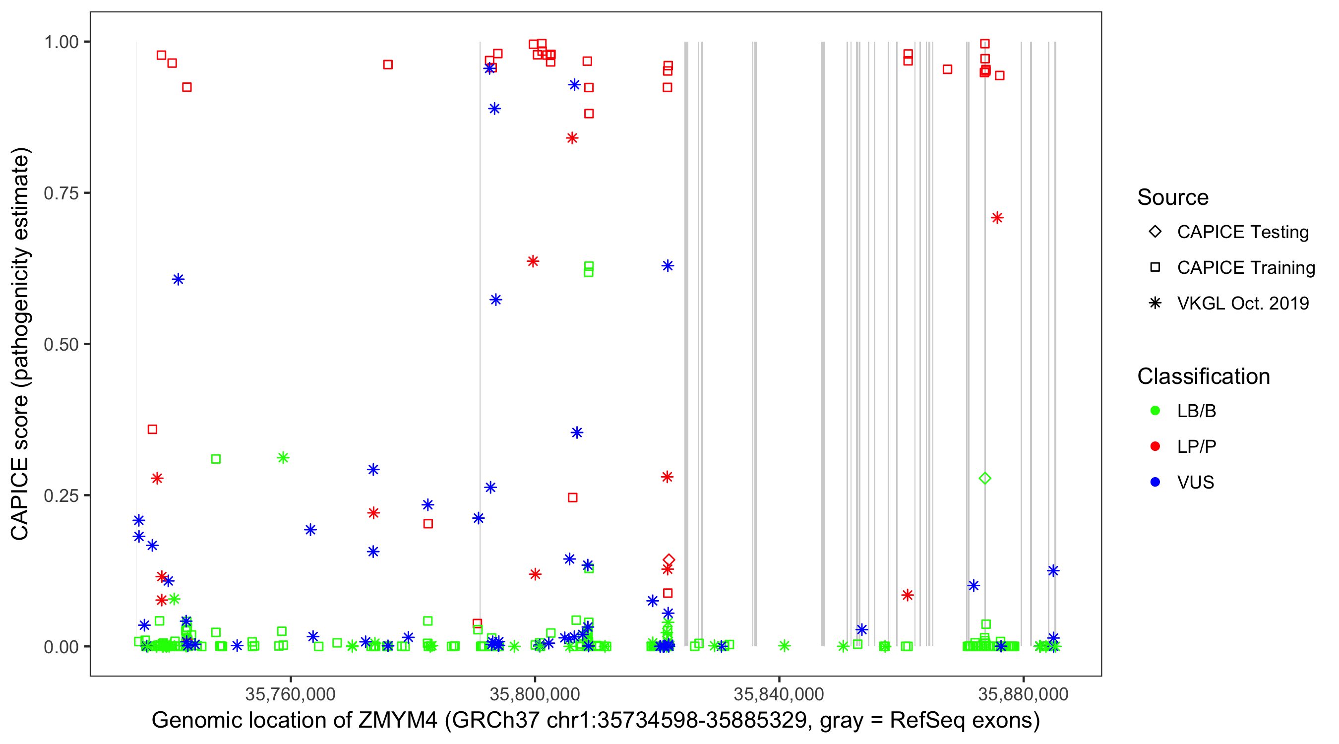 Shown are CAPICE train/test variants plus VKGL Oct 2019.