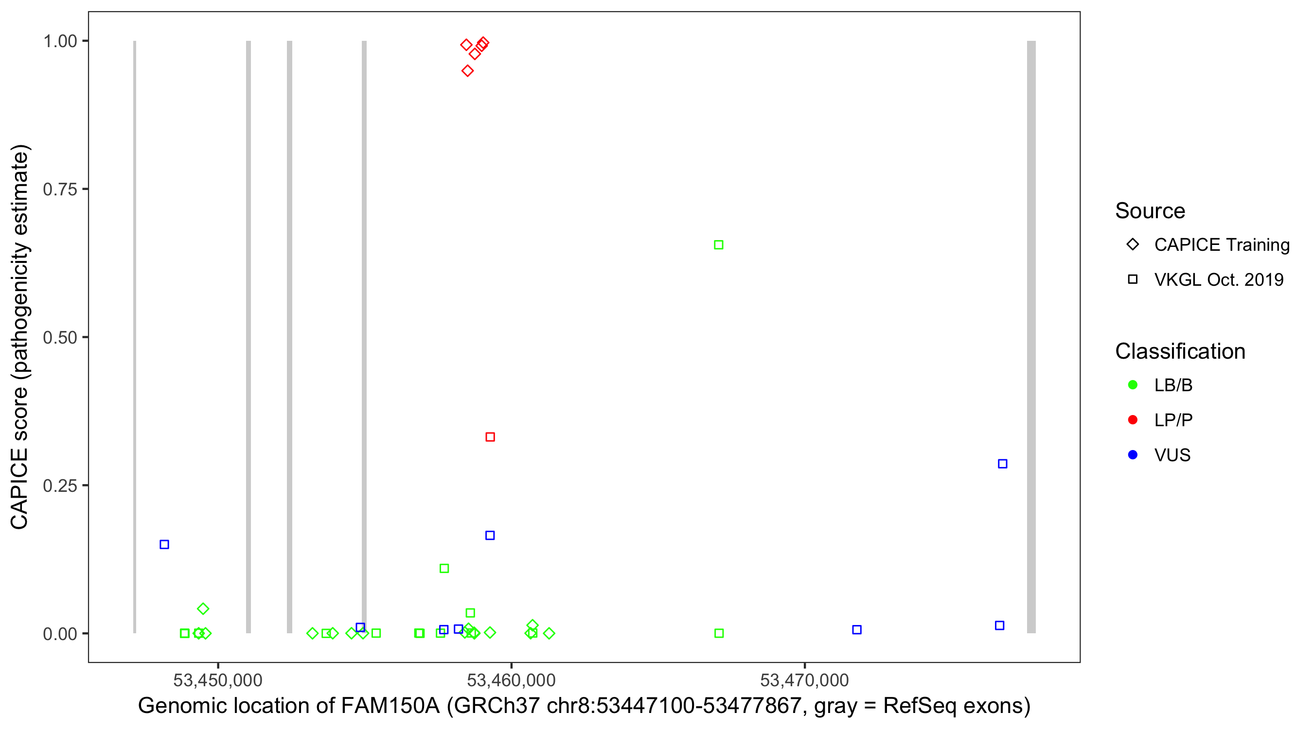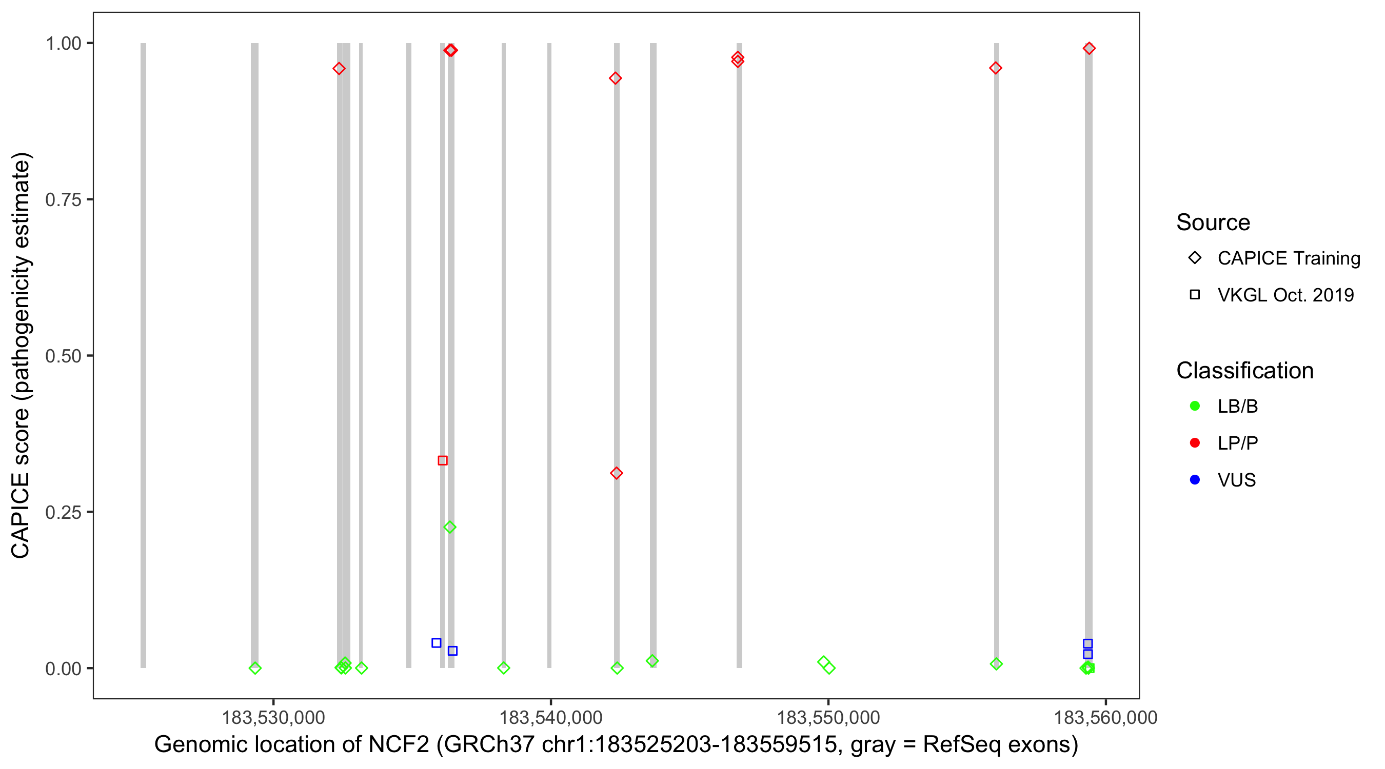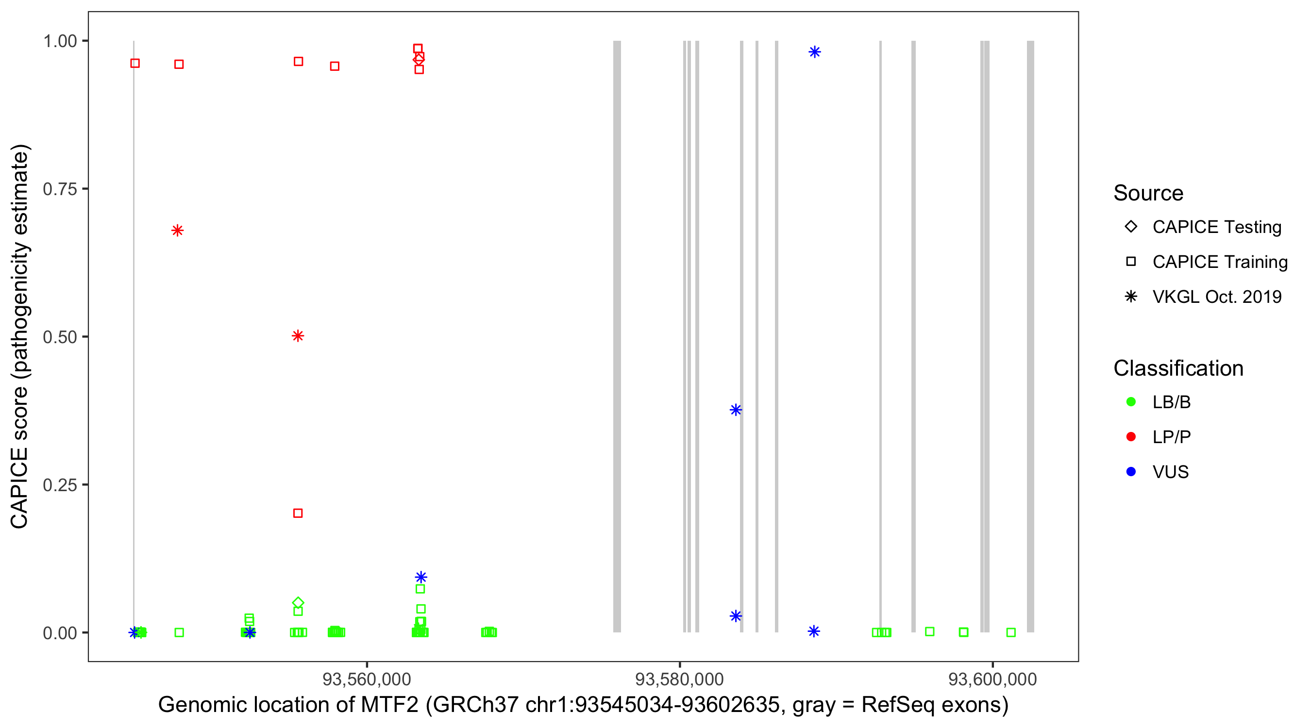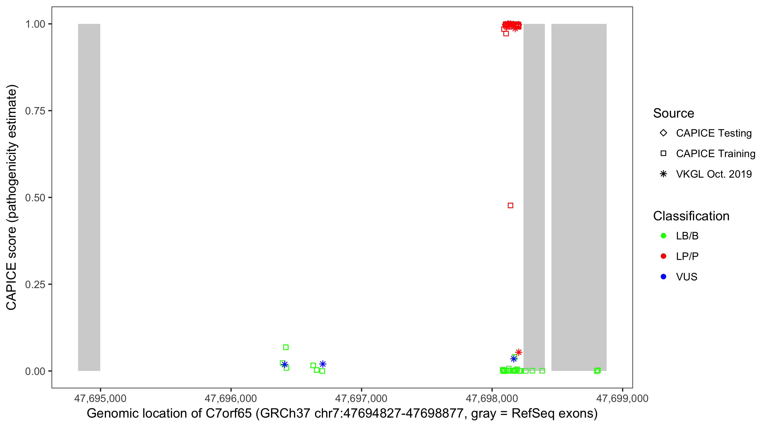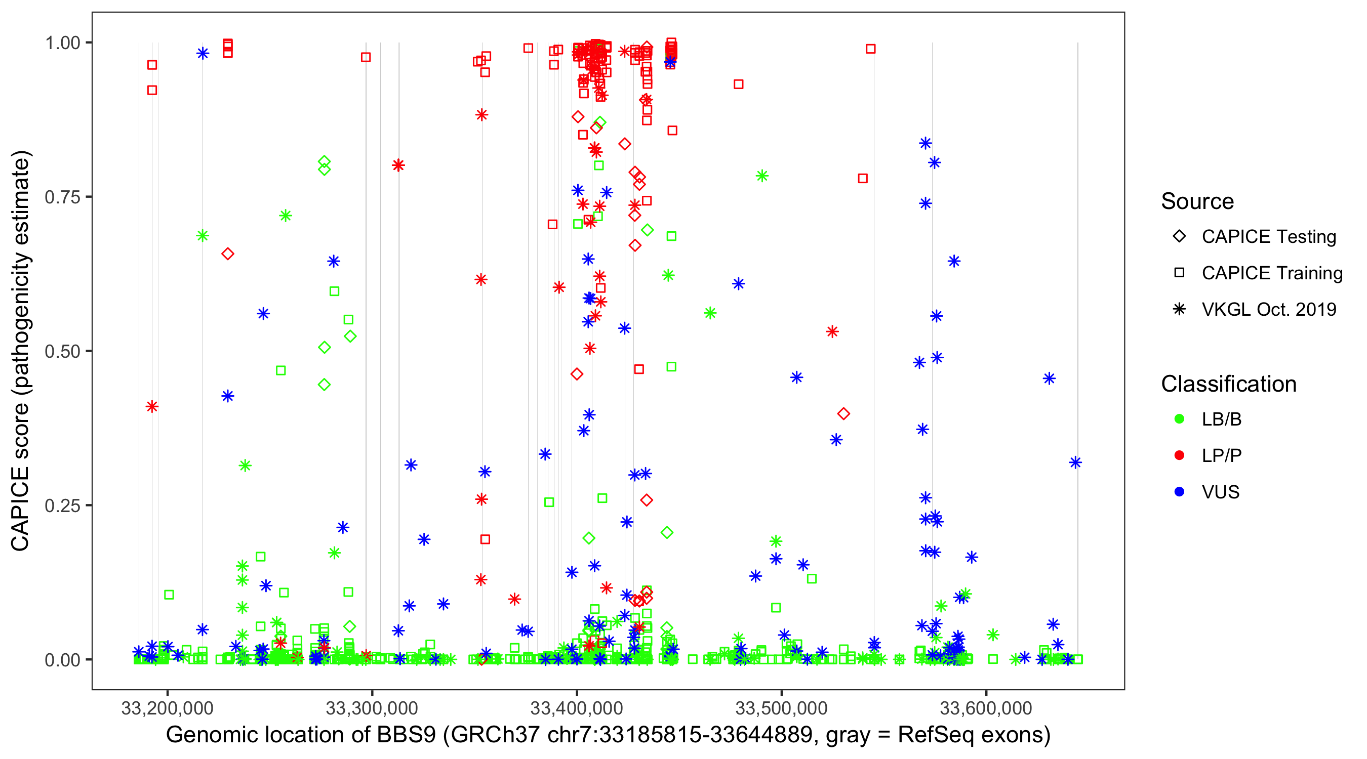 Shown are CAPICE train/test variants plus VKGL Oct 2019.