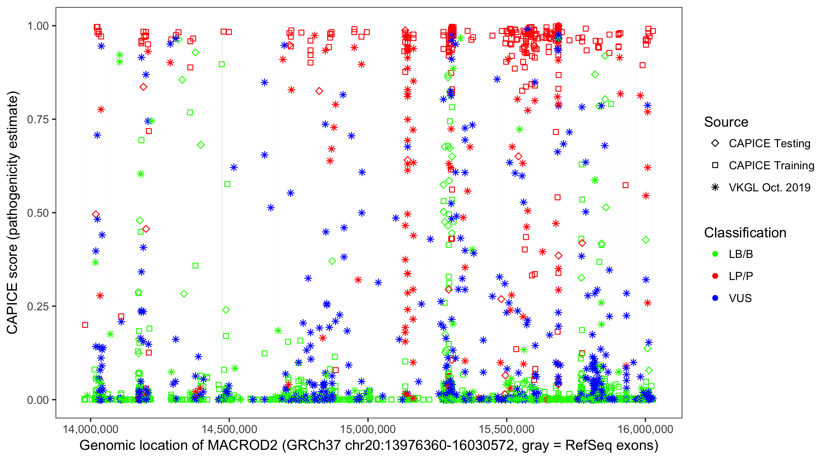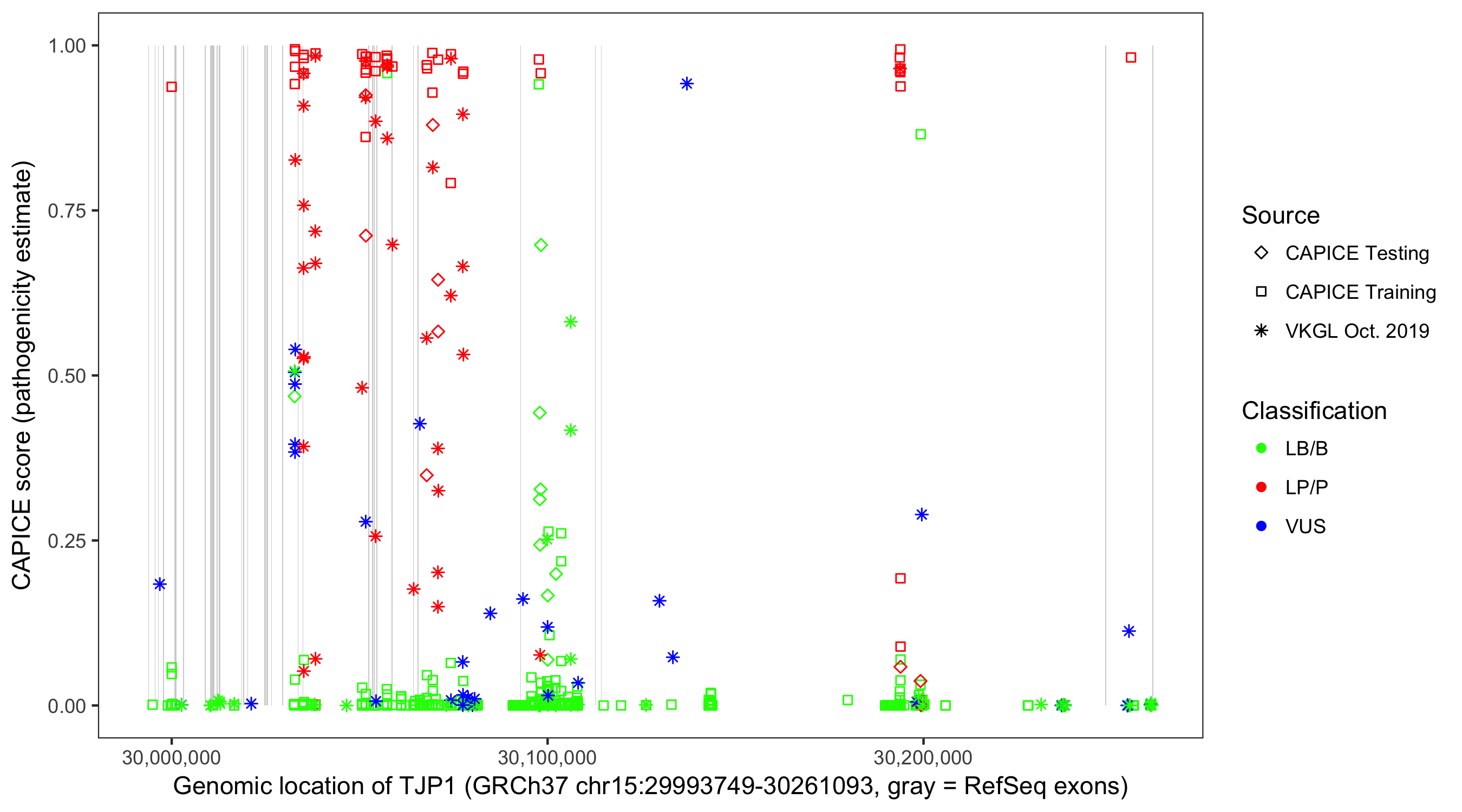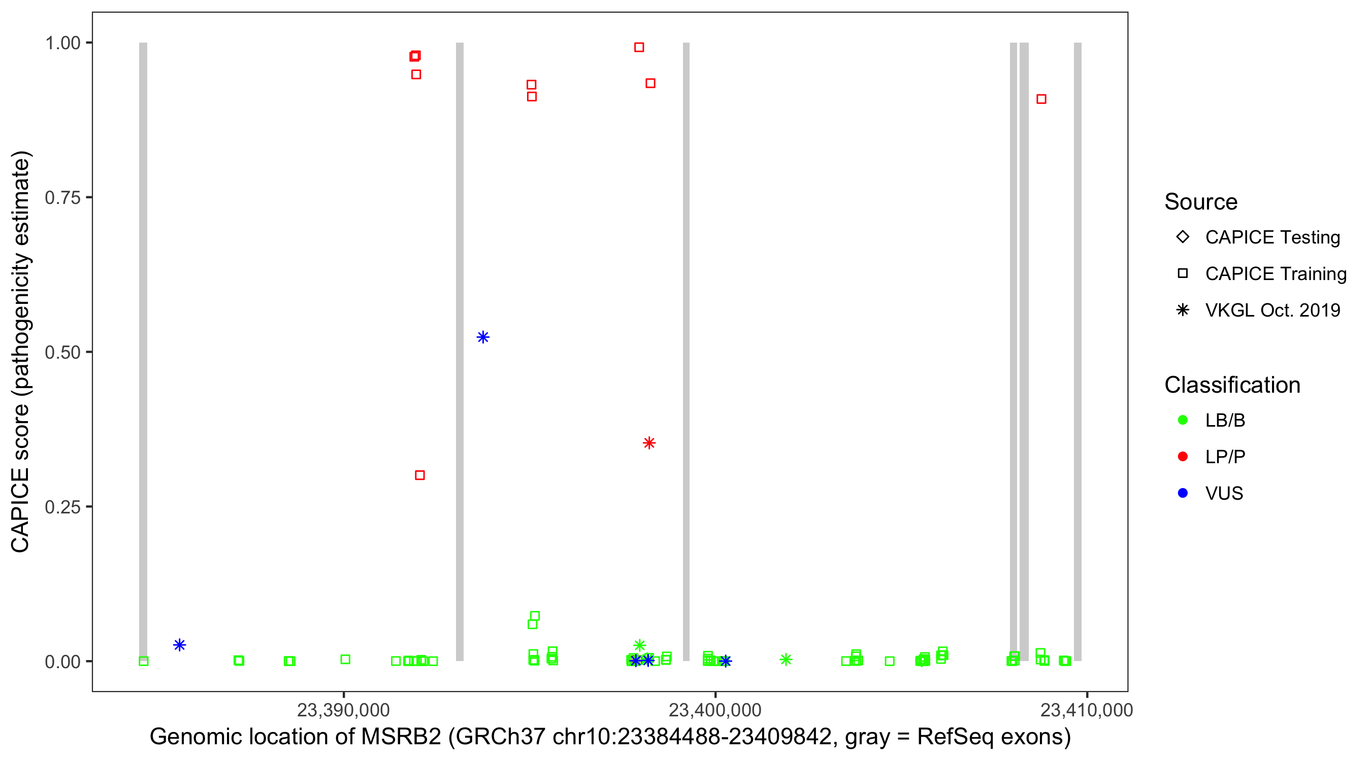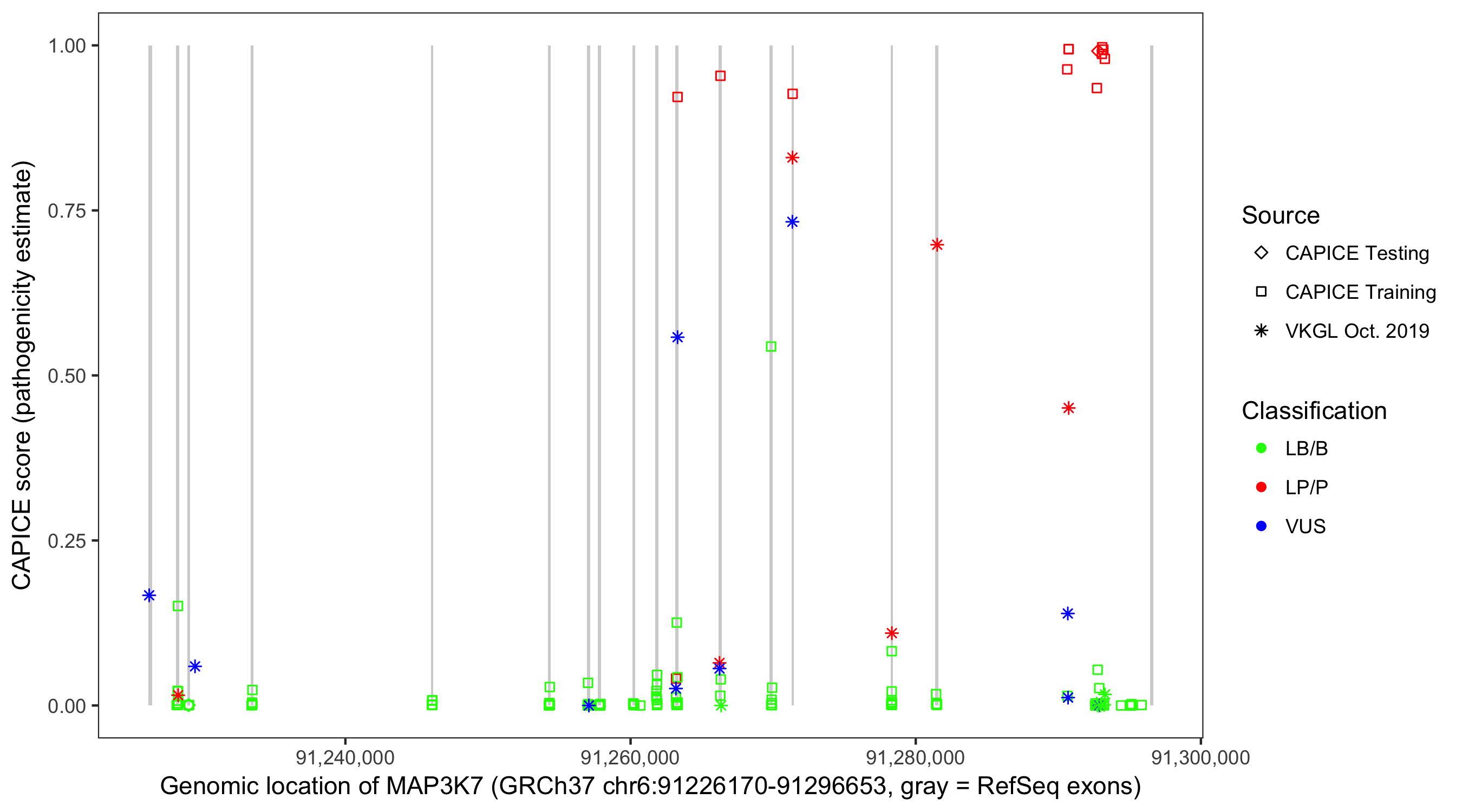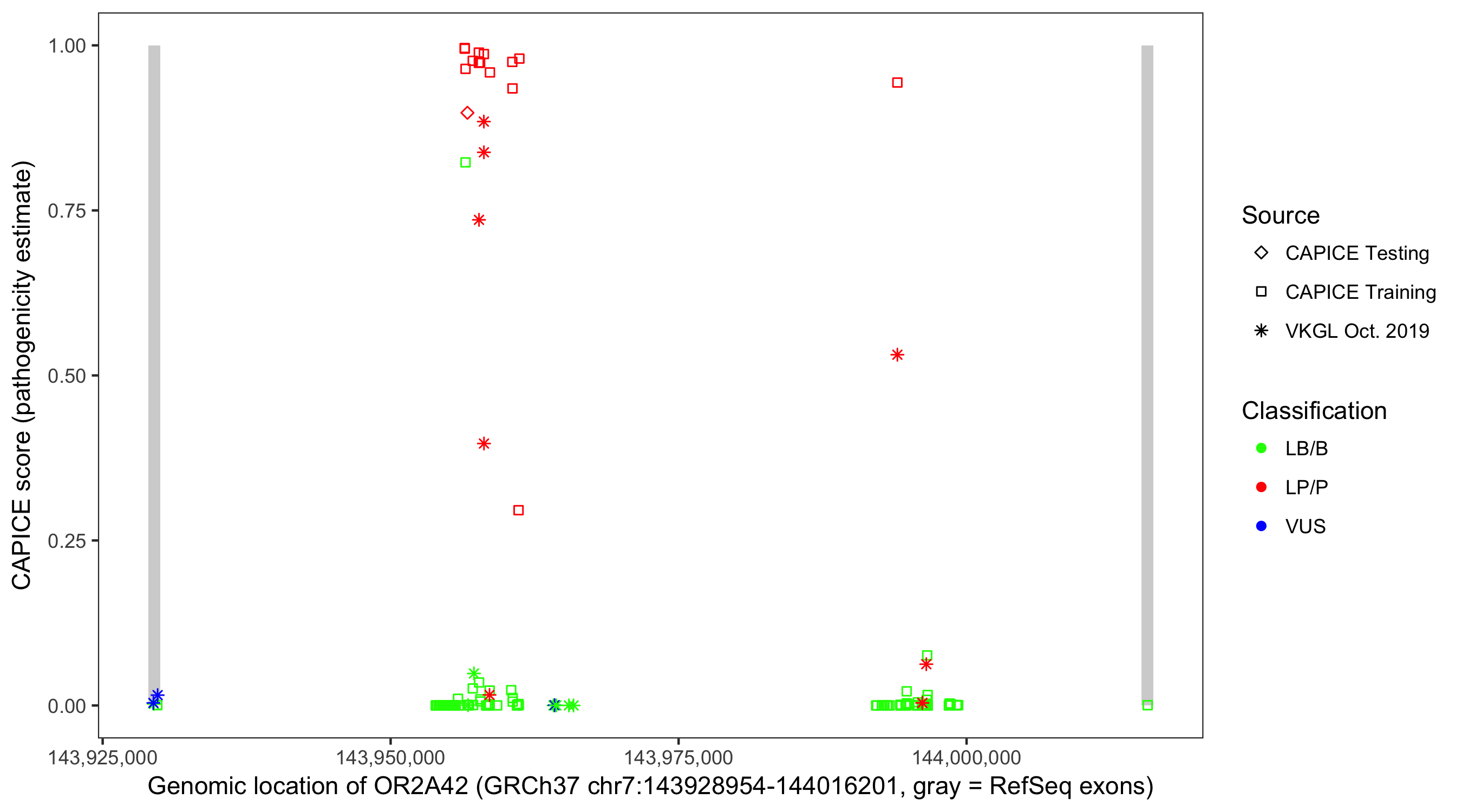 Shown are CAPICE train/test variants plus VKGL Oct 2019.