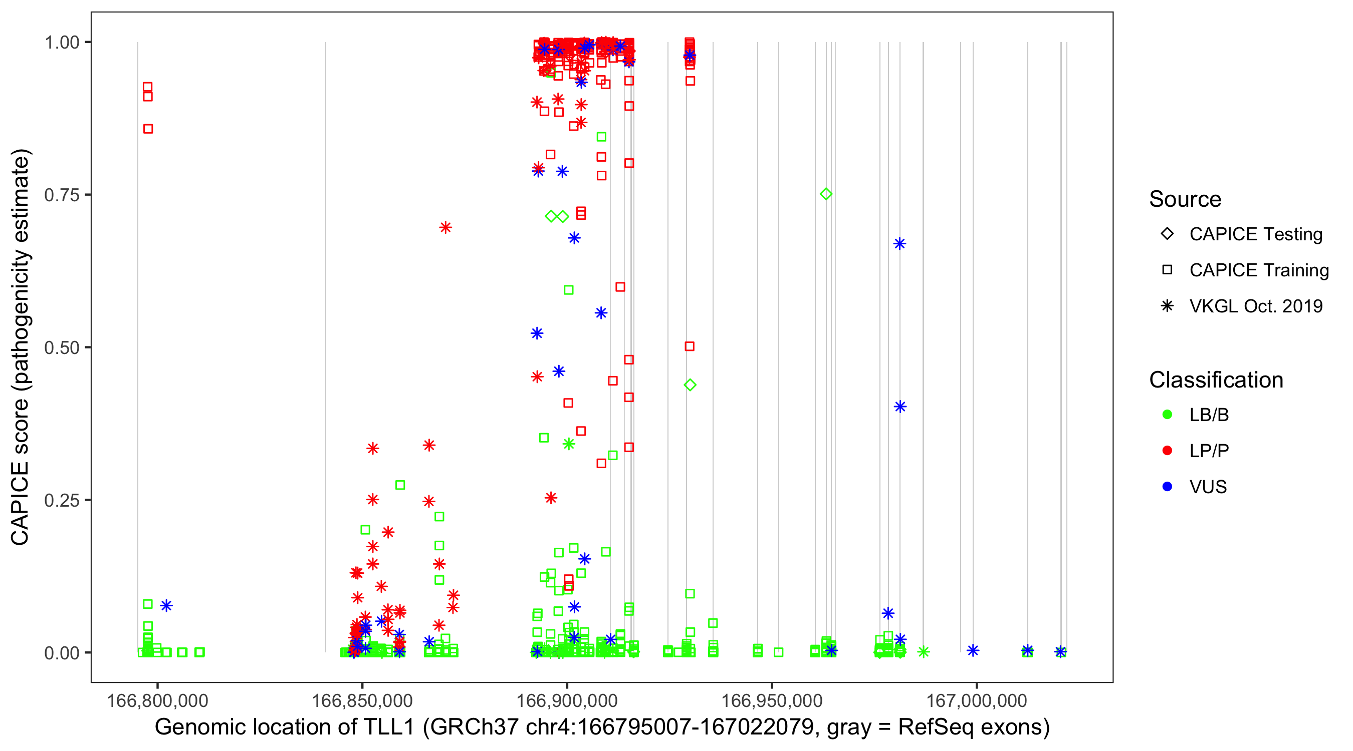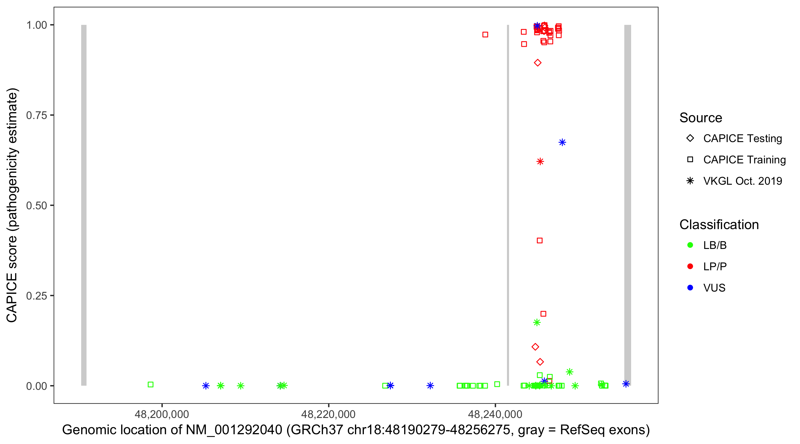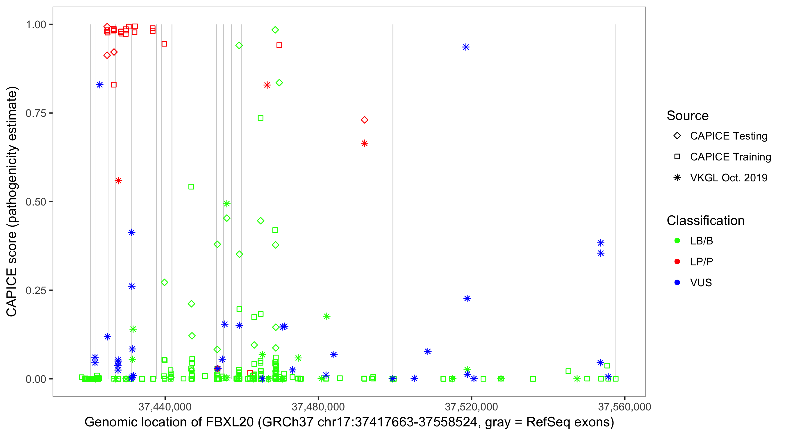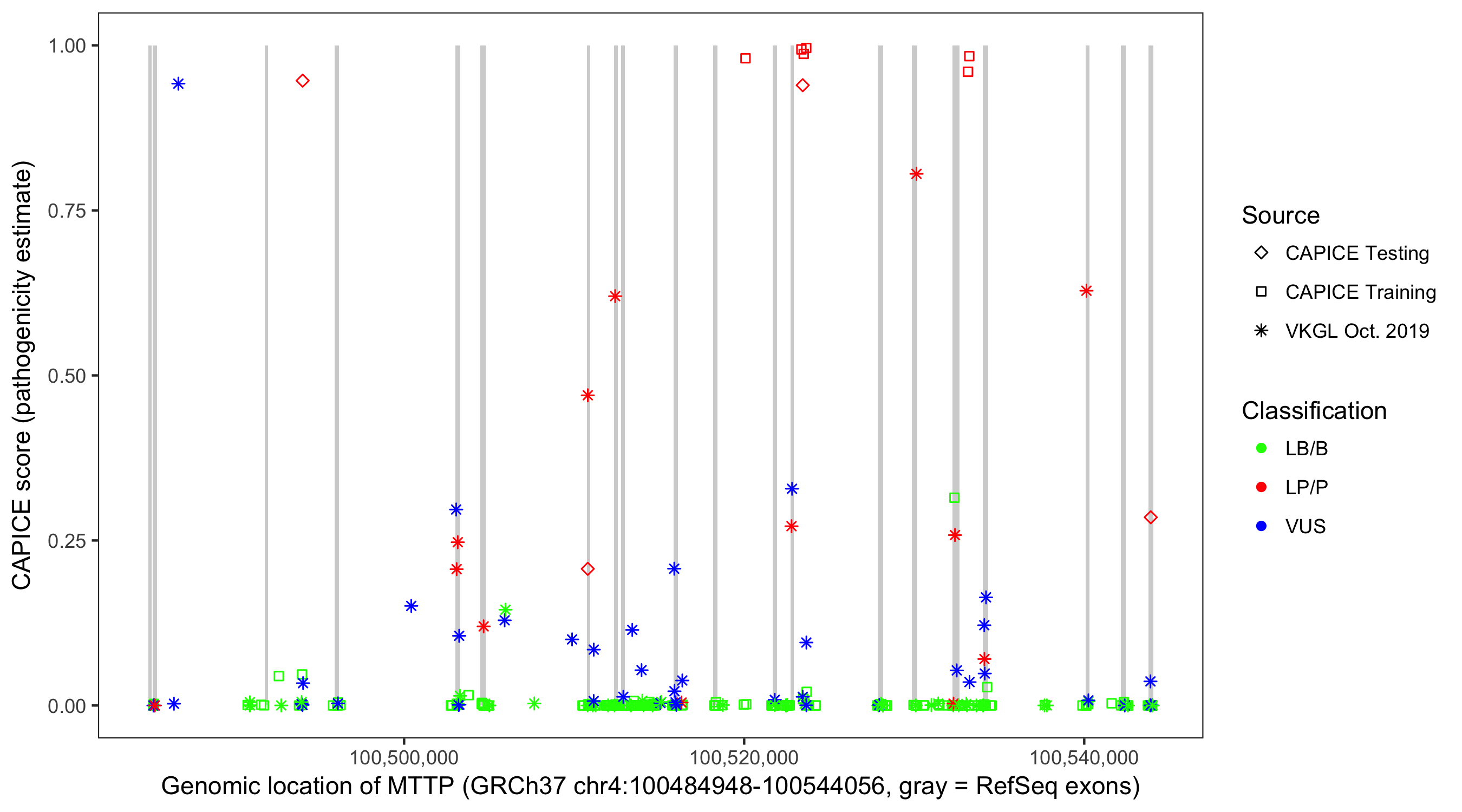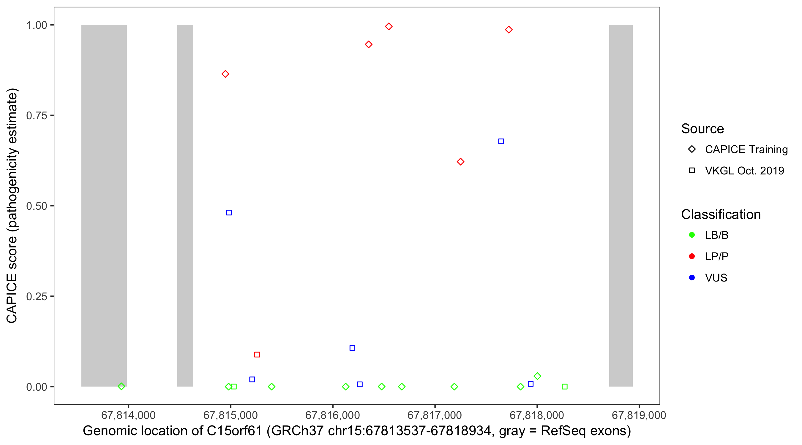 Shown are CAPICE train/test variants plus VKGL Oct 2019.