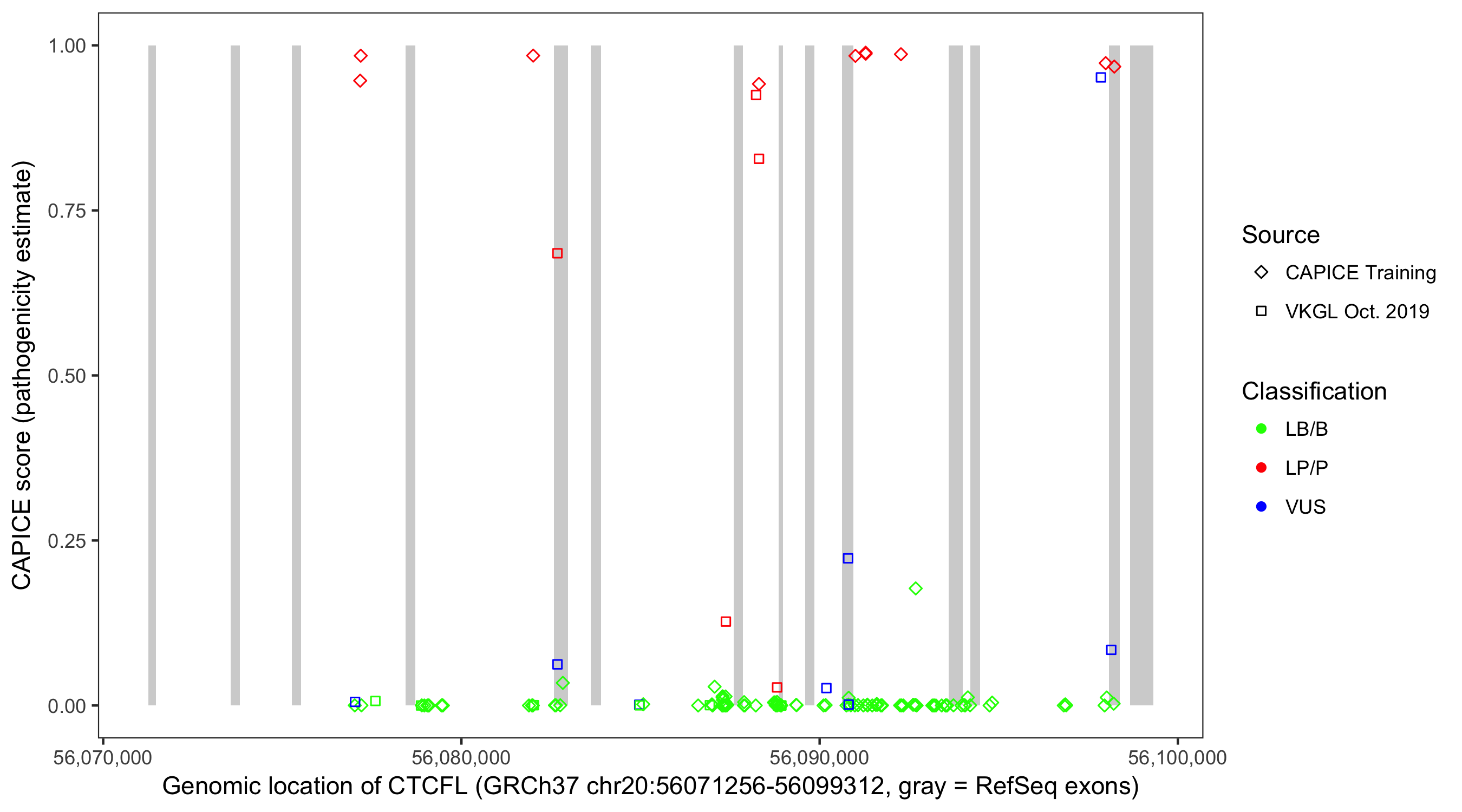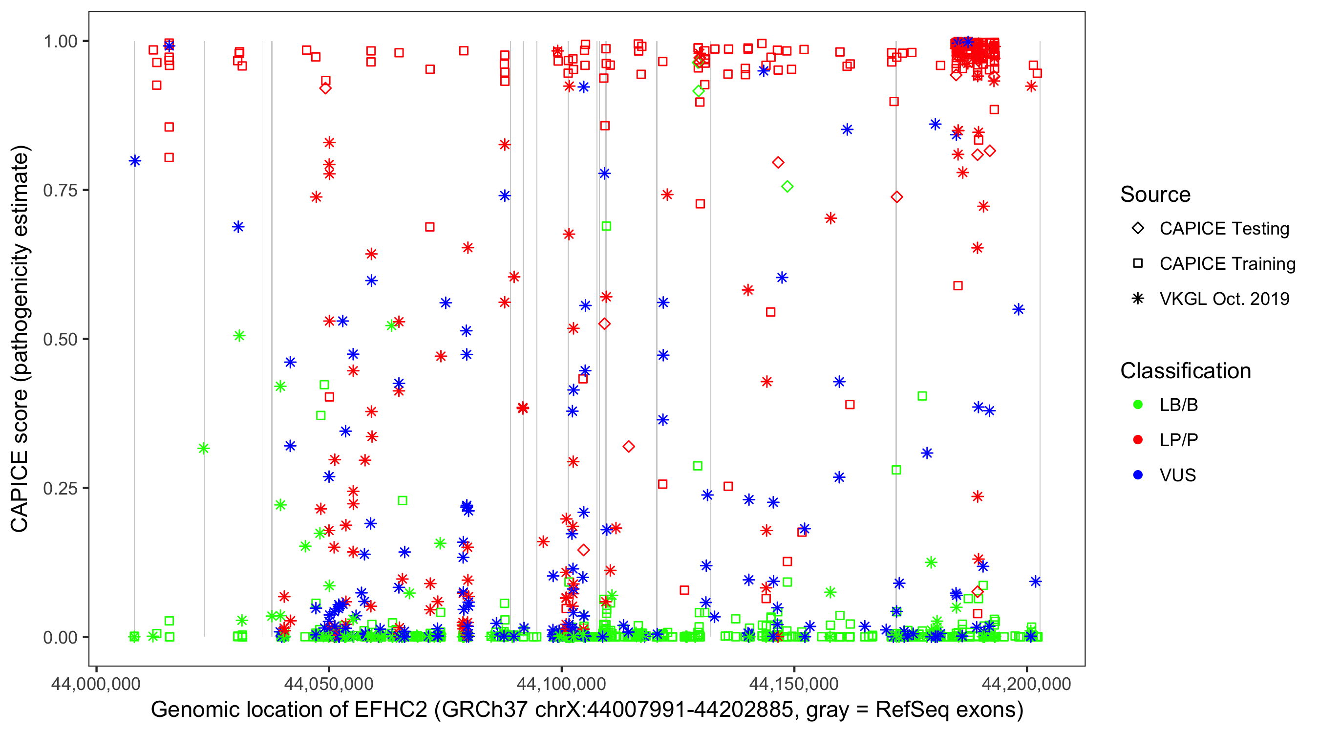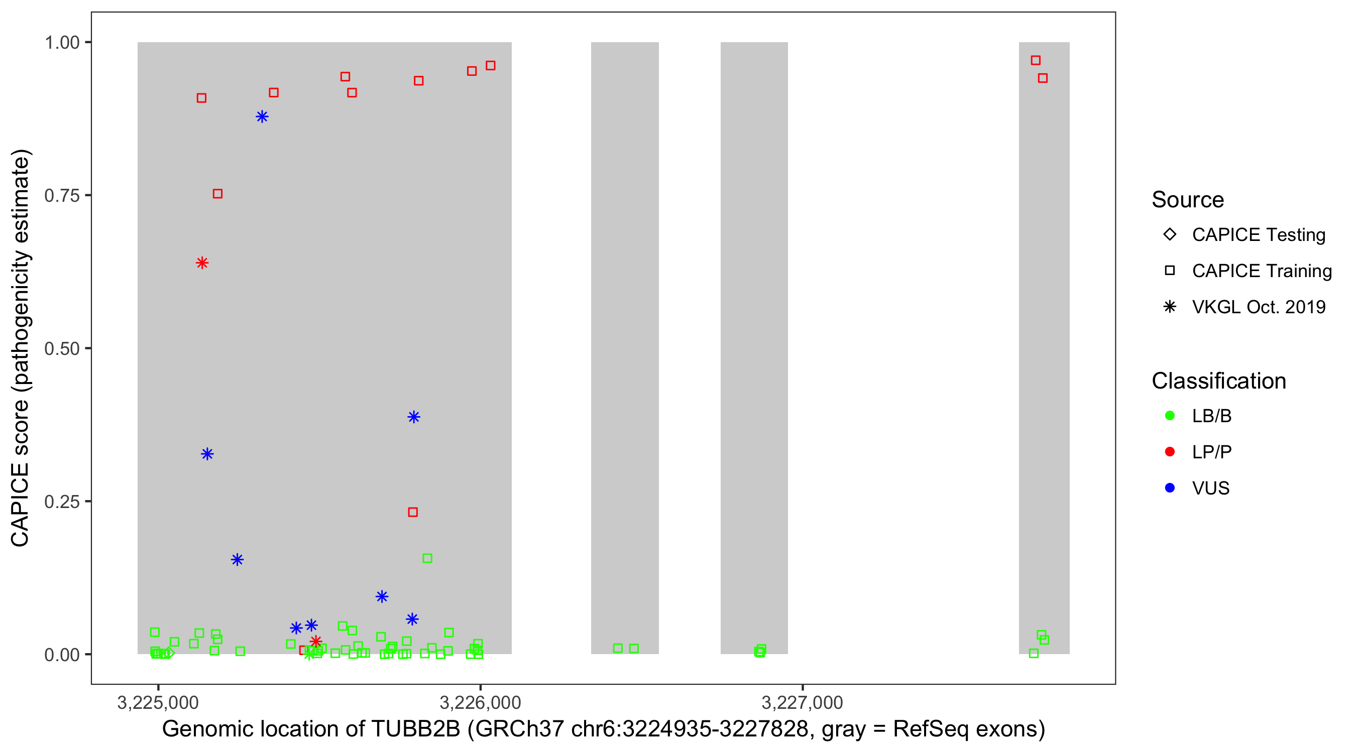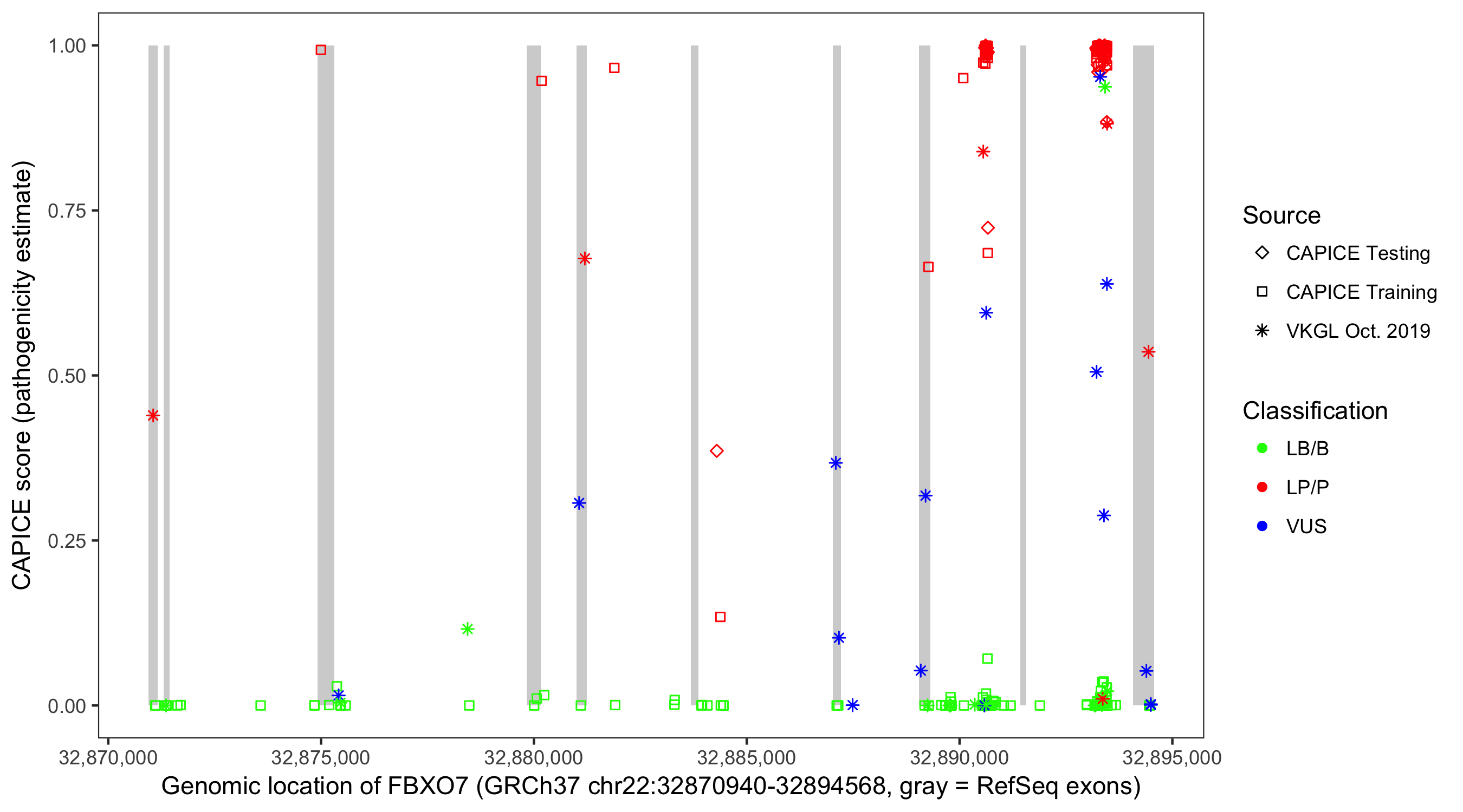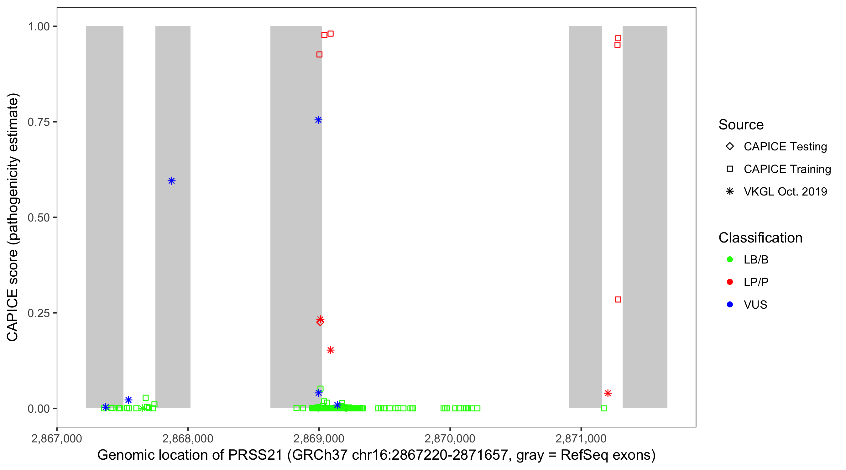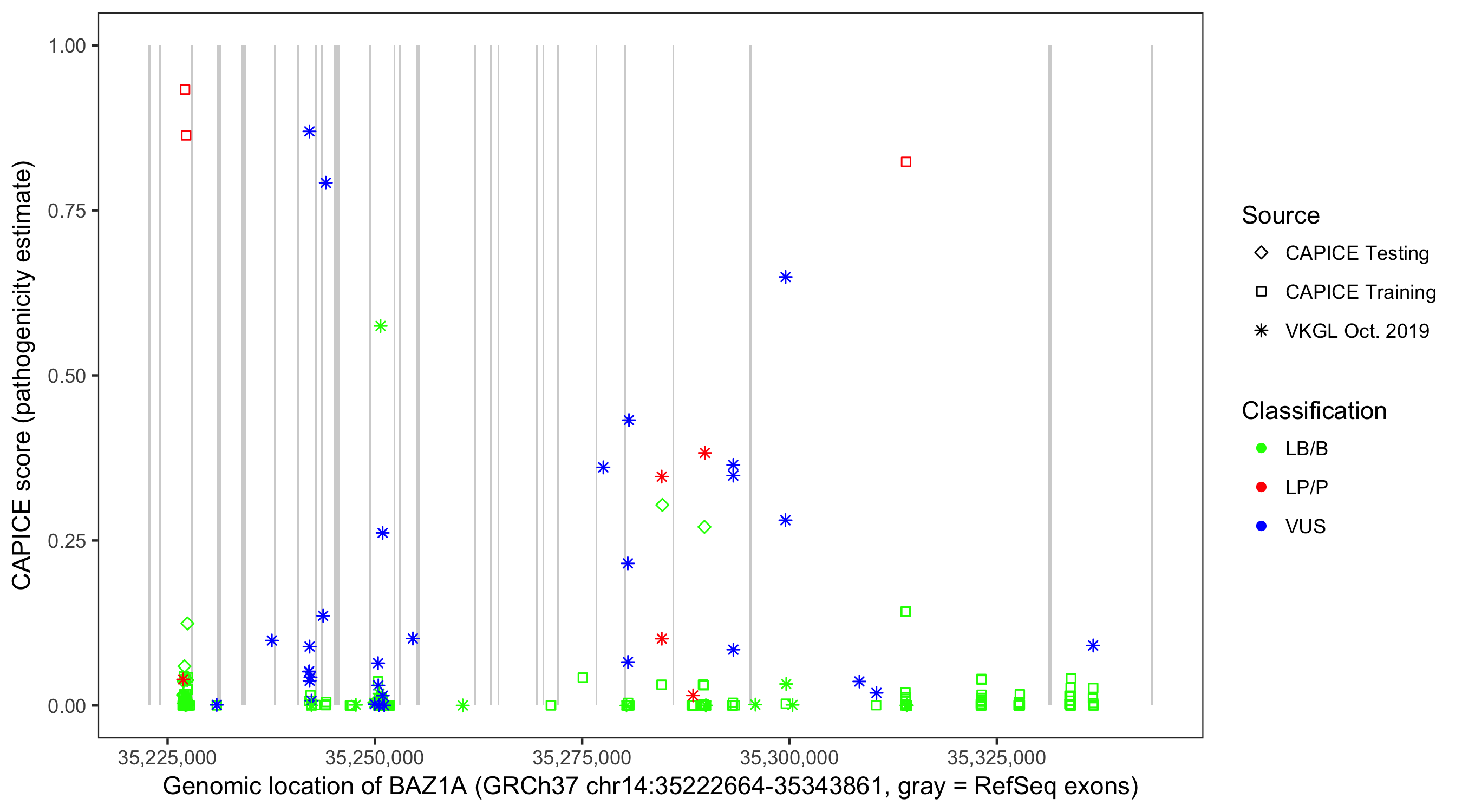 Shown are CAPICE train/test variants plus VKGL Oct 2019.