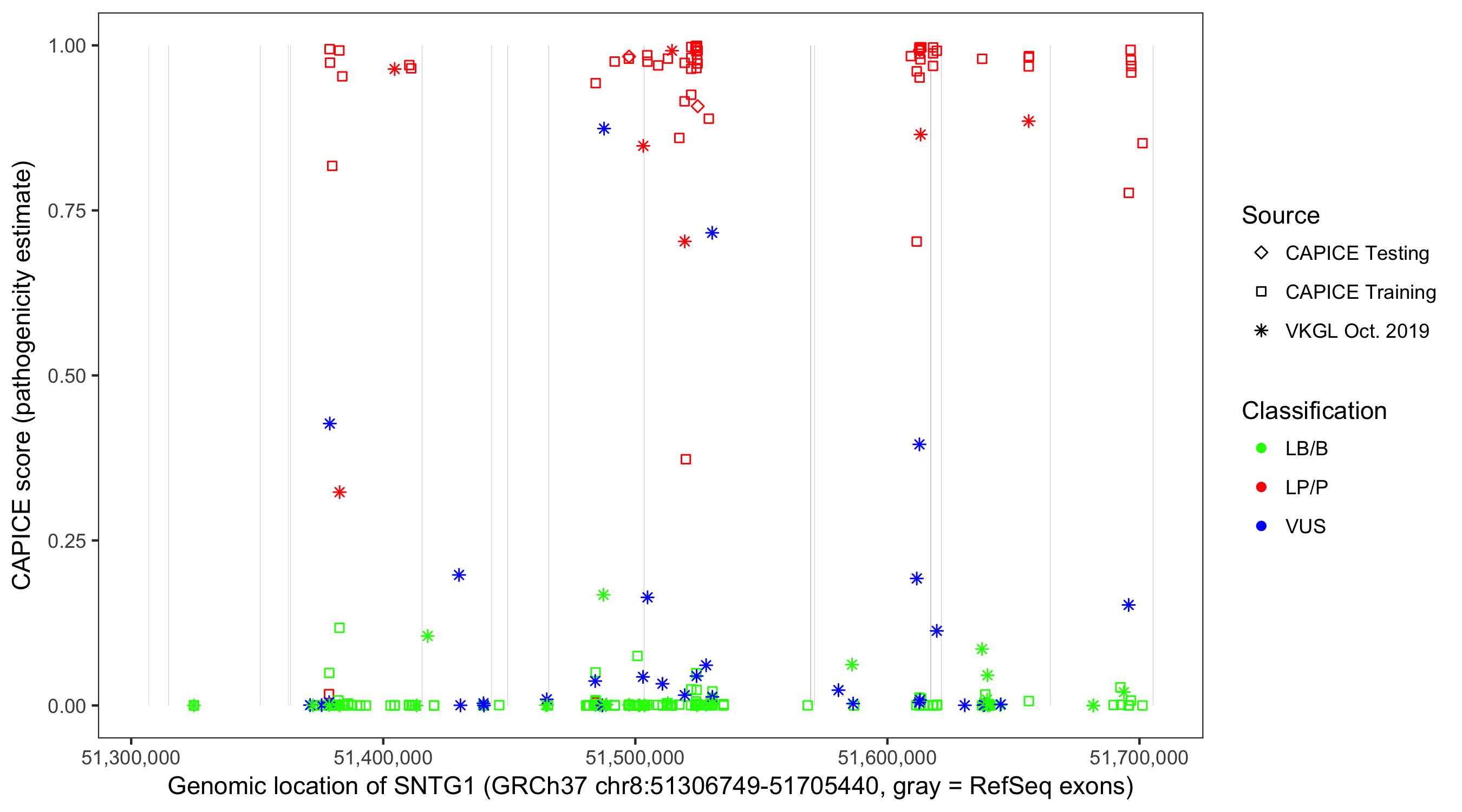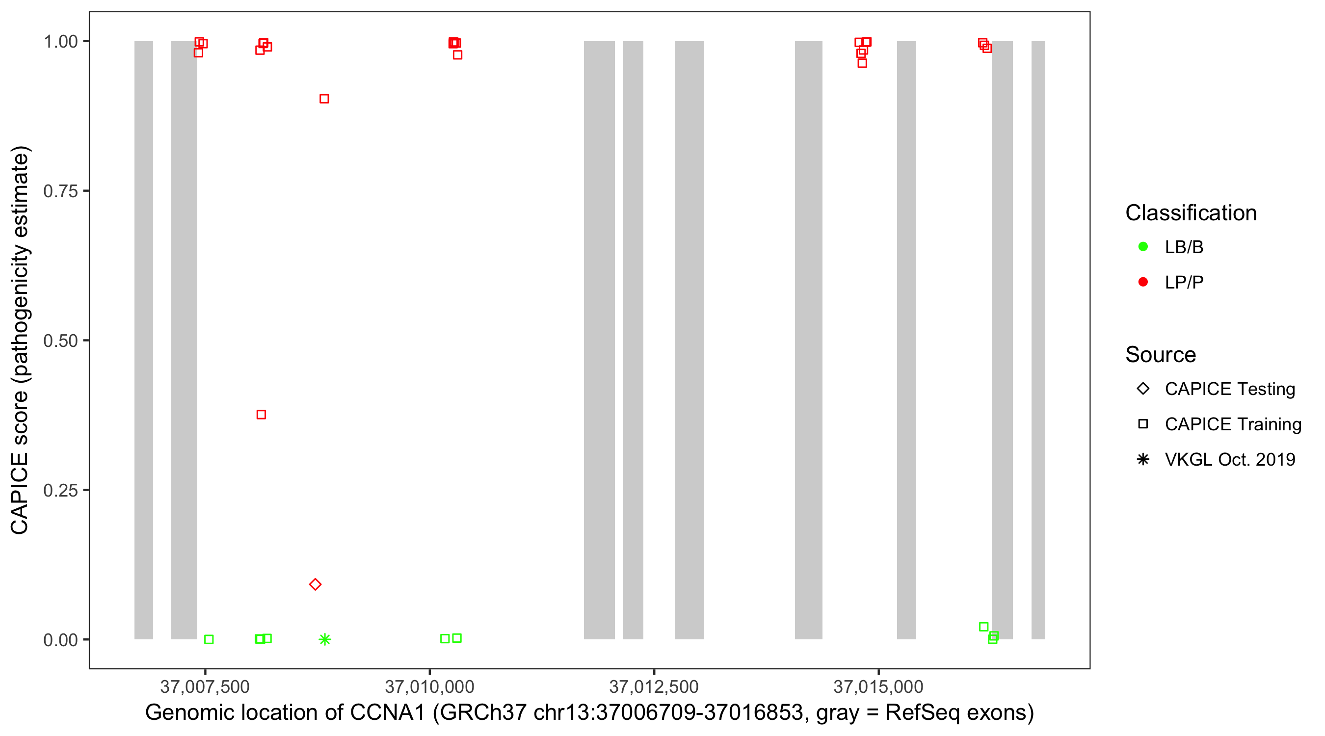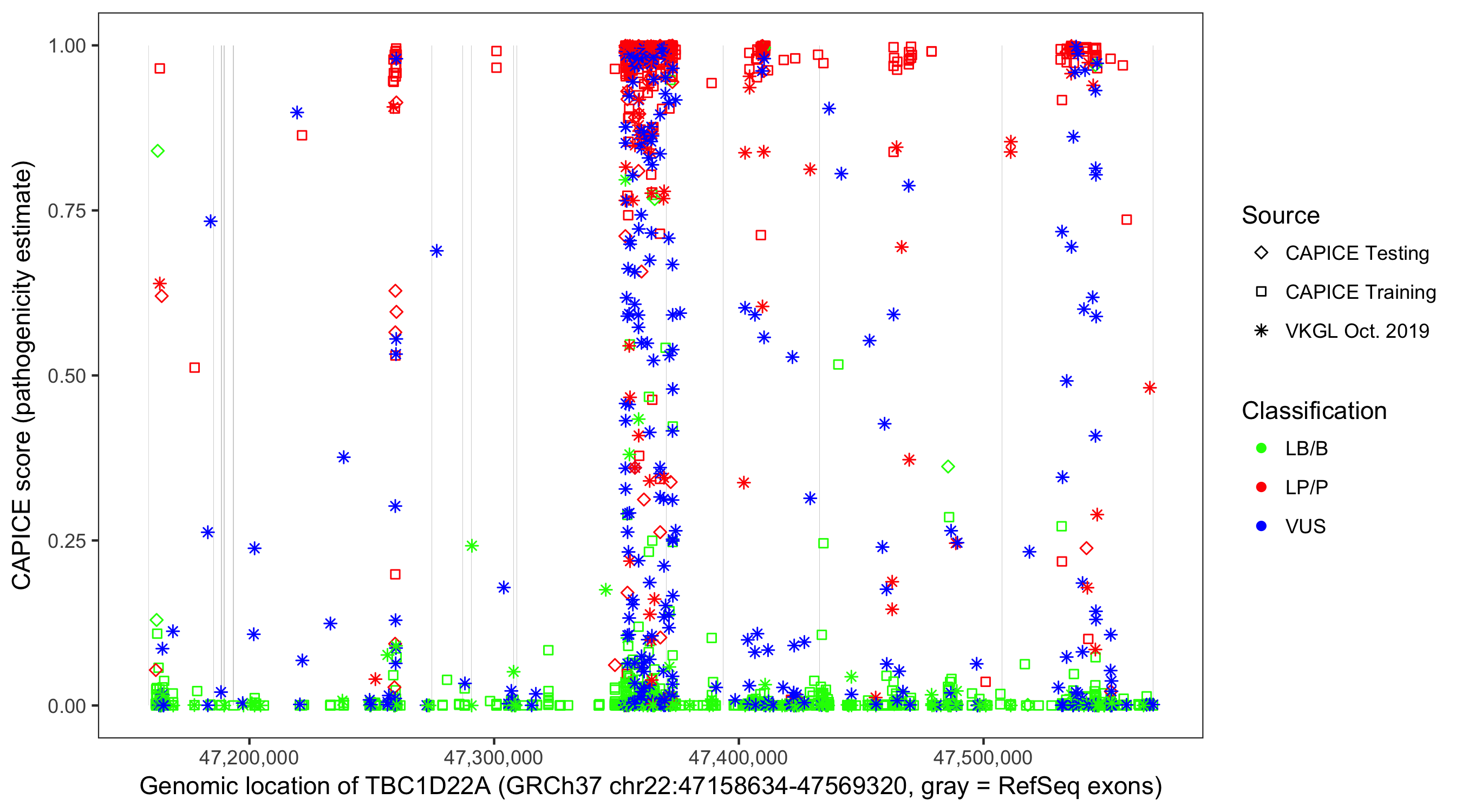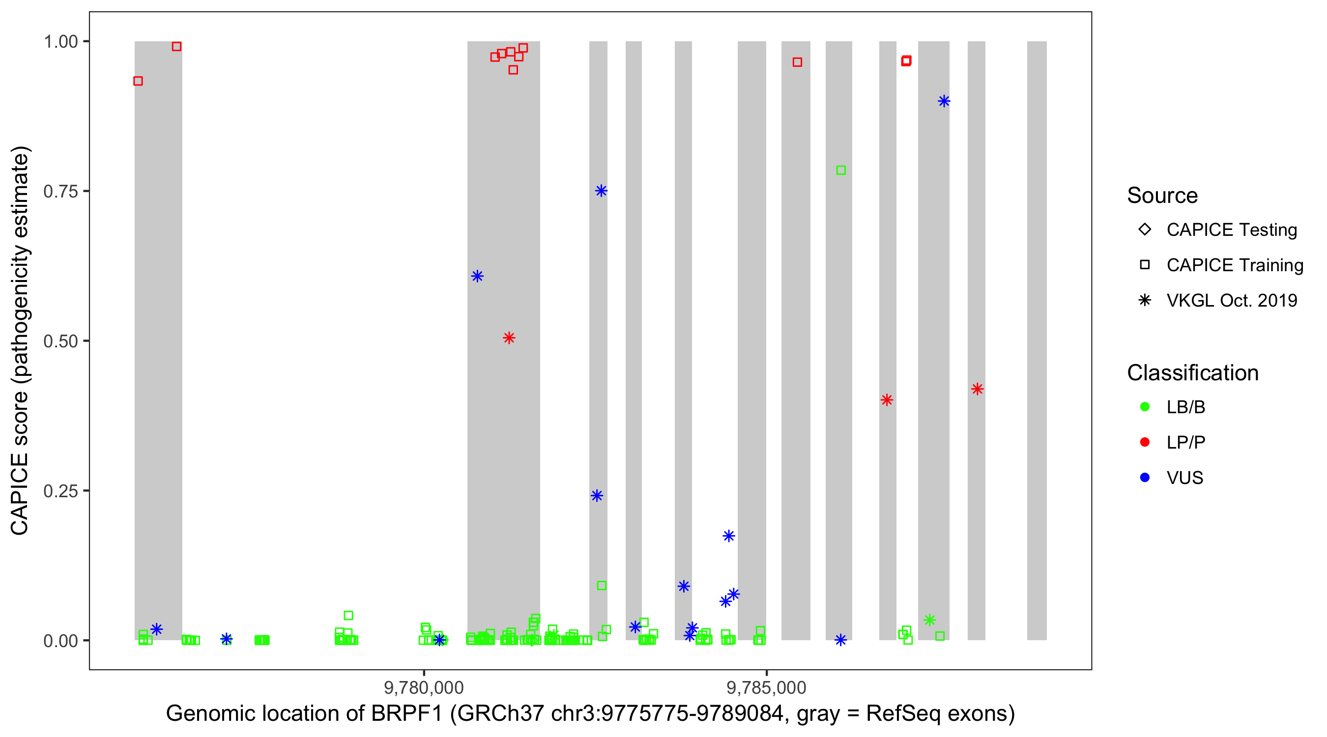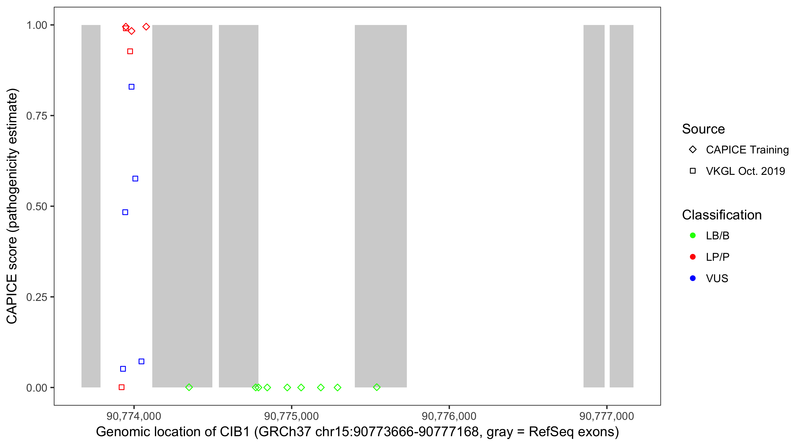 Shown are CAPICE train/test variants plus VKGL Oct 2019.