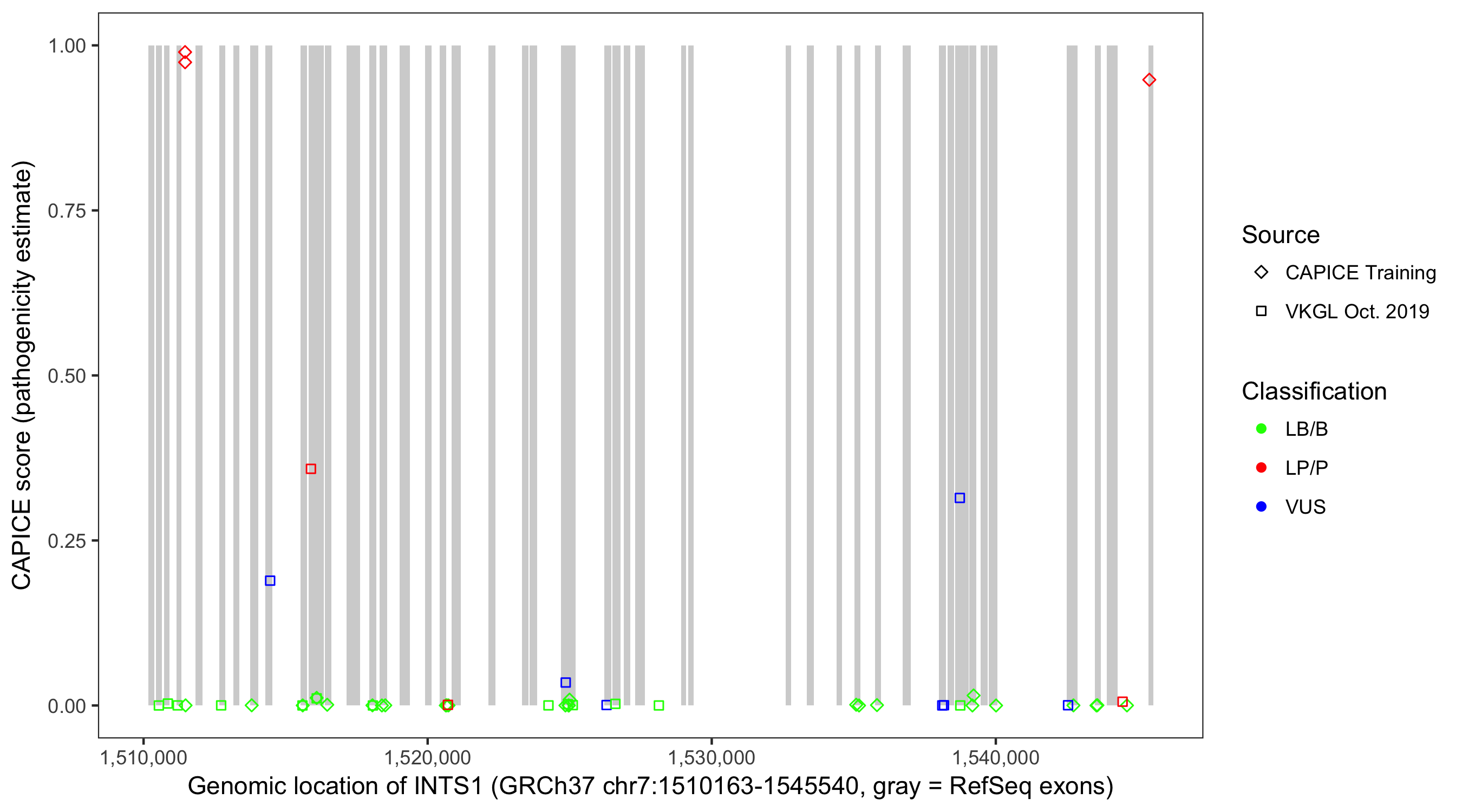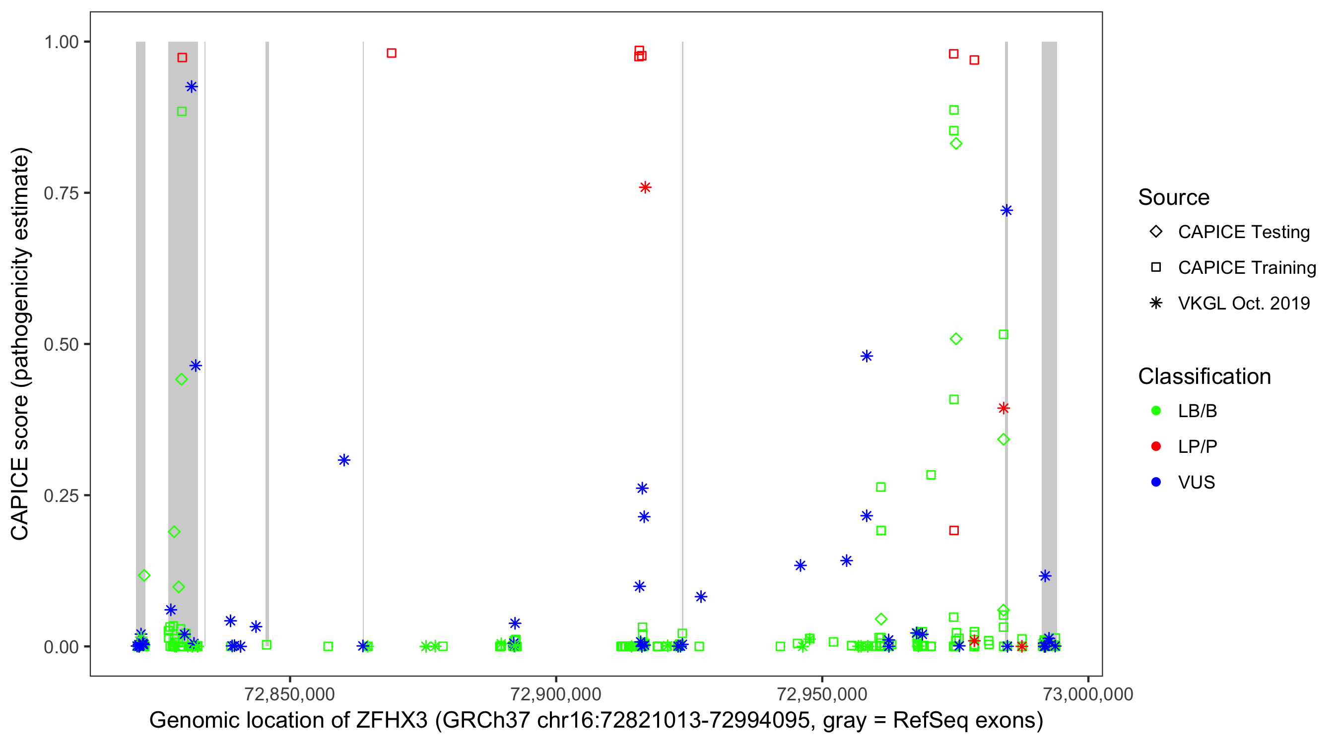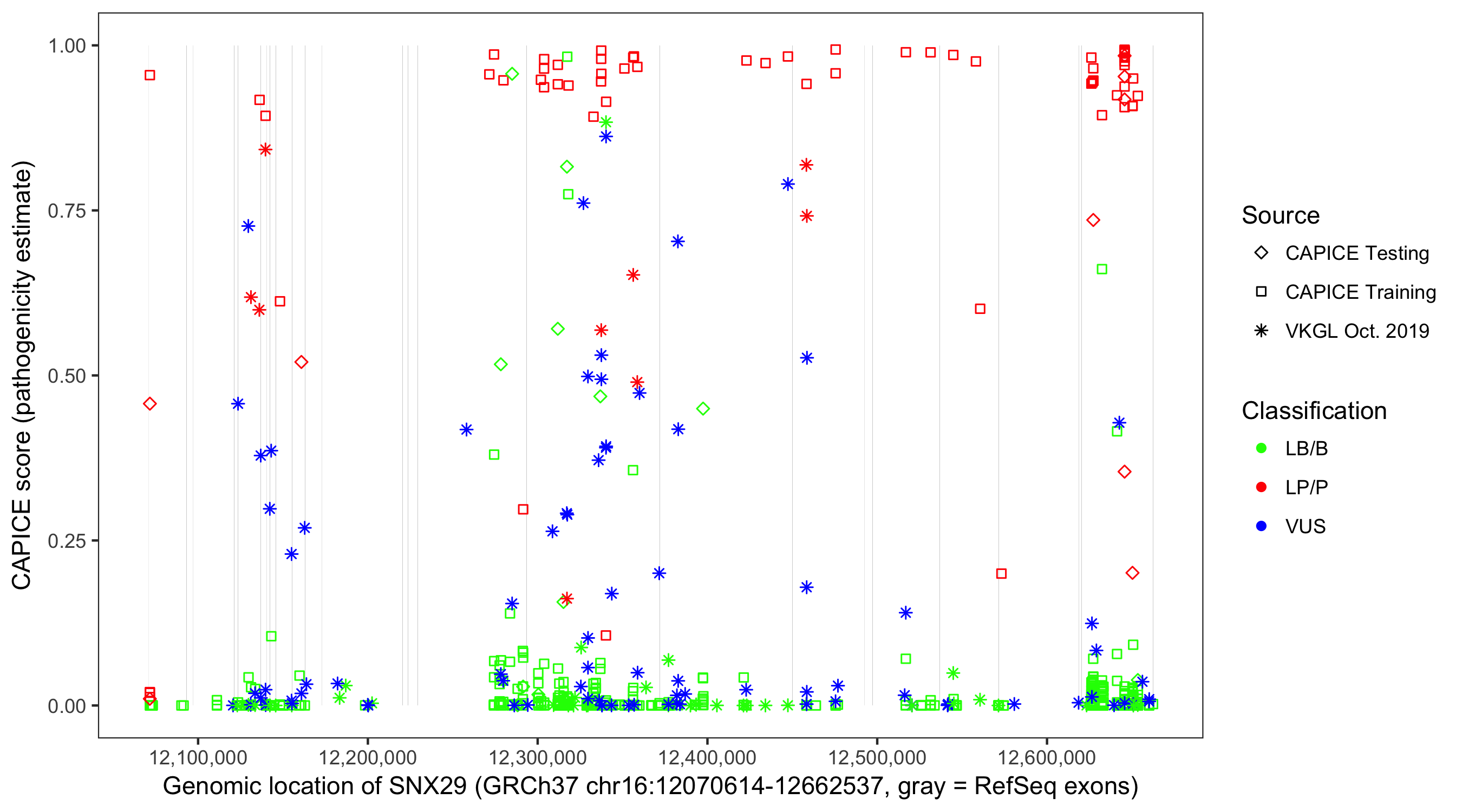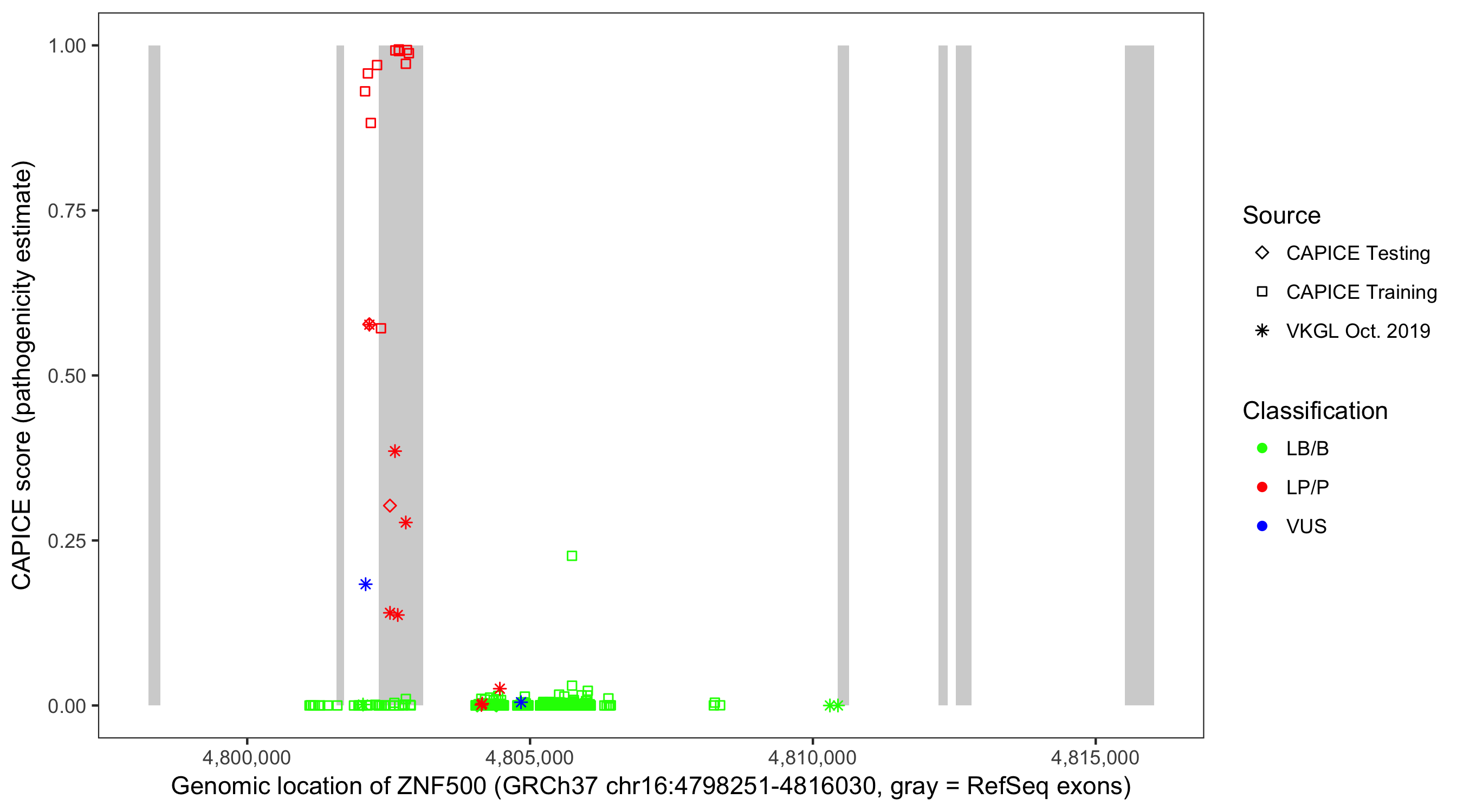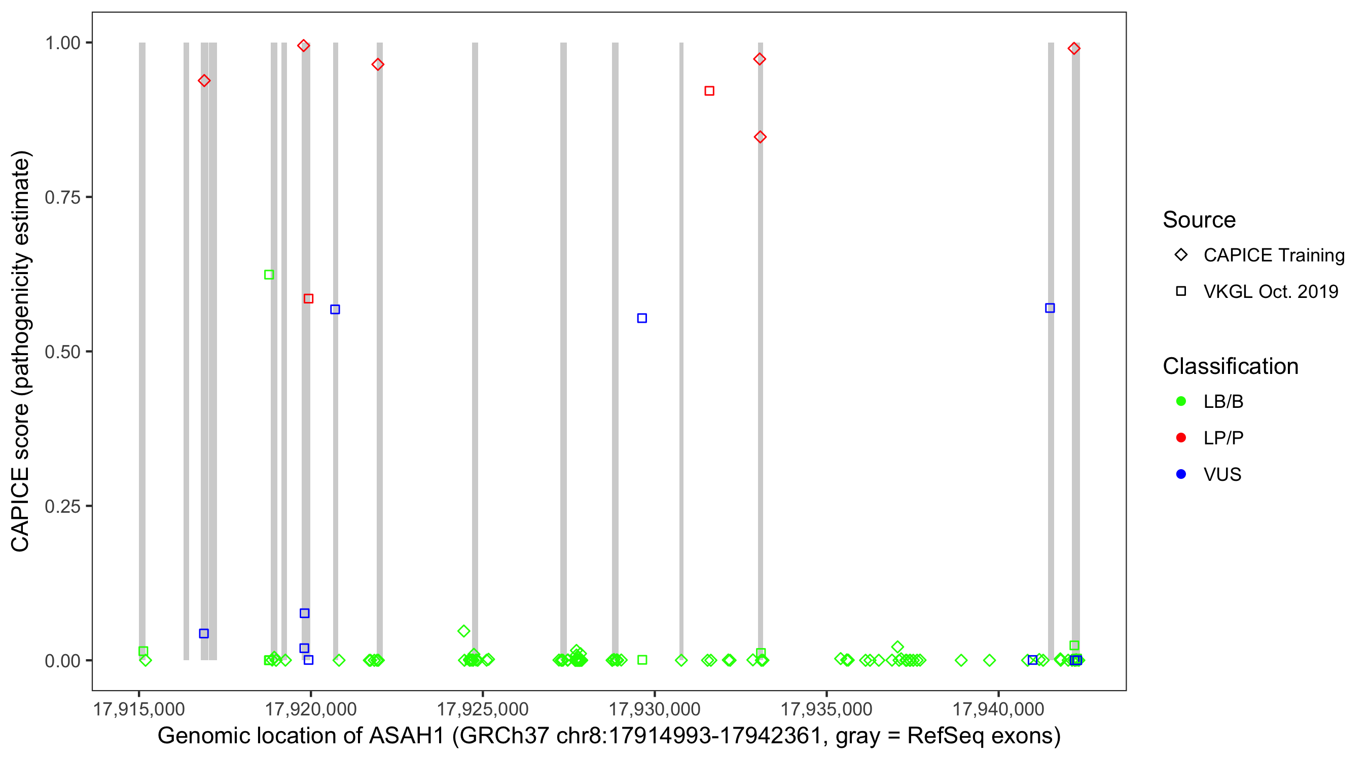 Shown are CAPICE train/test variants plus VKGL Oct 2019.