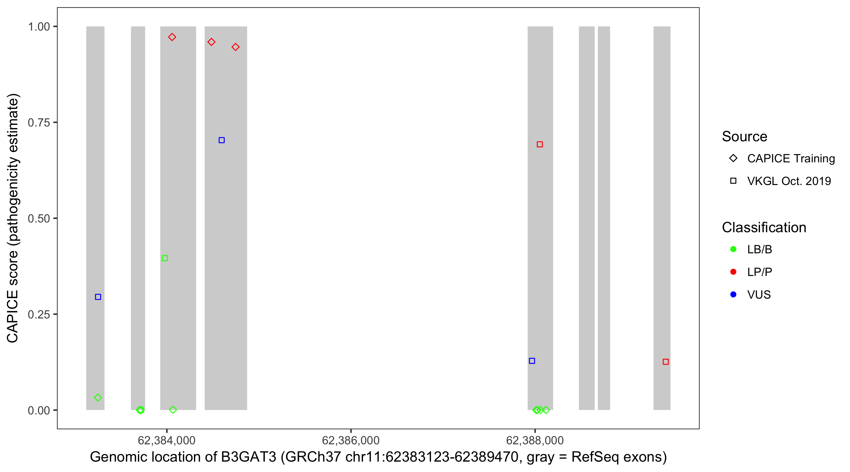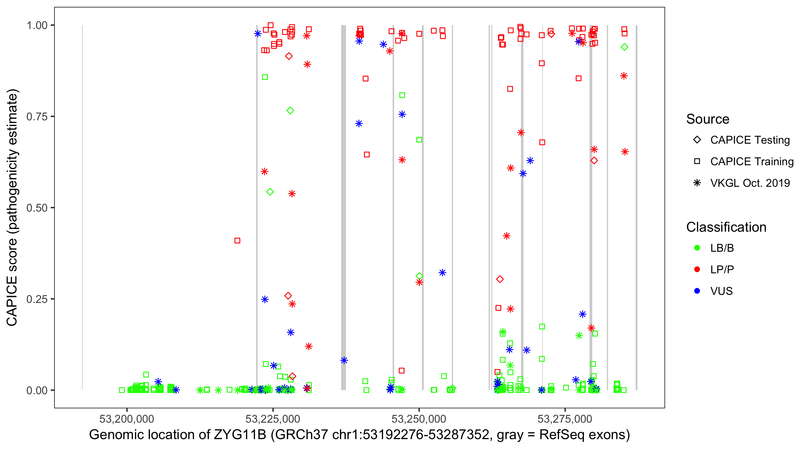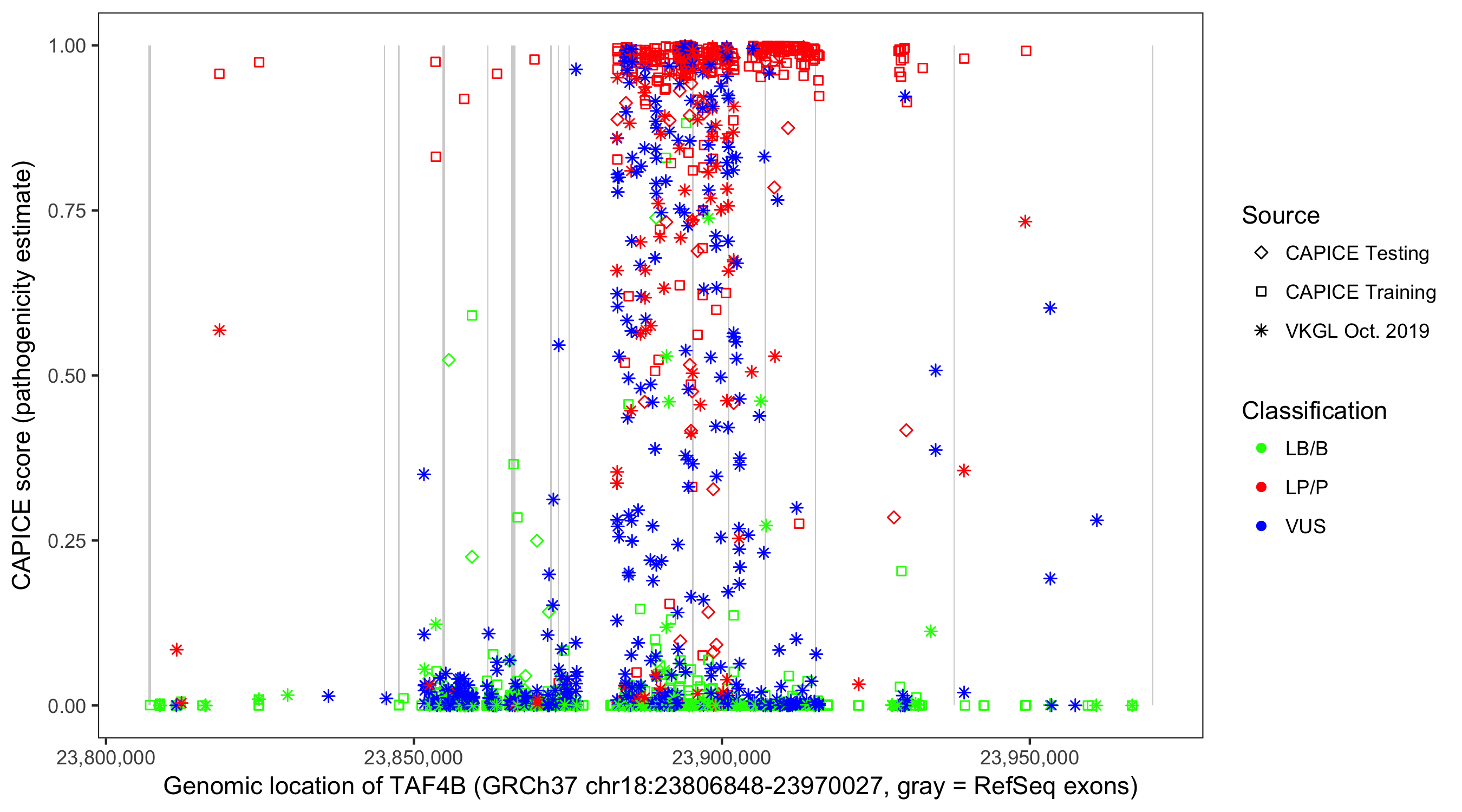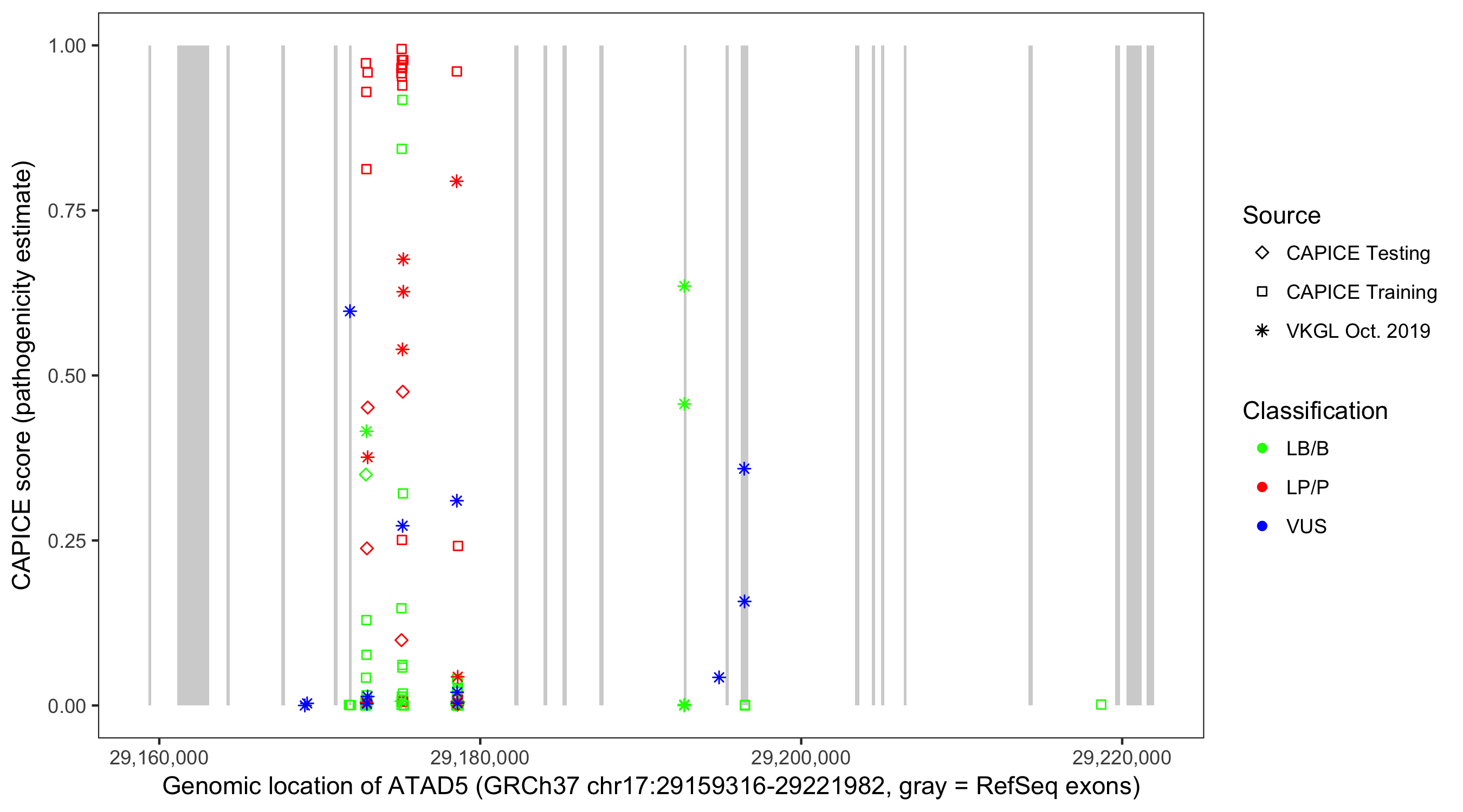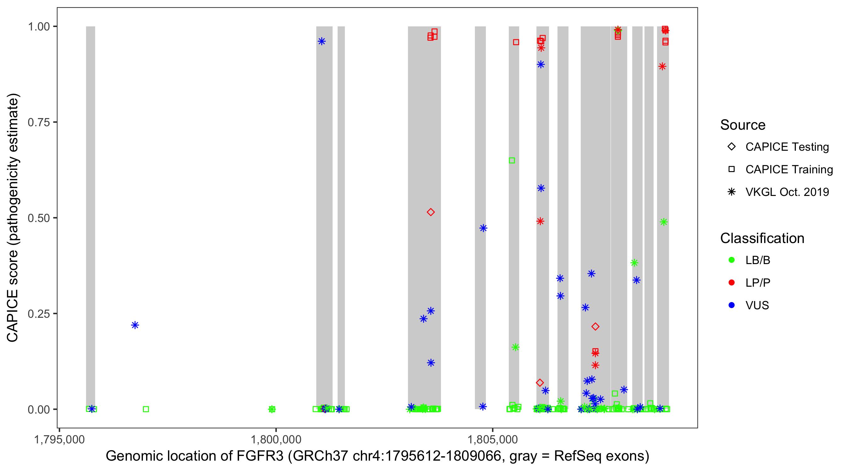 Shown are CAPICE train/test variants plus VKGL Oct 2019.