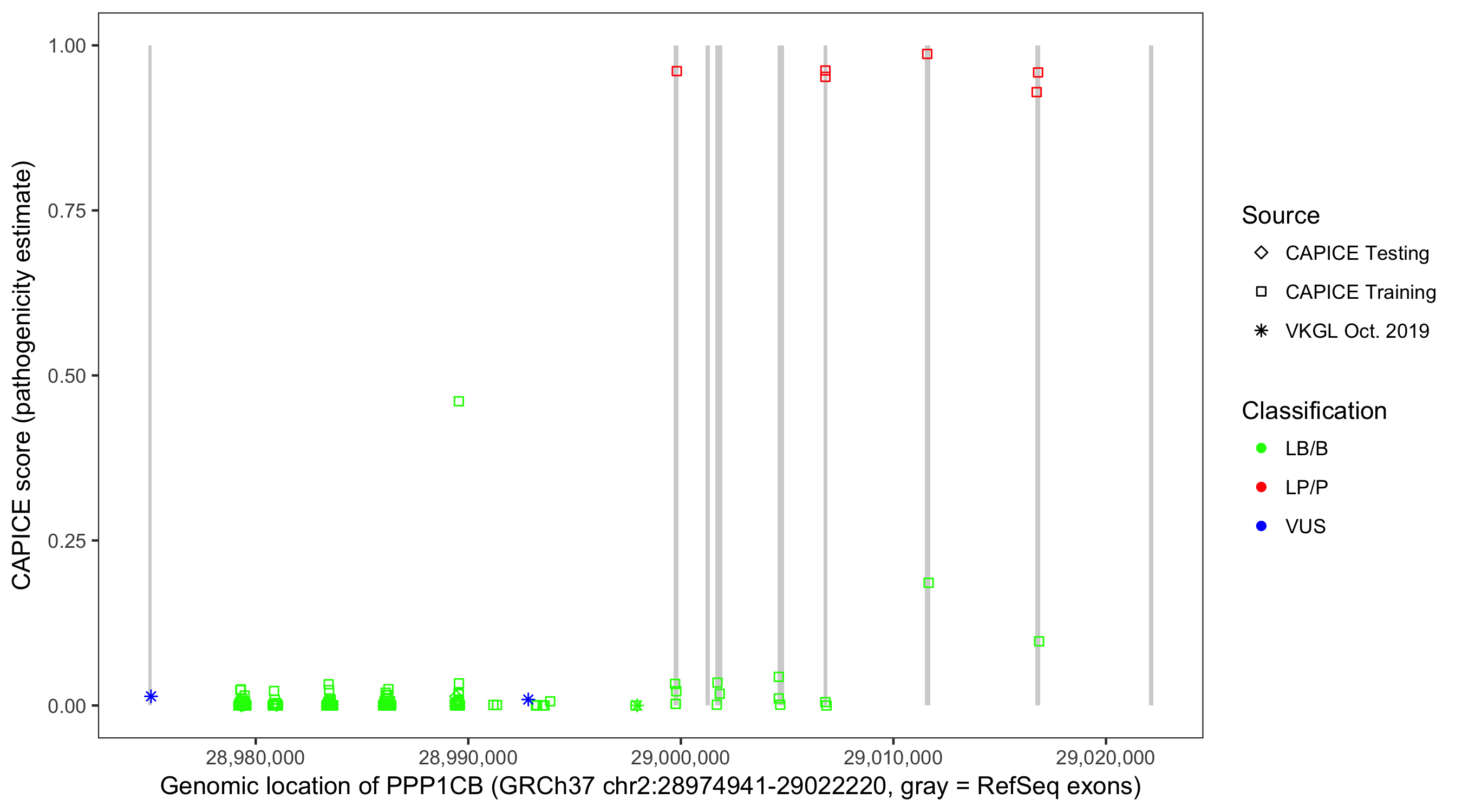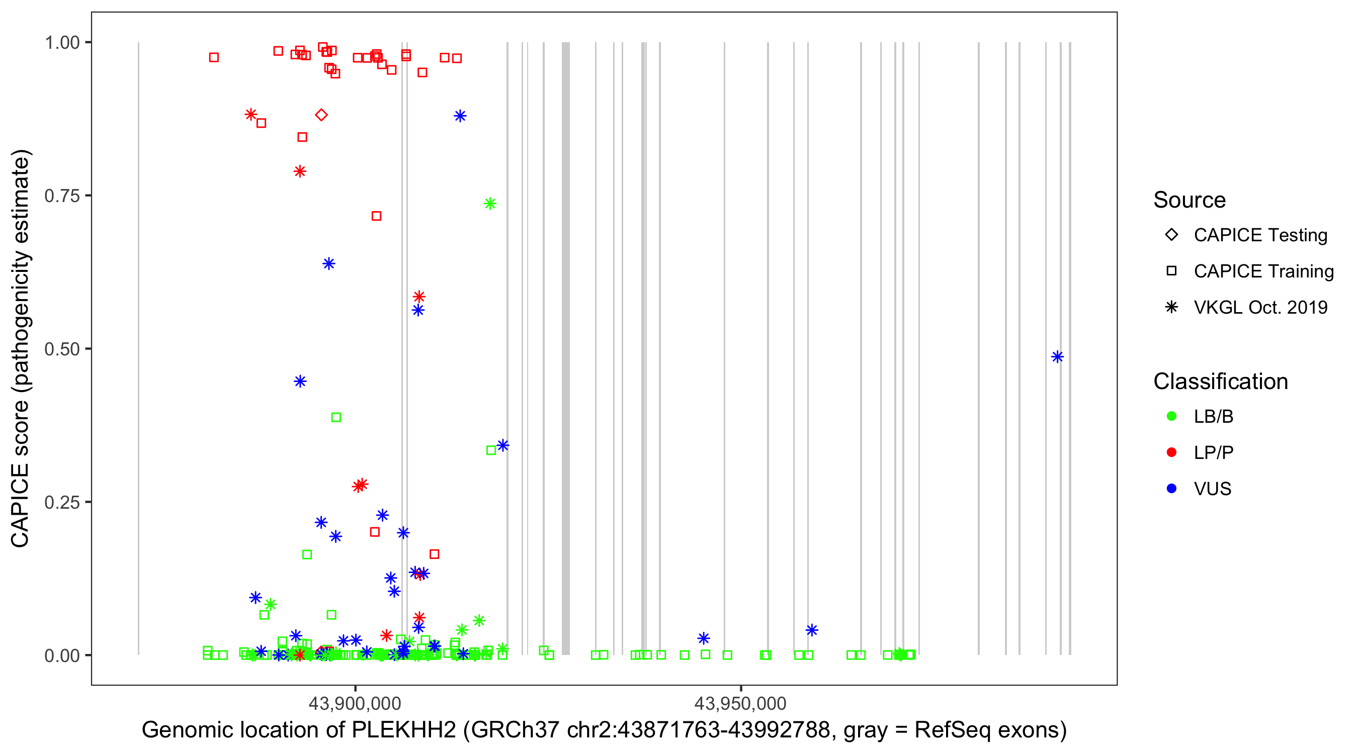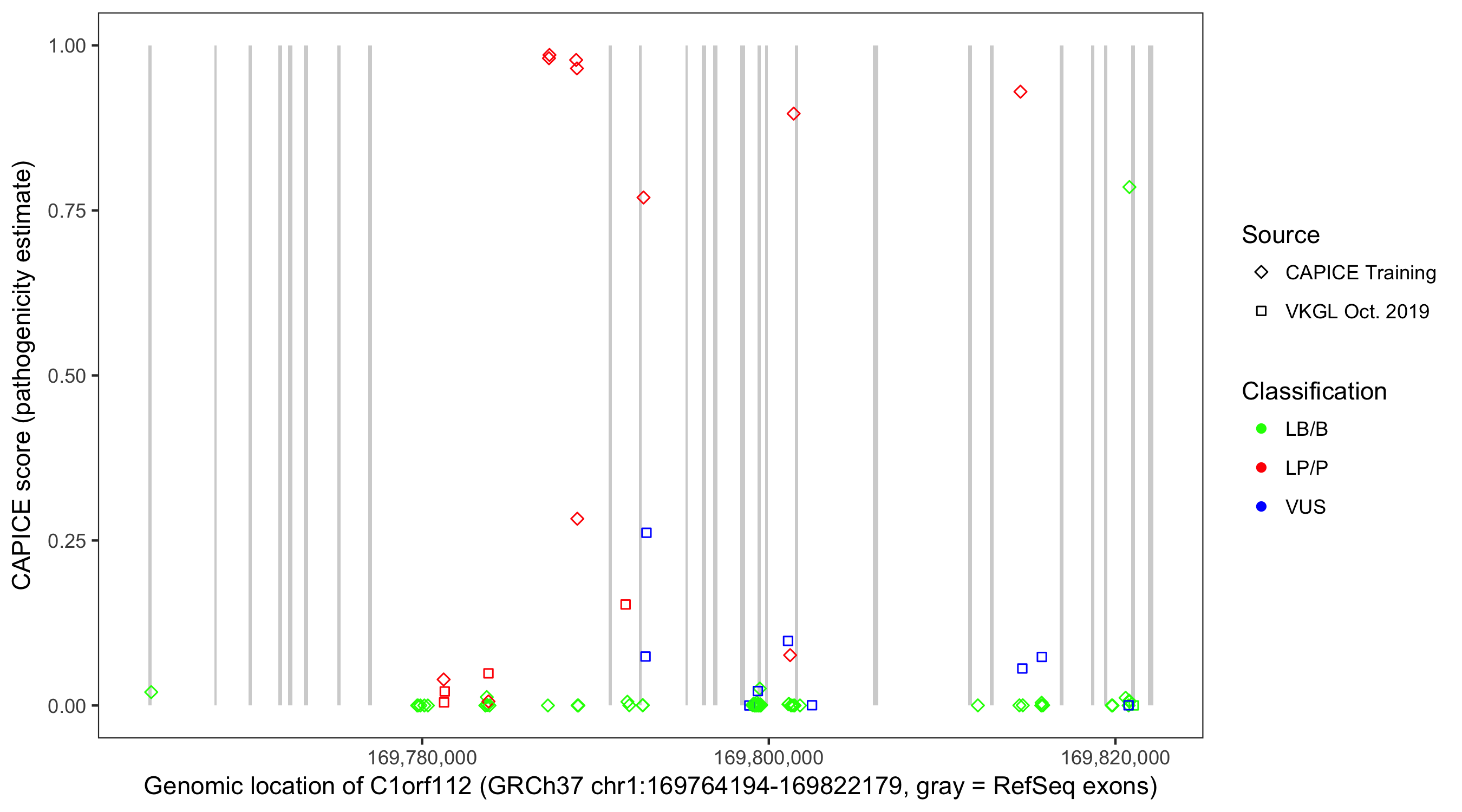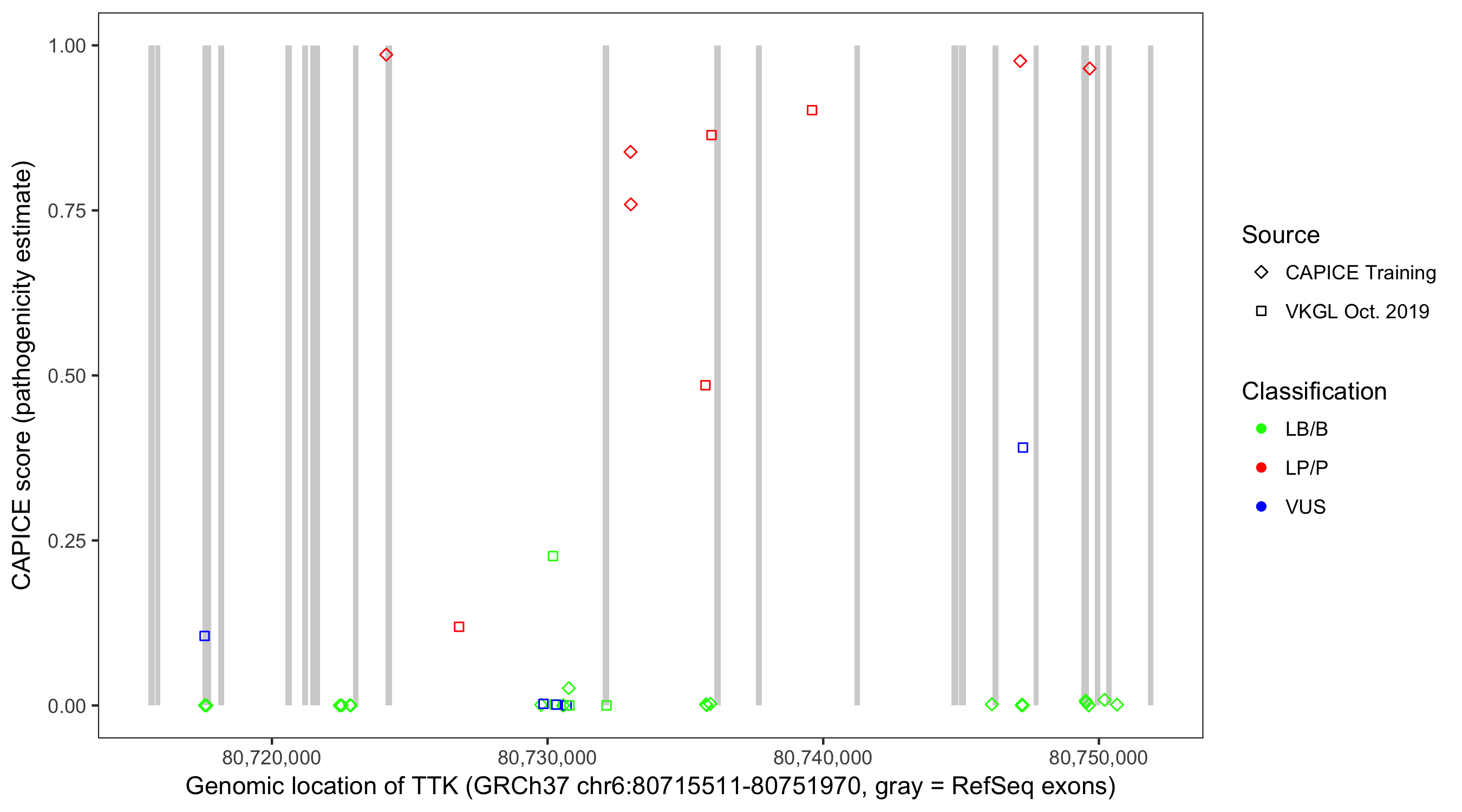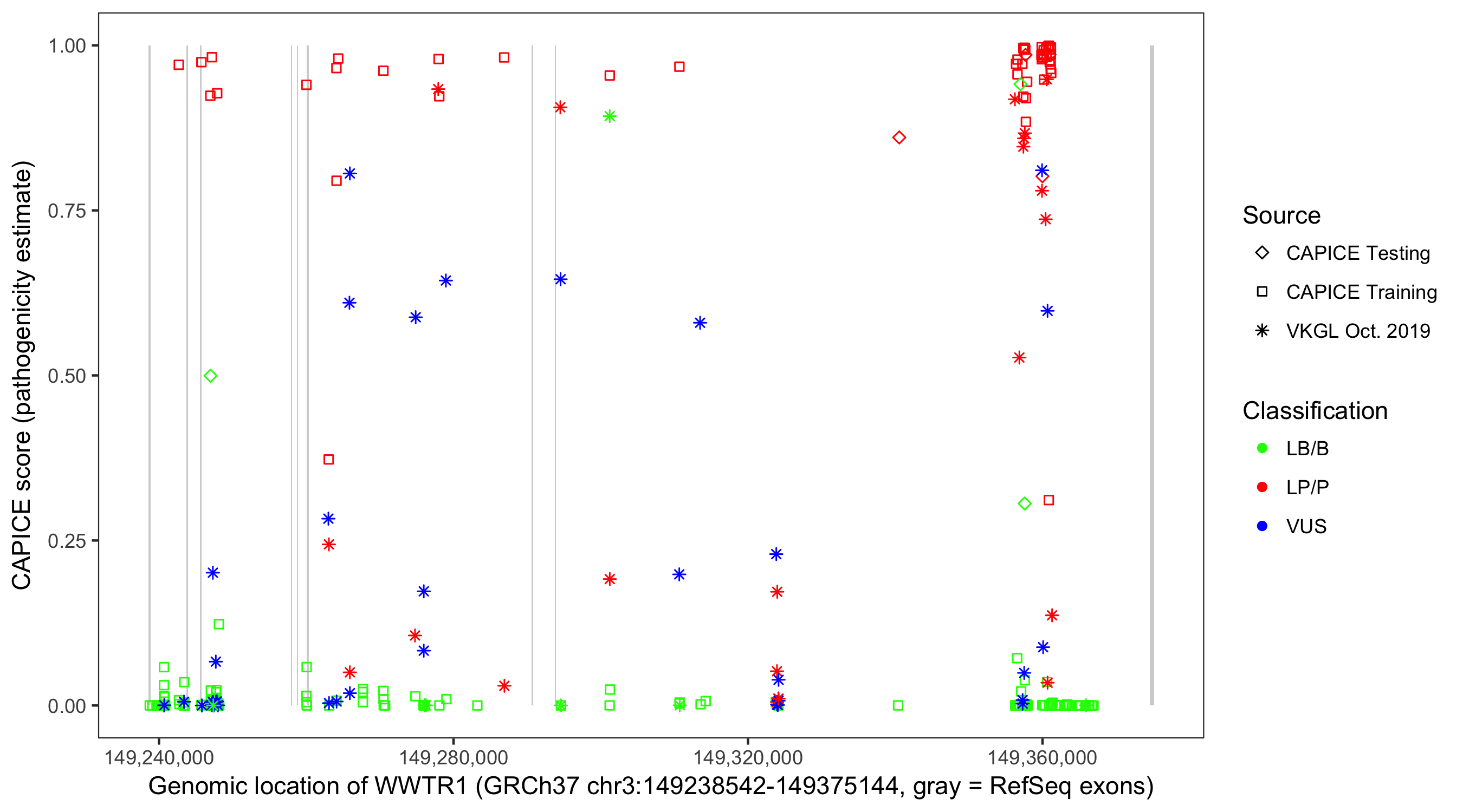 Shown are CAPICE train/test variants plus VKGL Oct 2019.