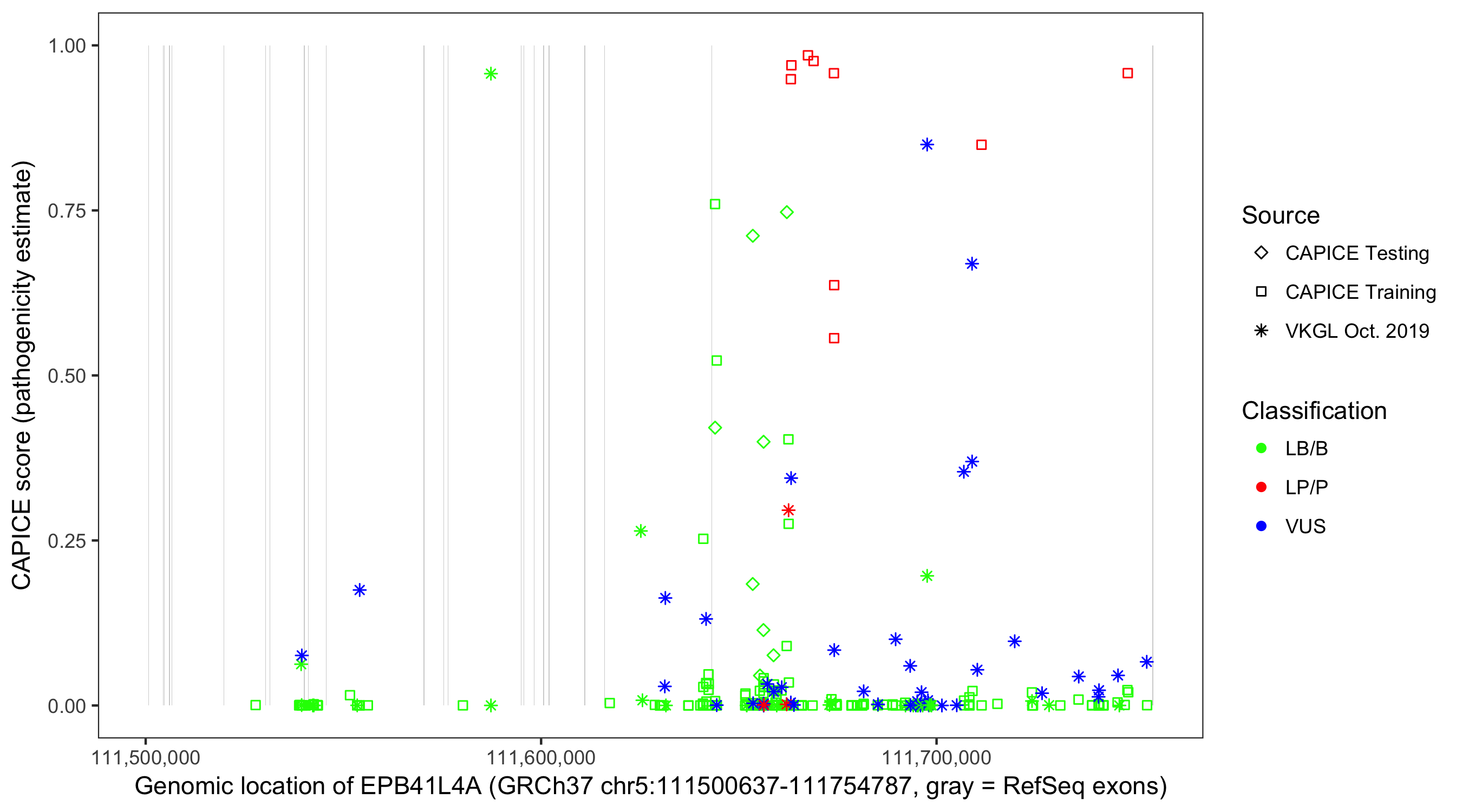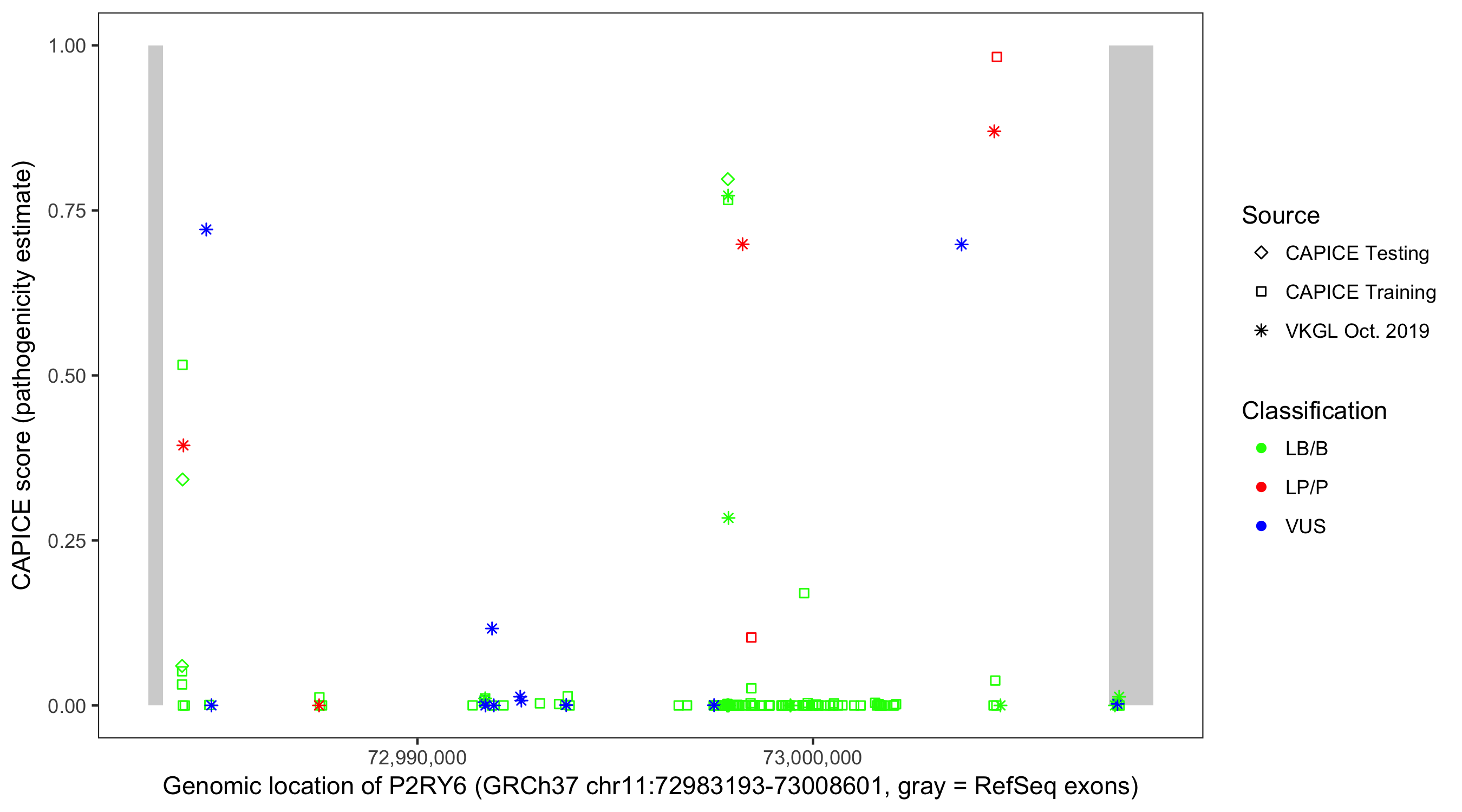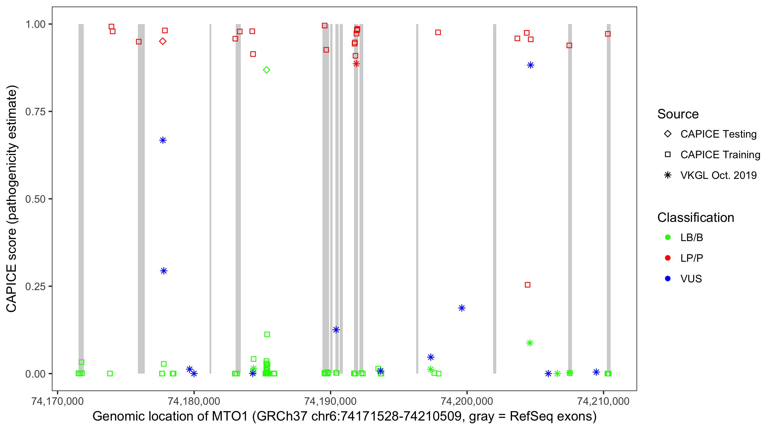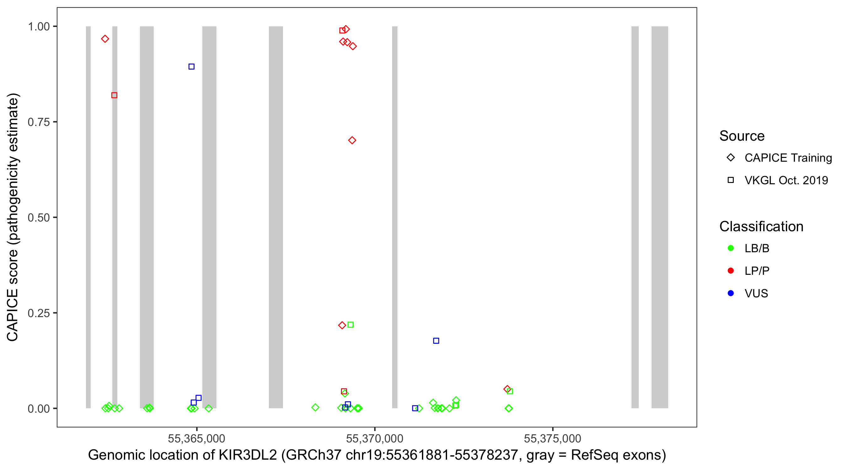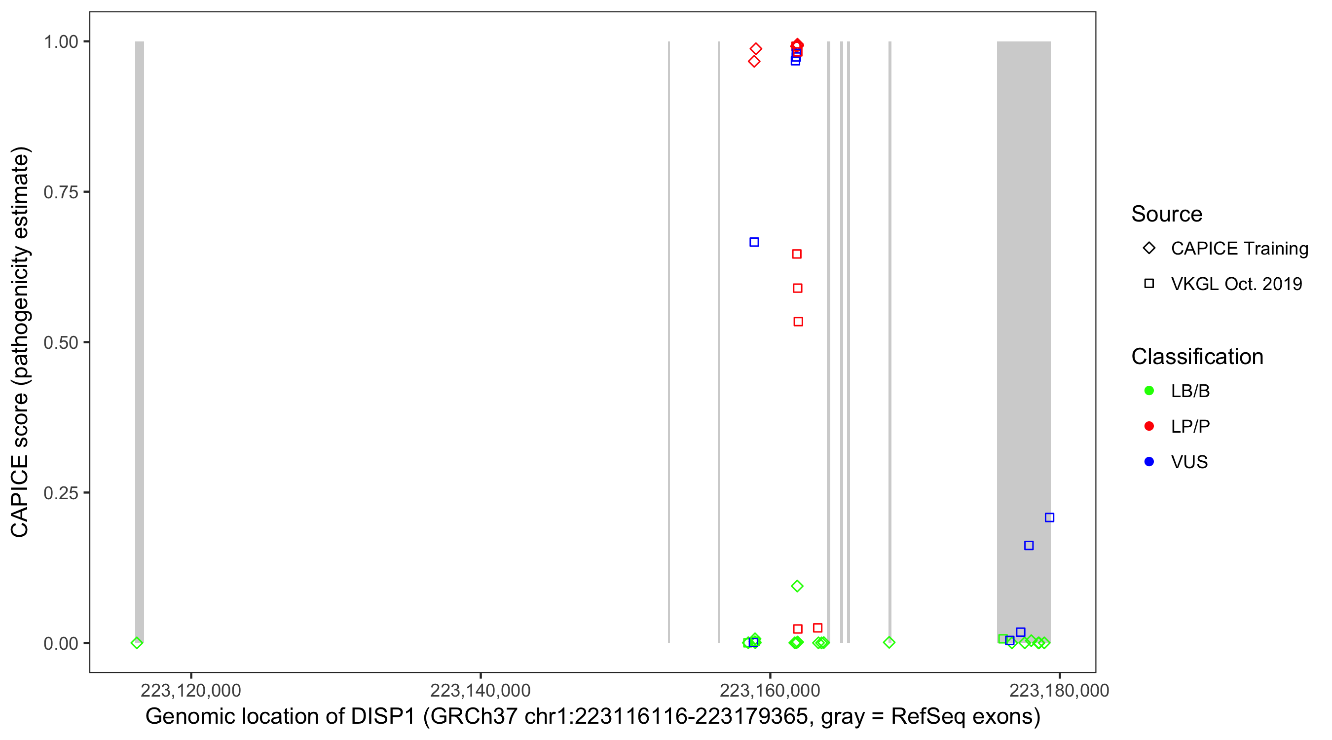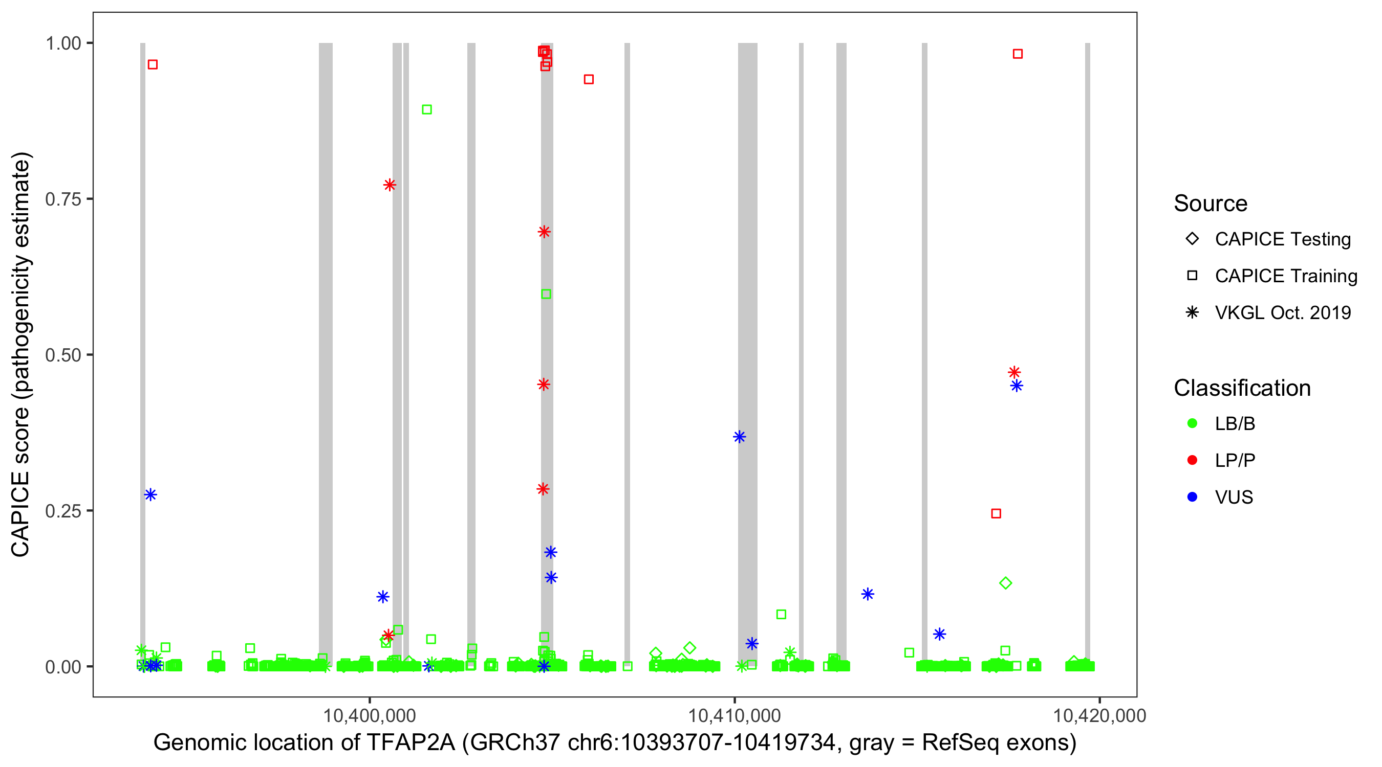 Shown are CAPICE train/test variants plus VKGL Oct 2019.