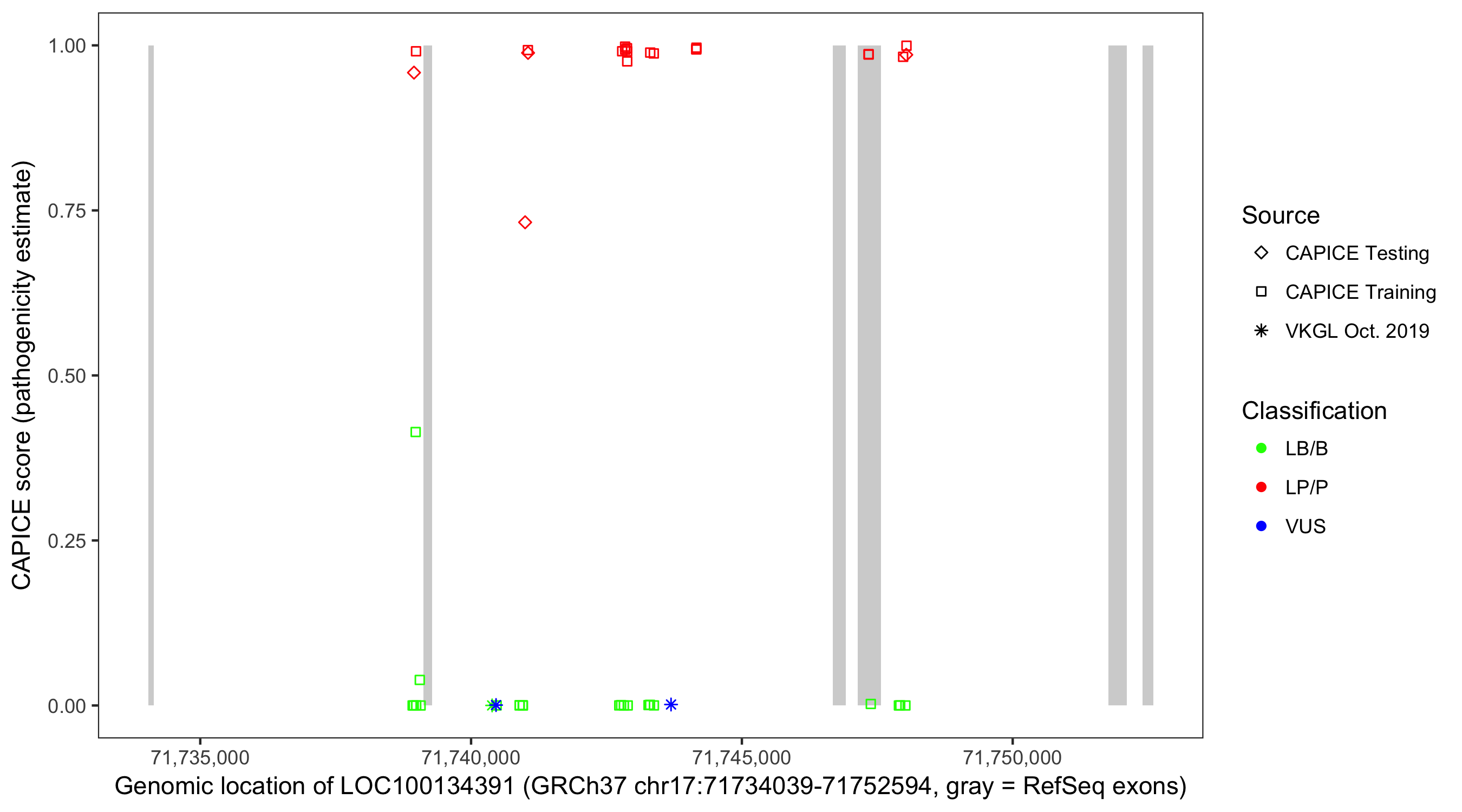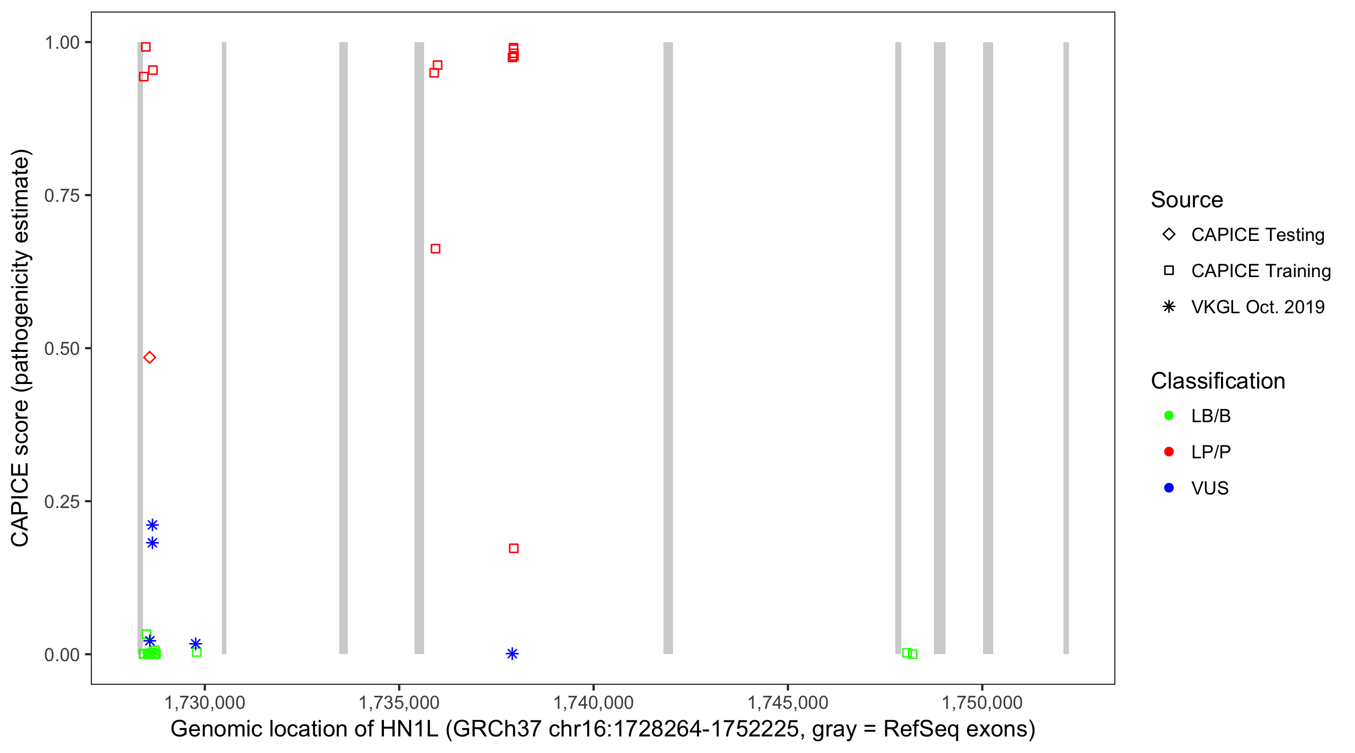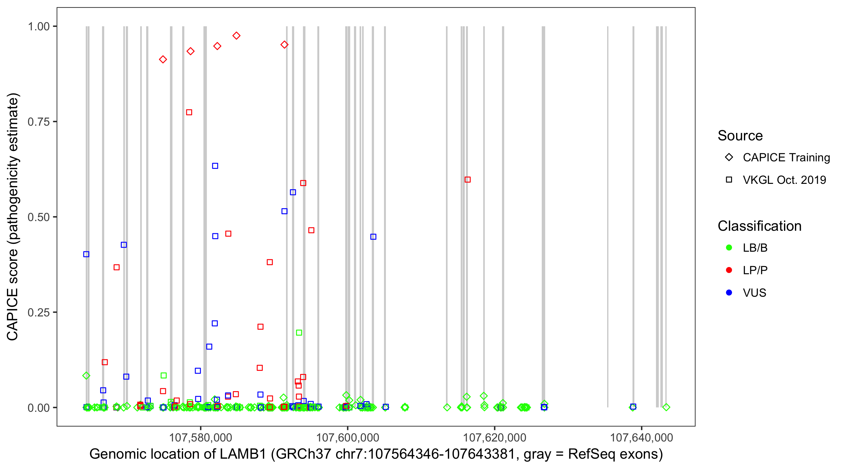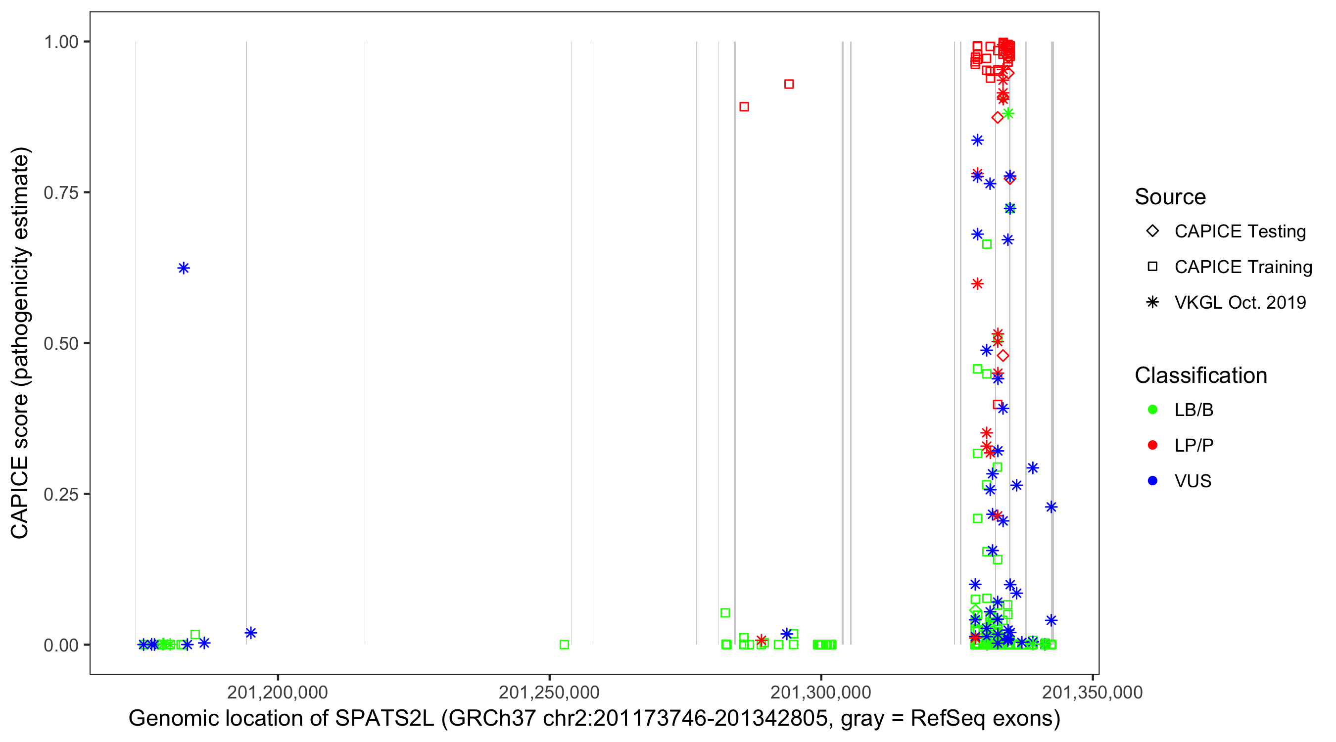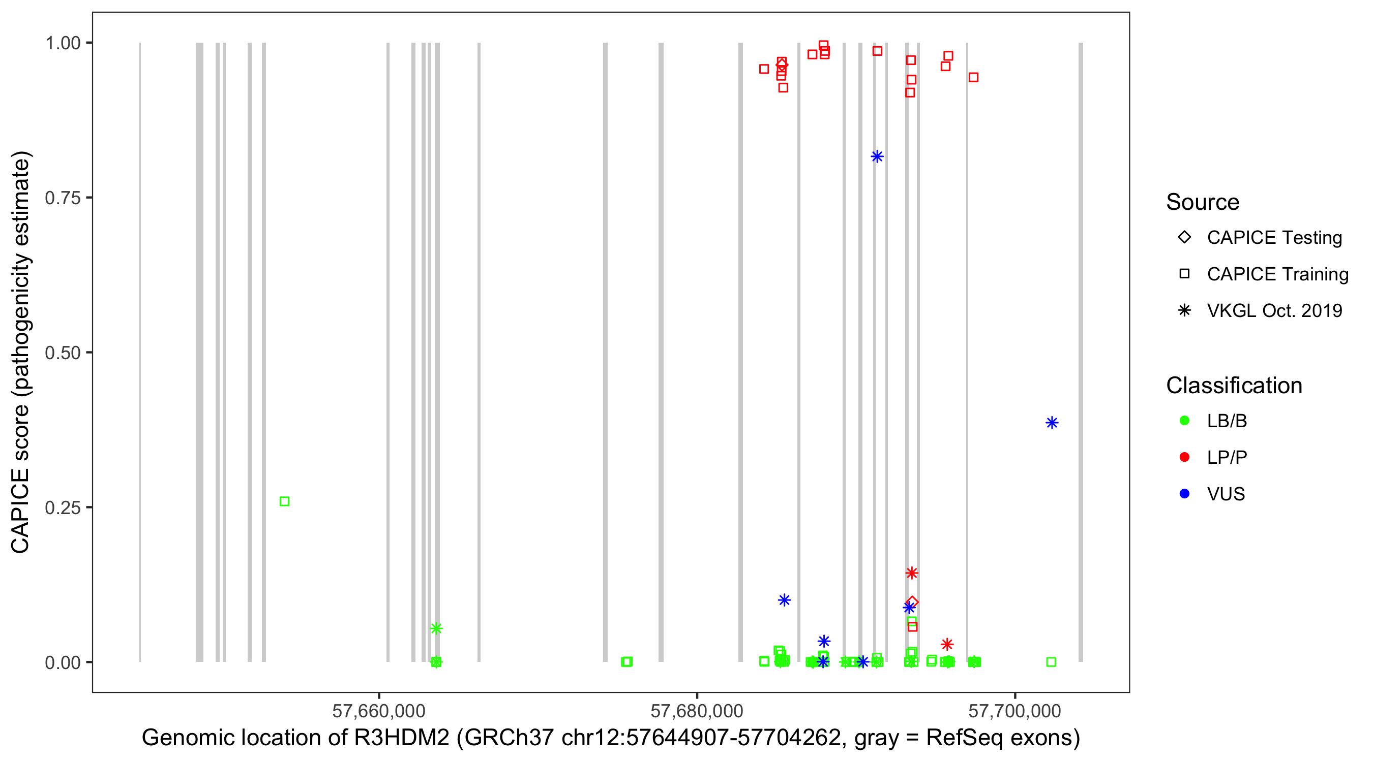 Shown are CAPICE train/test variants plus VKGL Oct 2019.