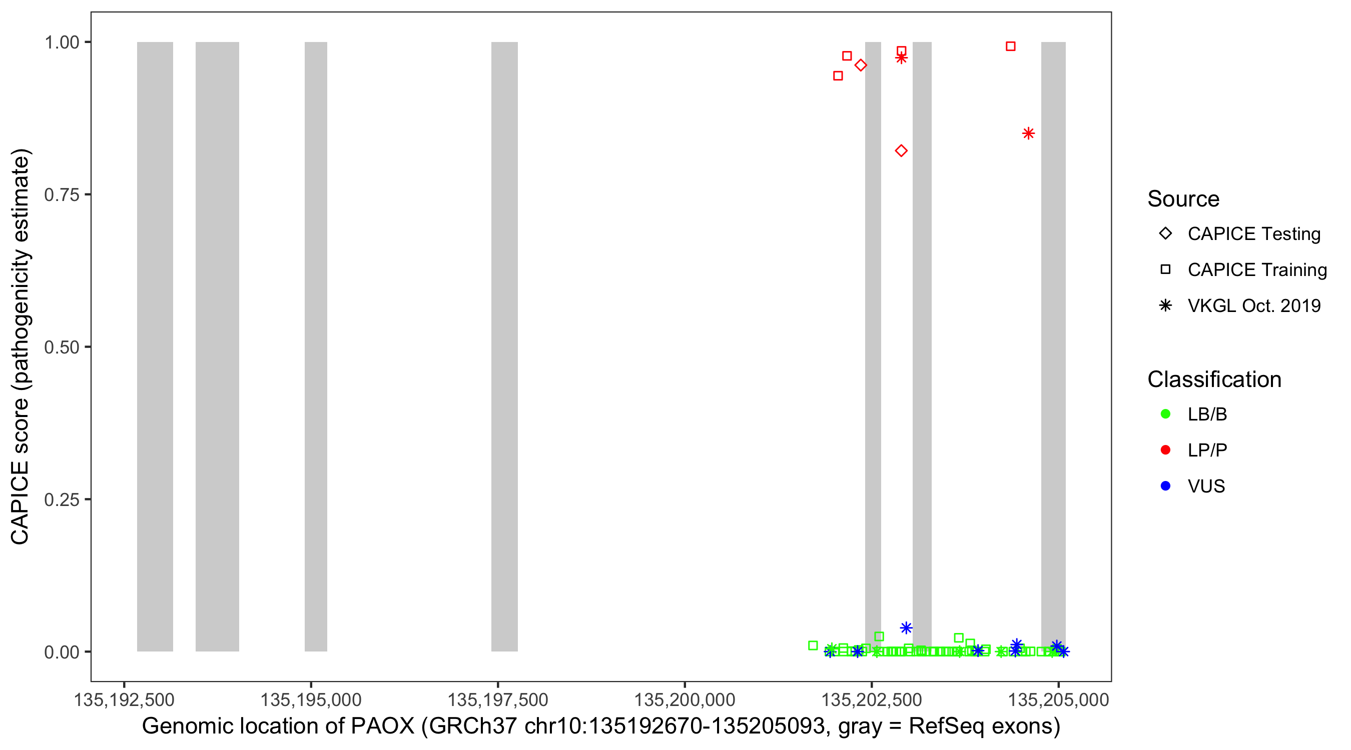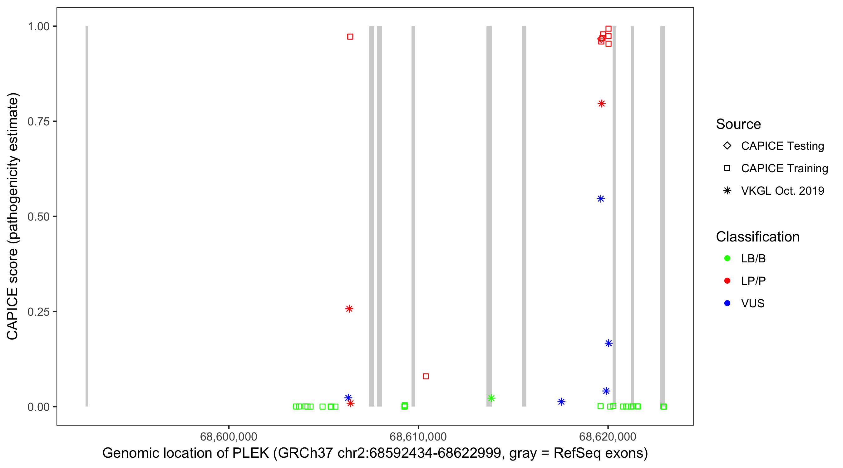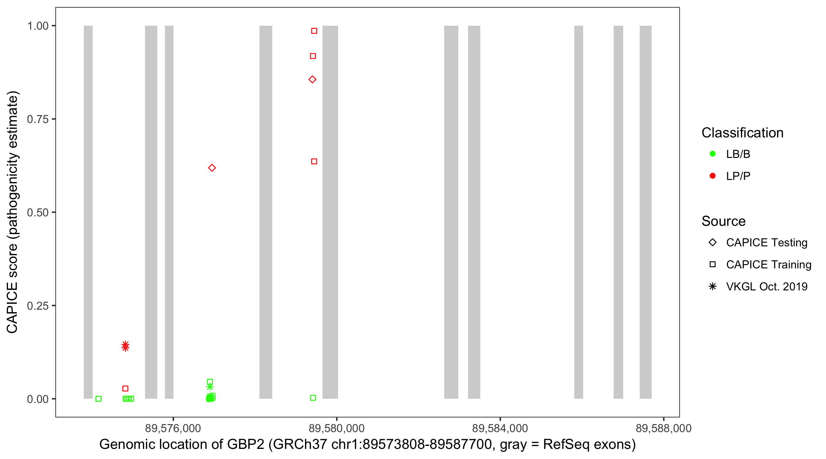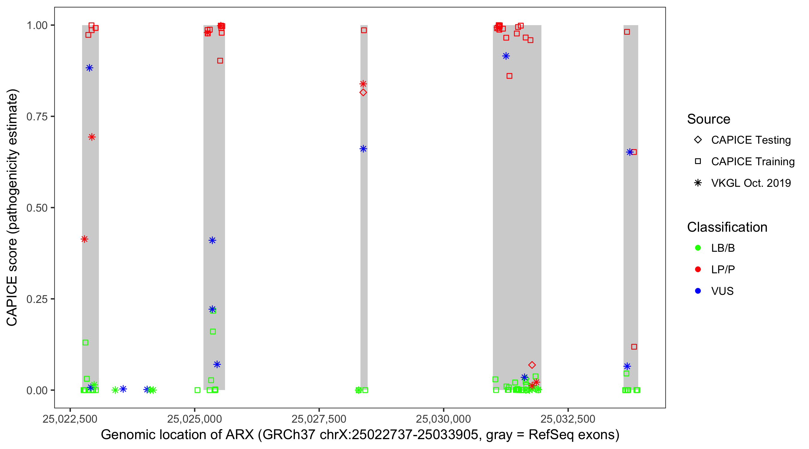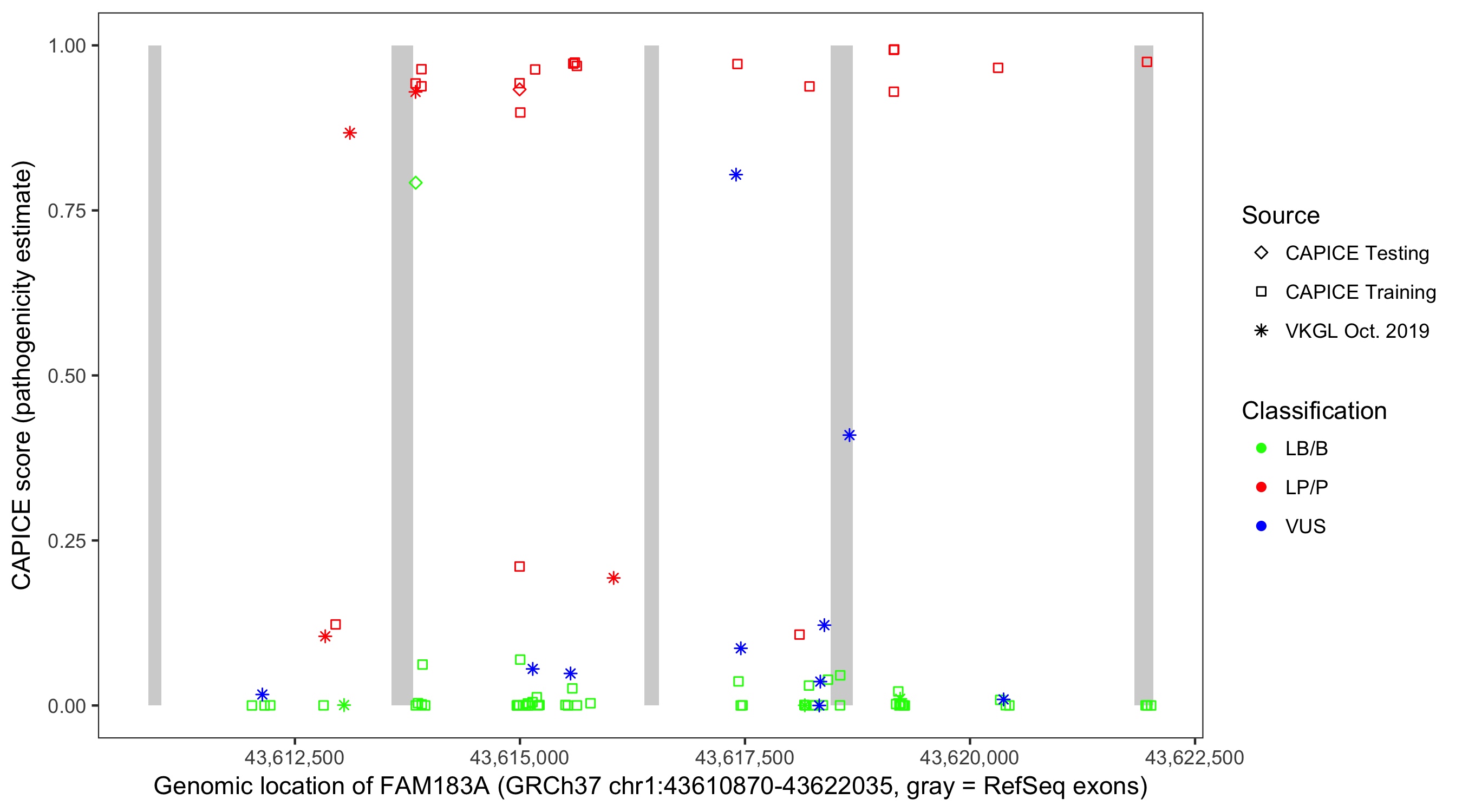 Shown are CAPICE train/test variants plus VKGL Oct 2019.