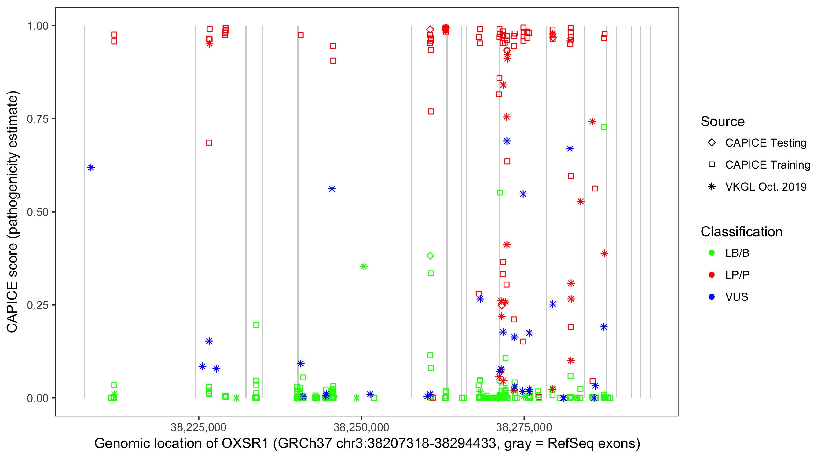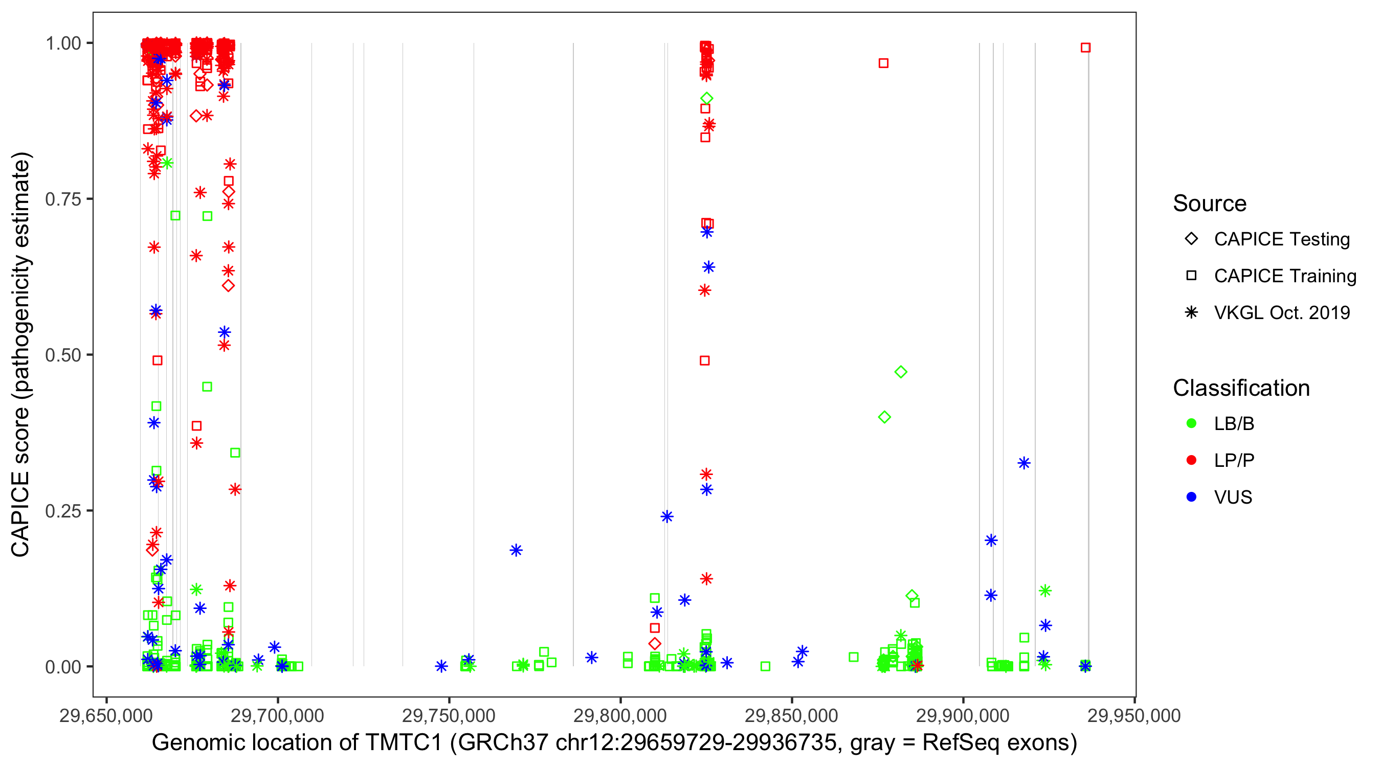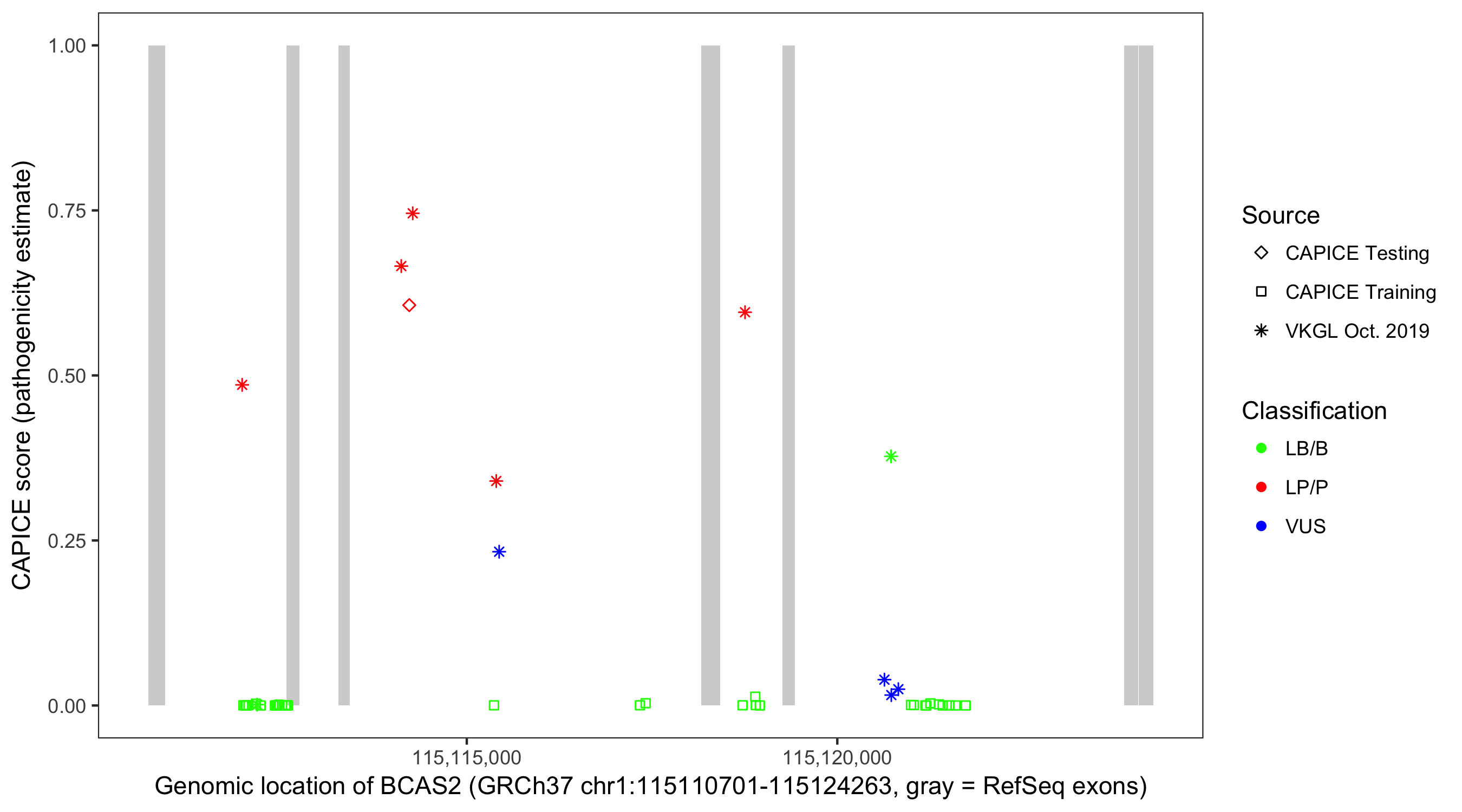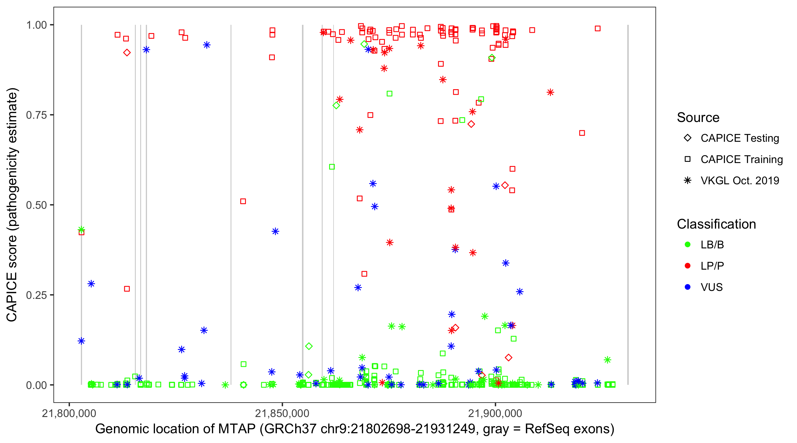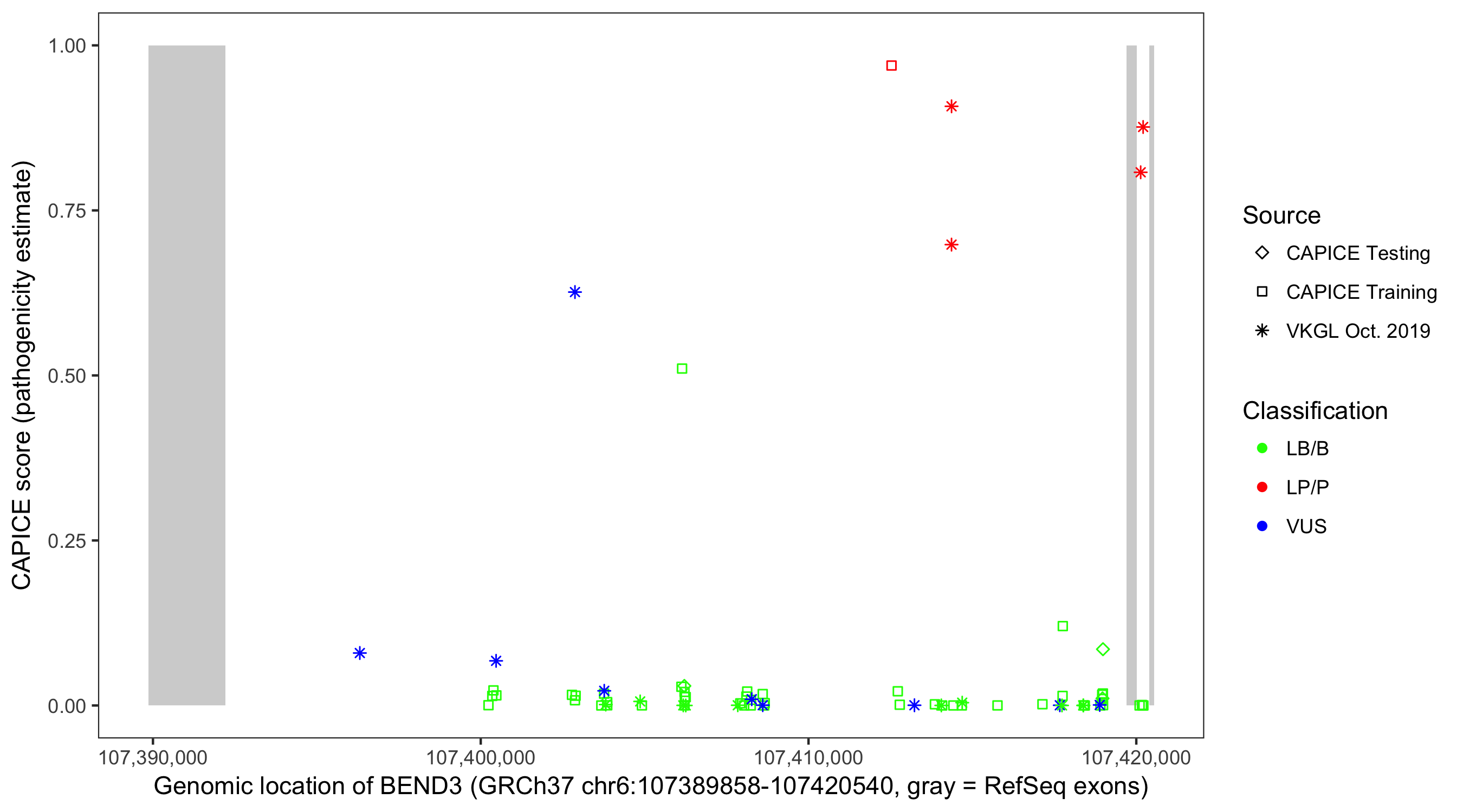 Shown are CAPICE train/test variants plus VKGL Oct 2019.