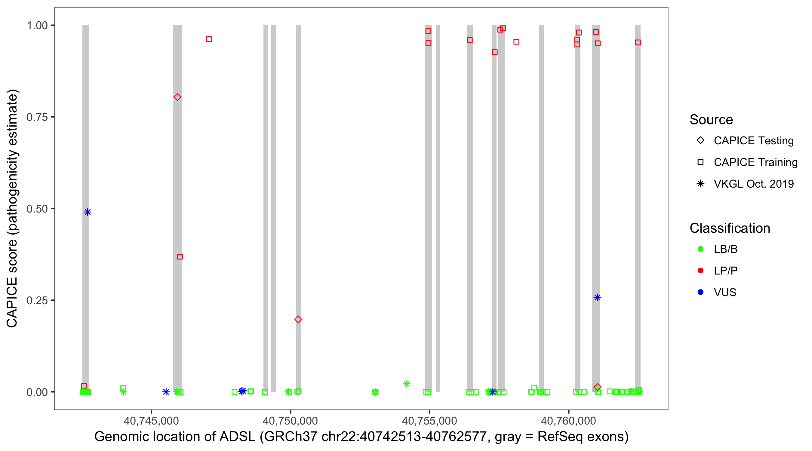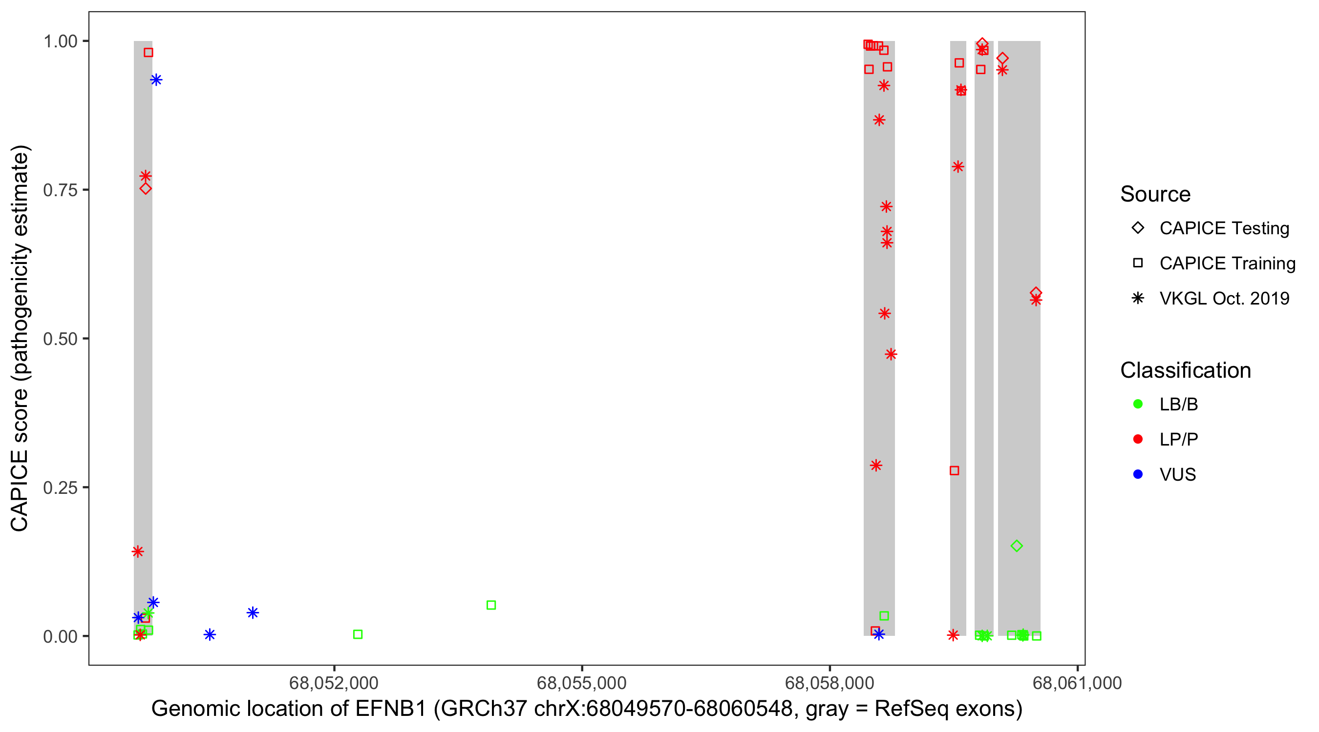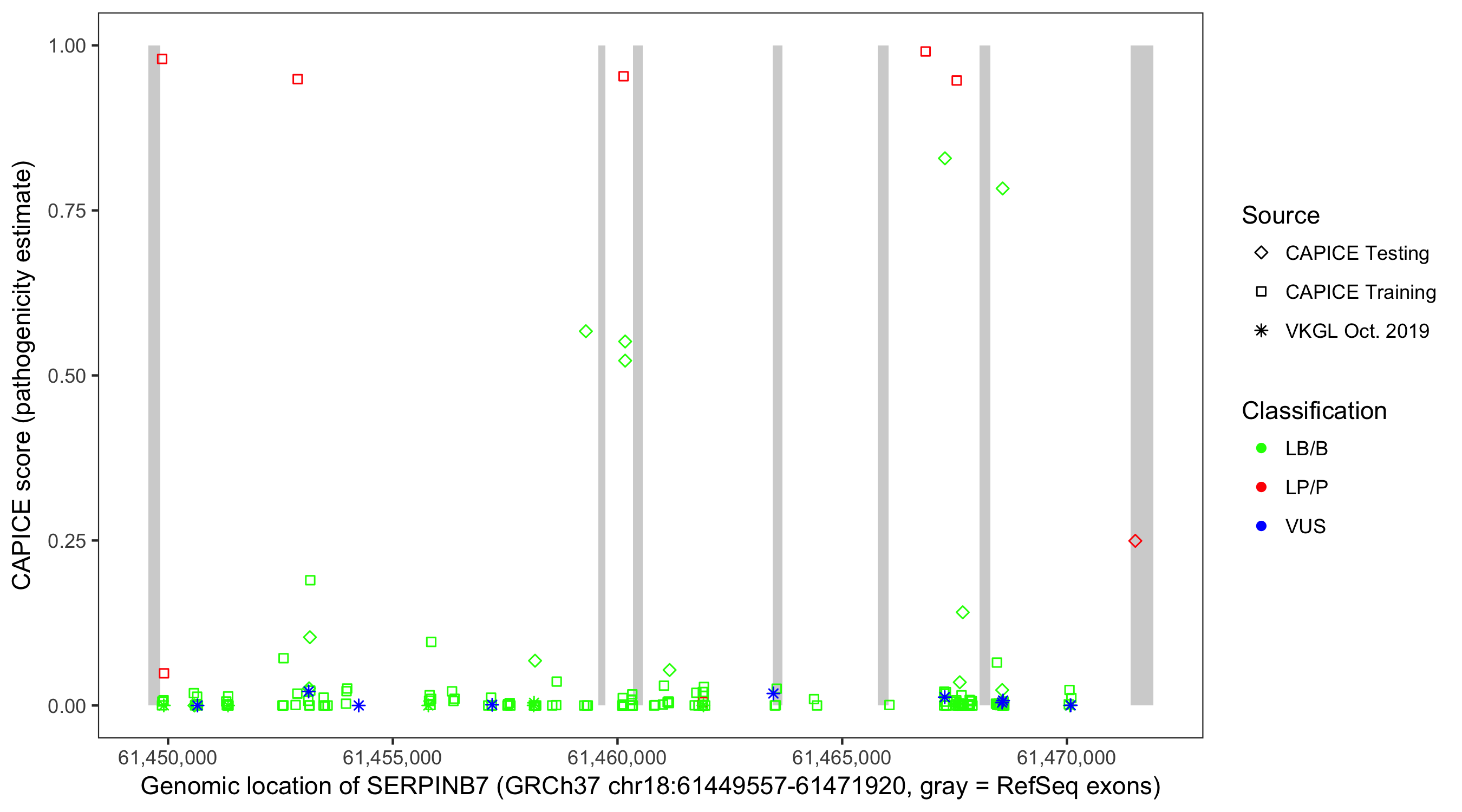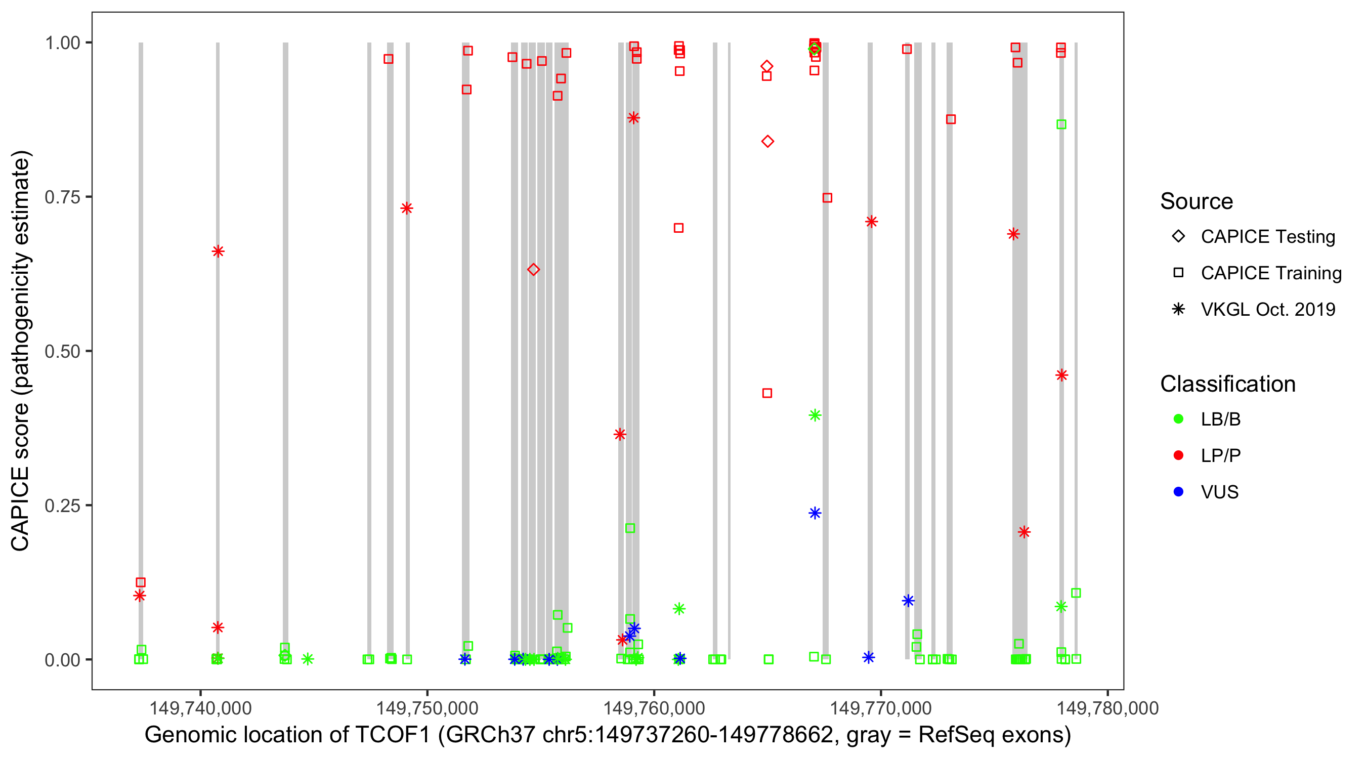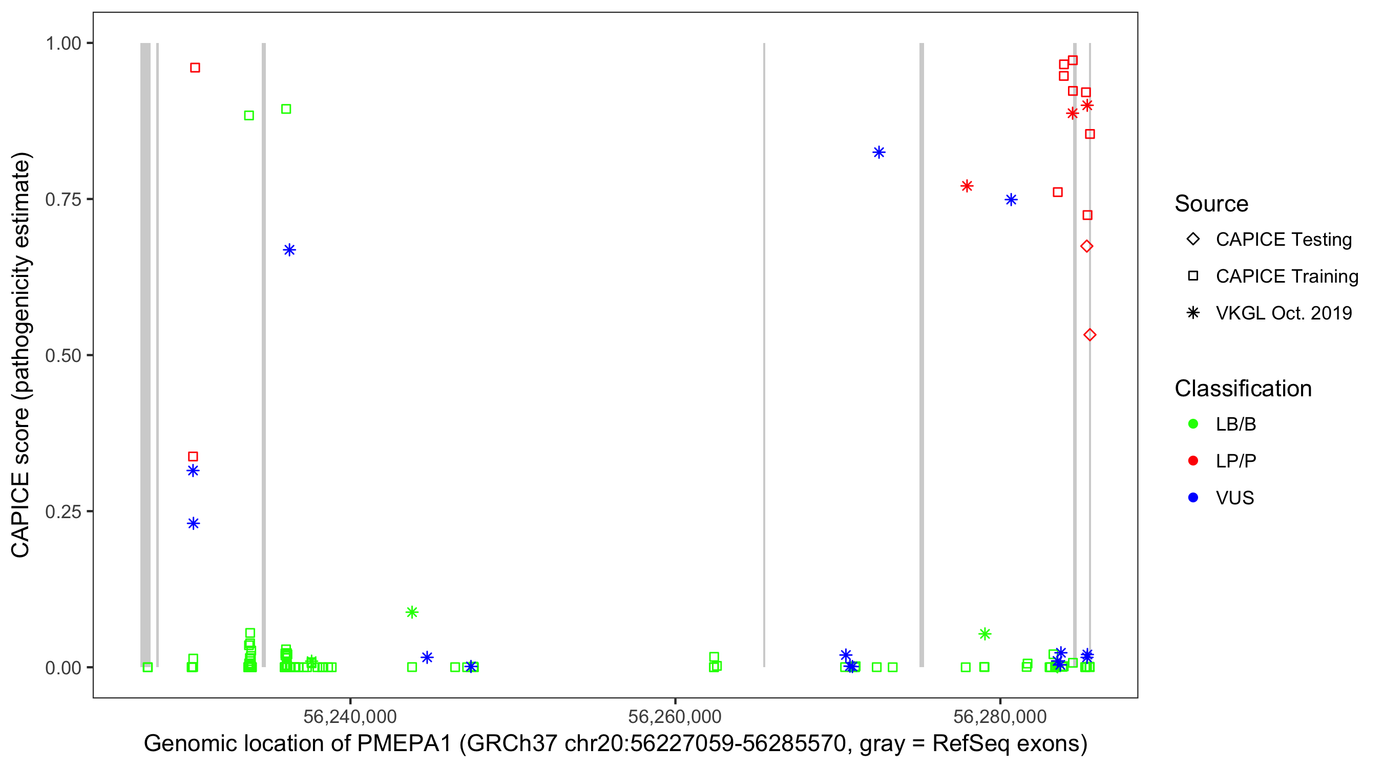 Shown are CAPICE train/test variants plus VKGL Oct 2019.