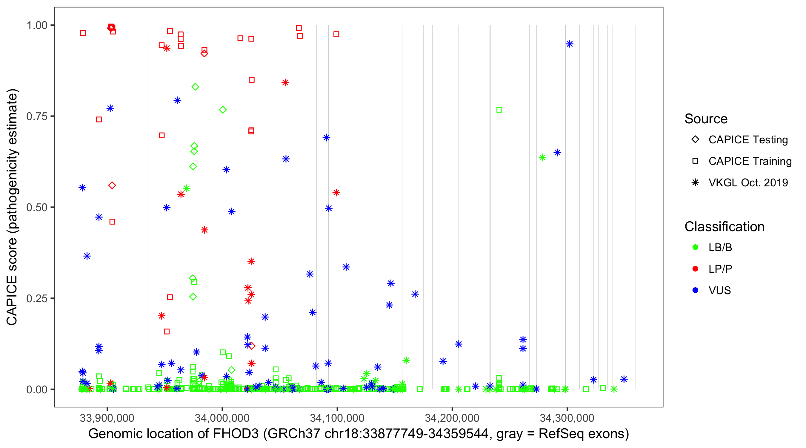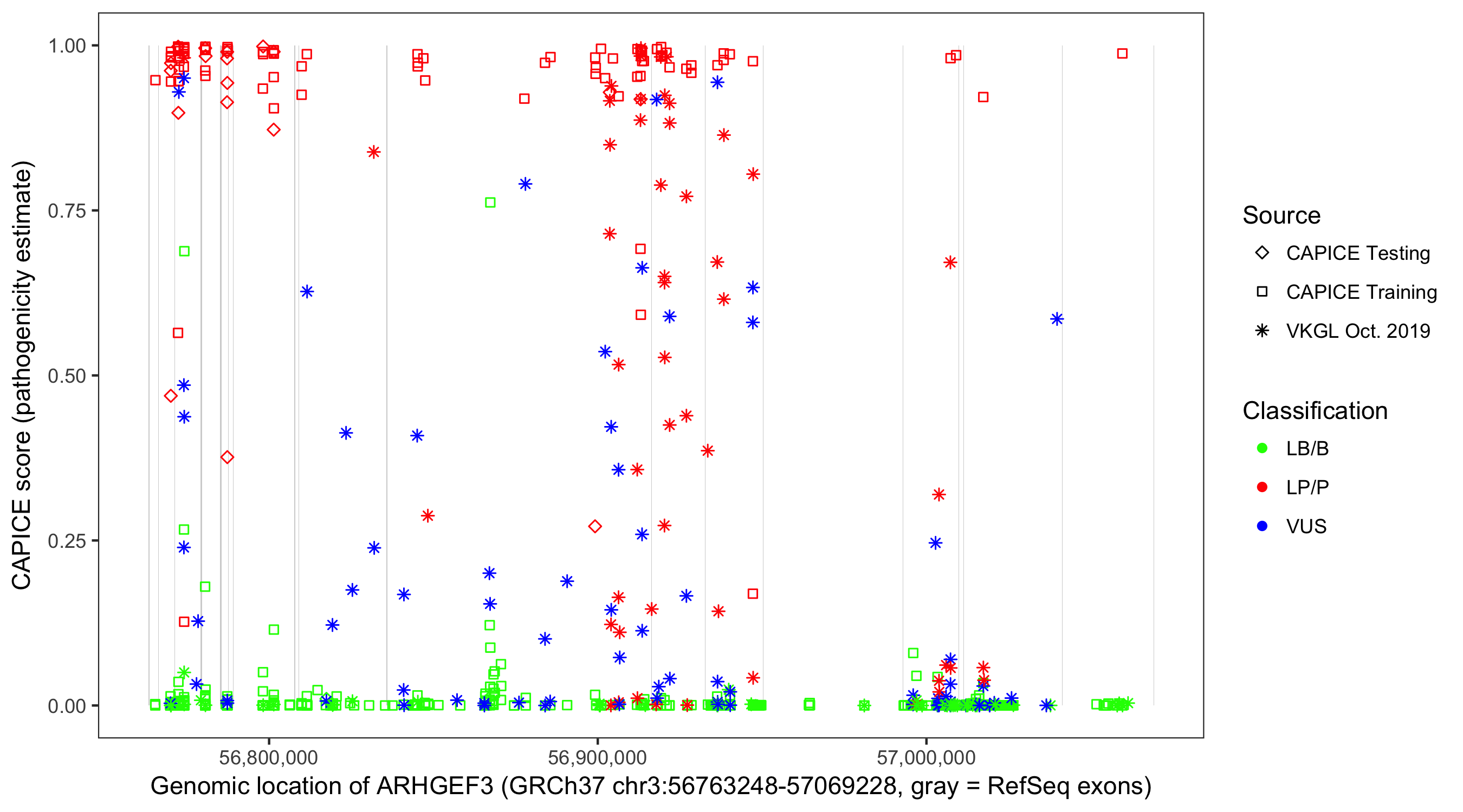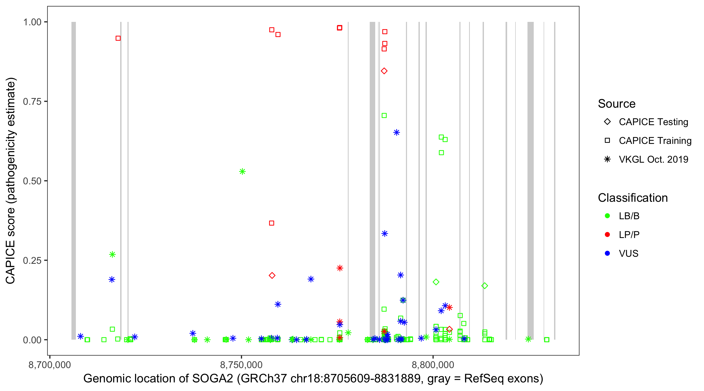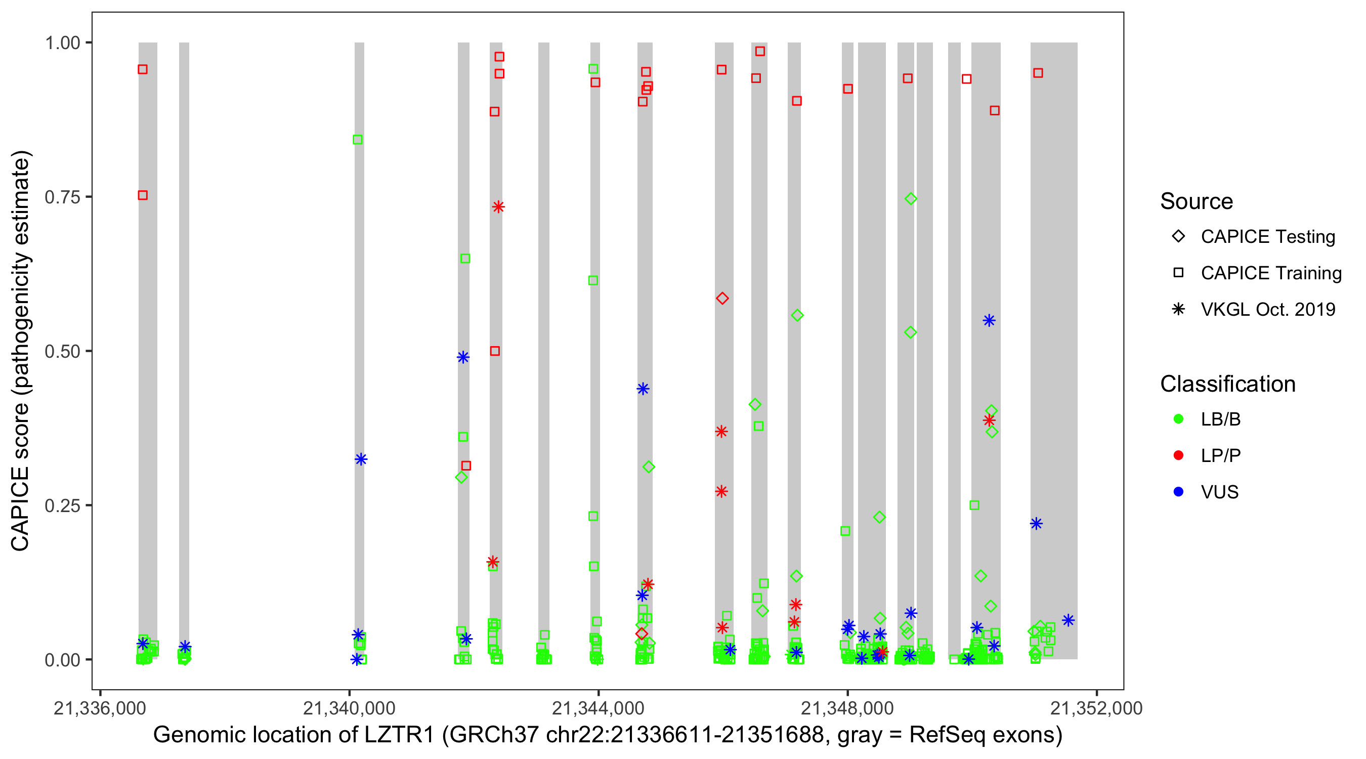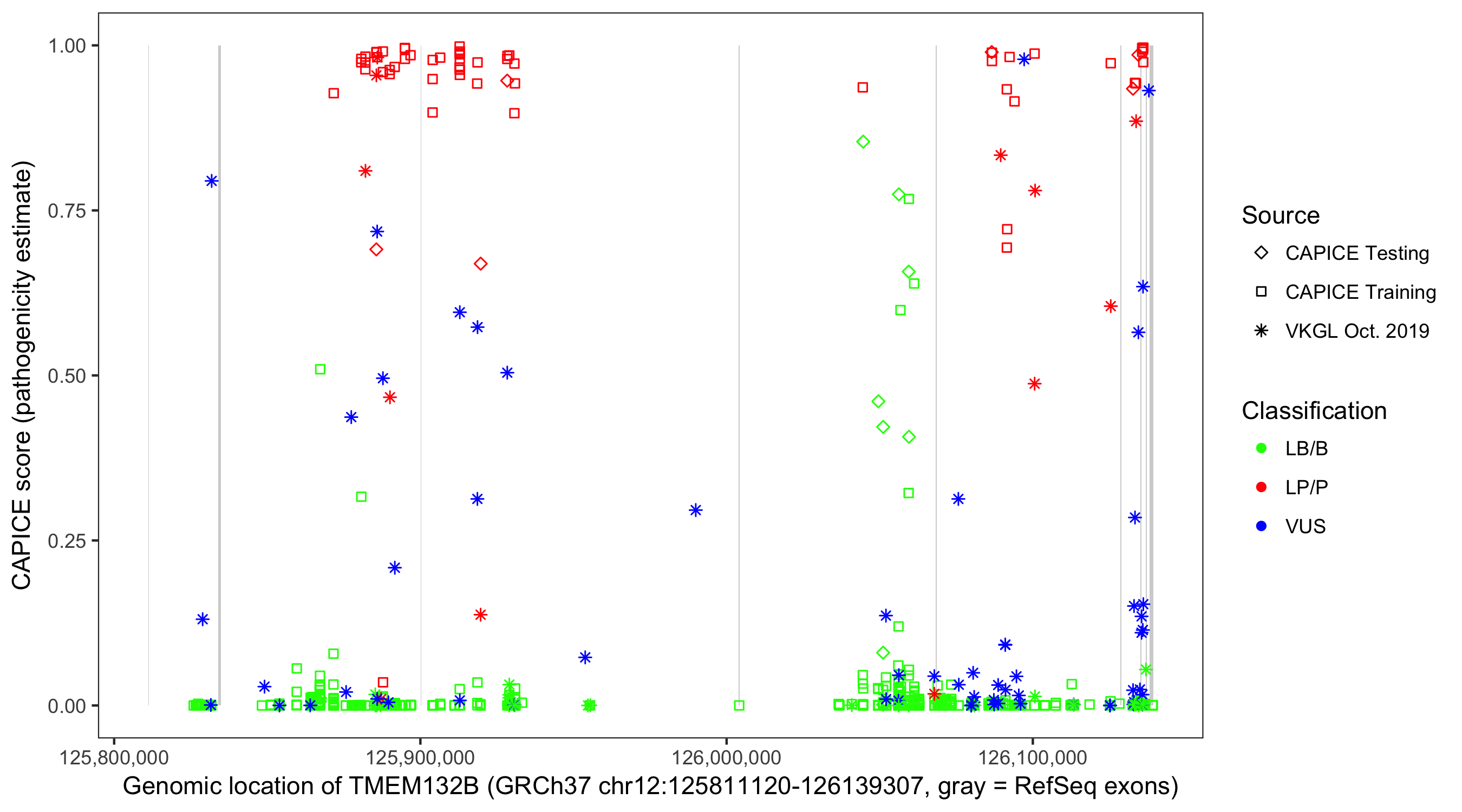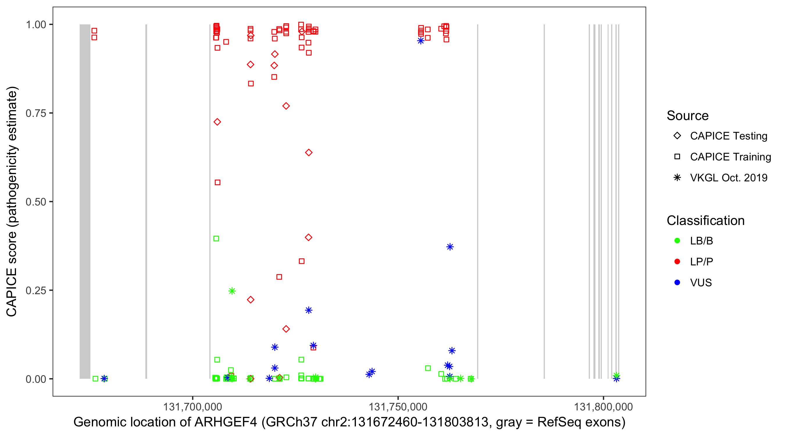 Shown are CAPICE train/test variants plus VKGL Oct 2019.