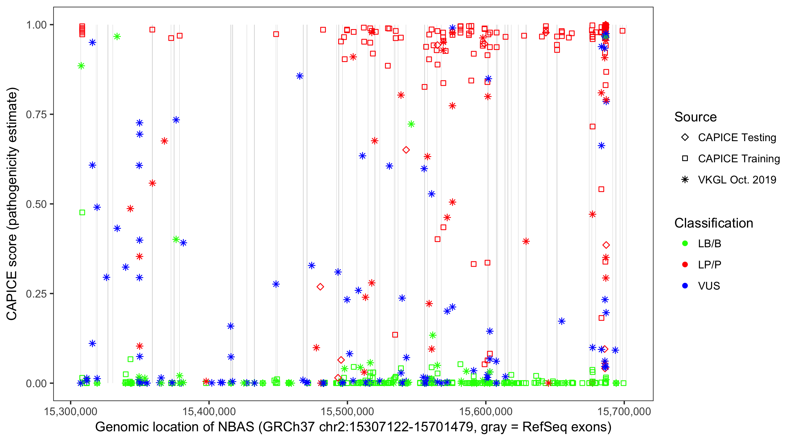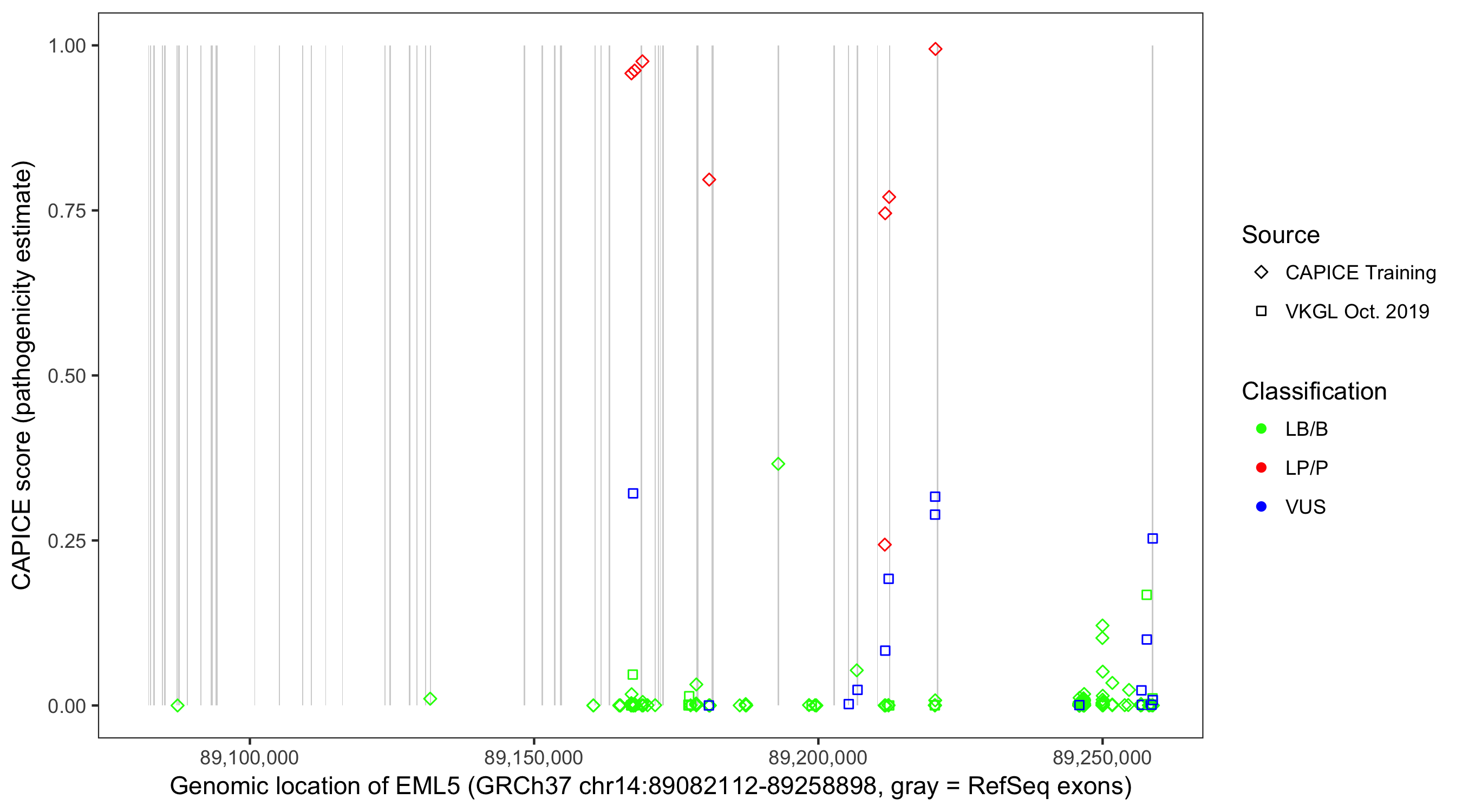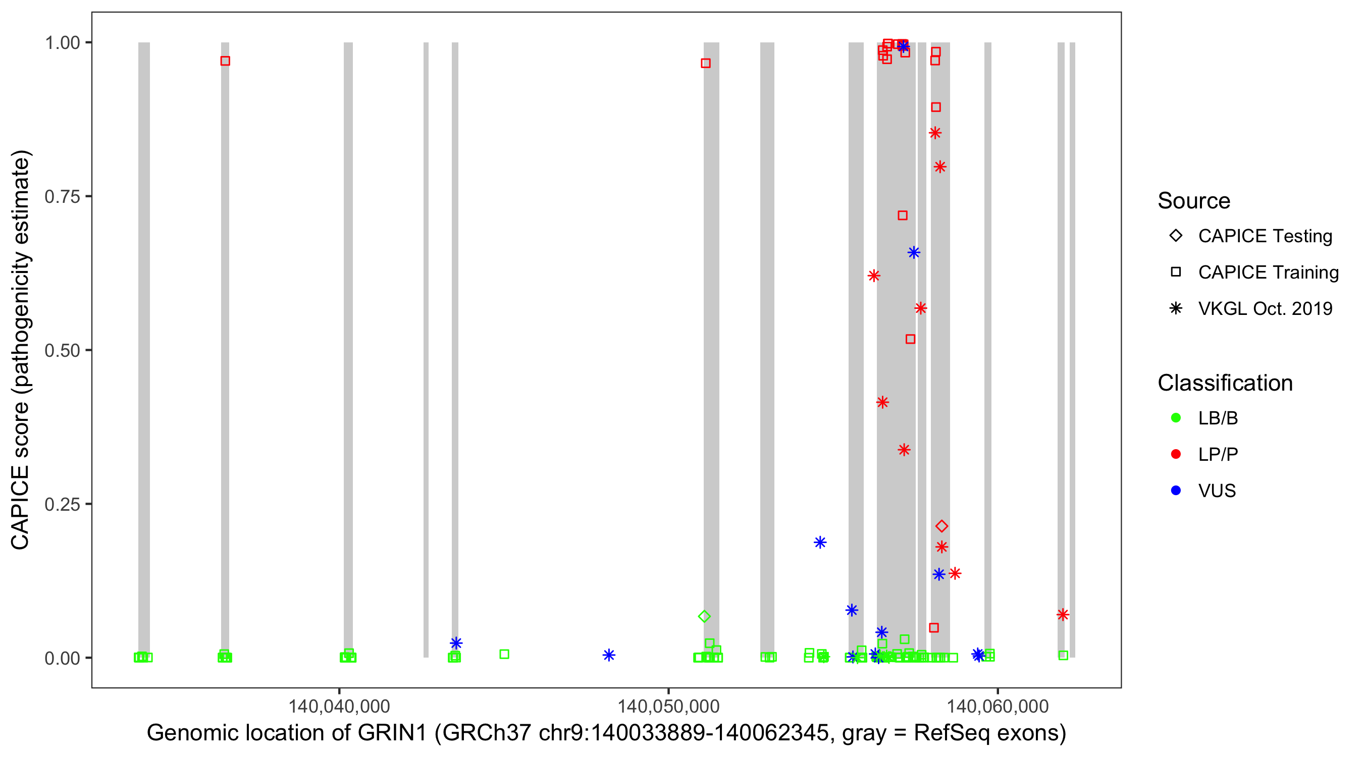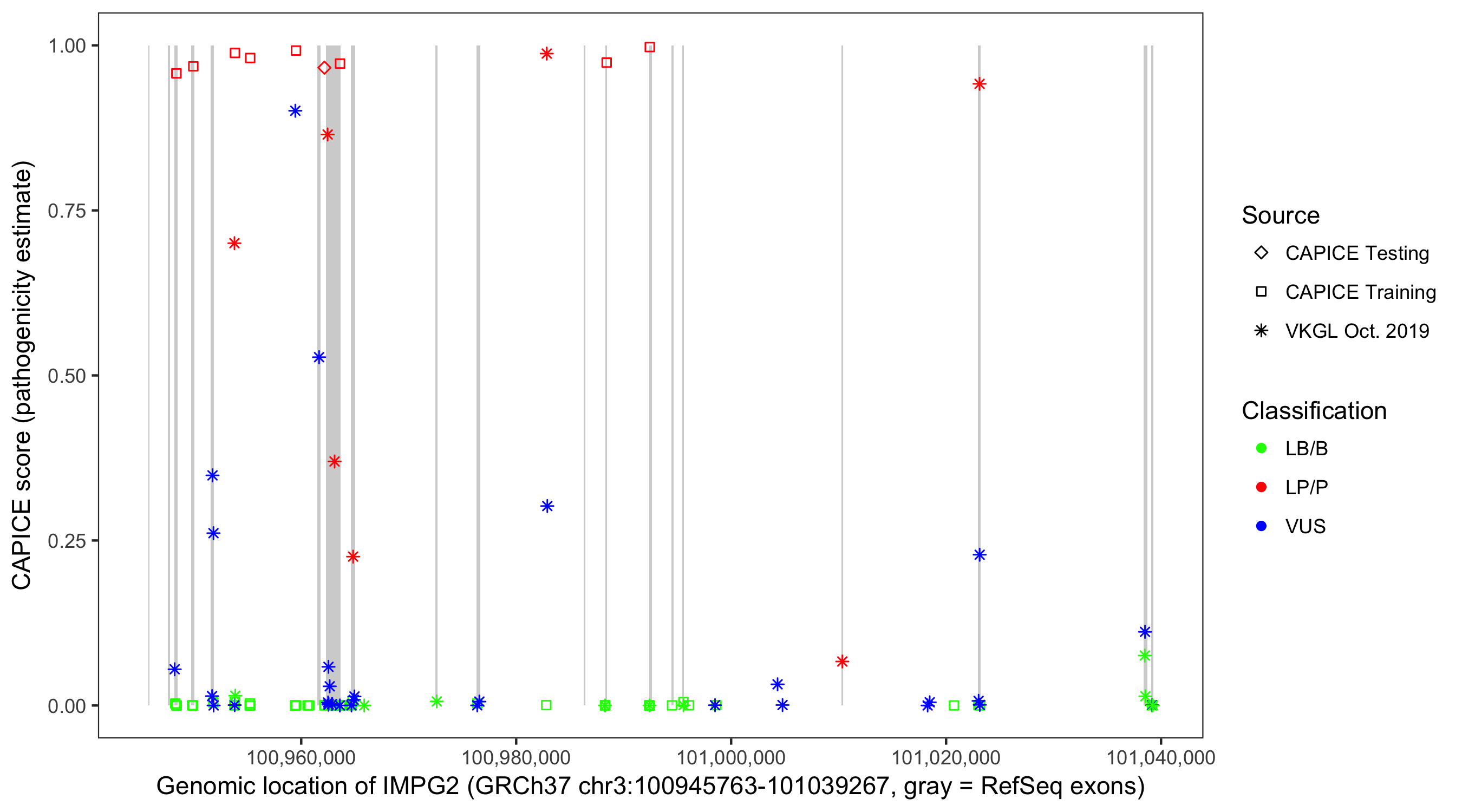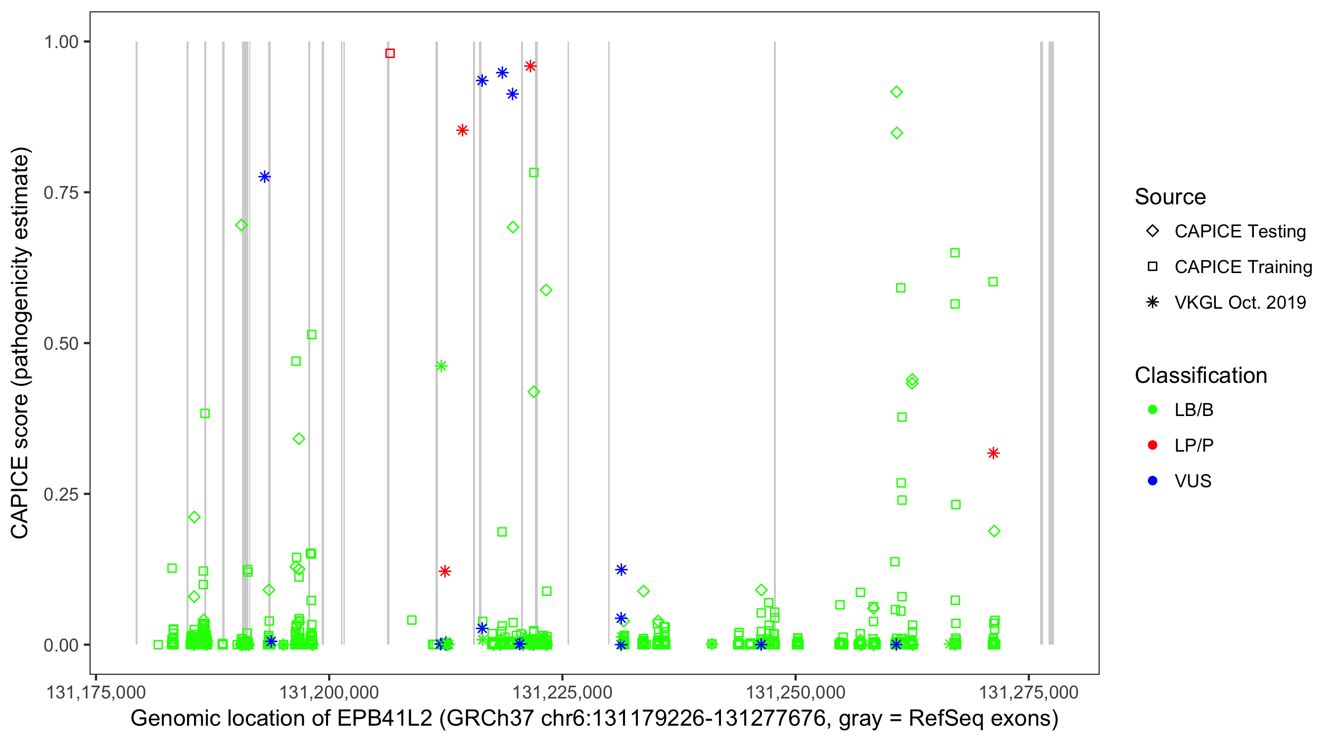 Shown are CAPICE train/test variants plus VKGL Oct 2019.