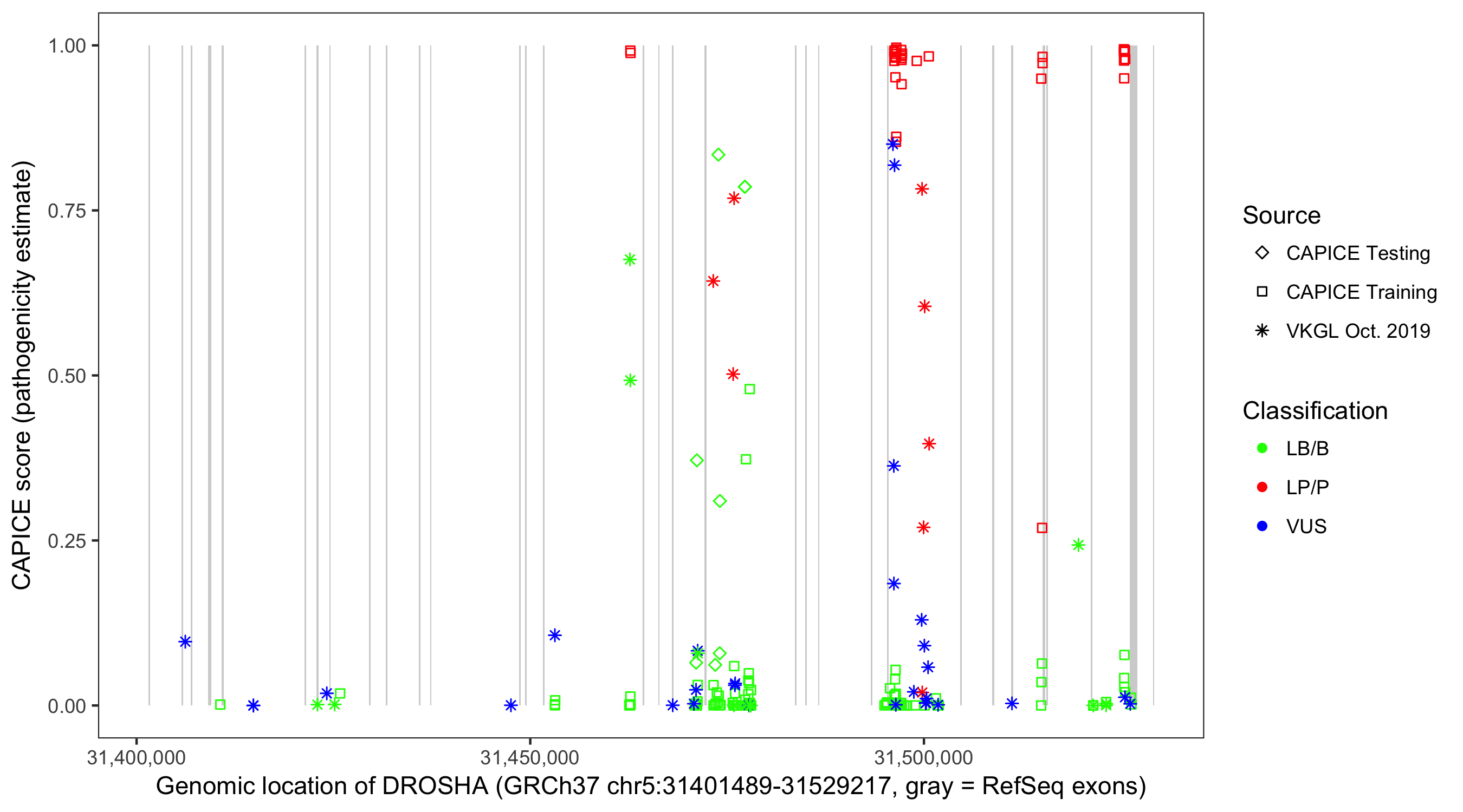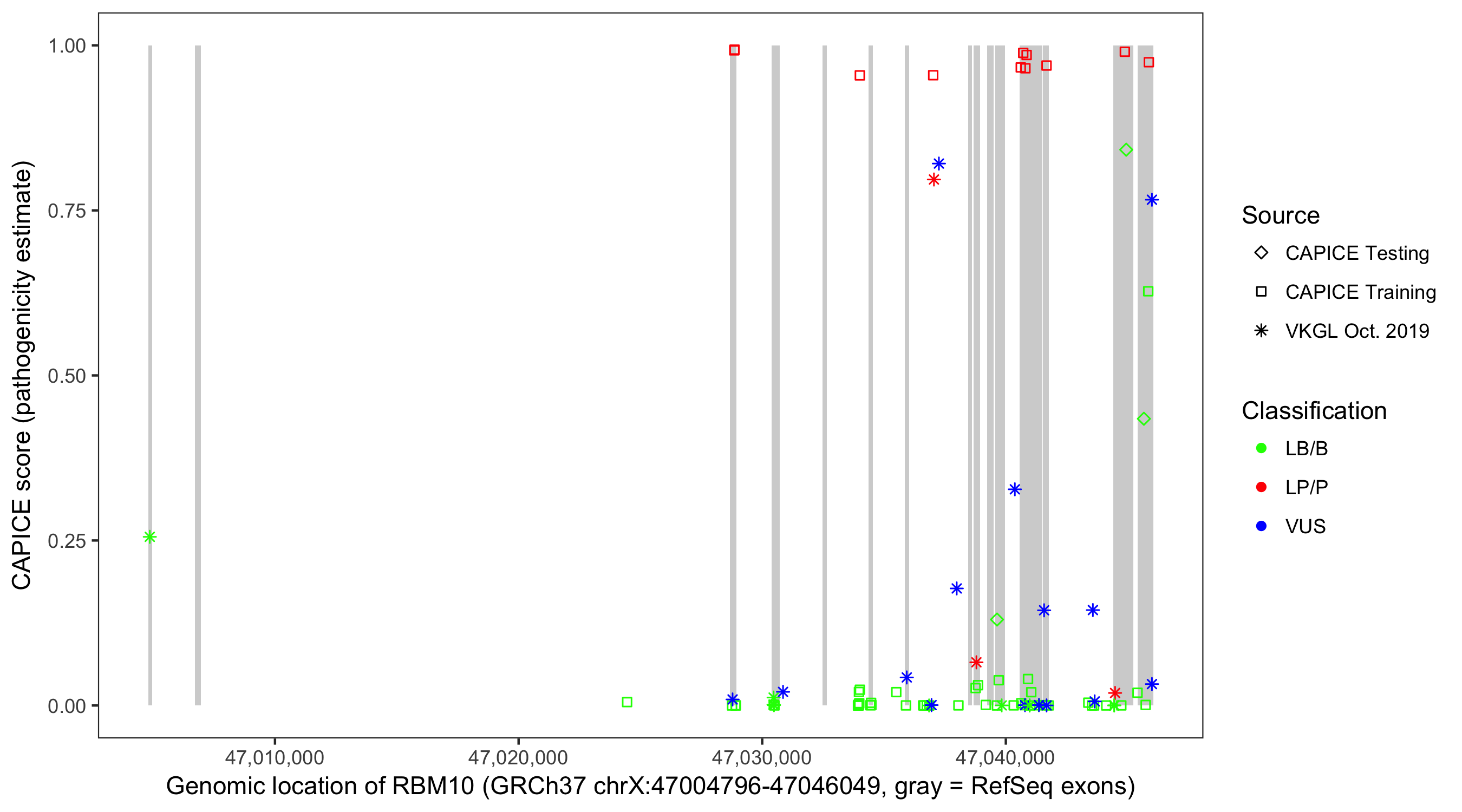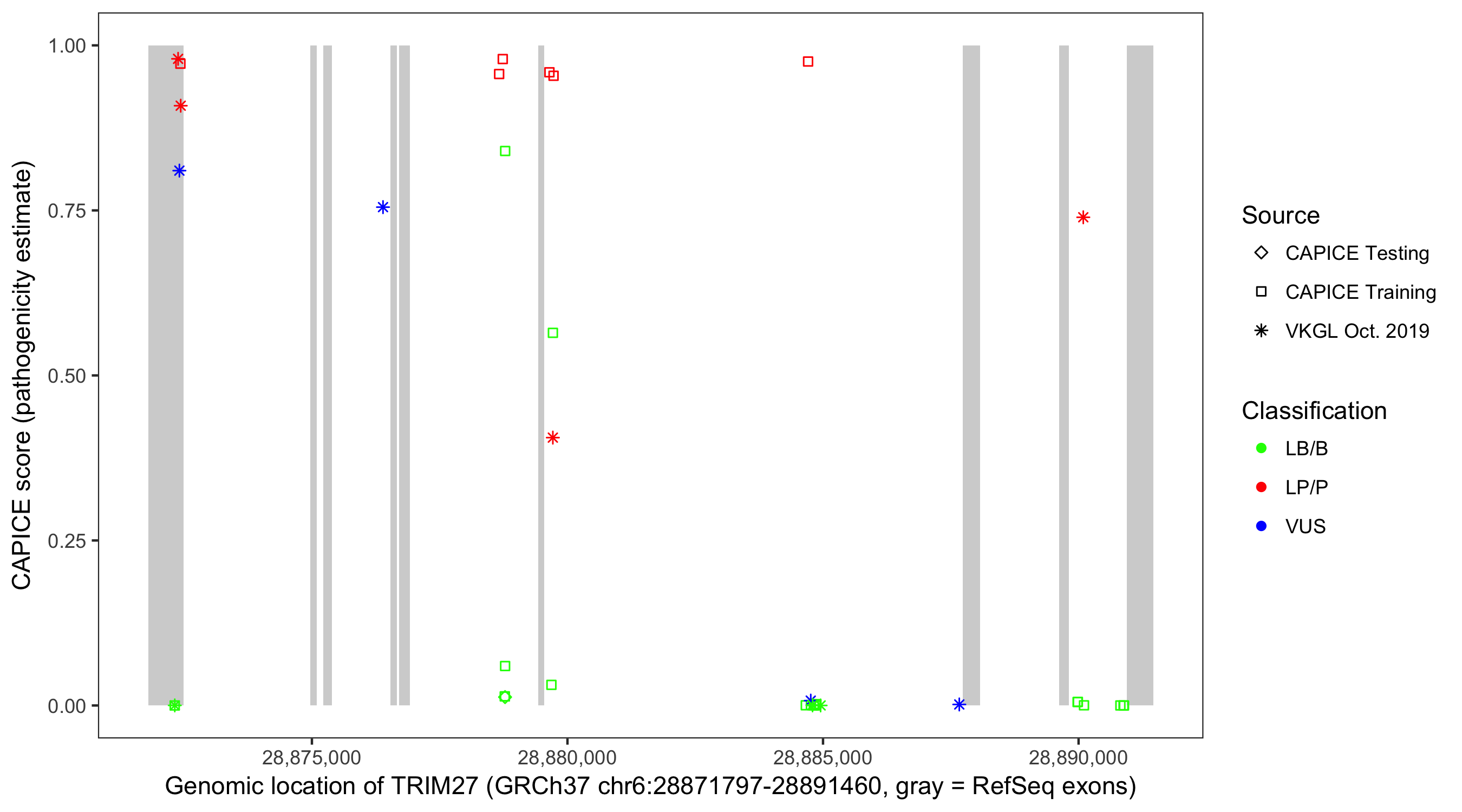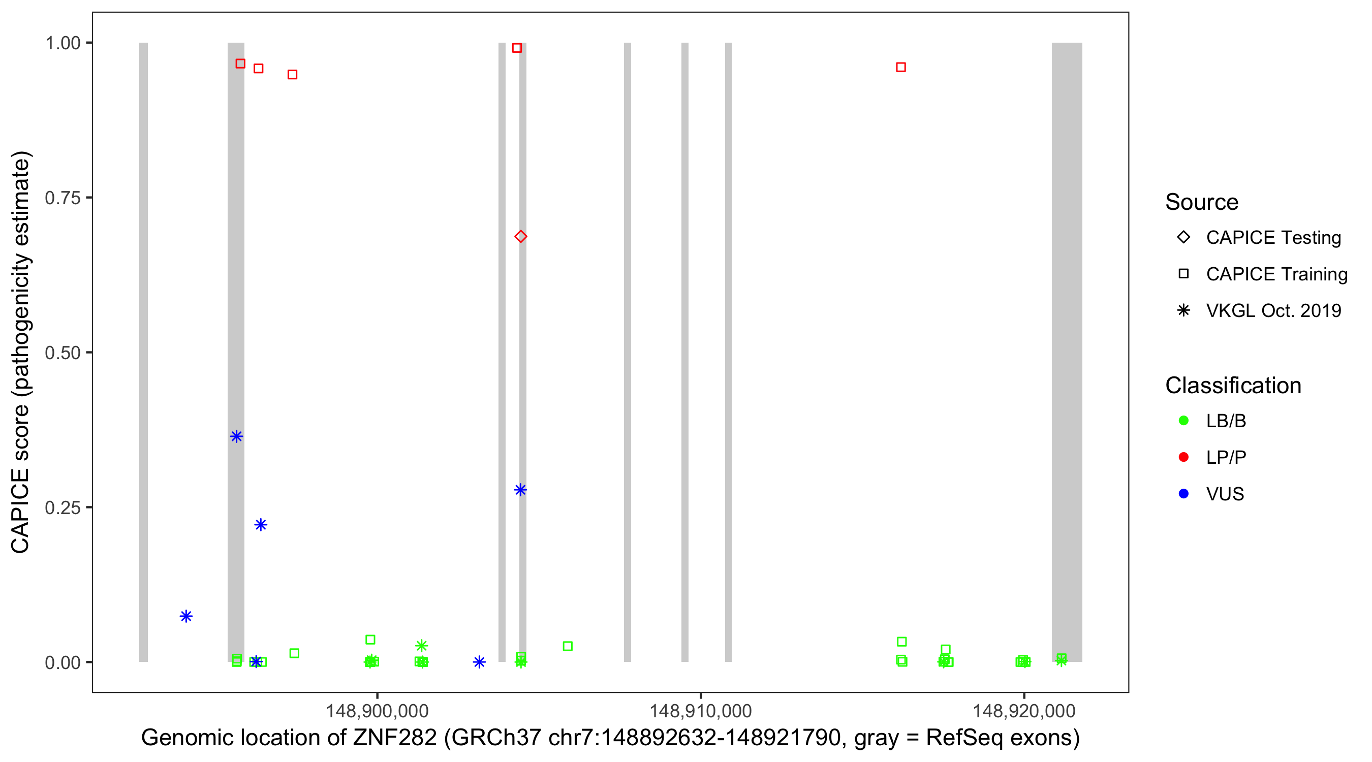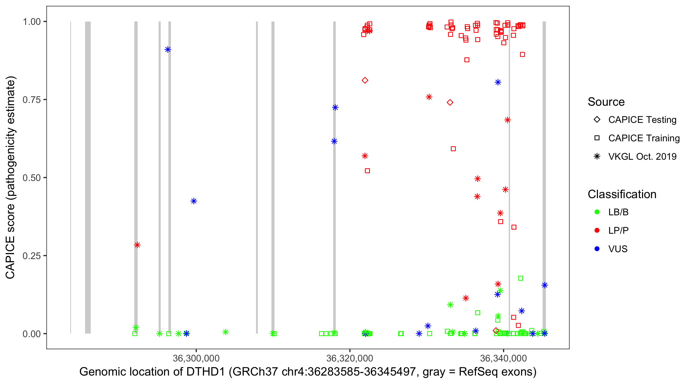 Shown are CAPICE train/test variants plus VKGL Oct 2019.