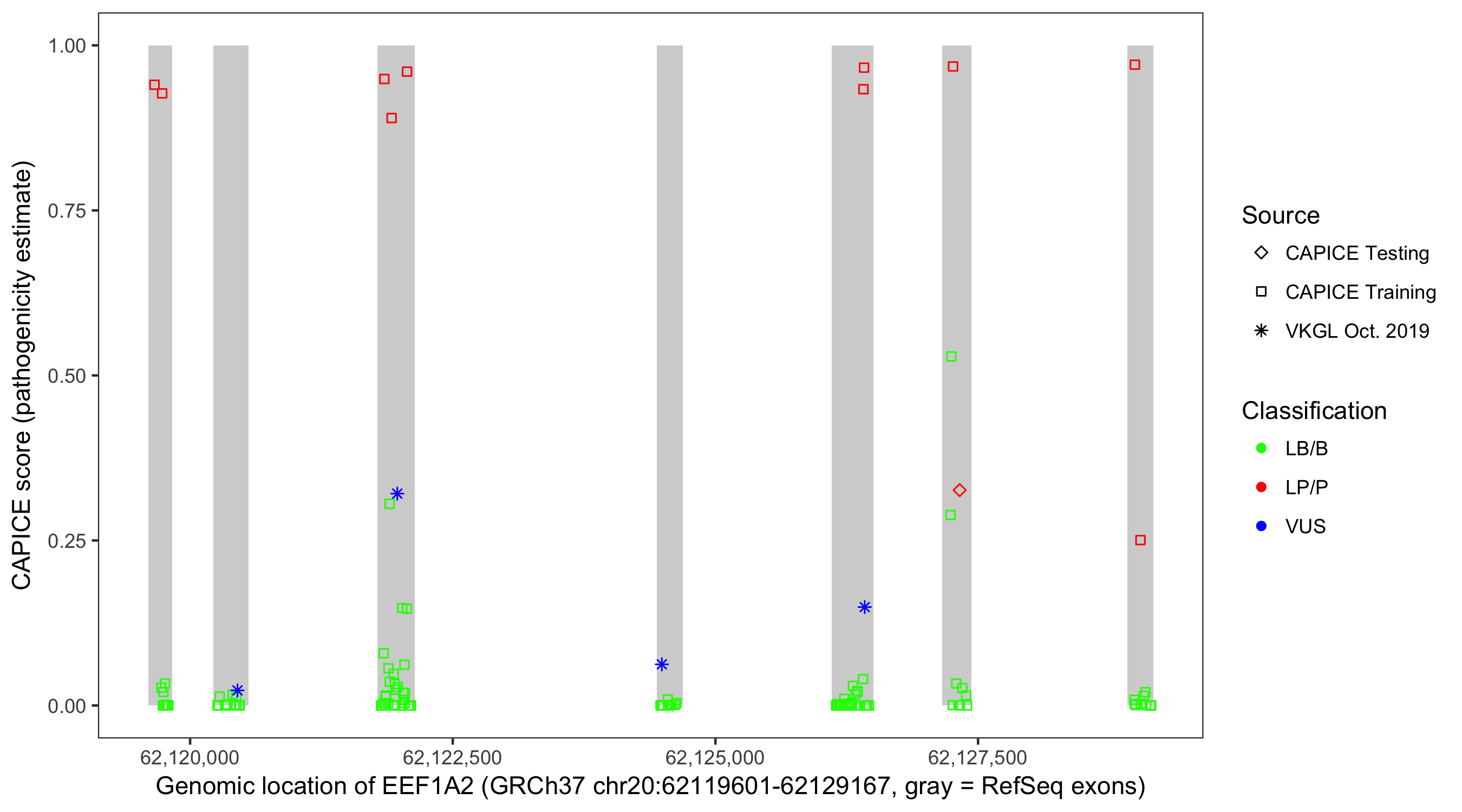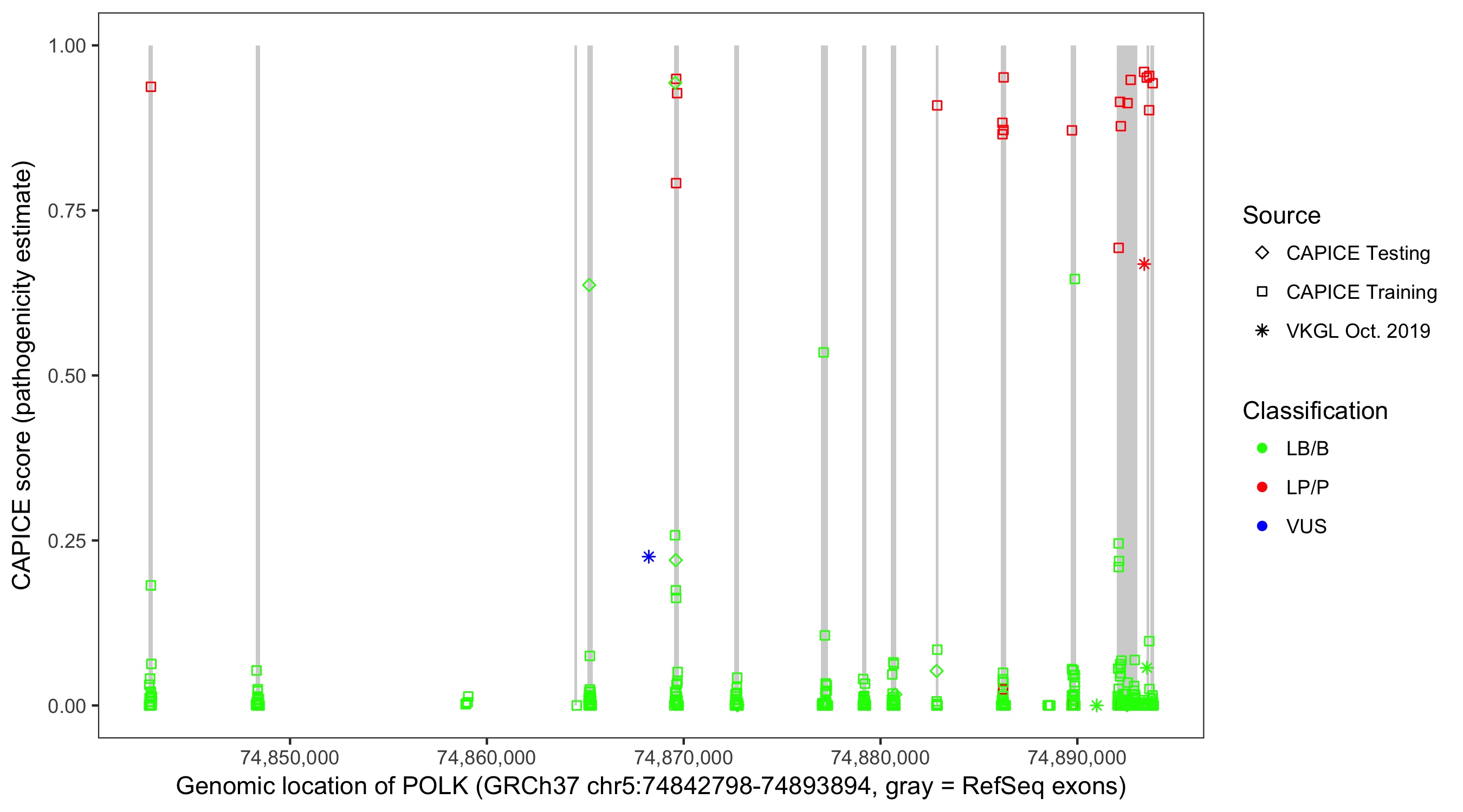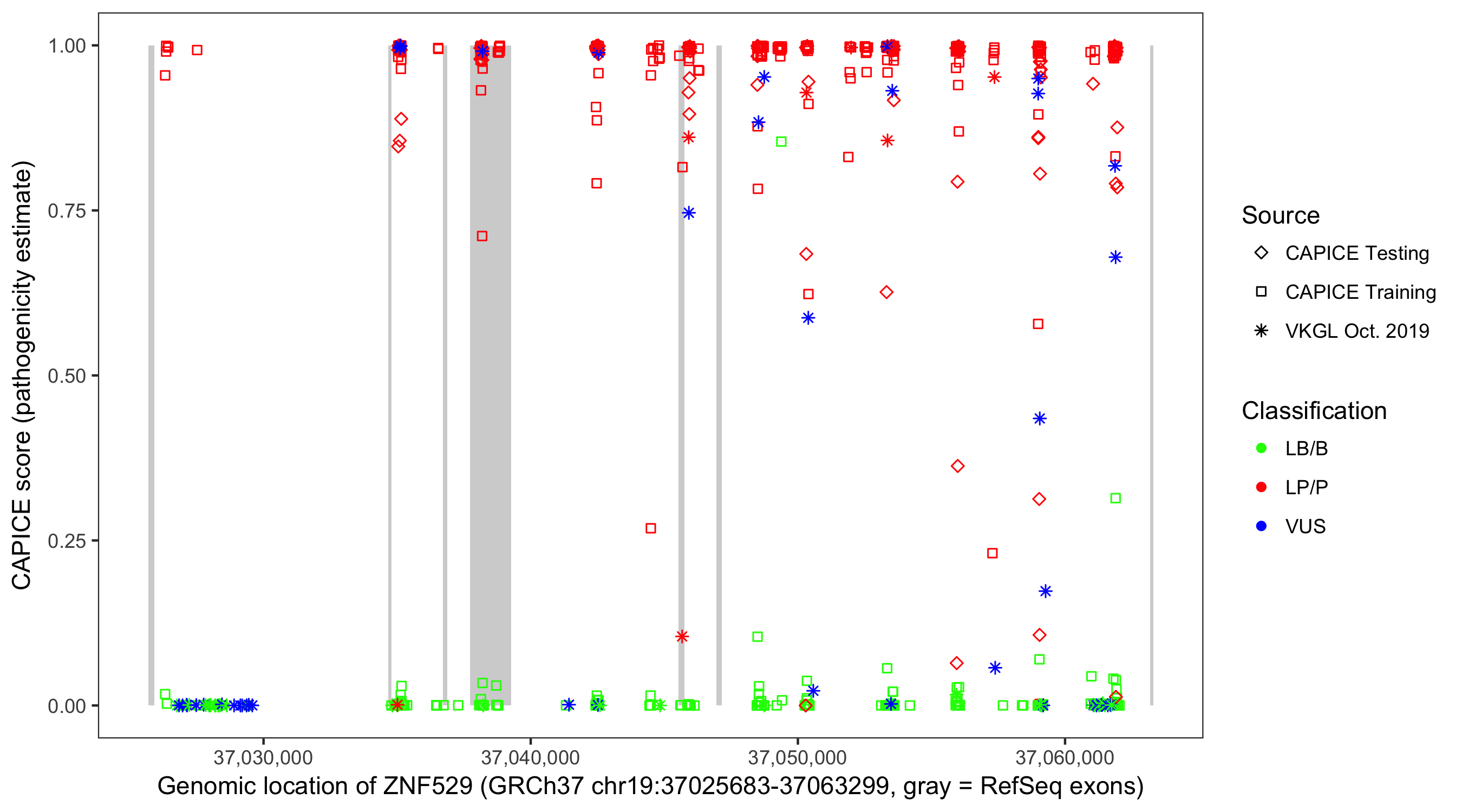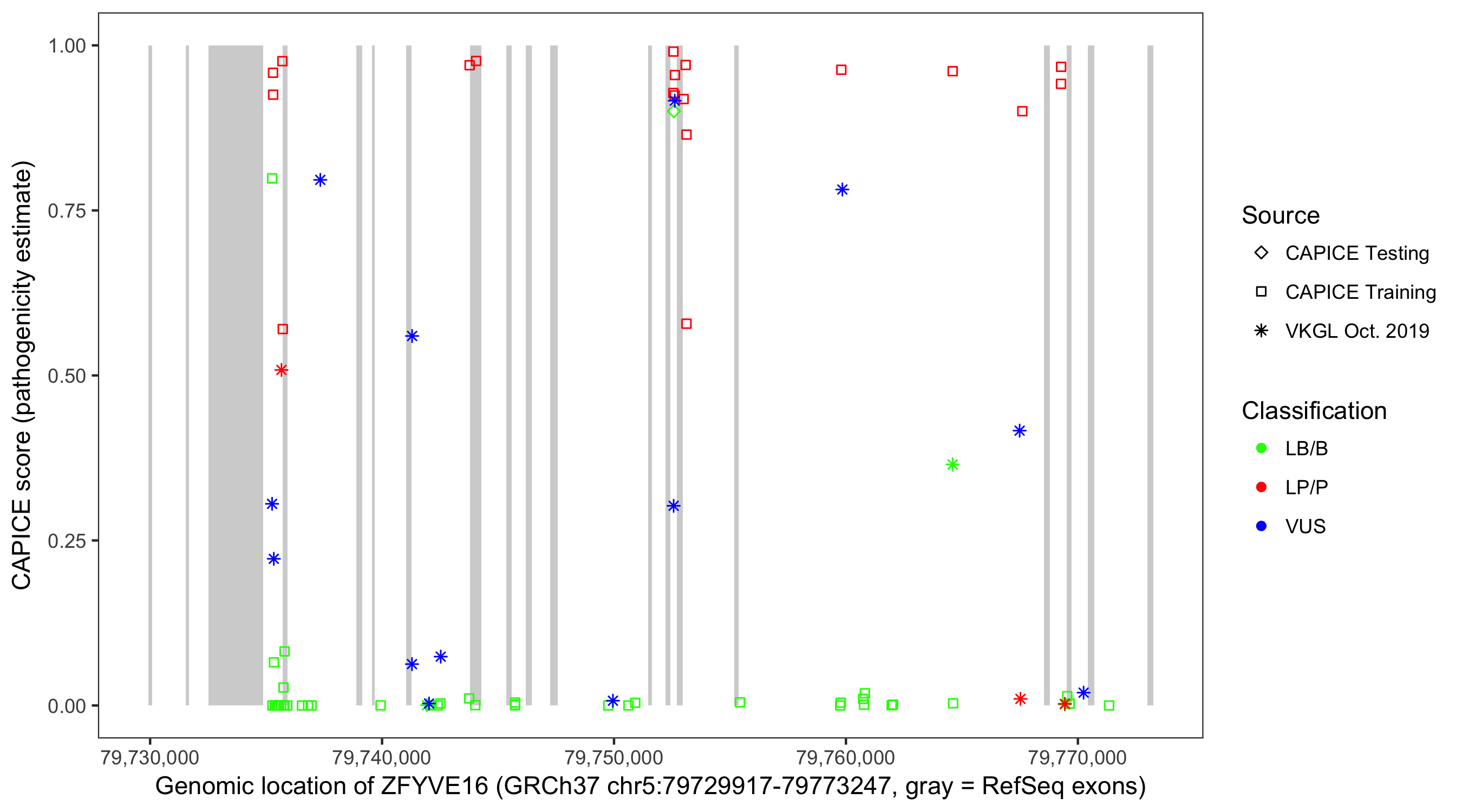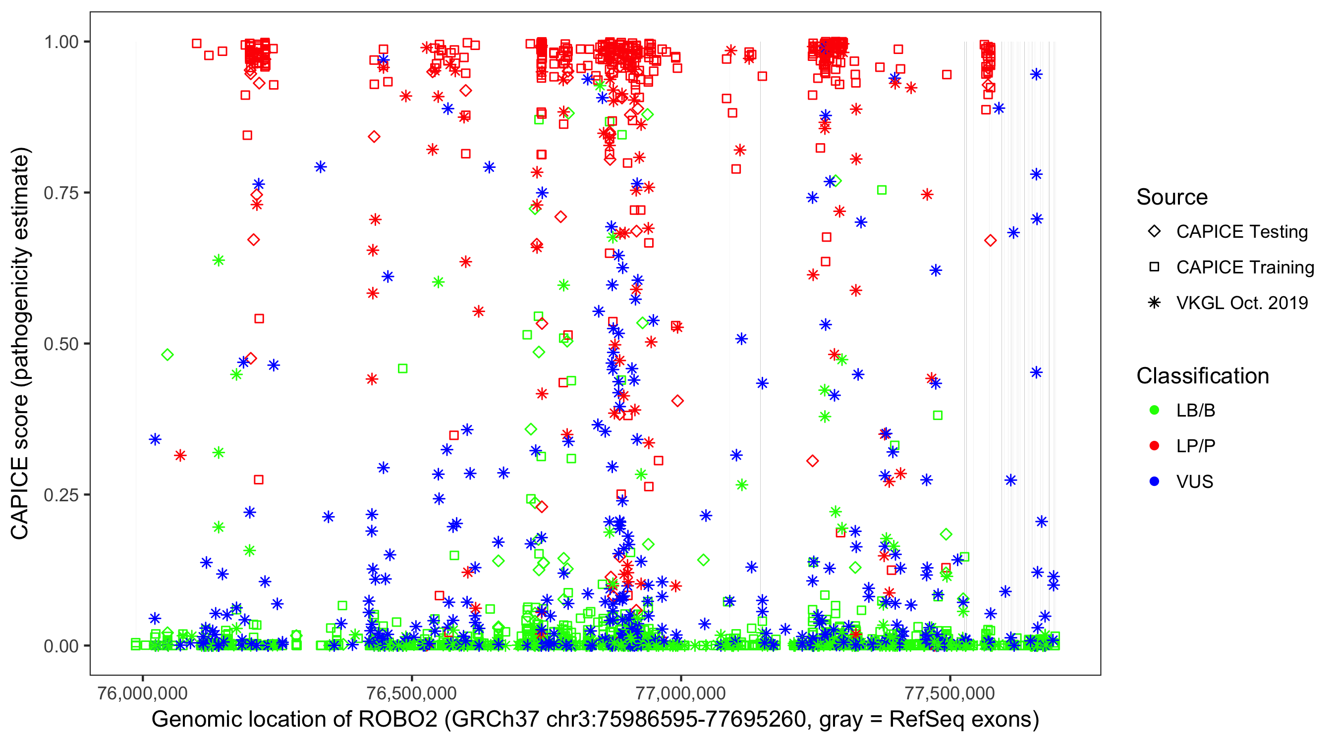 Shown are CAPICE train/test variants plus VKGL Oct 2019.