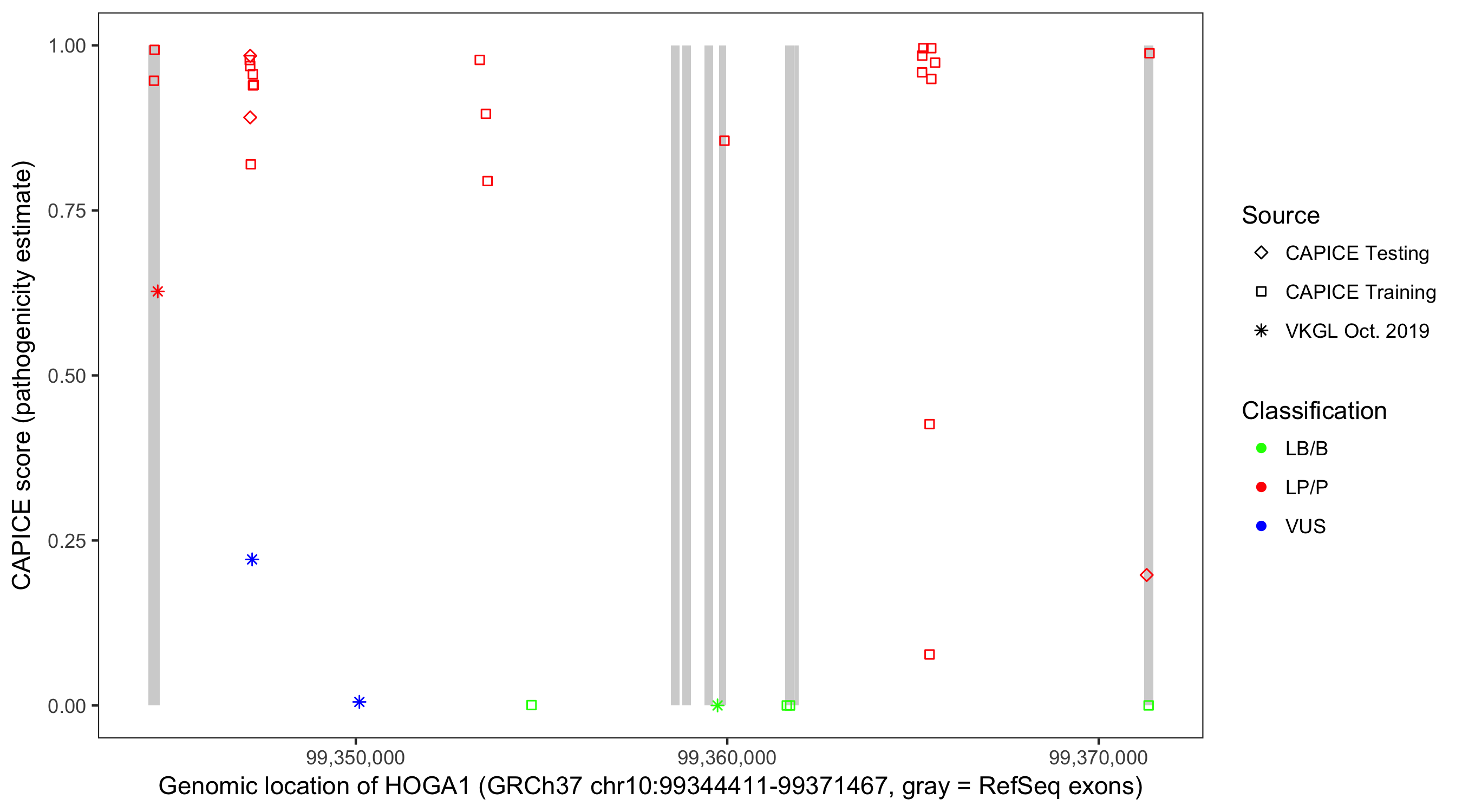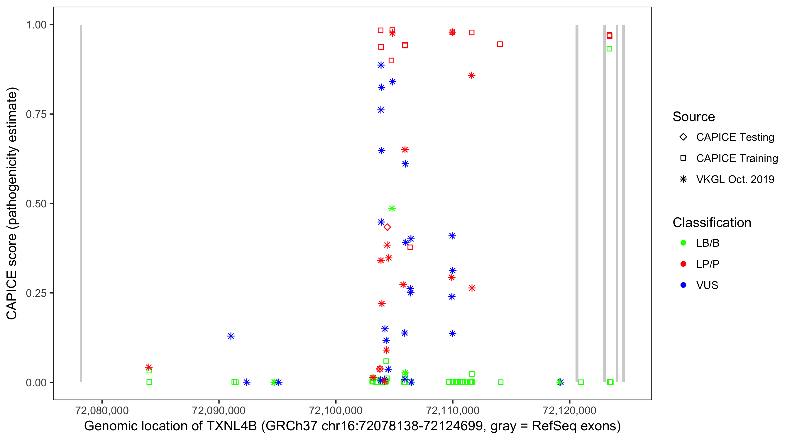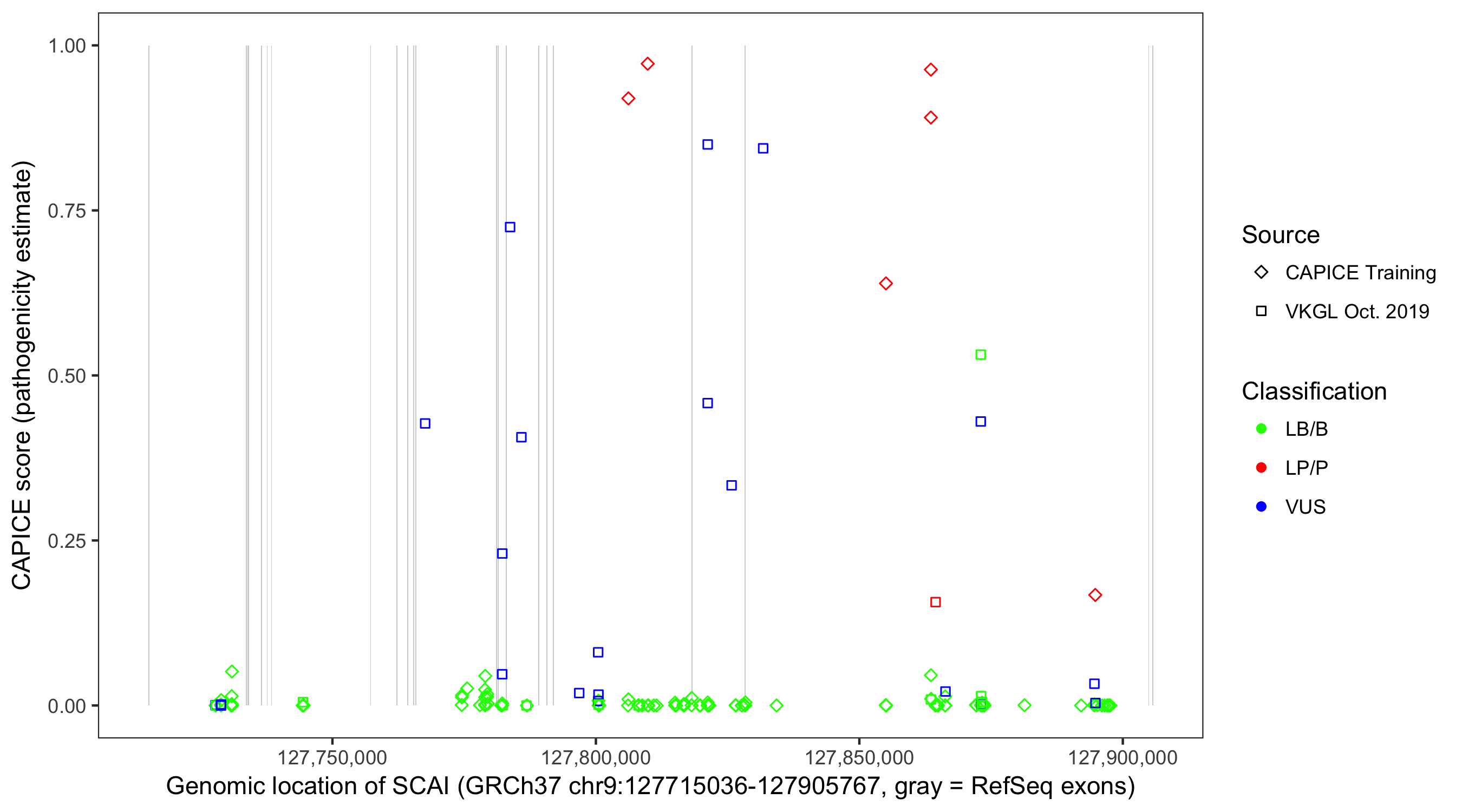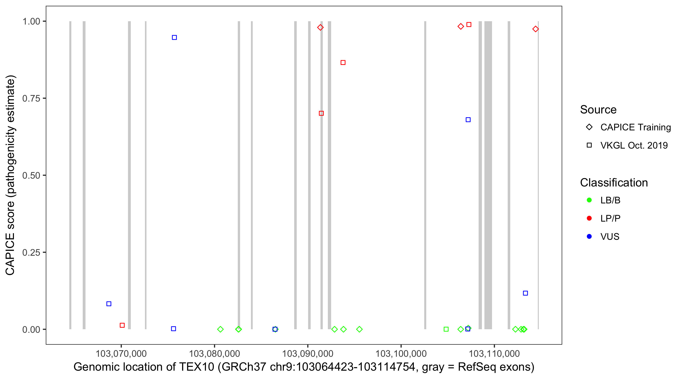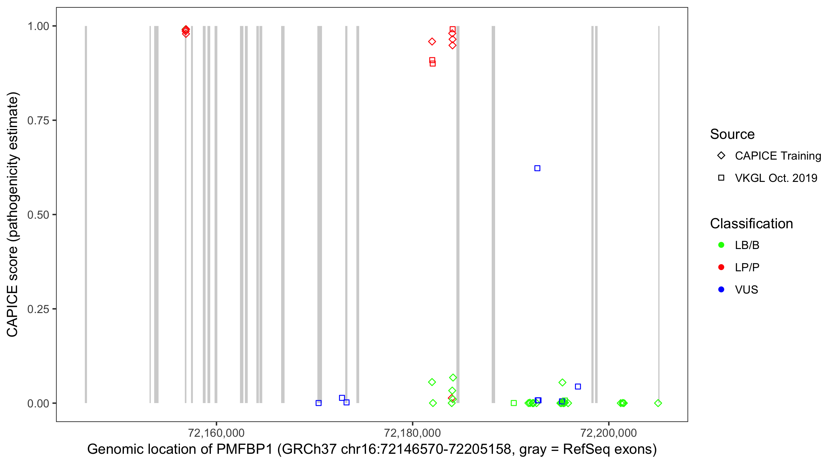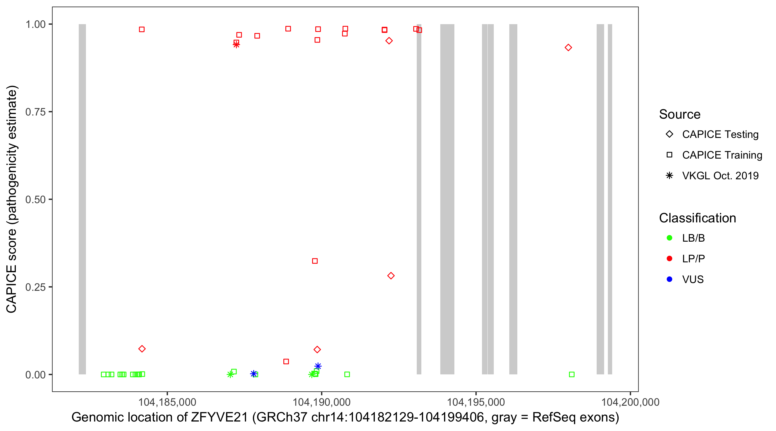Shown are CAPICE train/test variants plus VKGL Oct 2019.
