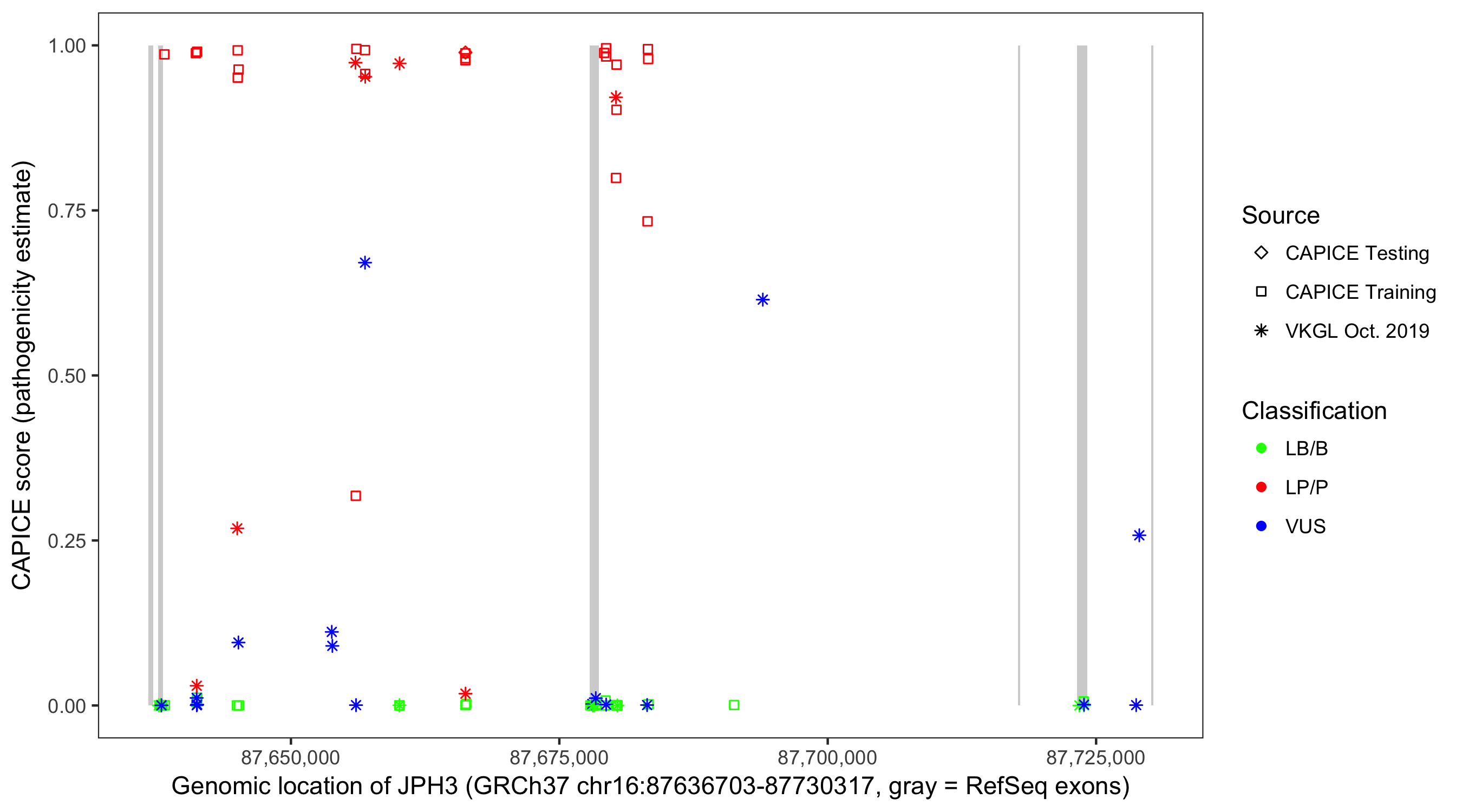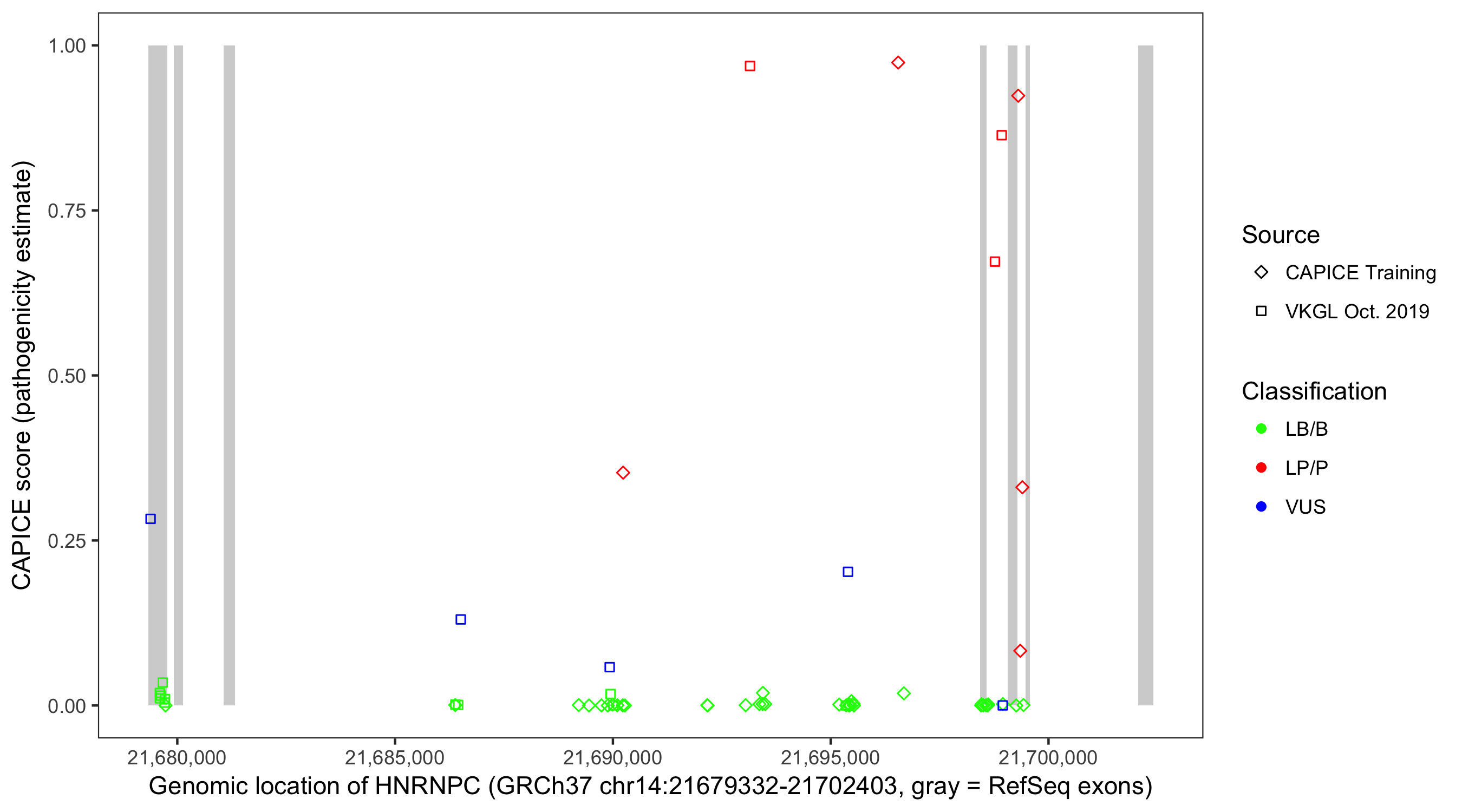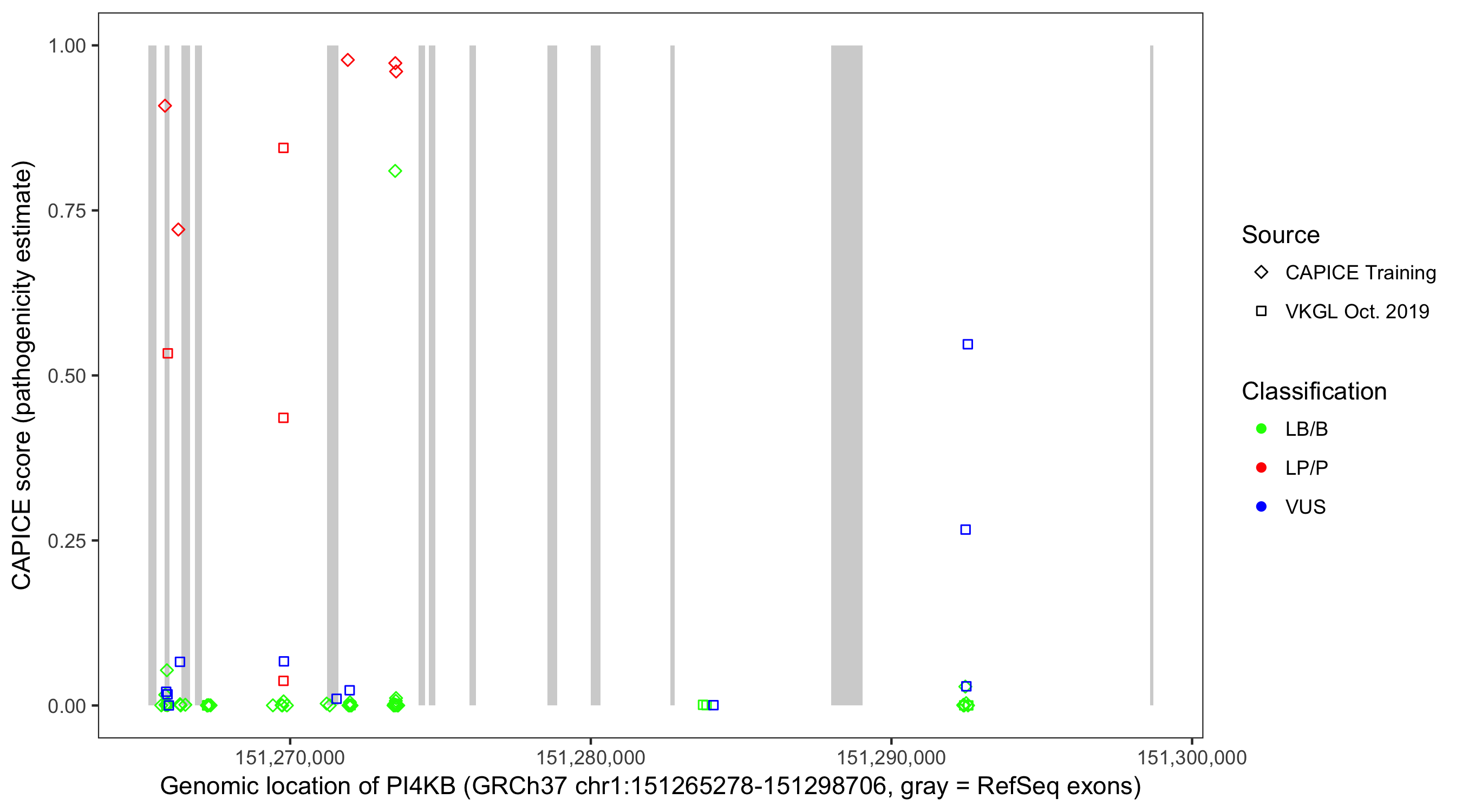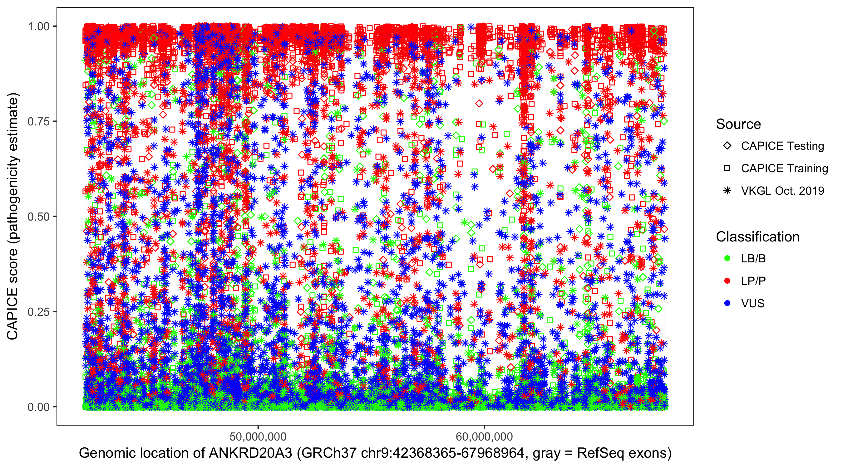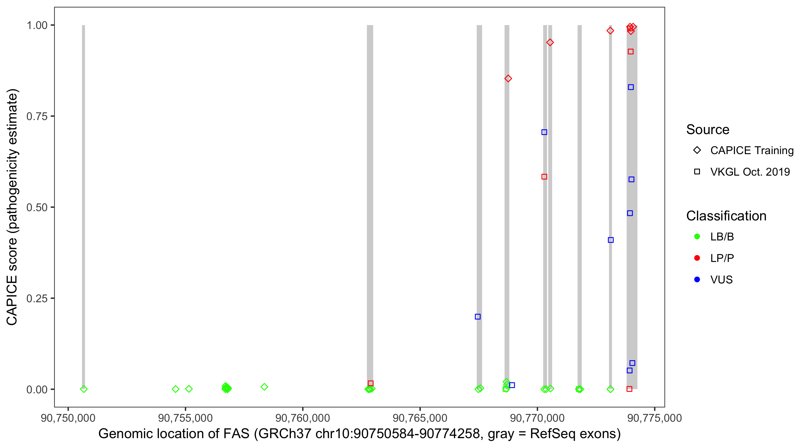 Shown are CAPICE train/test variants plus VKGL Oct 2019.