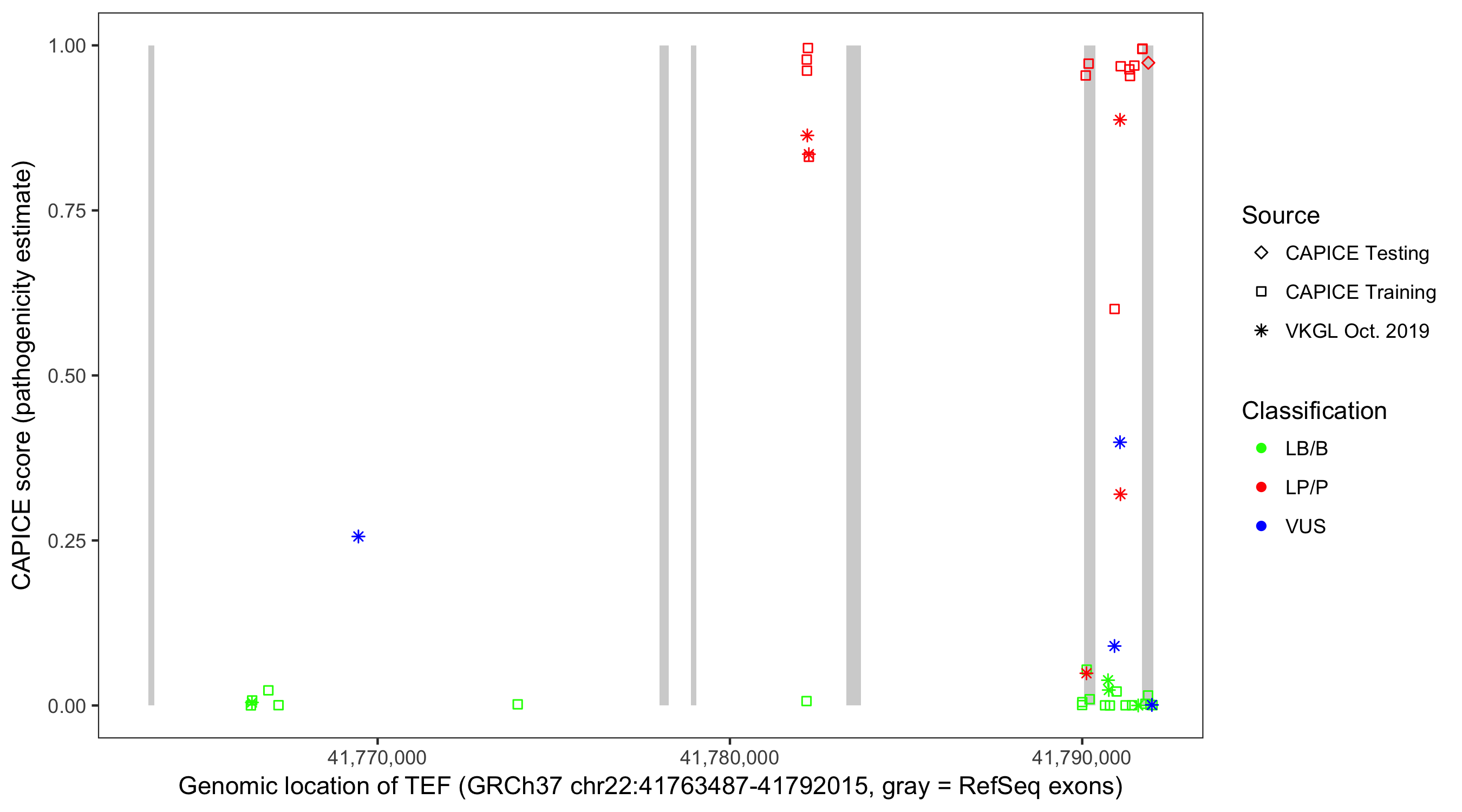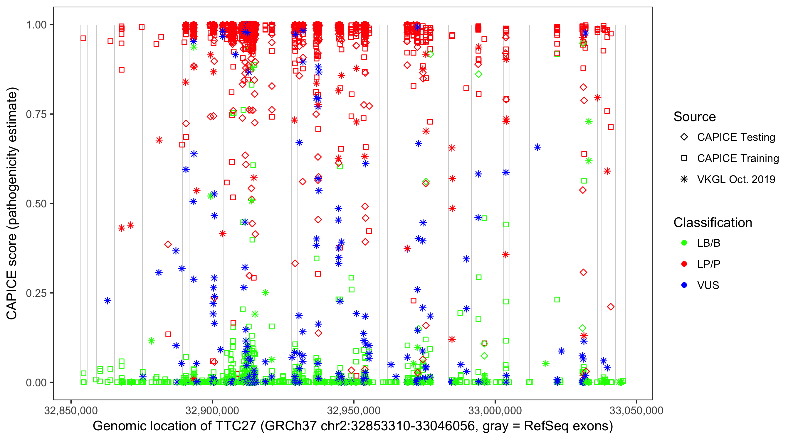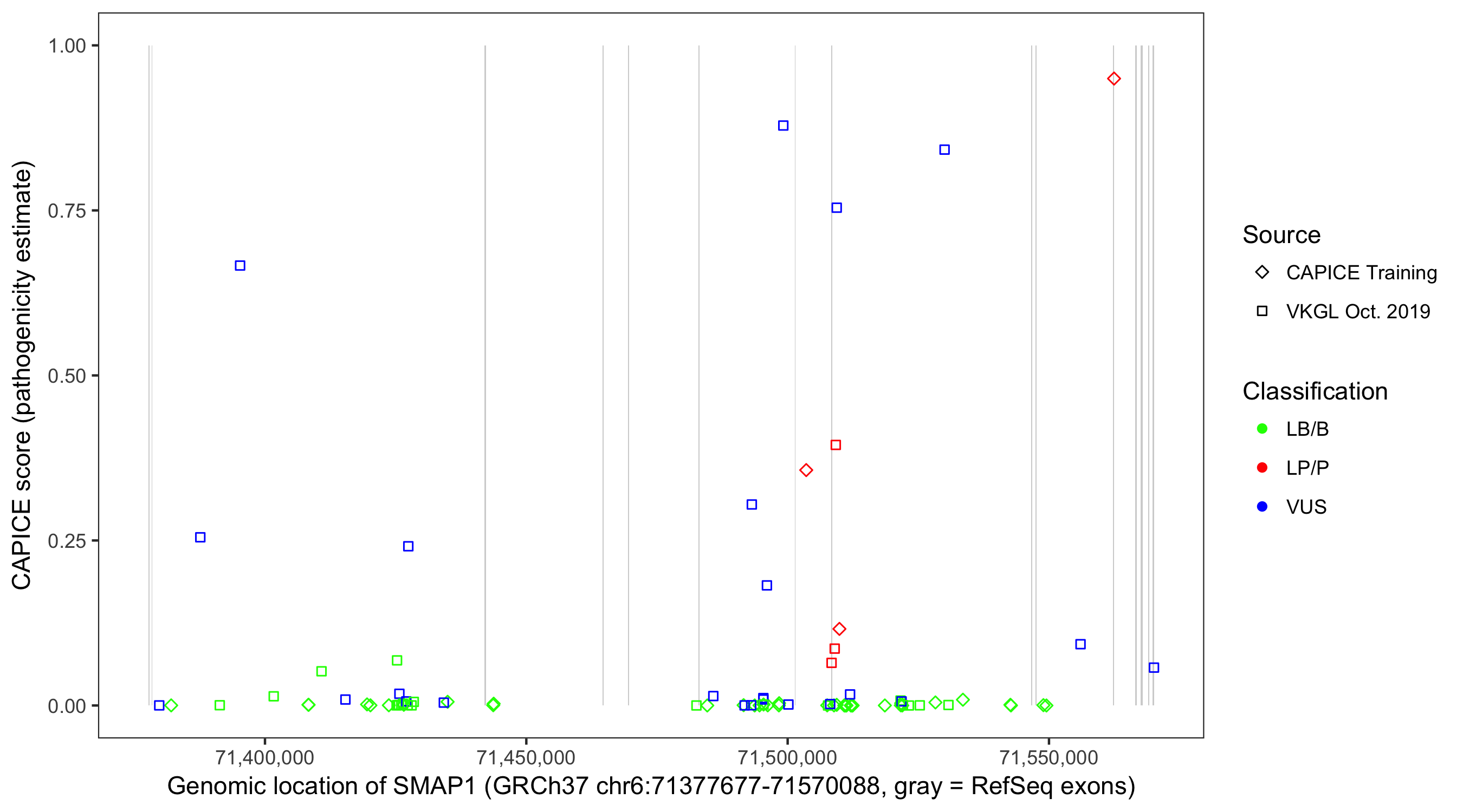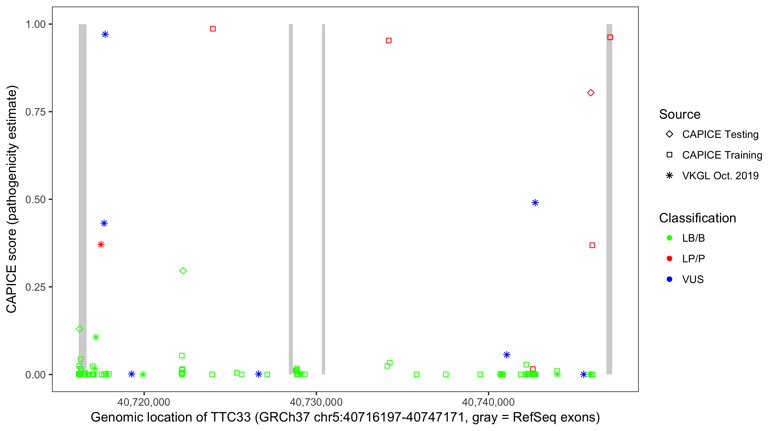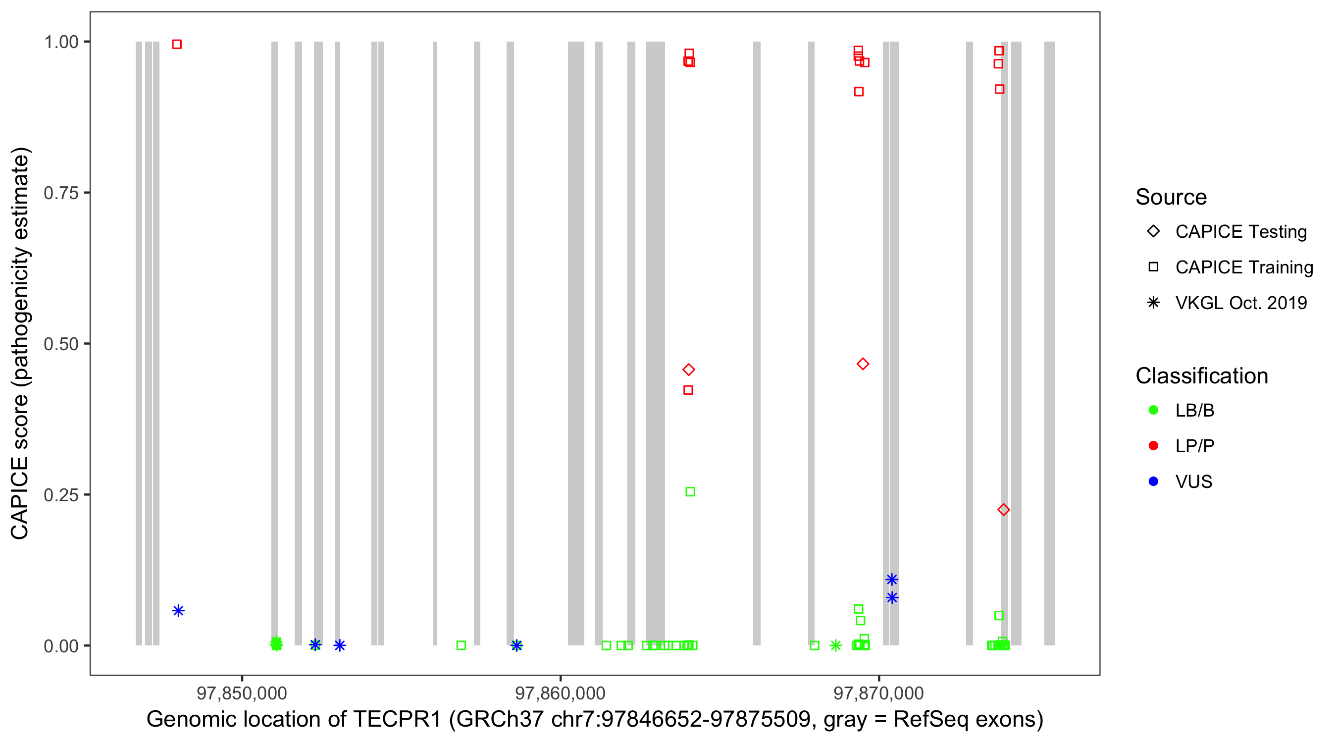 Shown are CAPICE train/test variants plus VKGL Oct 2019.