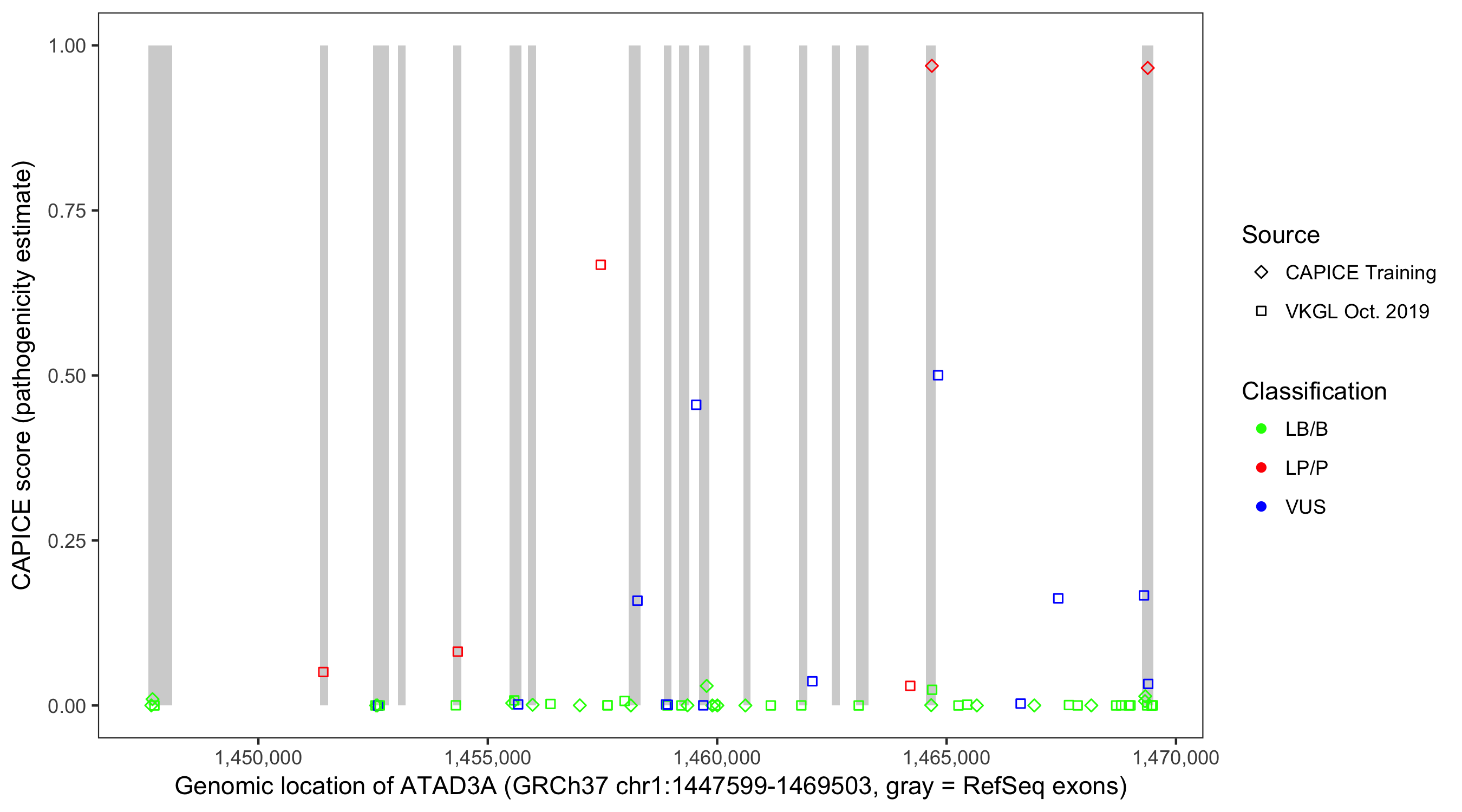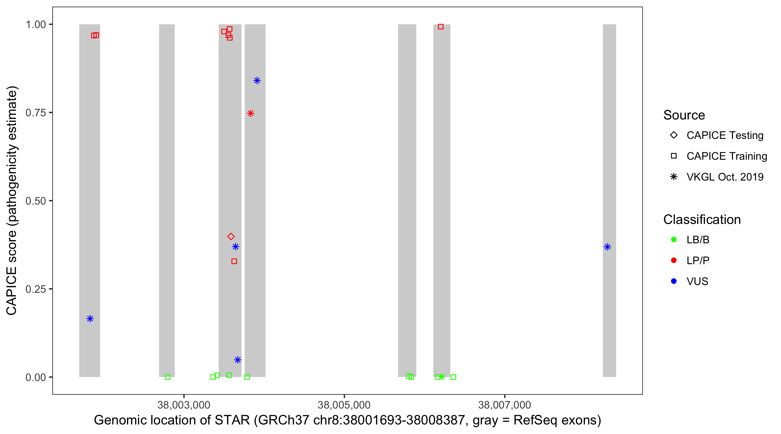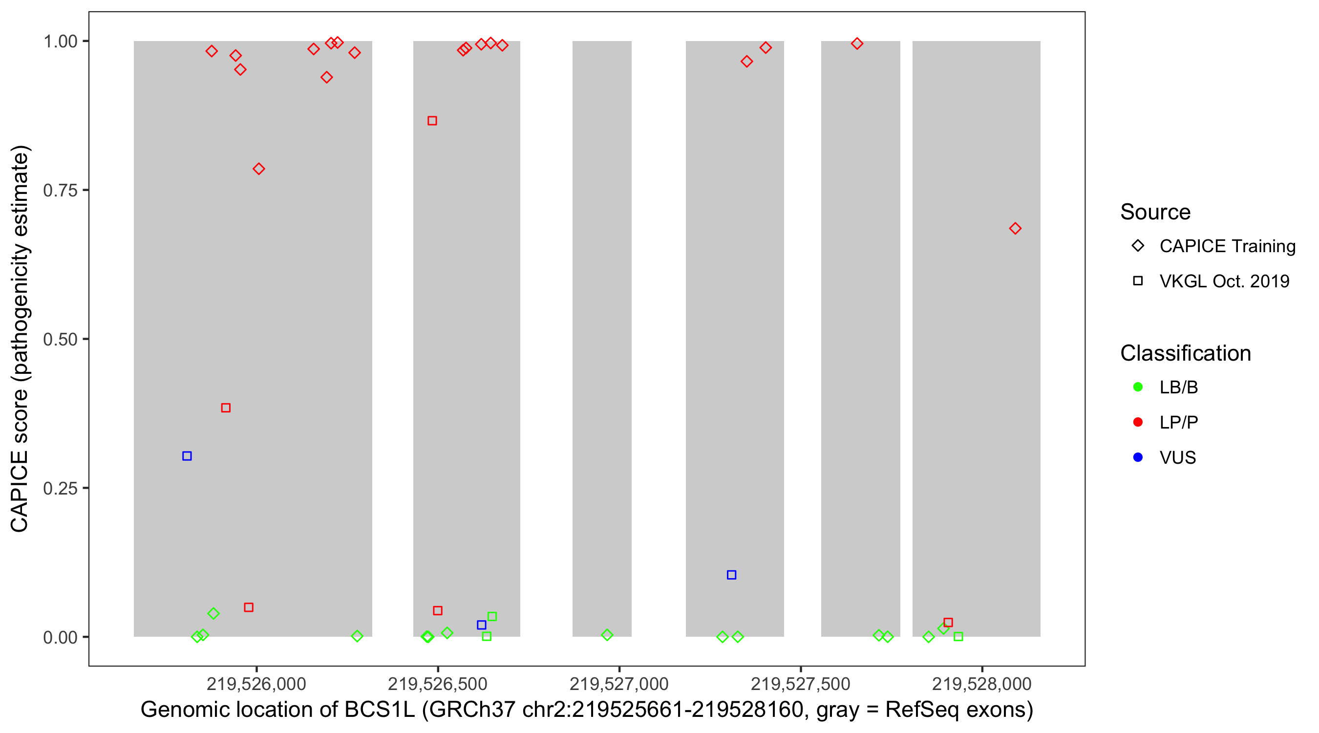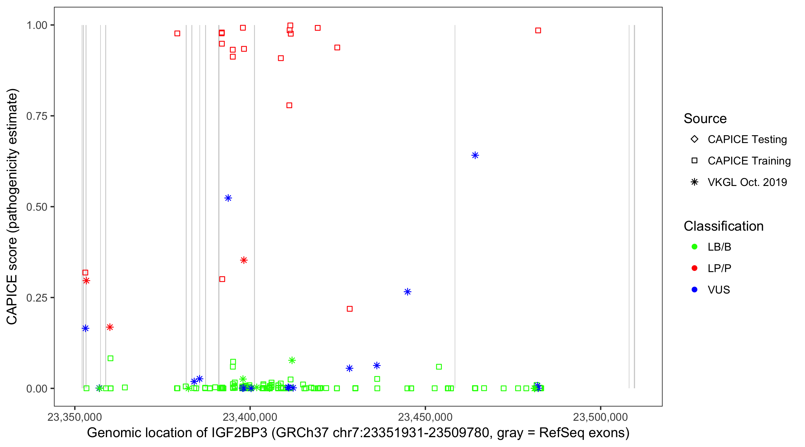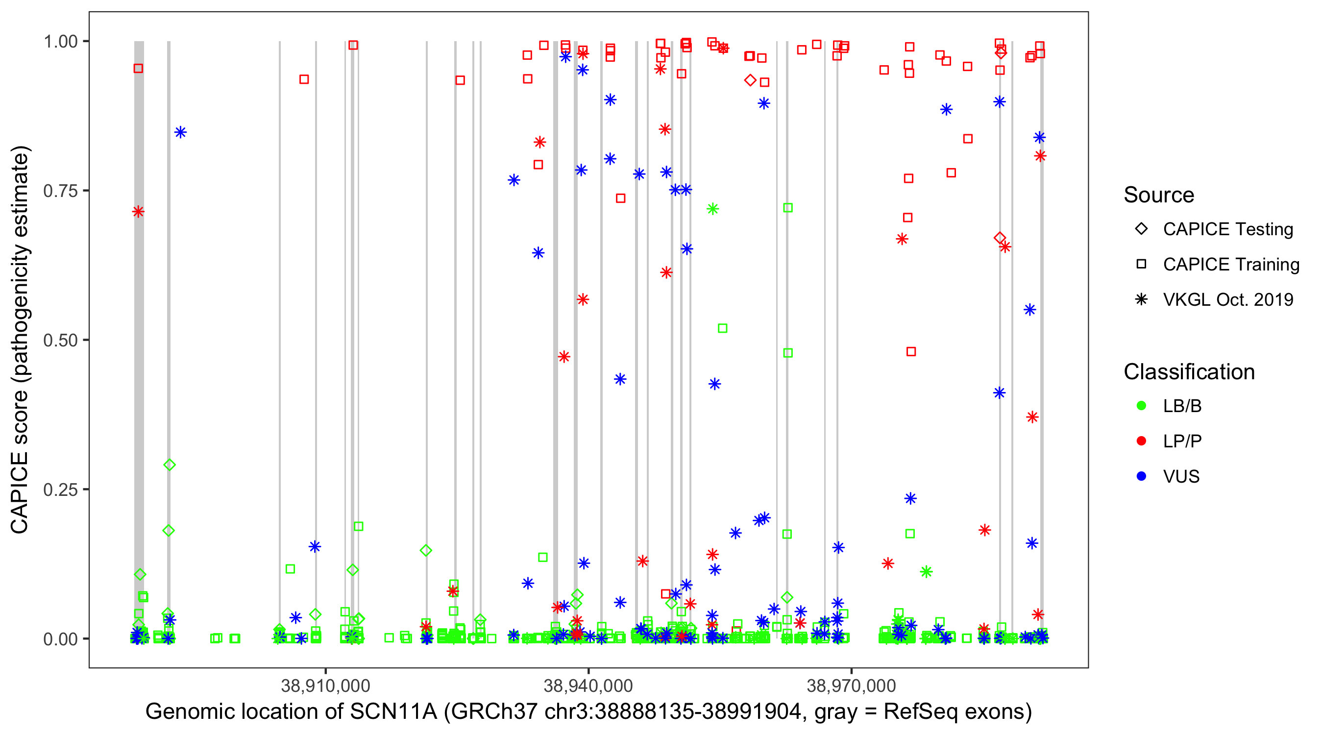 Shown are CAPICE train/test variants plus VKGL Oct 2019.