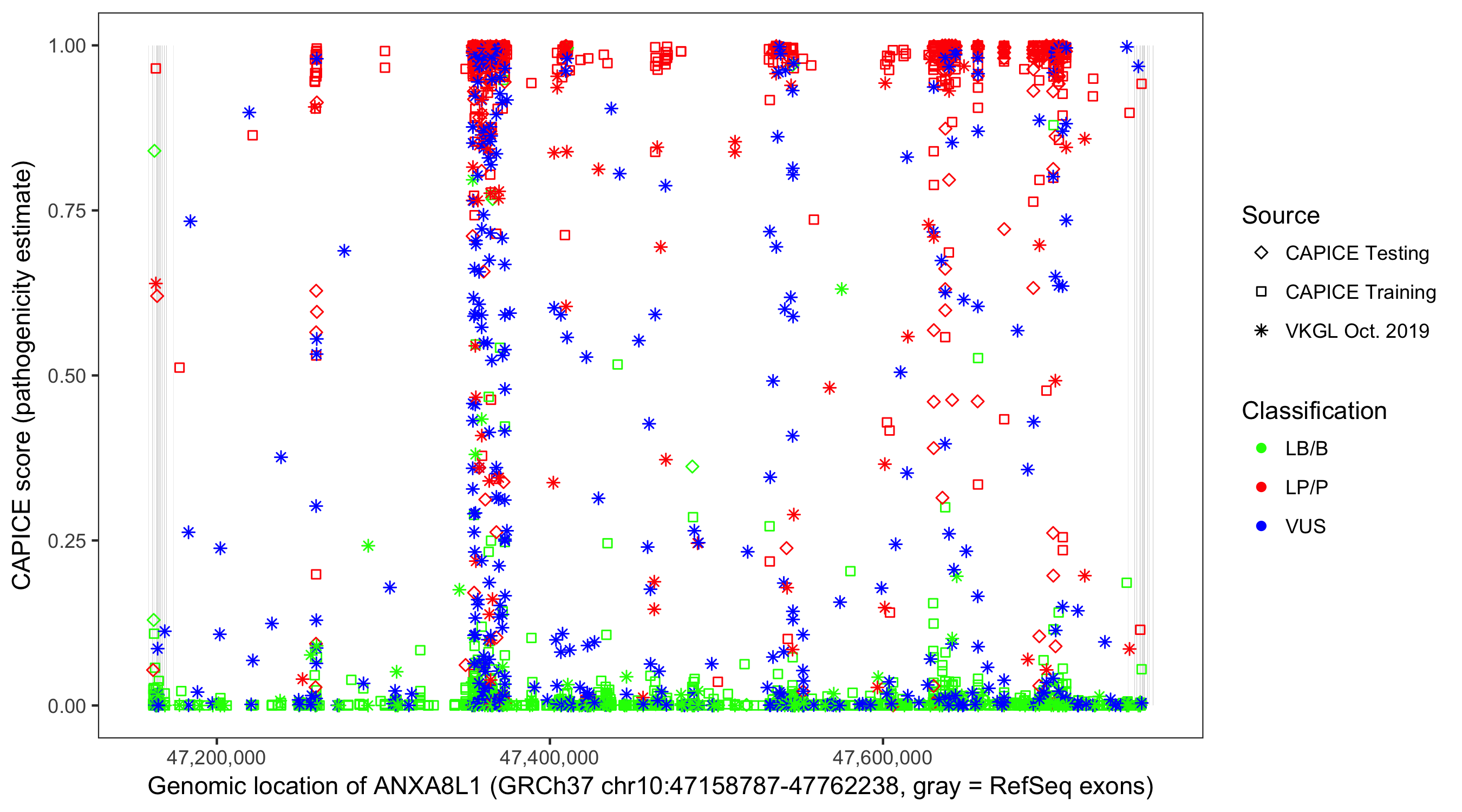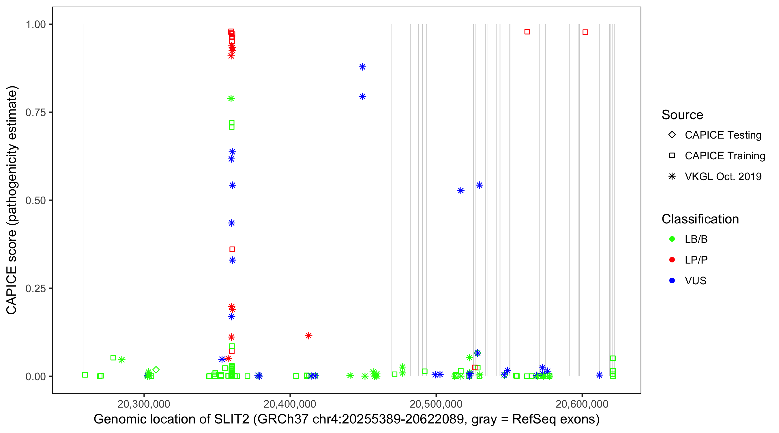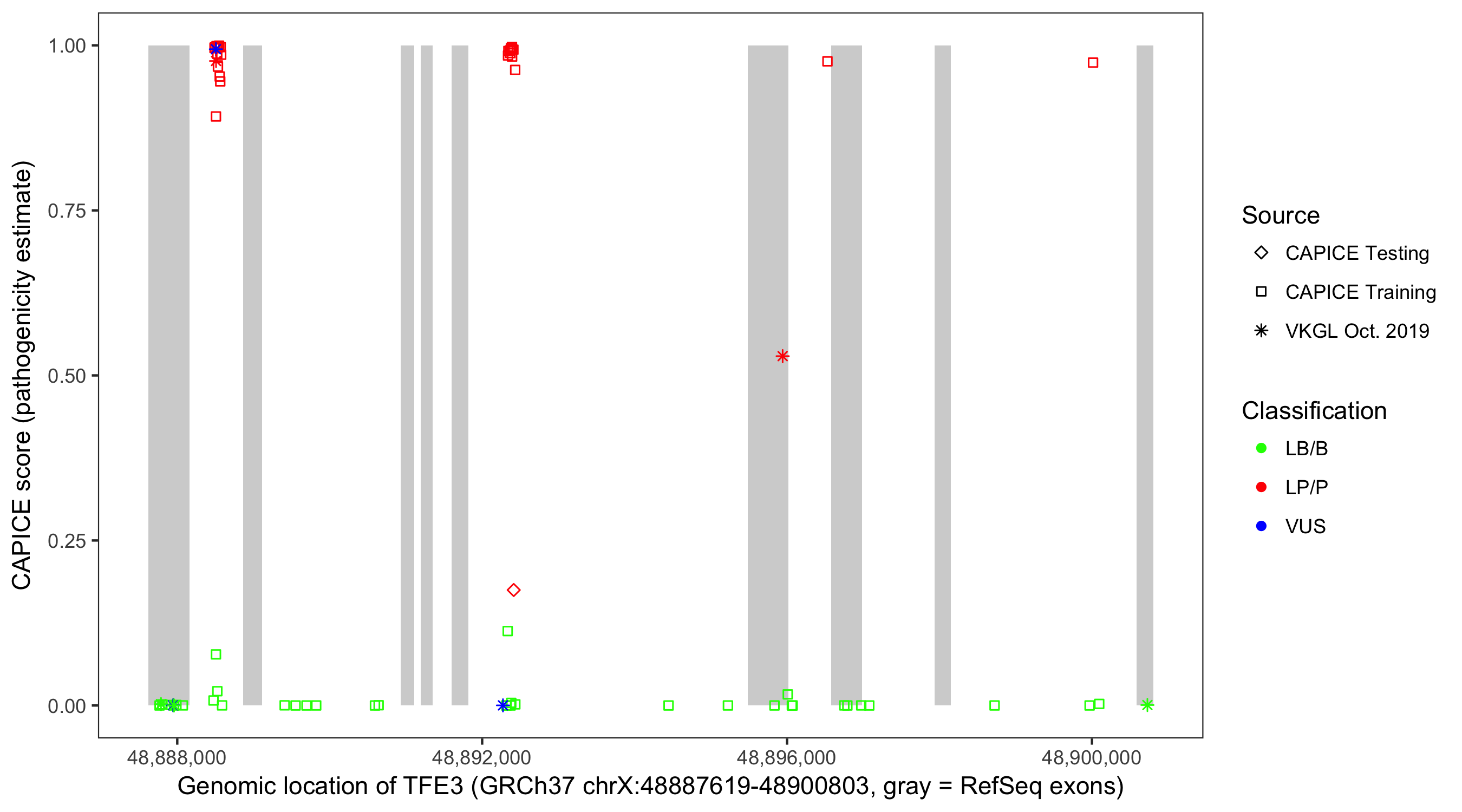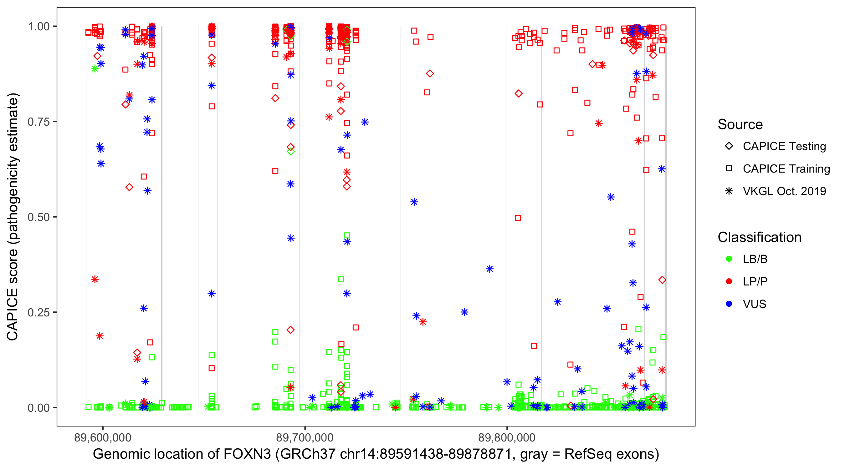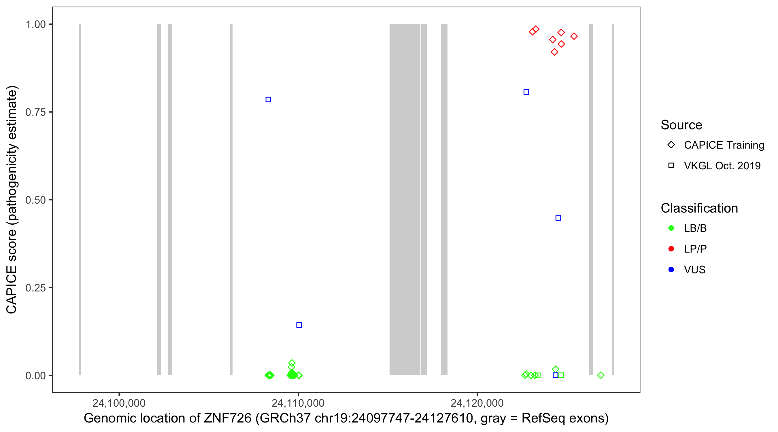 Shown are CAPICE train/test variants plus VKGL Oct 2019.