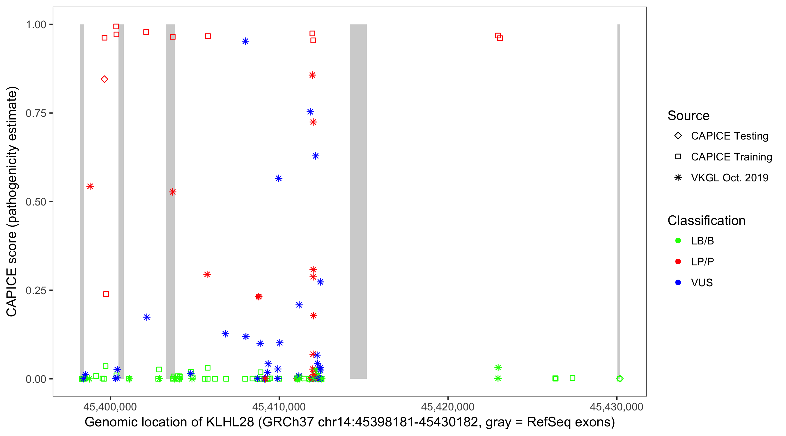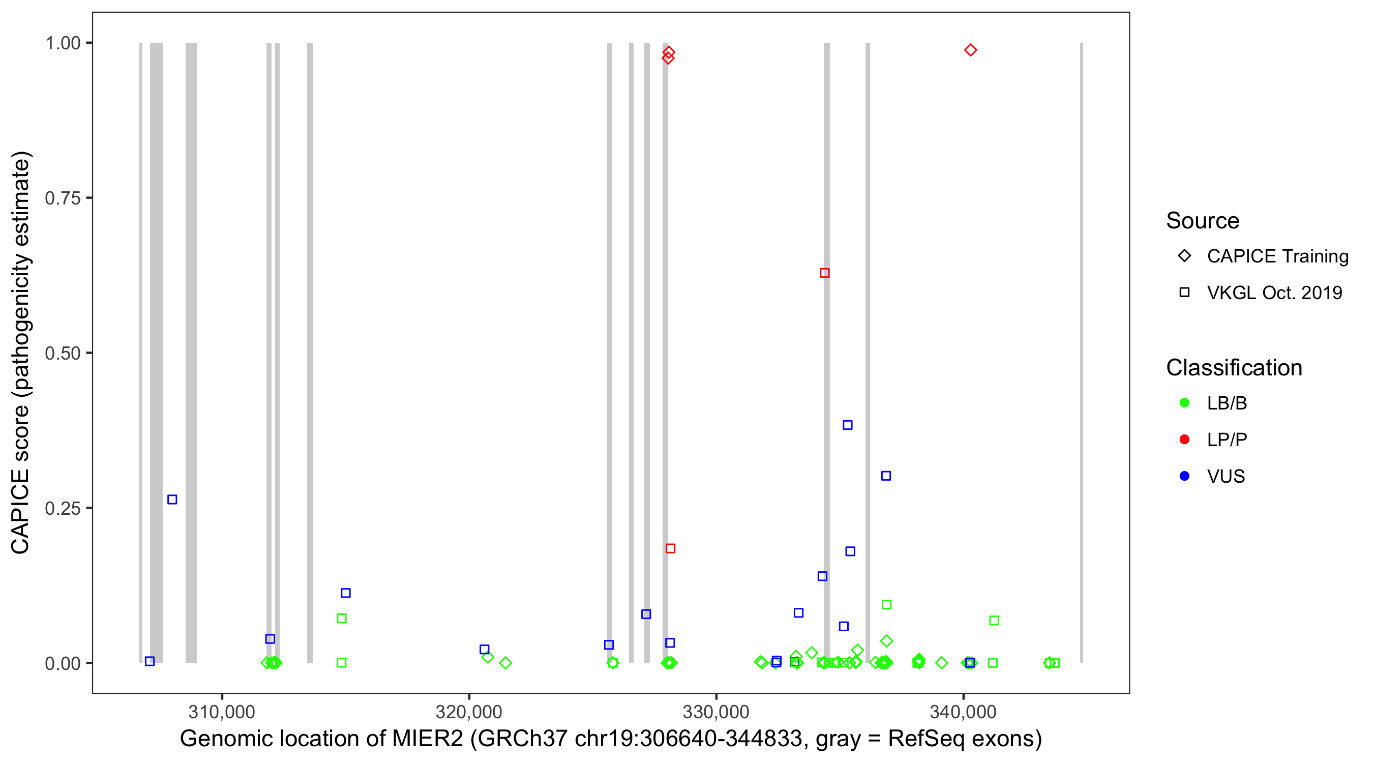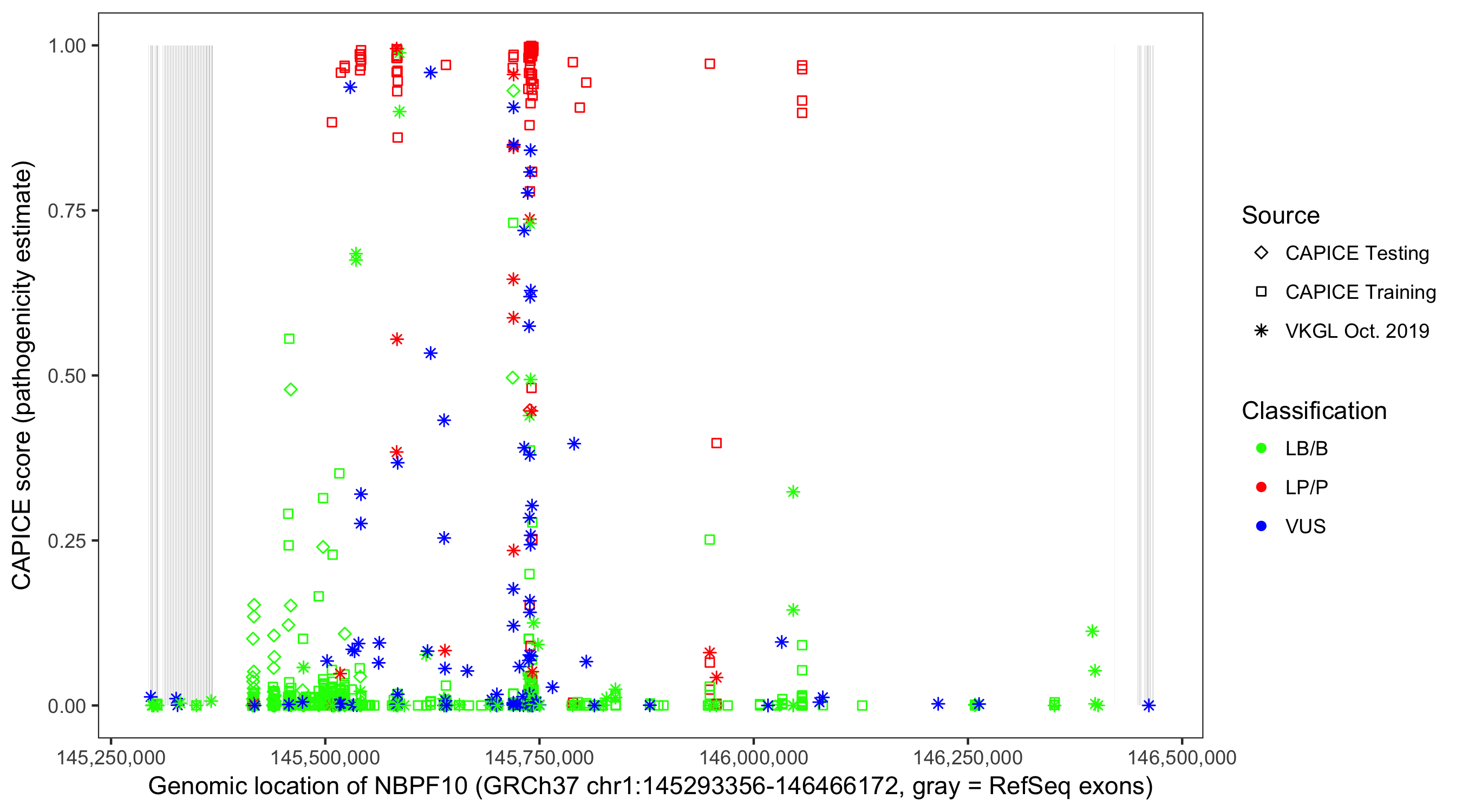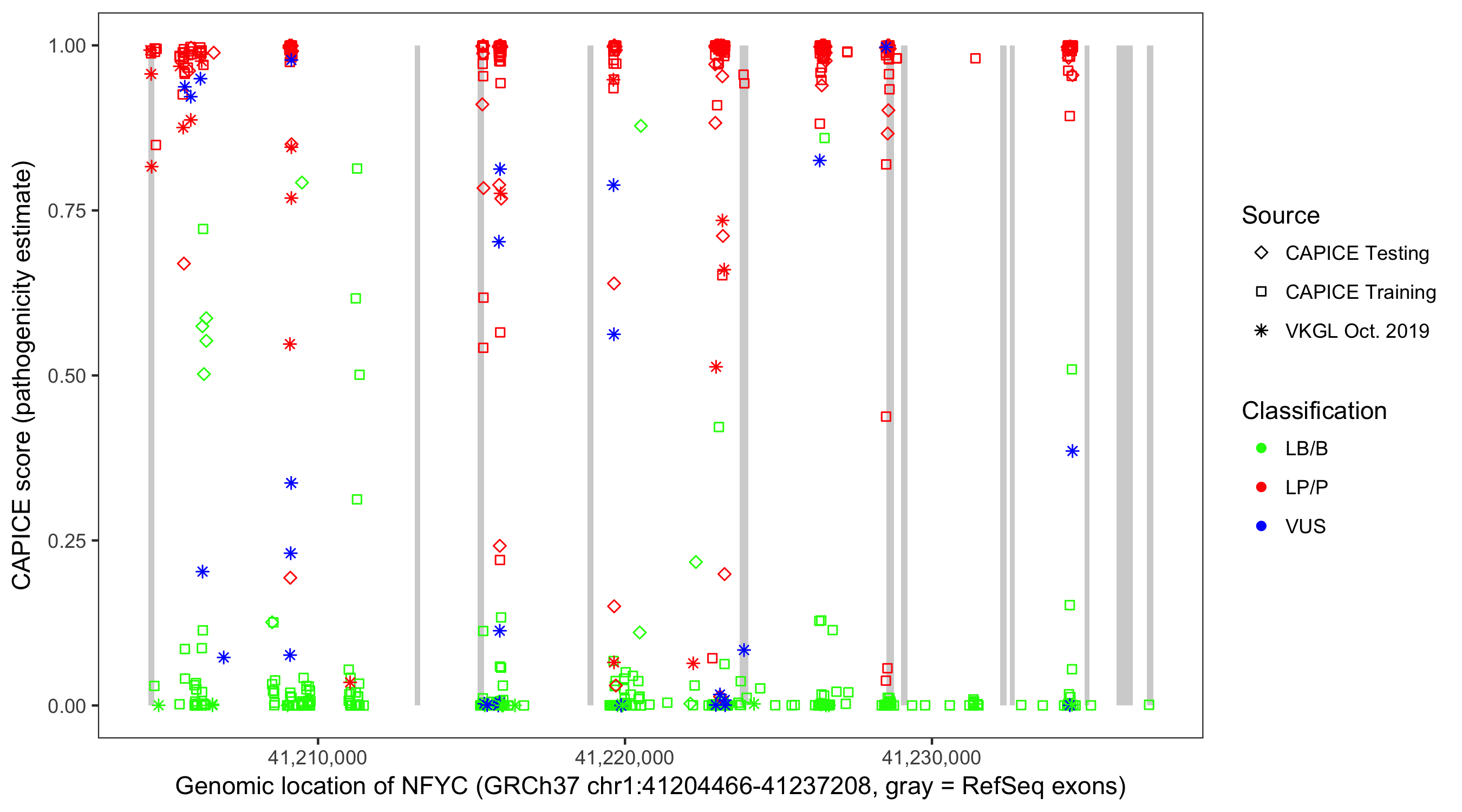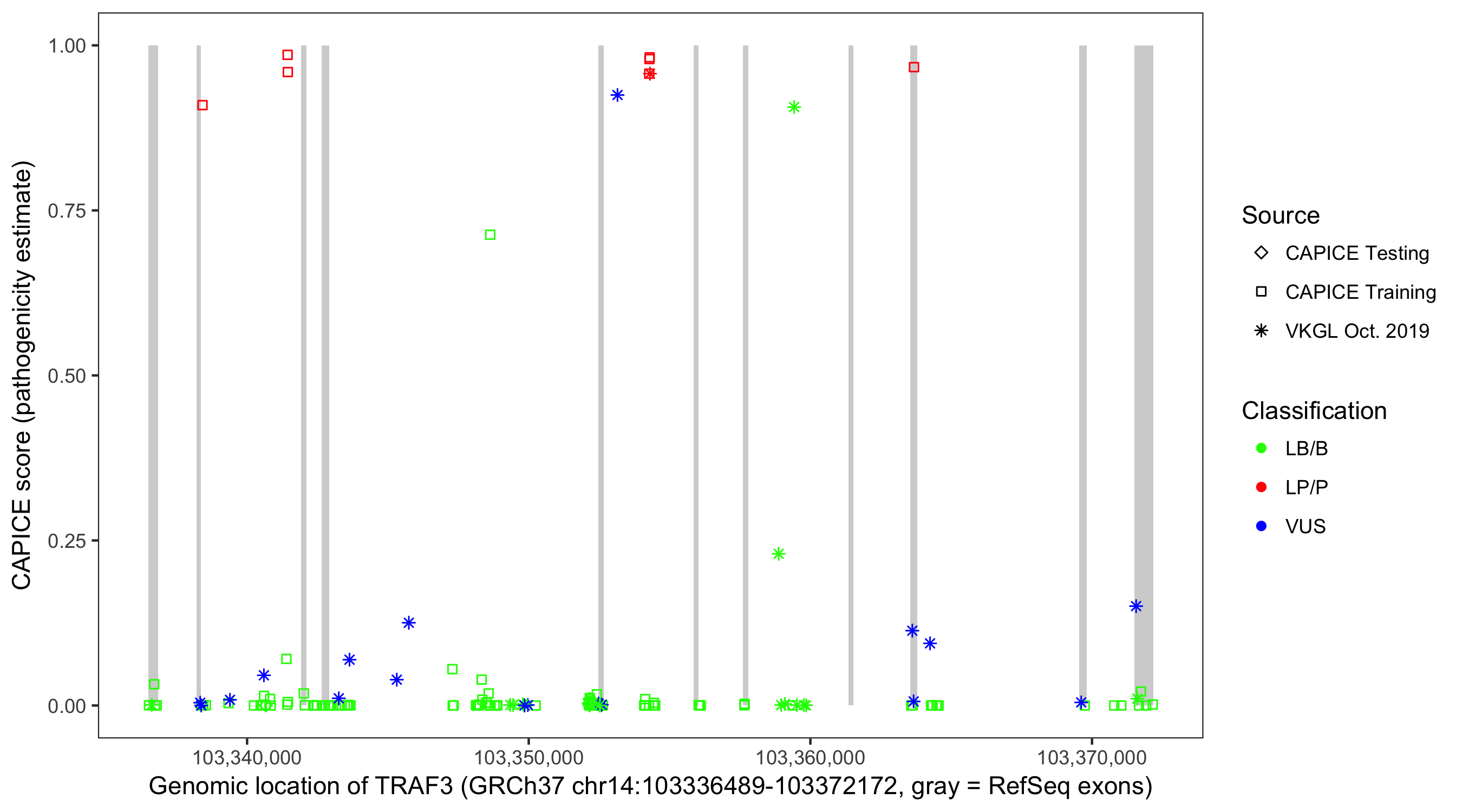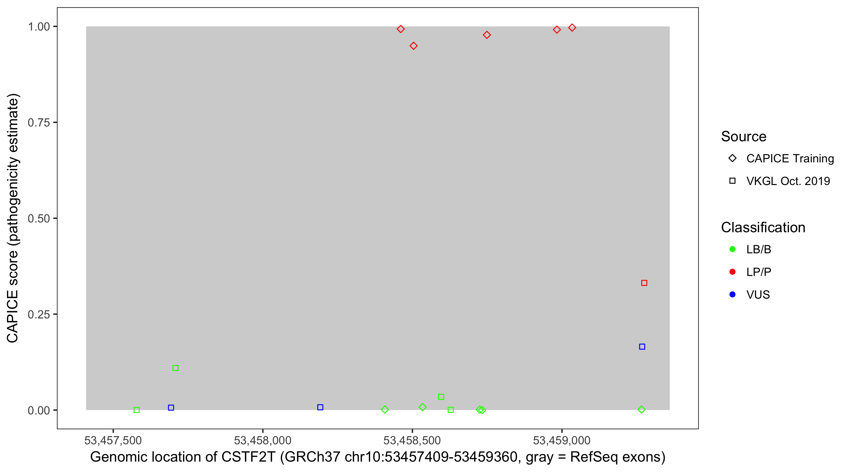 Shown are CAPICE train/test variants plus VKGL Oct 2019.