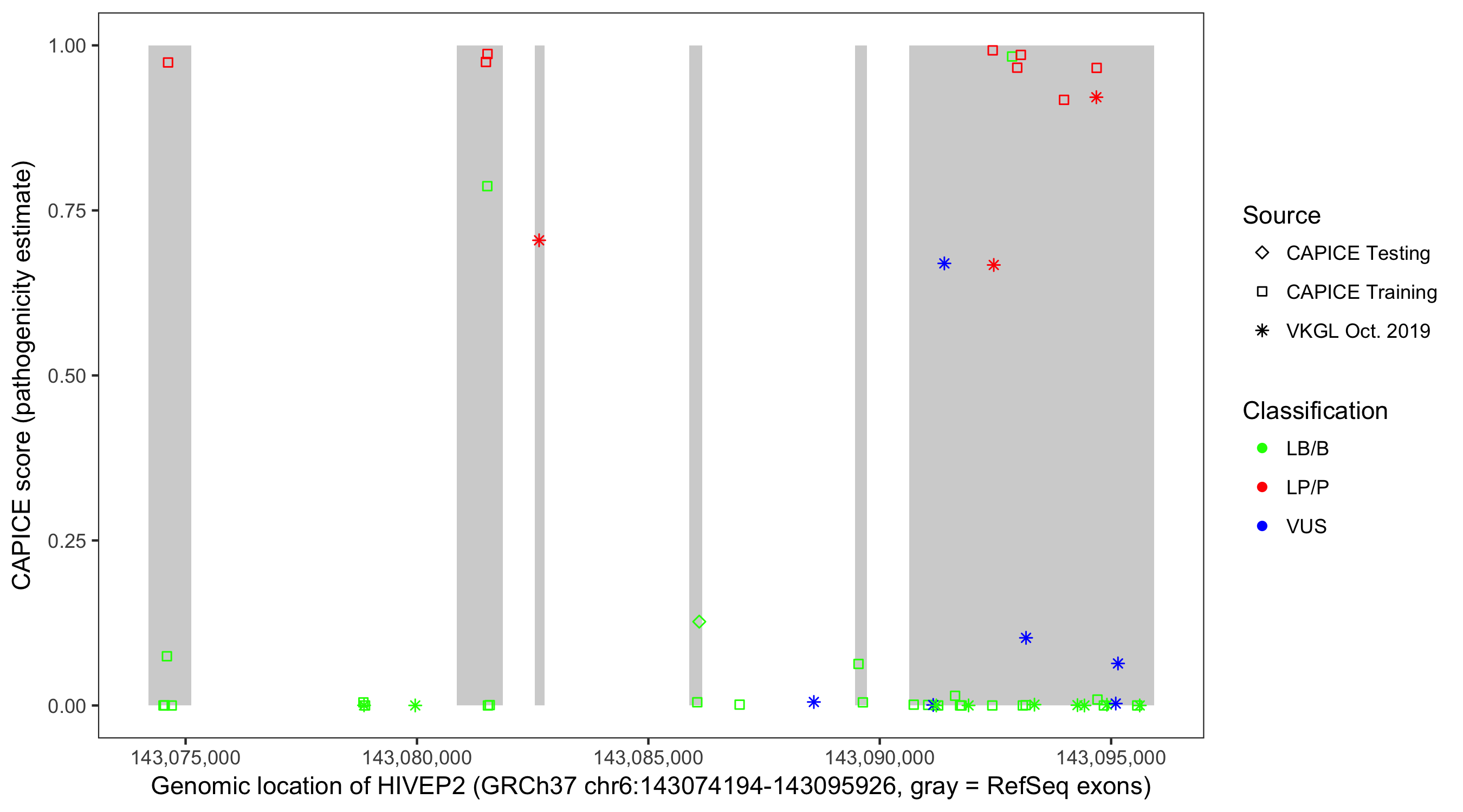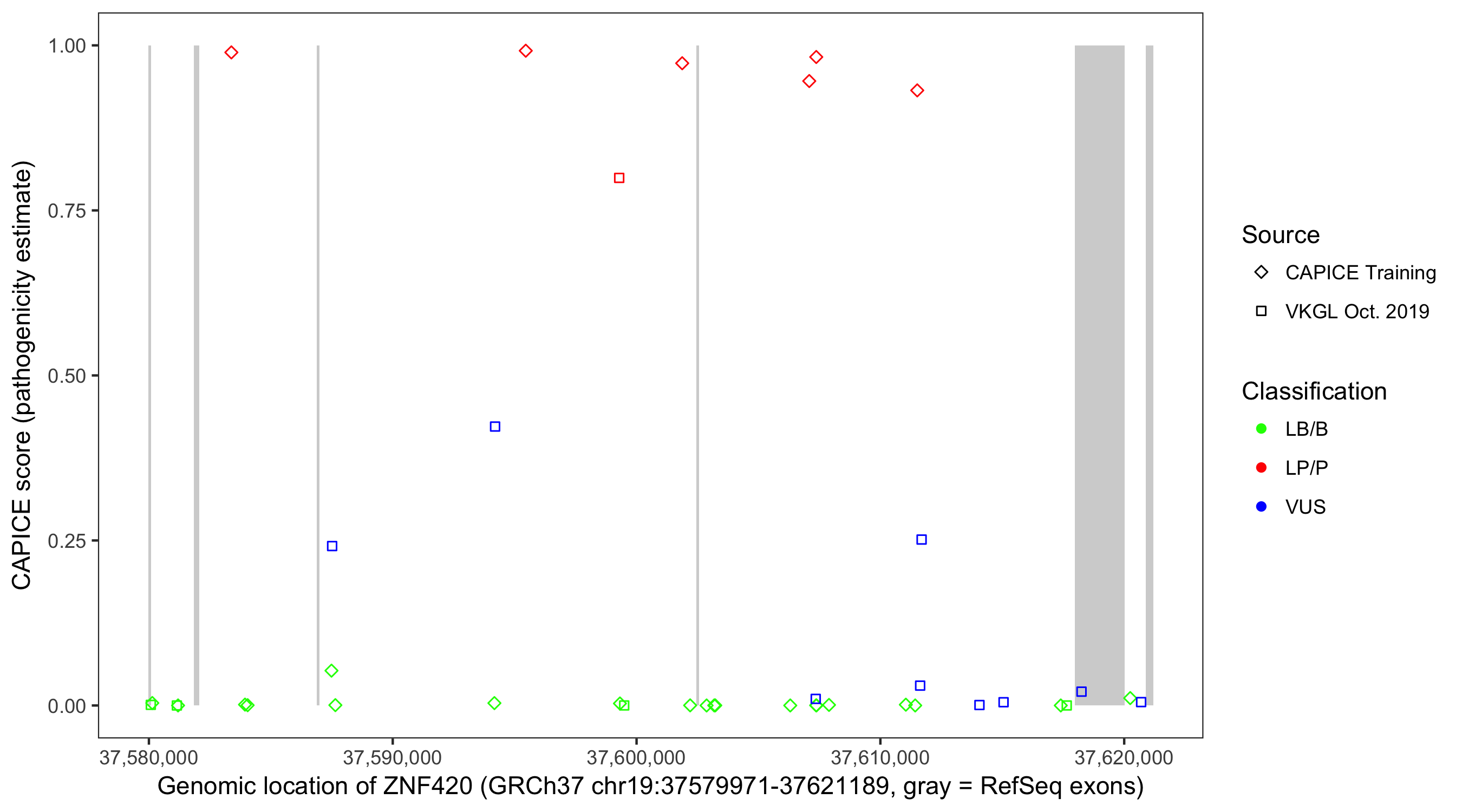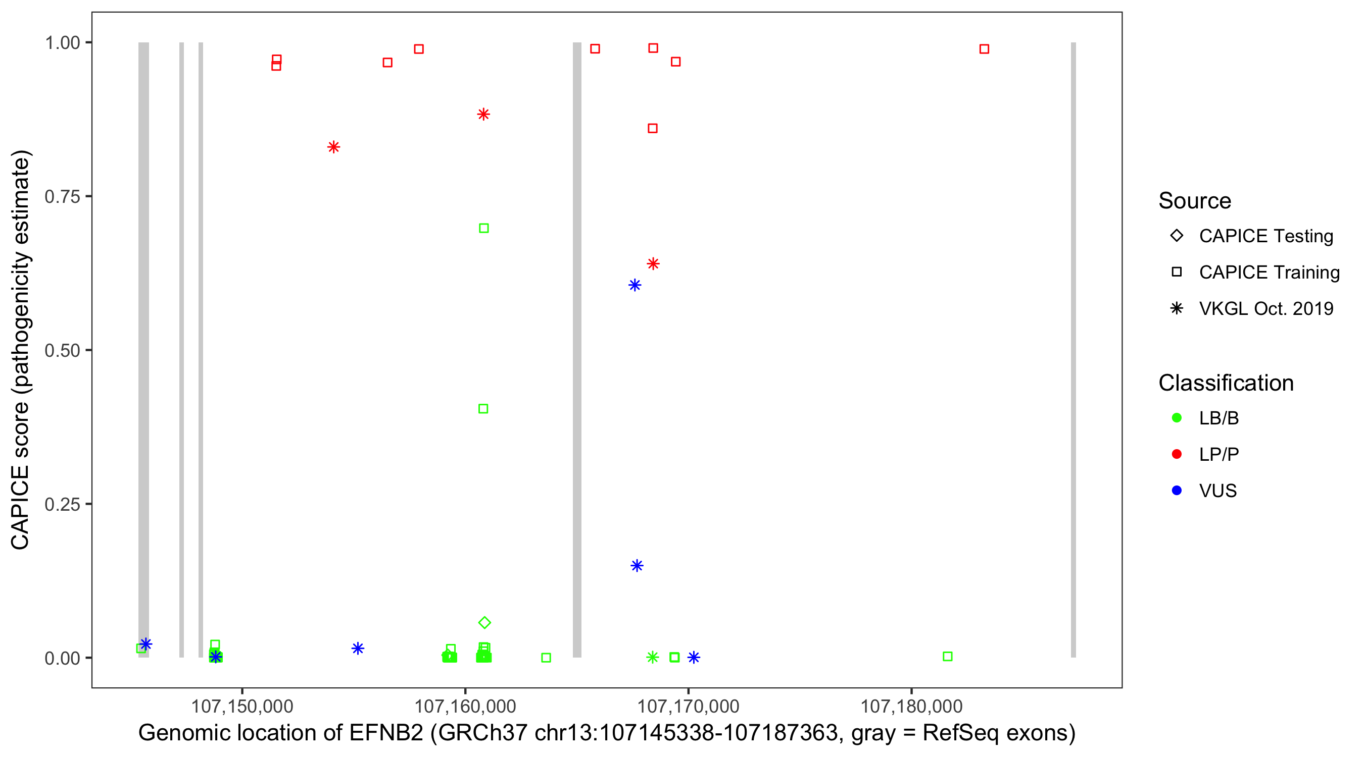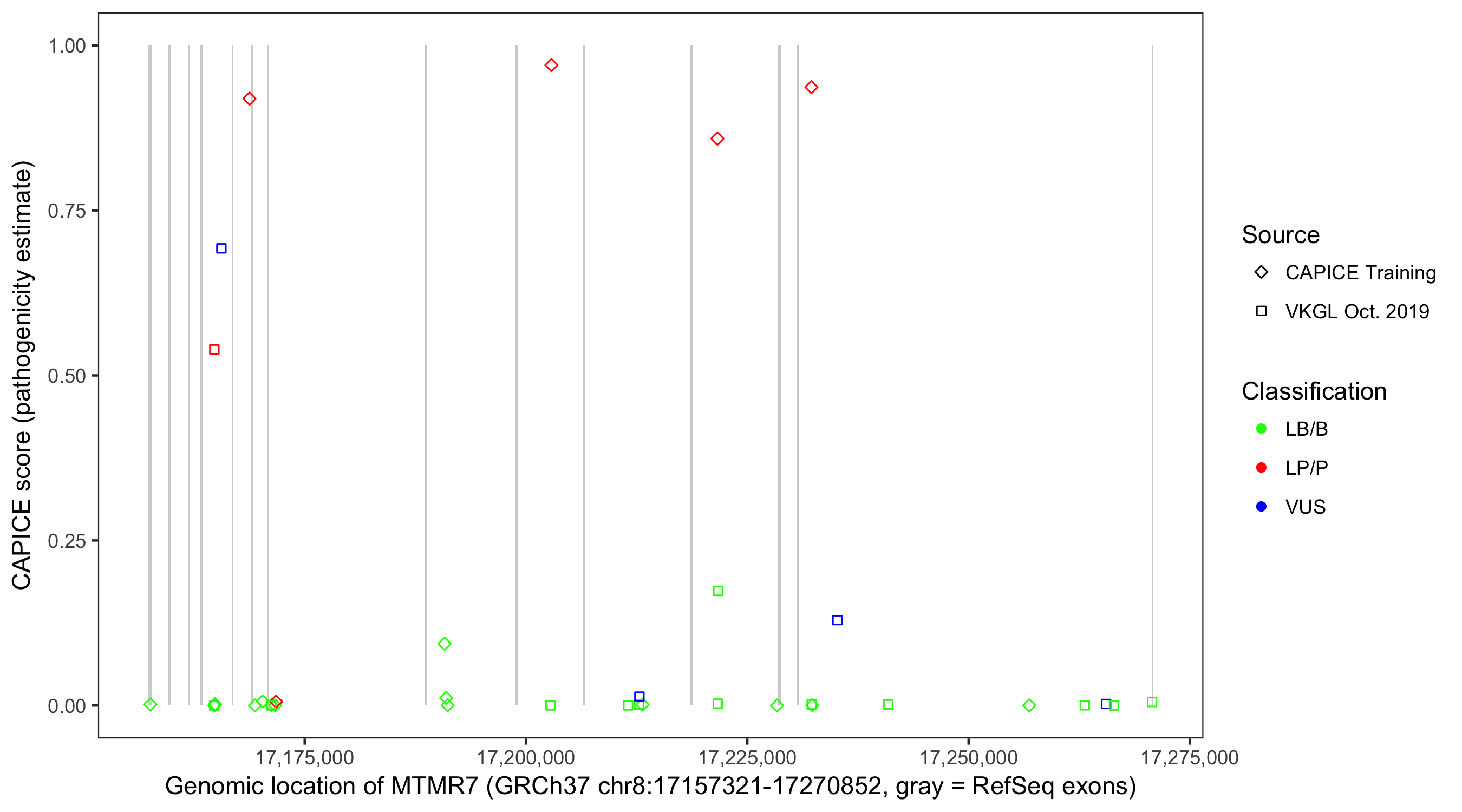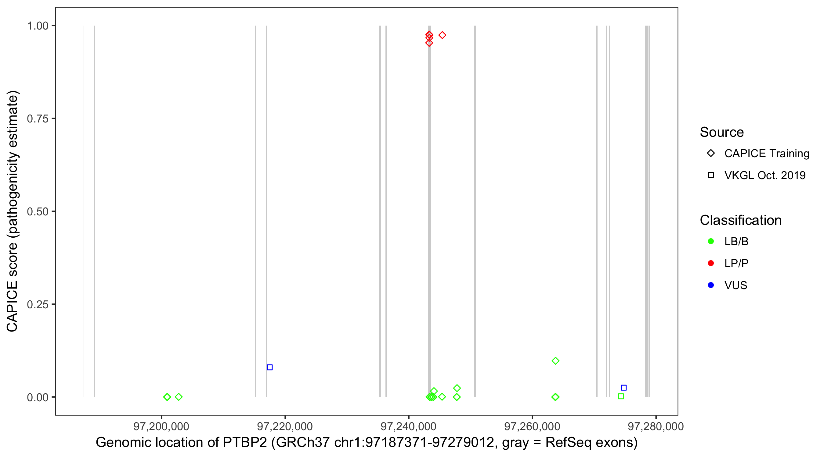 Shown are CAPICE train/test variants plus VKGL Oct 2019.