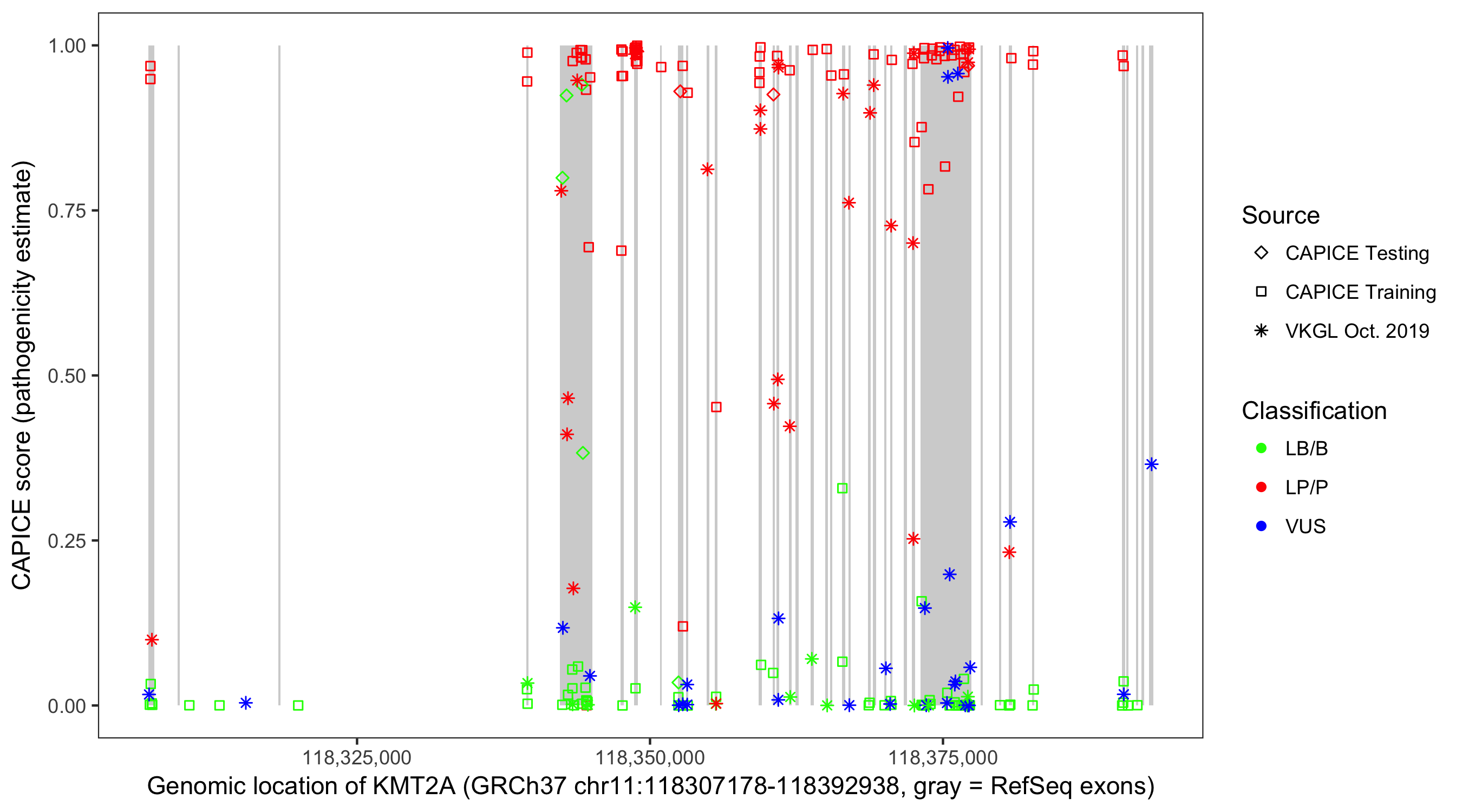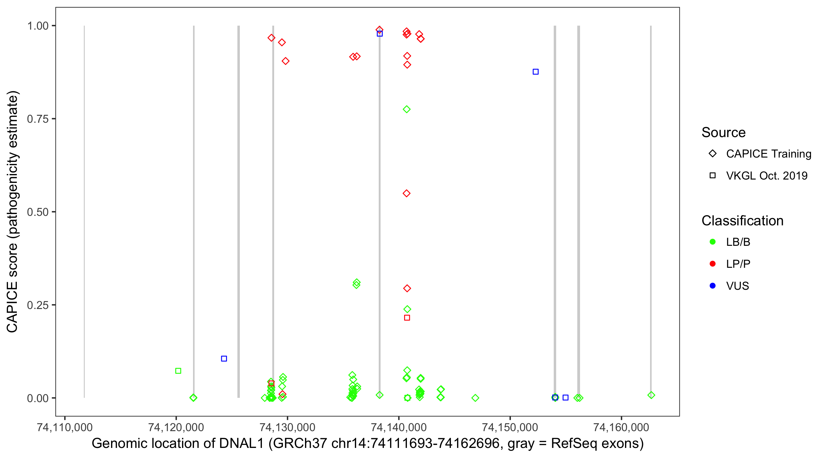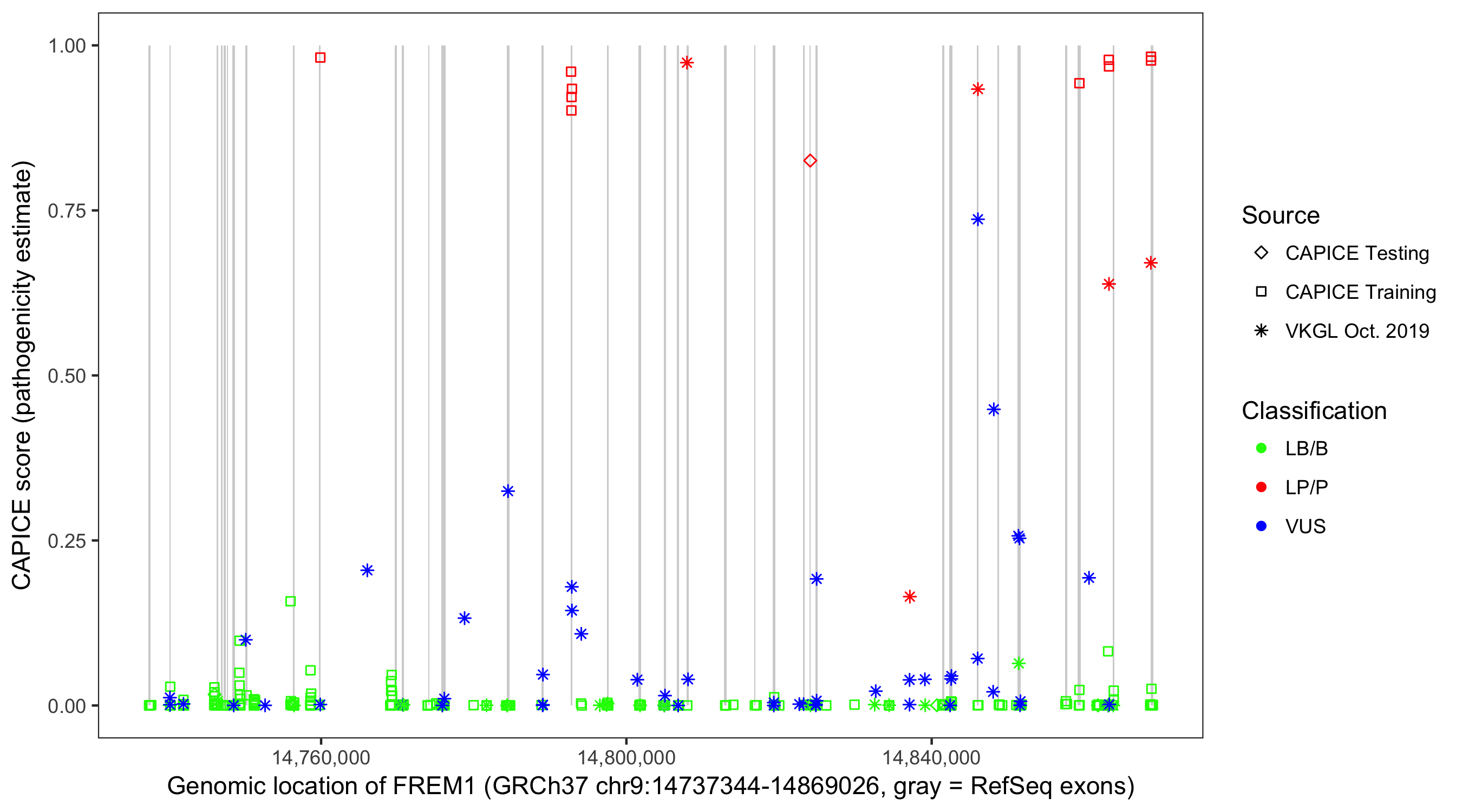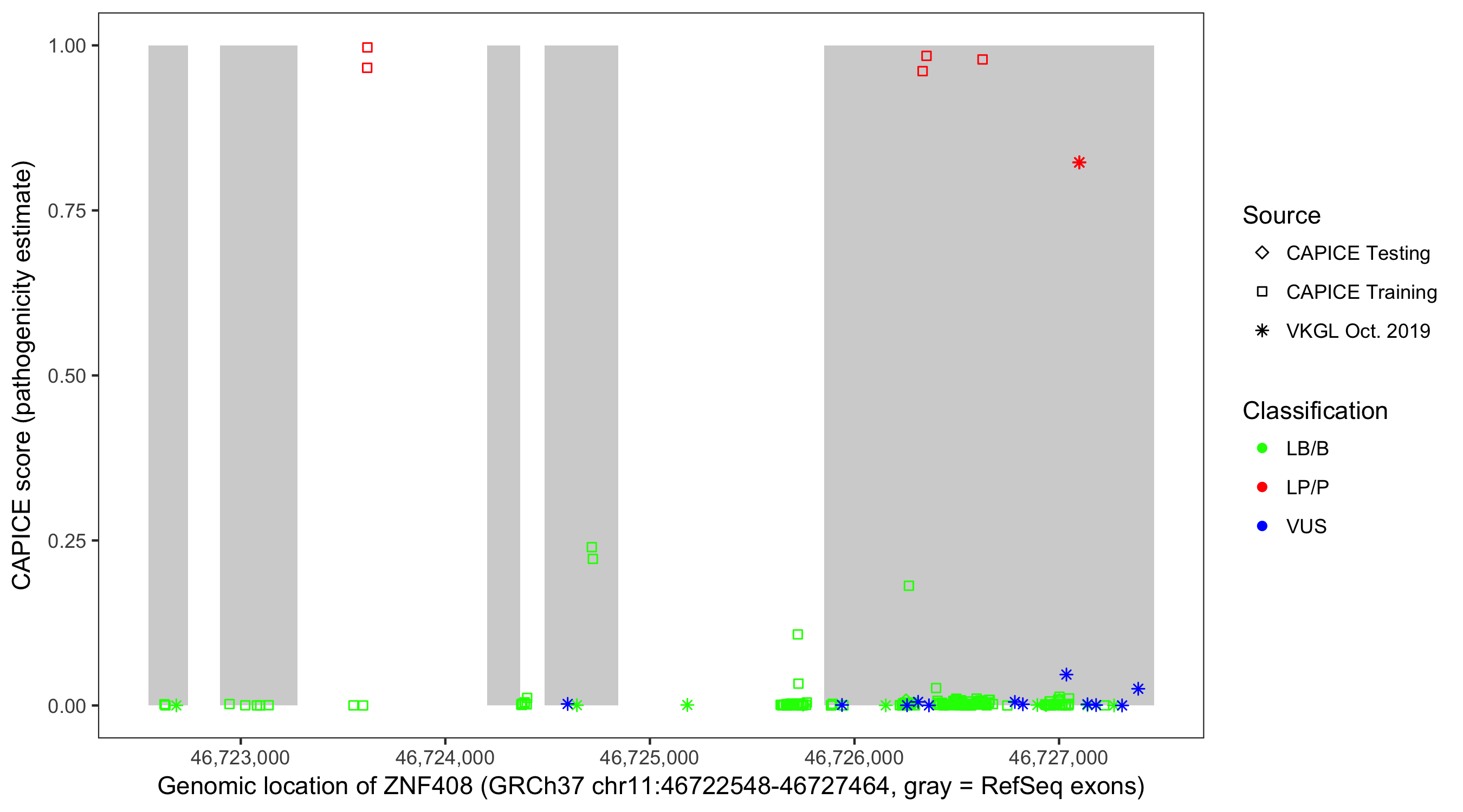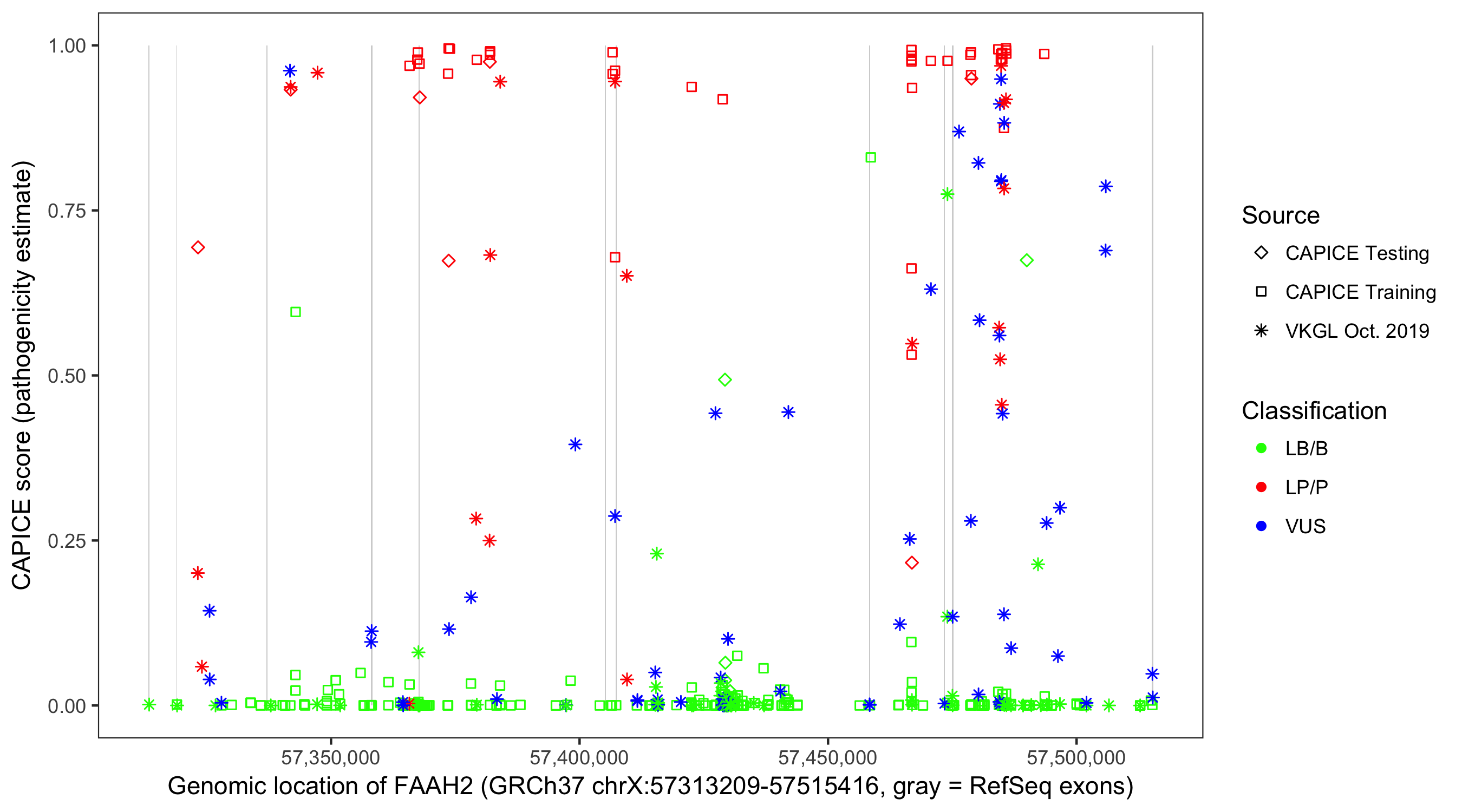 Shown are CAPICE train/test variants plus VKGL Oct 2019.
