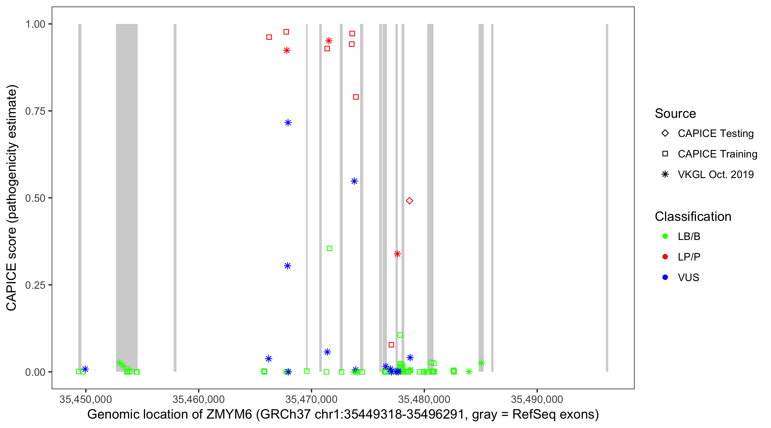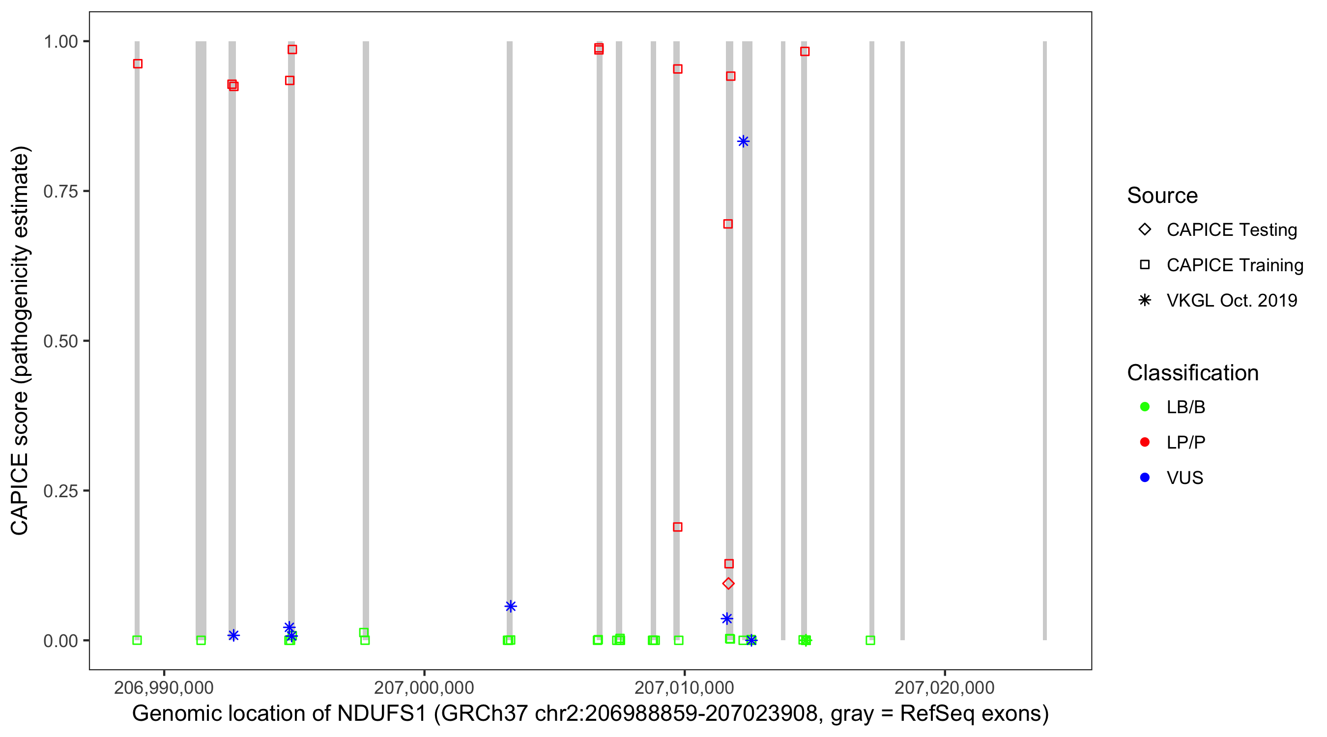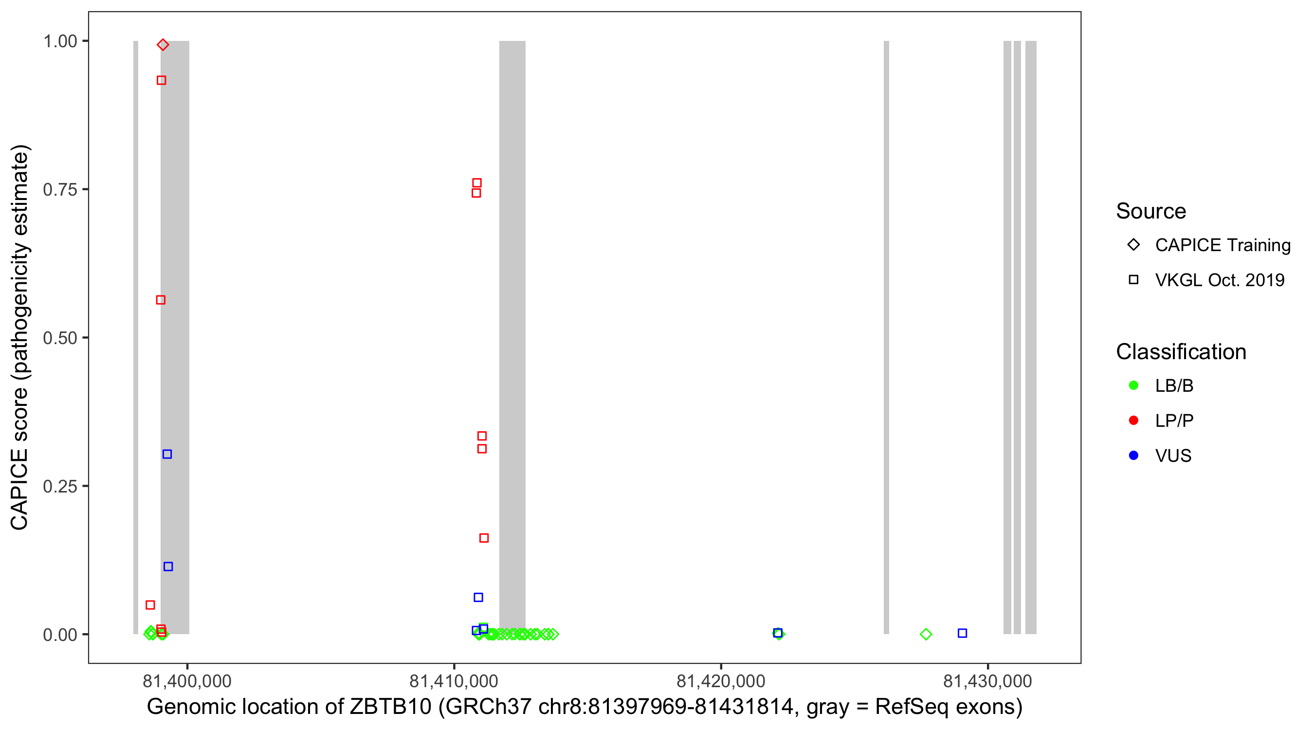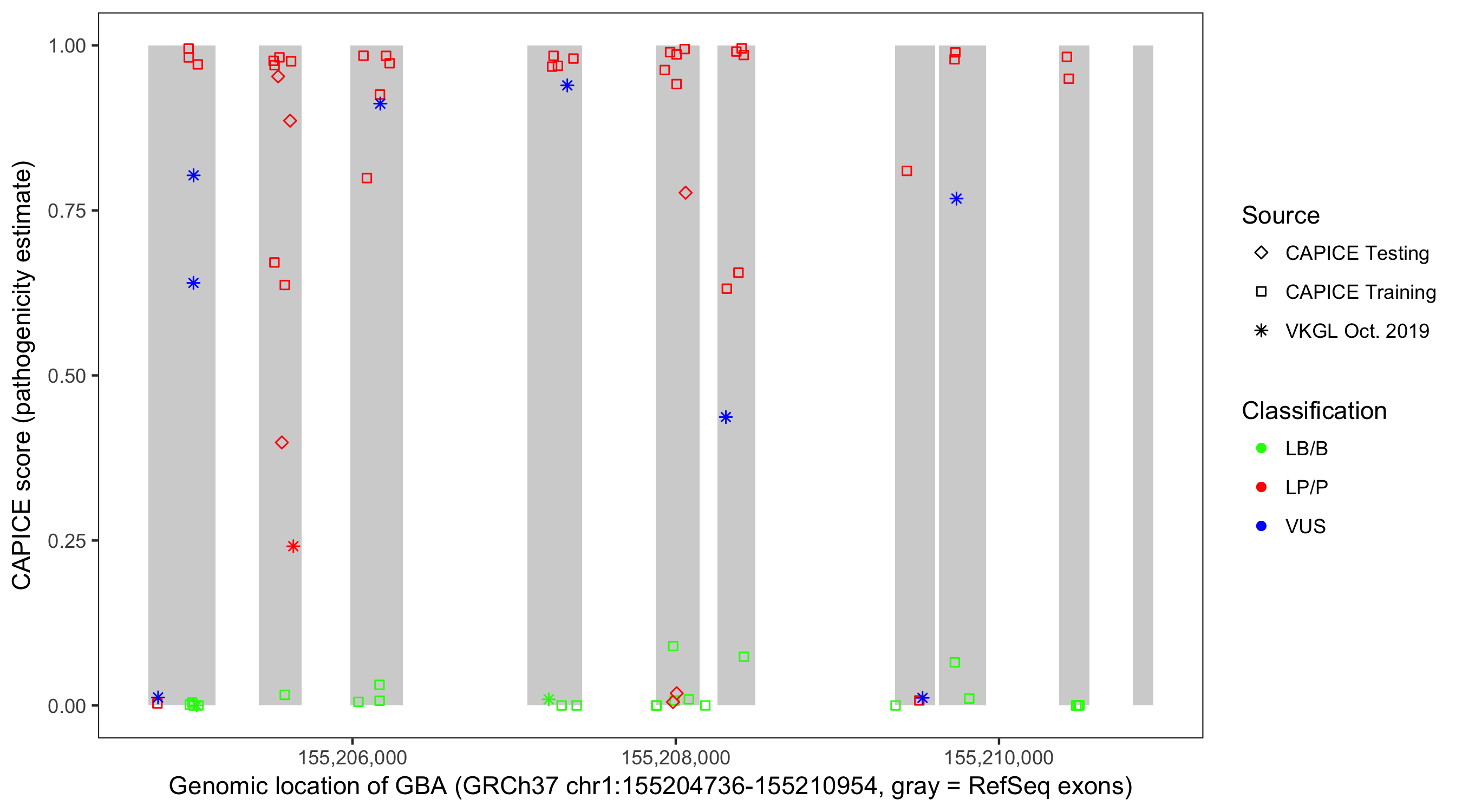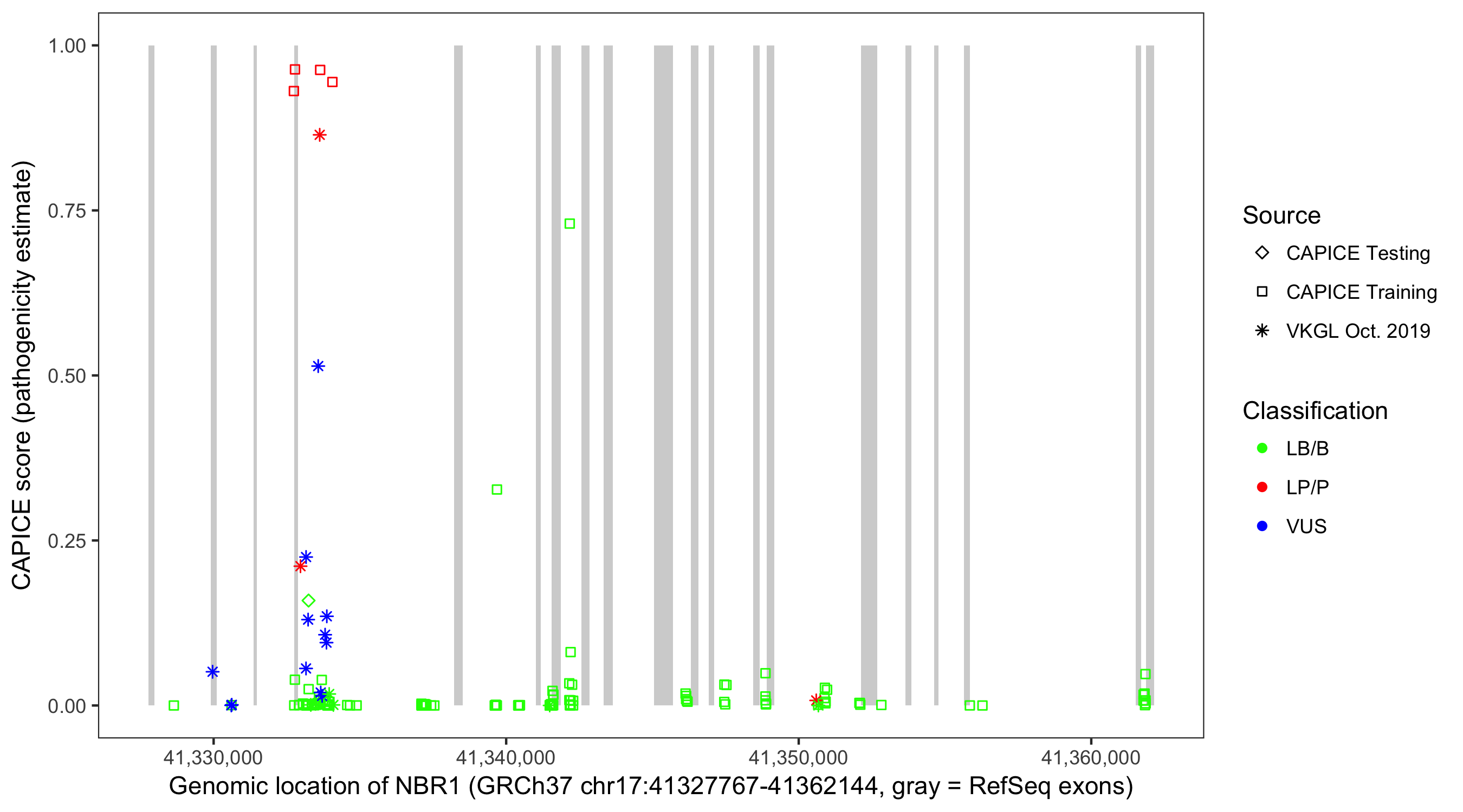 Shown are CAPICE train/test variants plus VKGL Oct 2019.