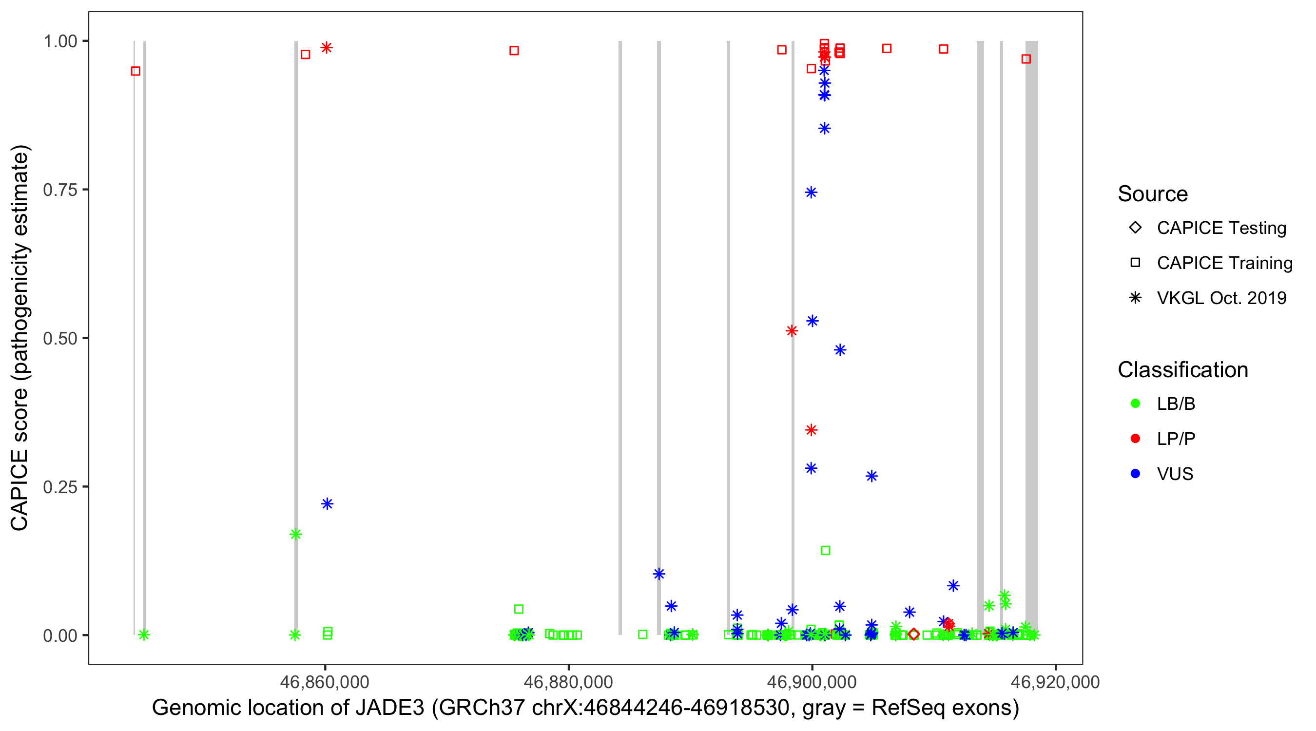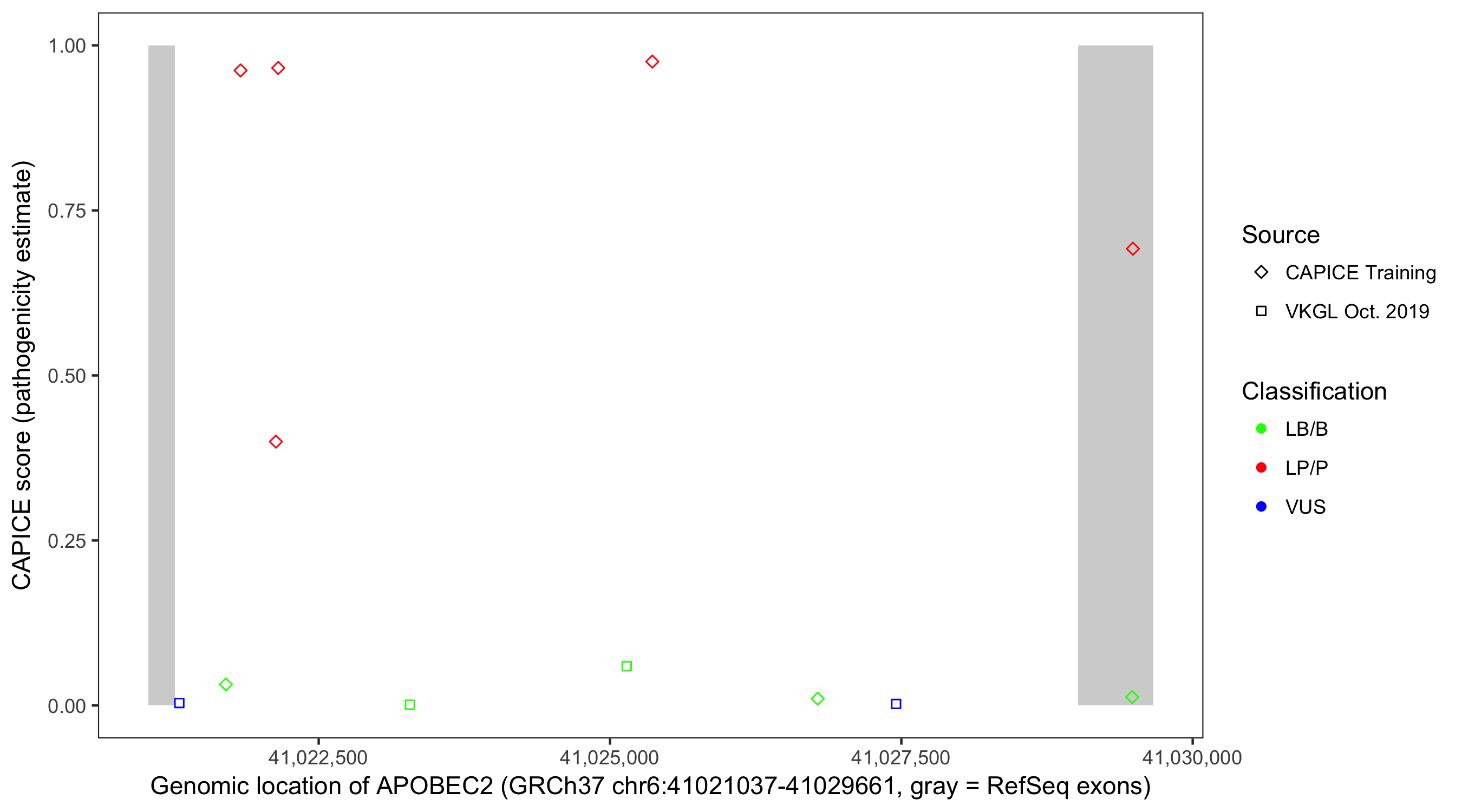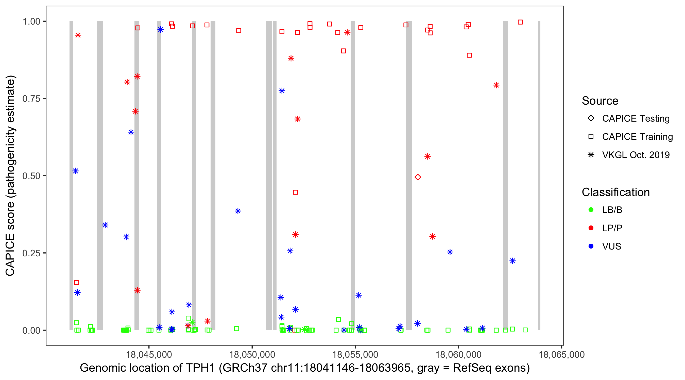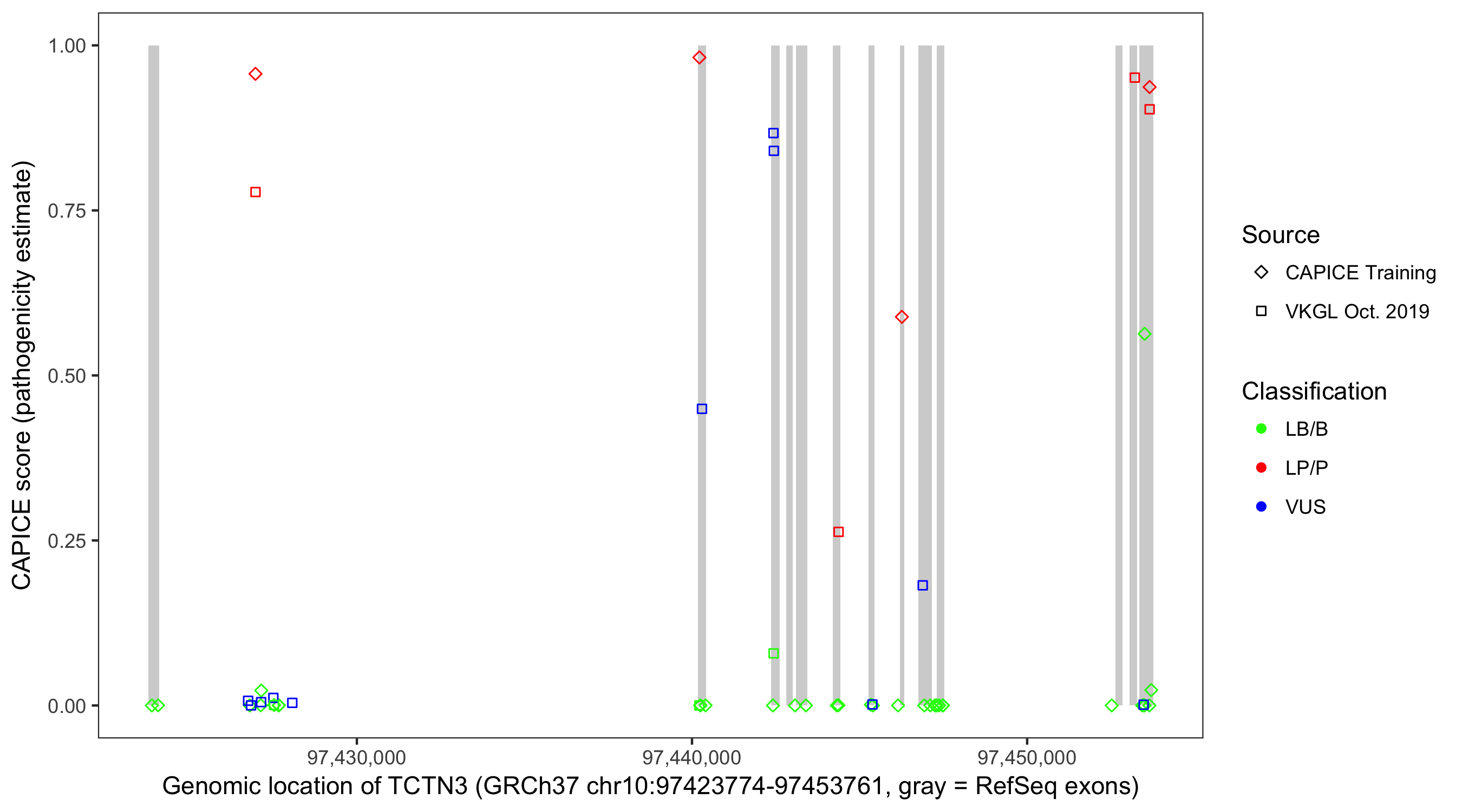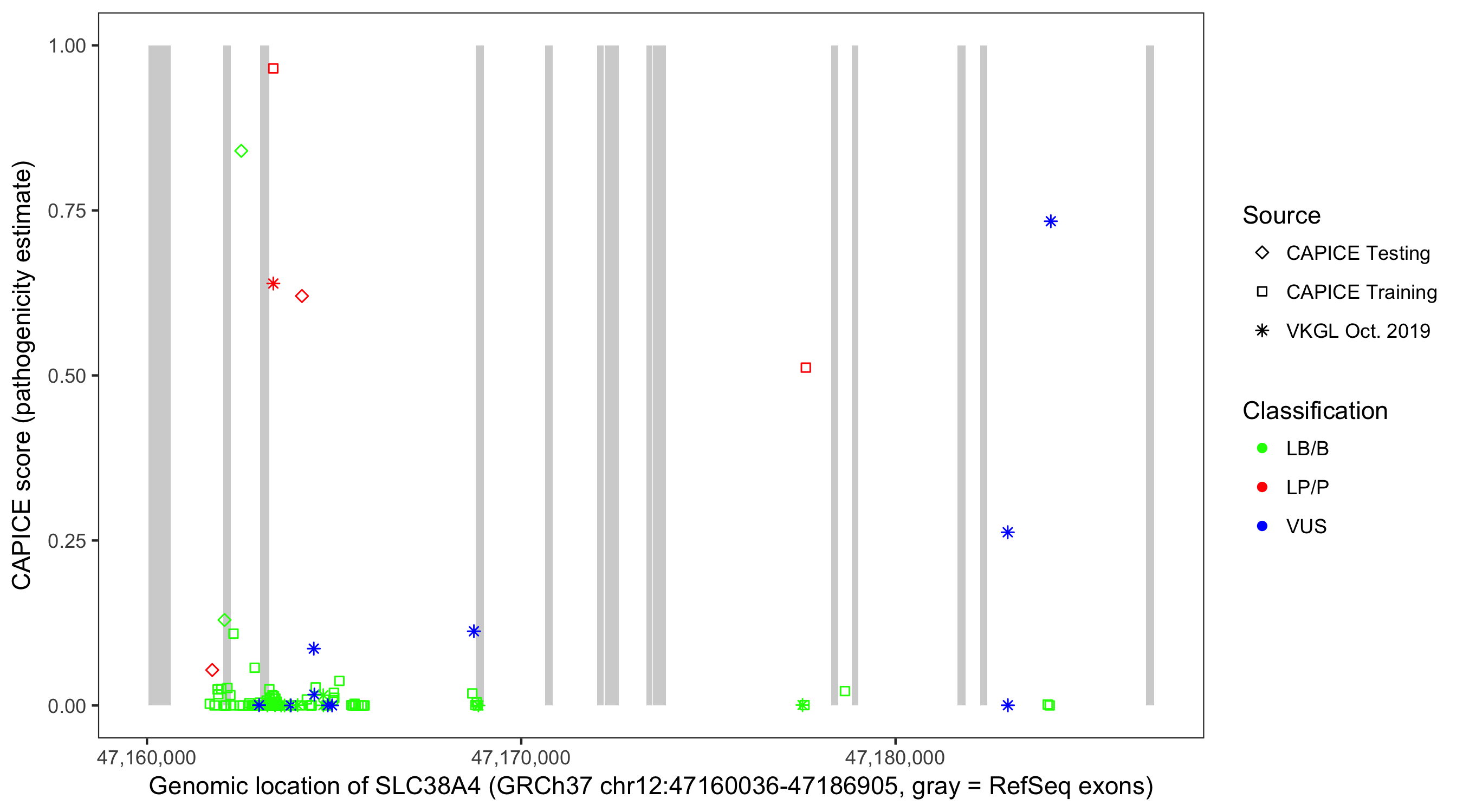 Shown are CAPICE train/test variants plus VKGL Oct 2019.