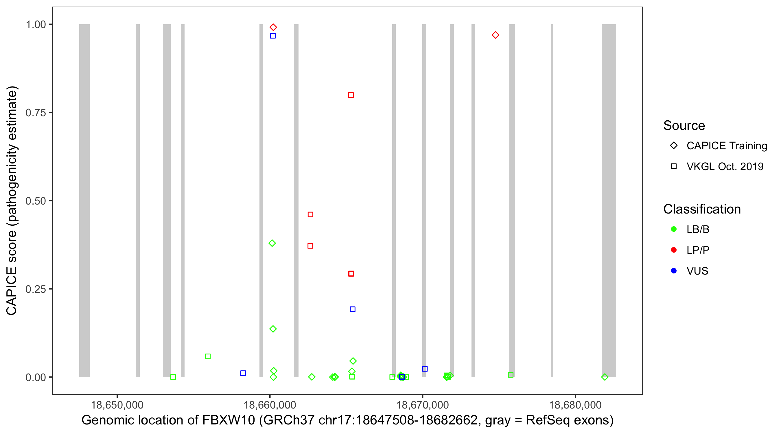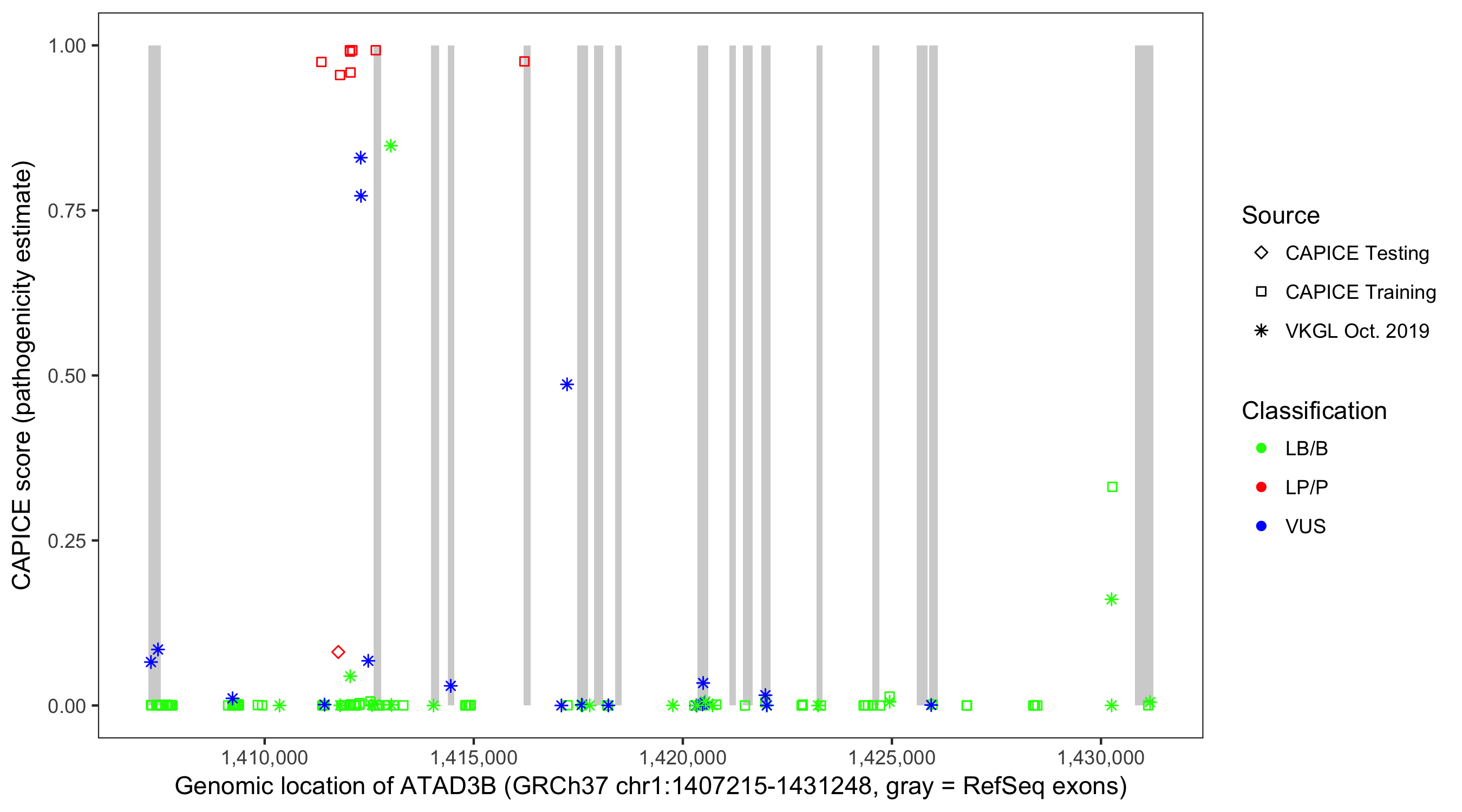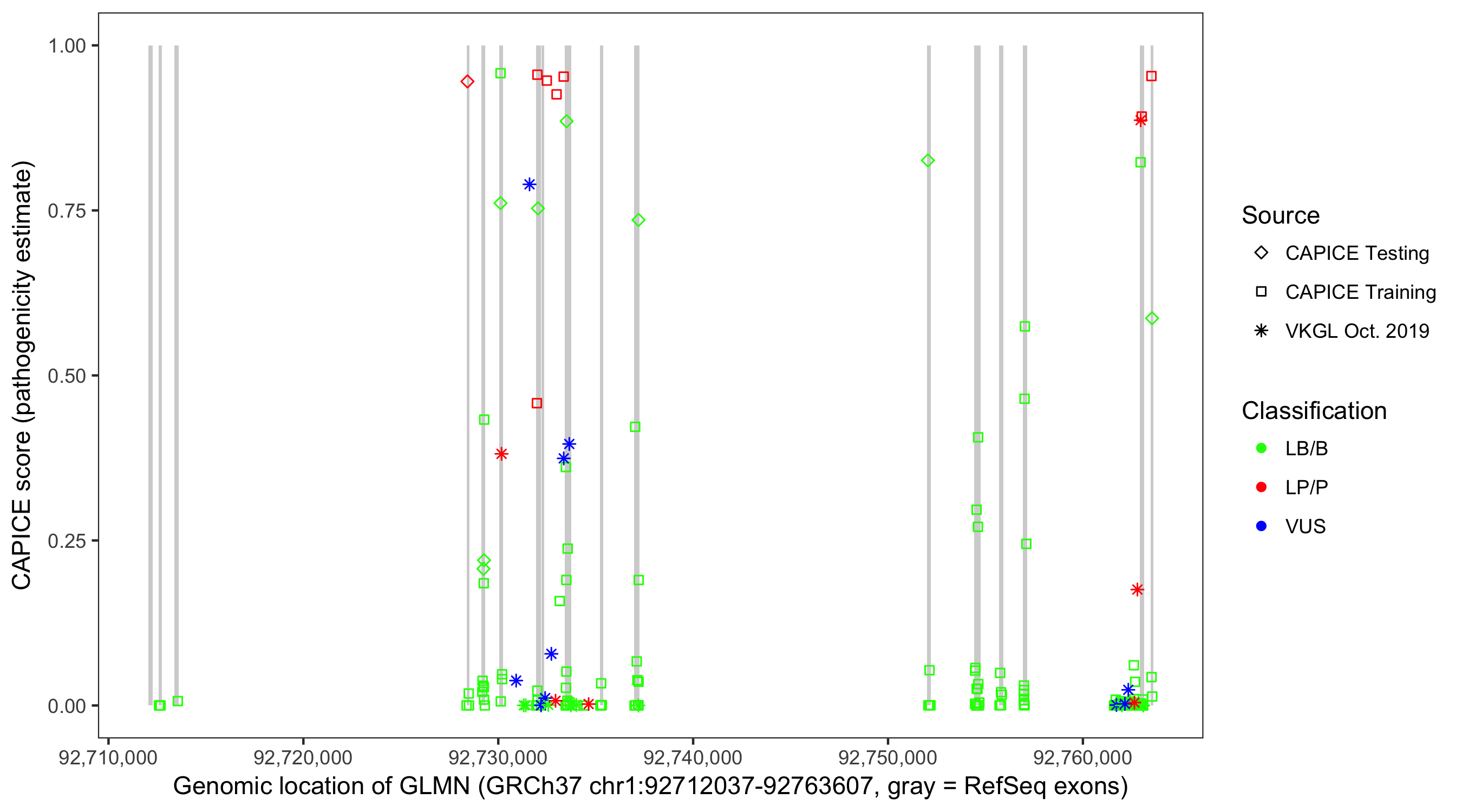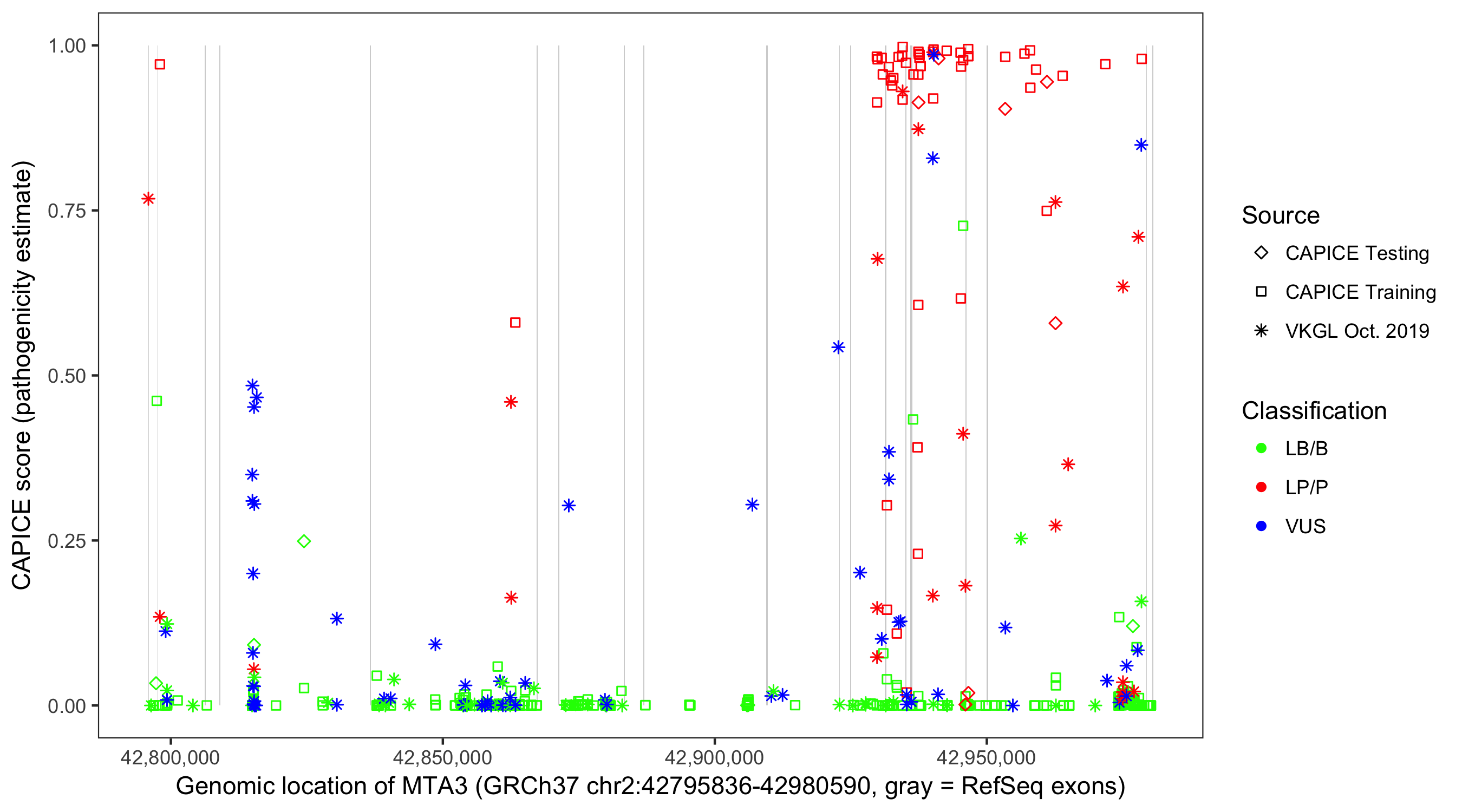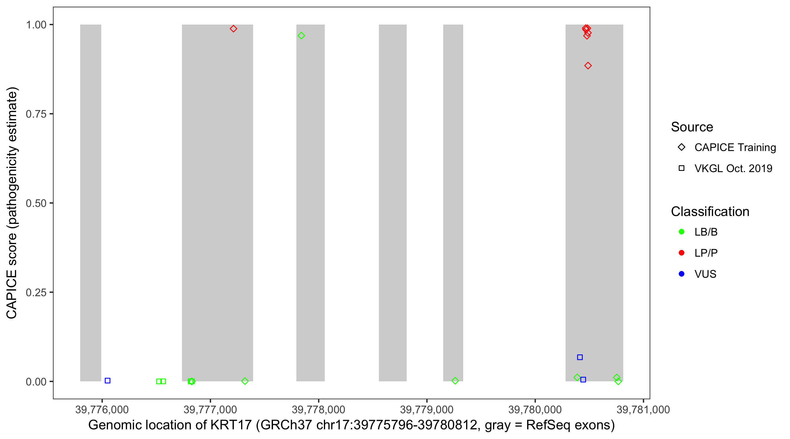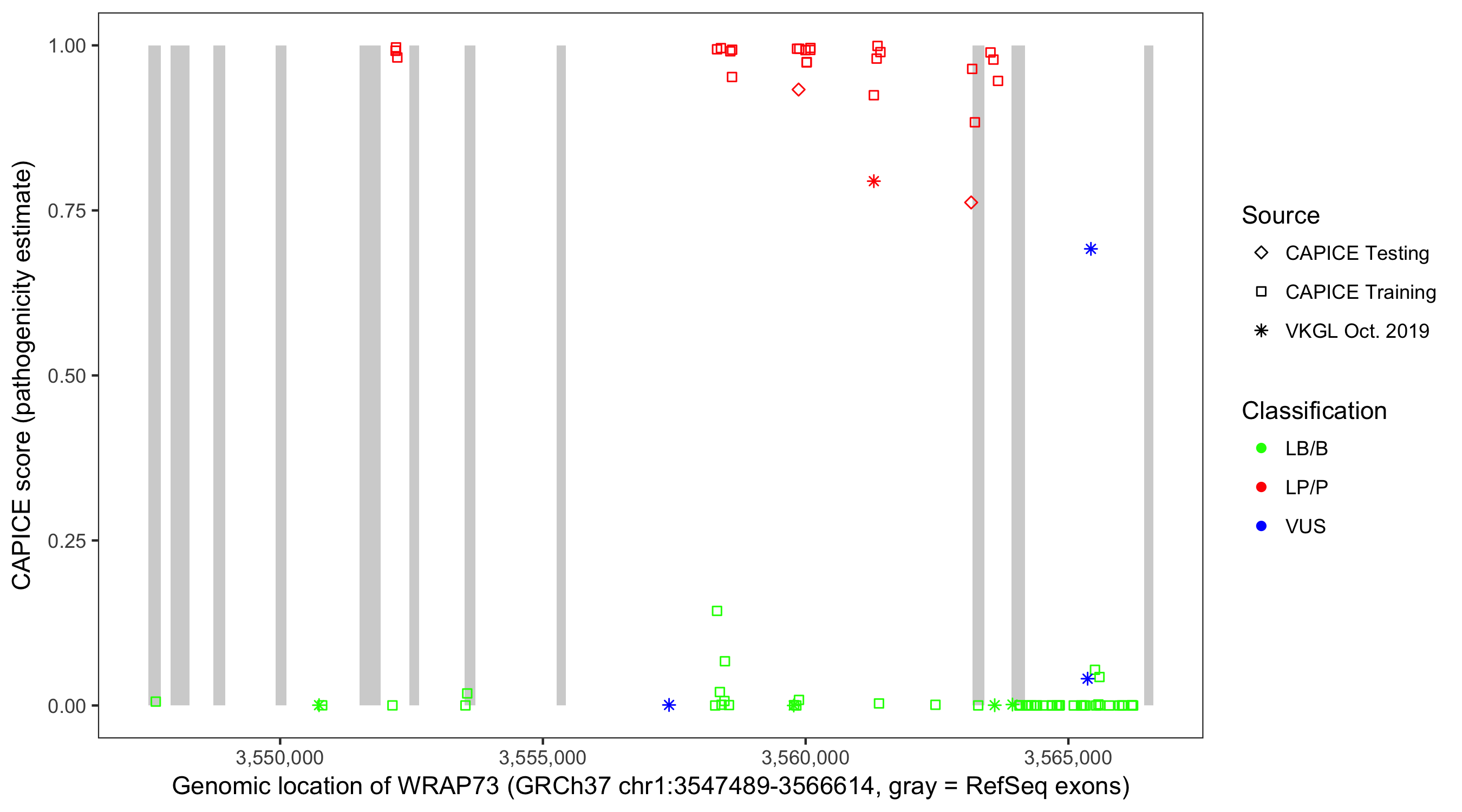 Shown are CAPICE train/test variants plus VKGL Oct 2019.