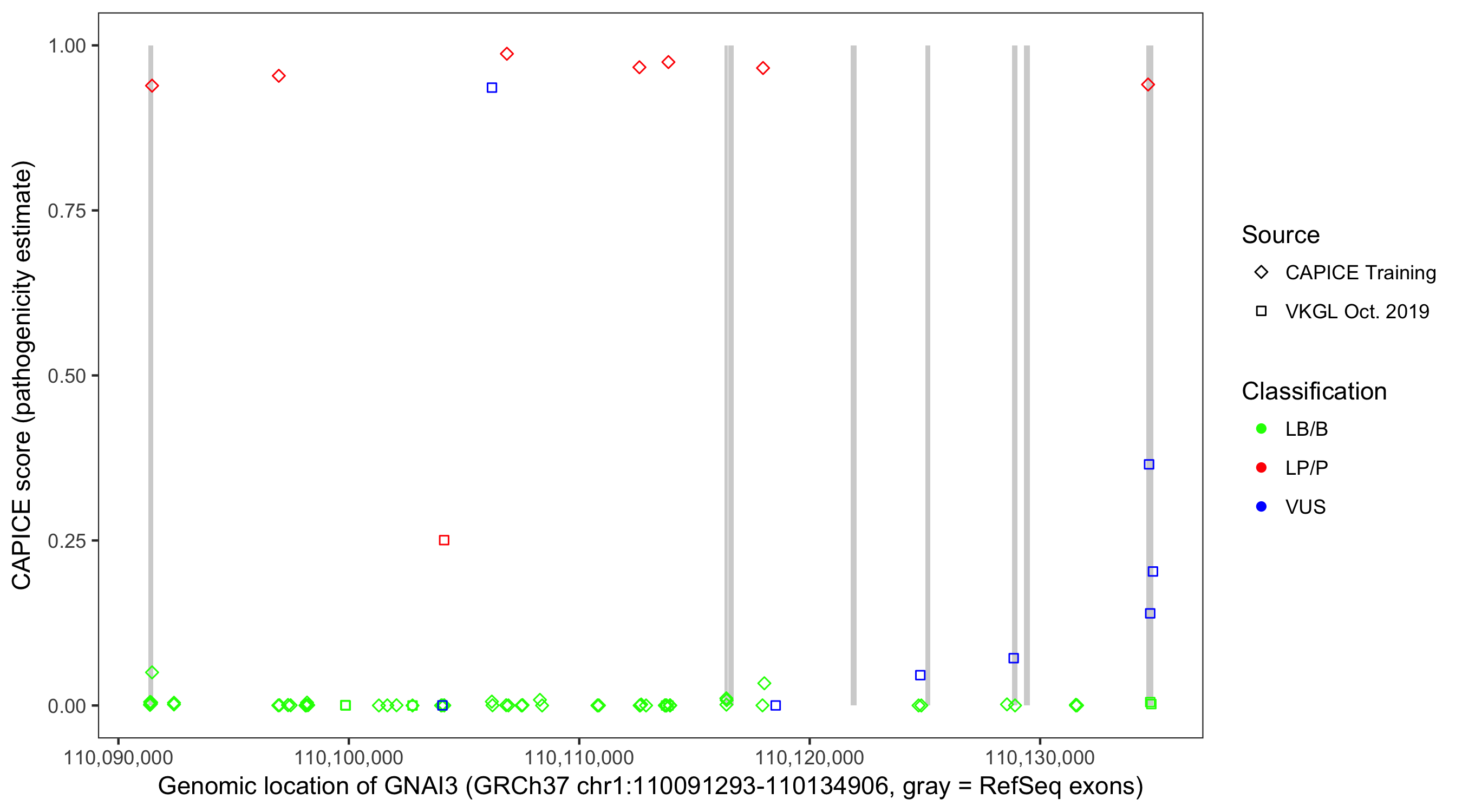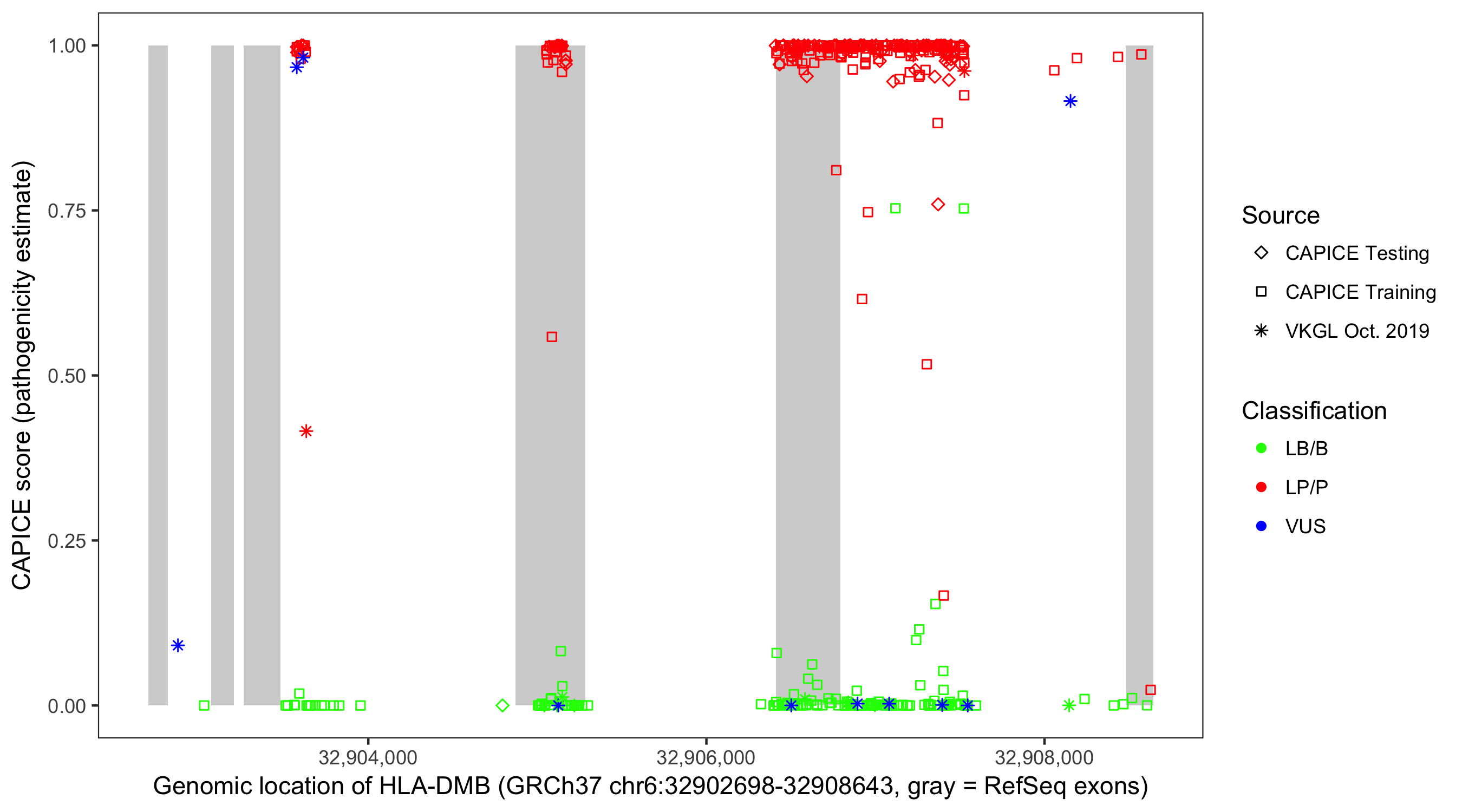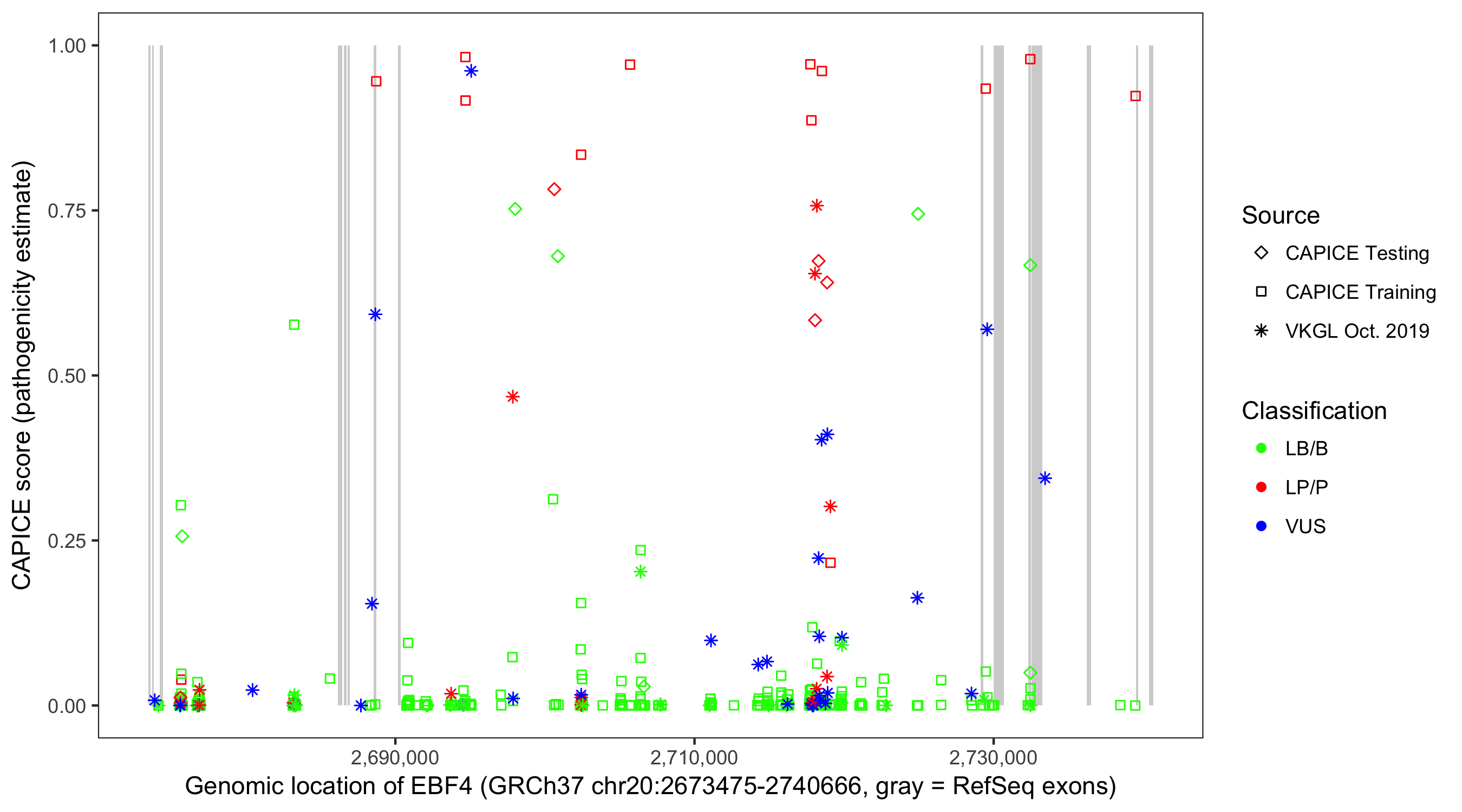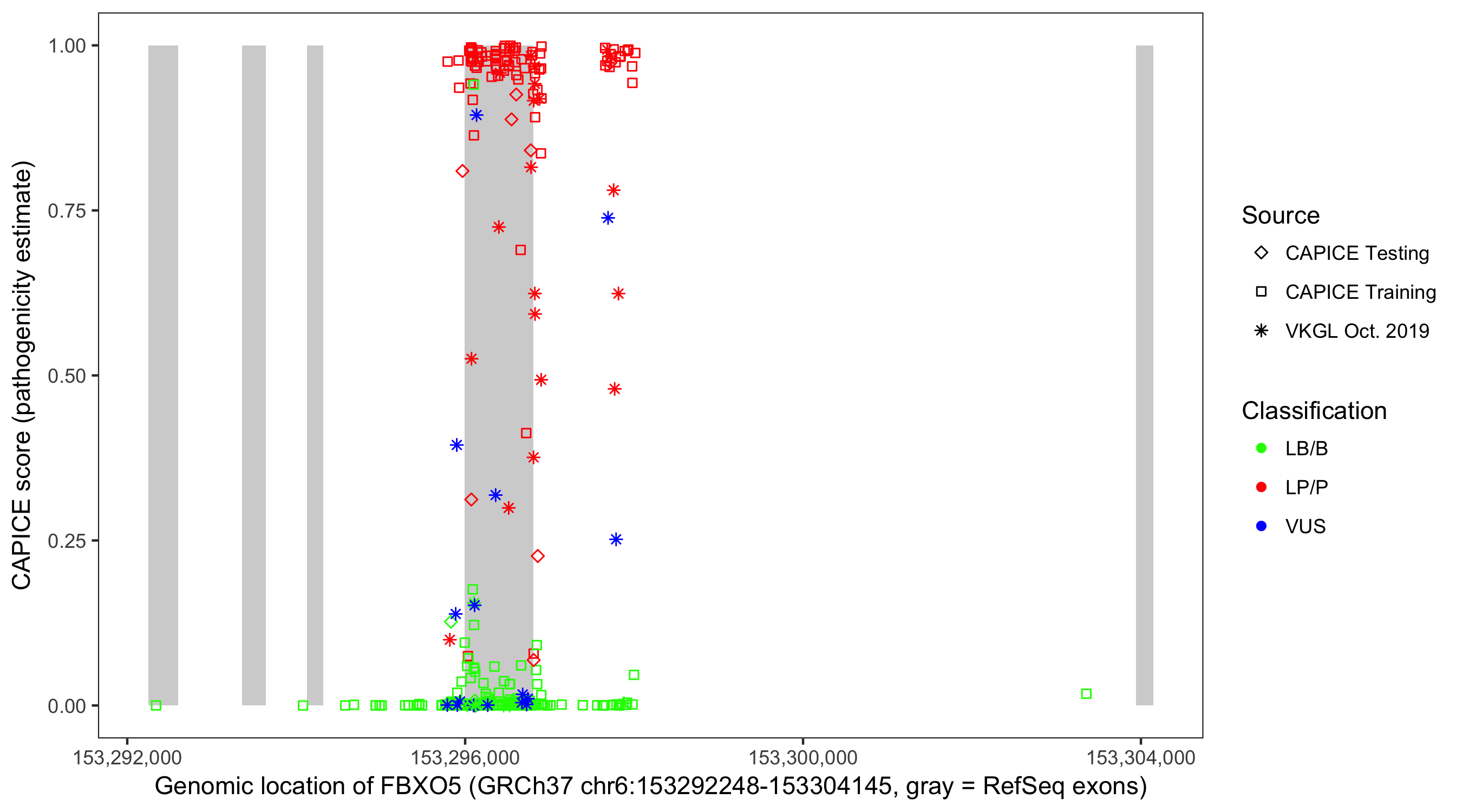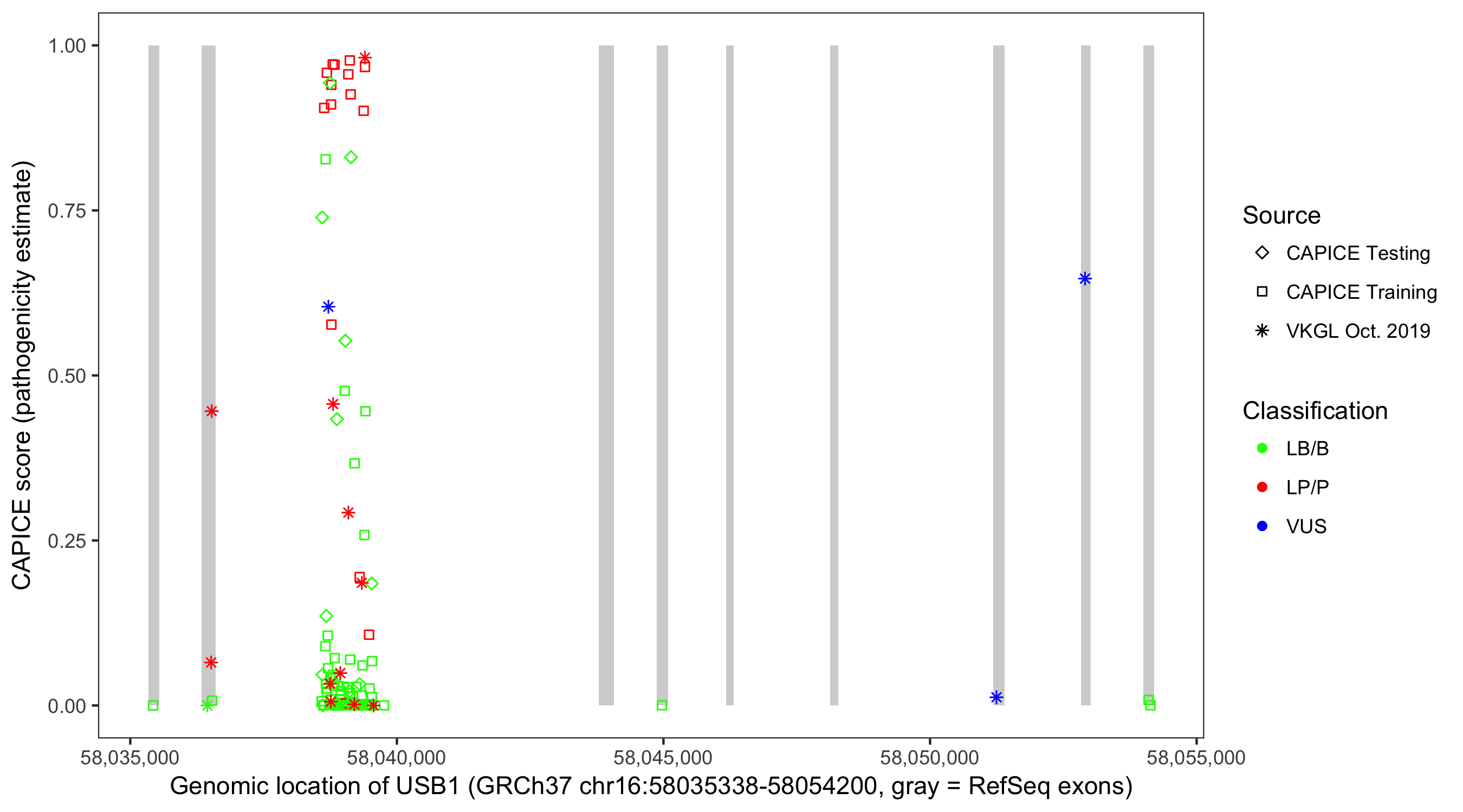 Shown are CAPICE train/test variants plus VKGL Oct 2019.
