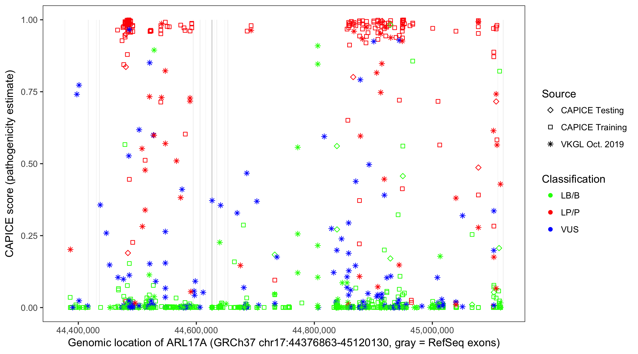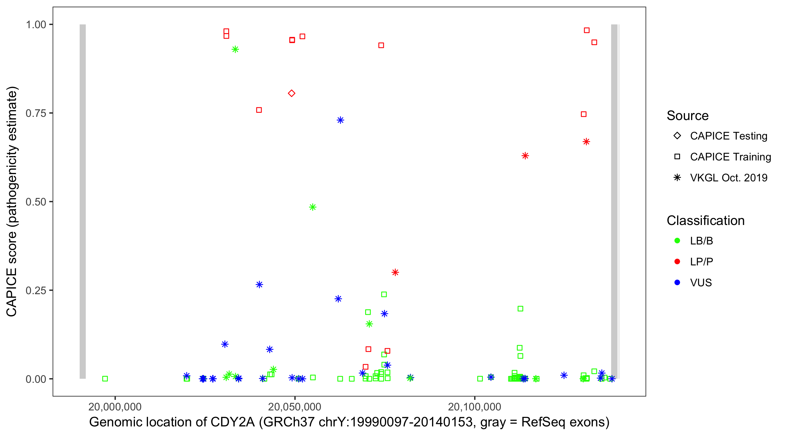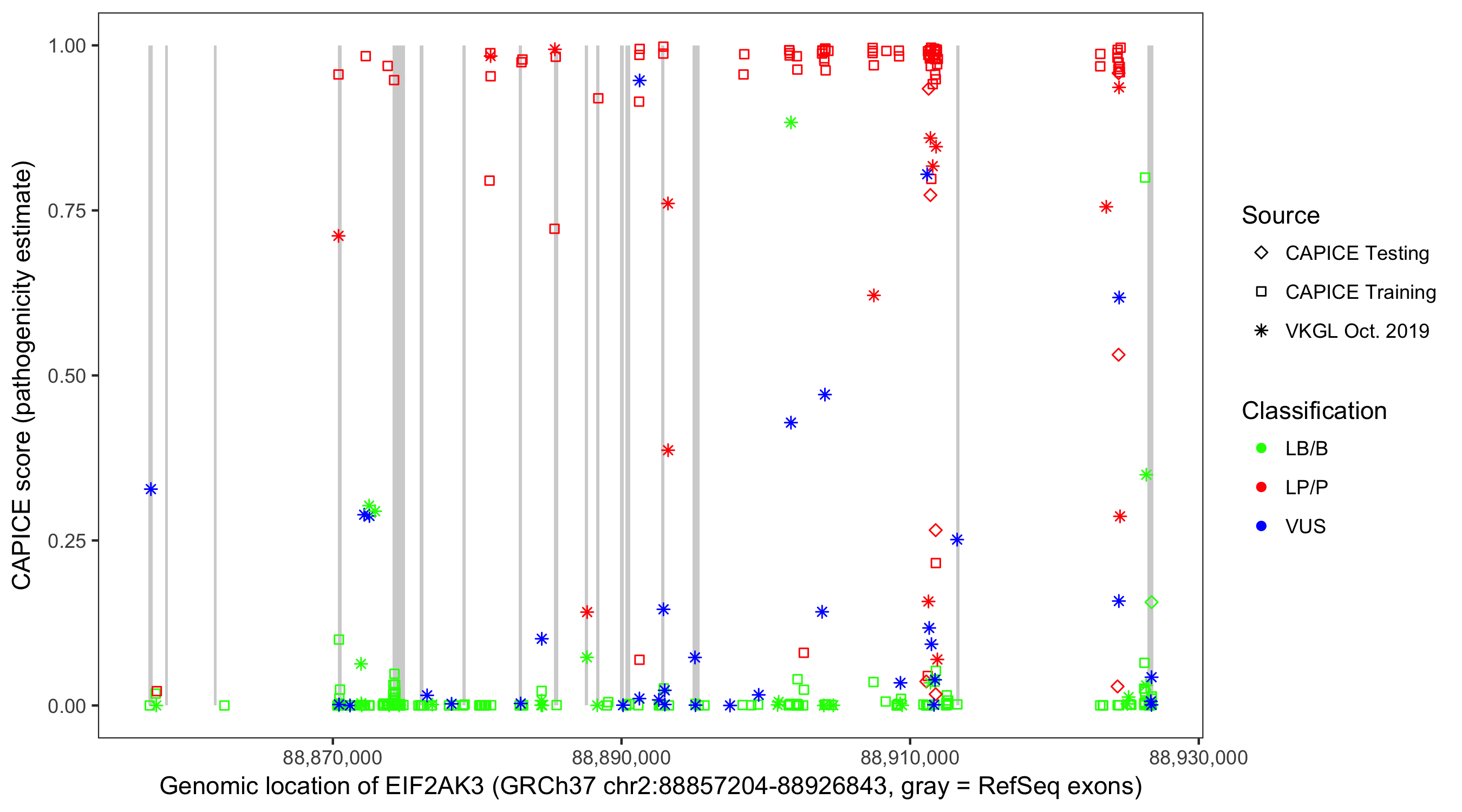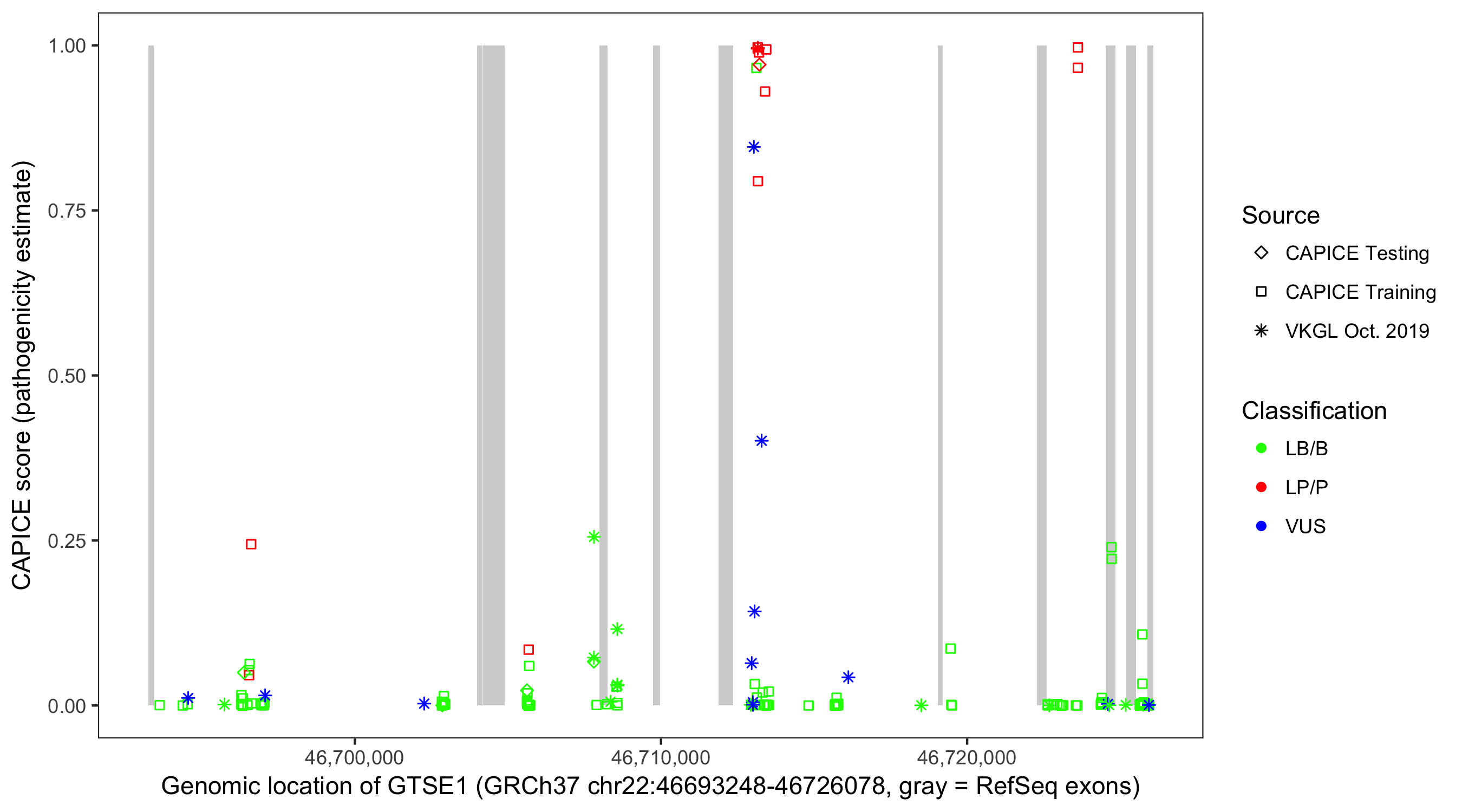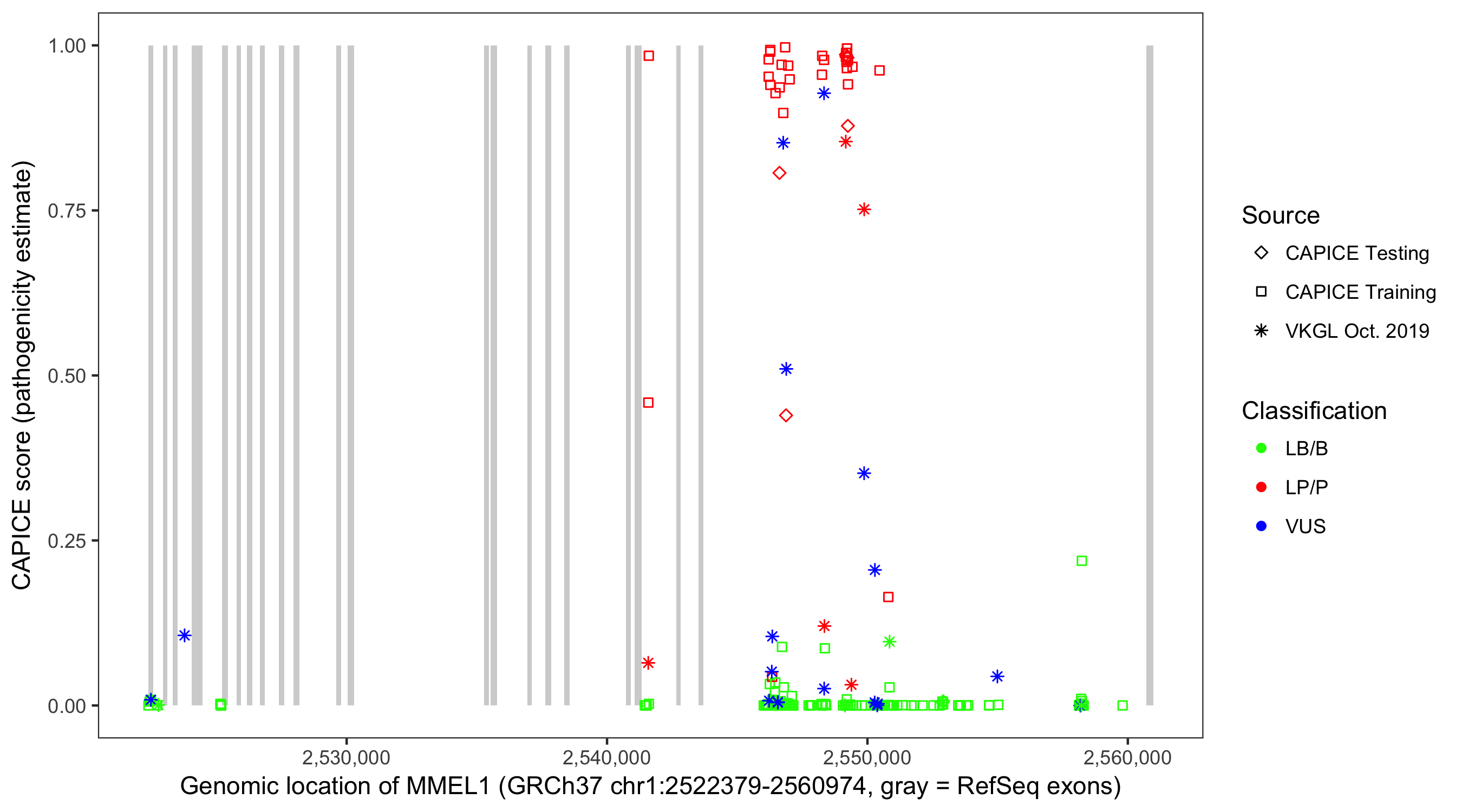 Shown are CAPICE train/test variants plus VKGL Oct 2019.